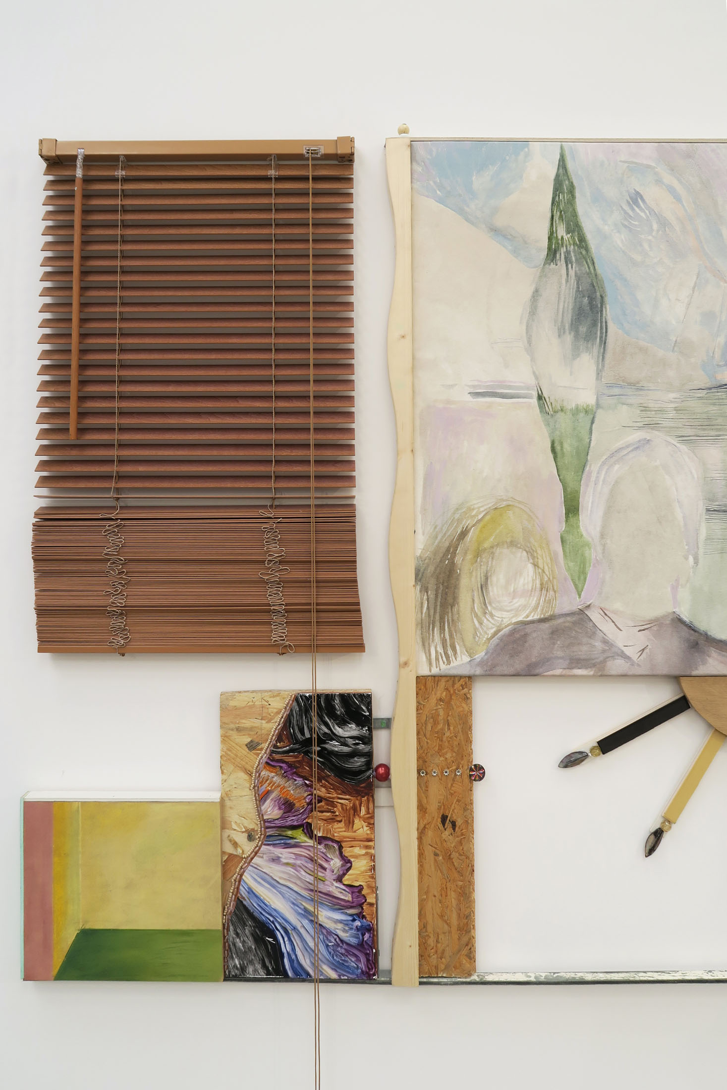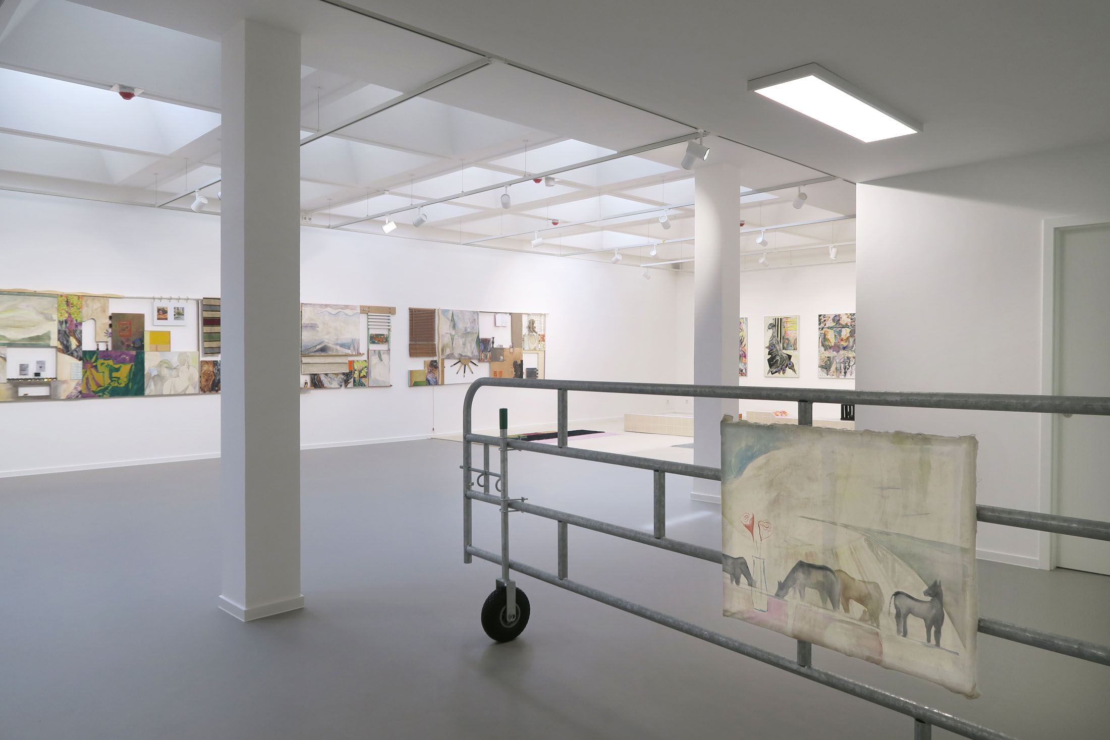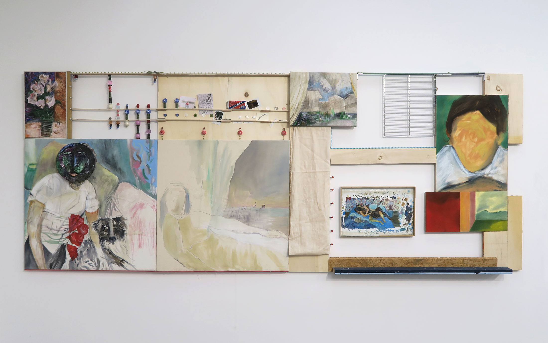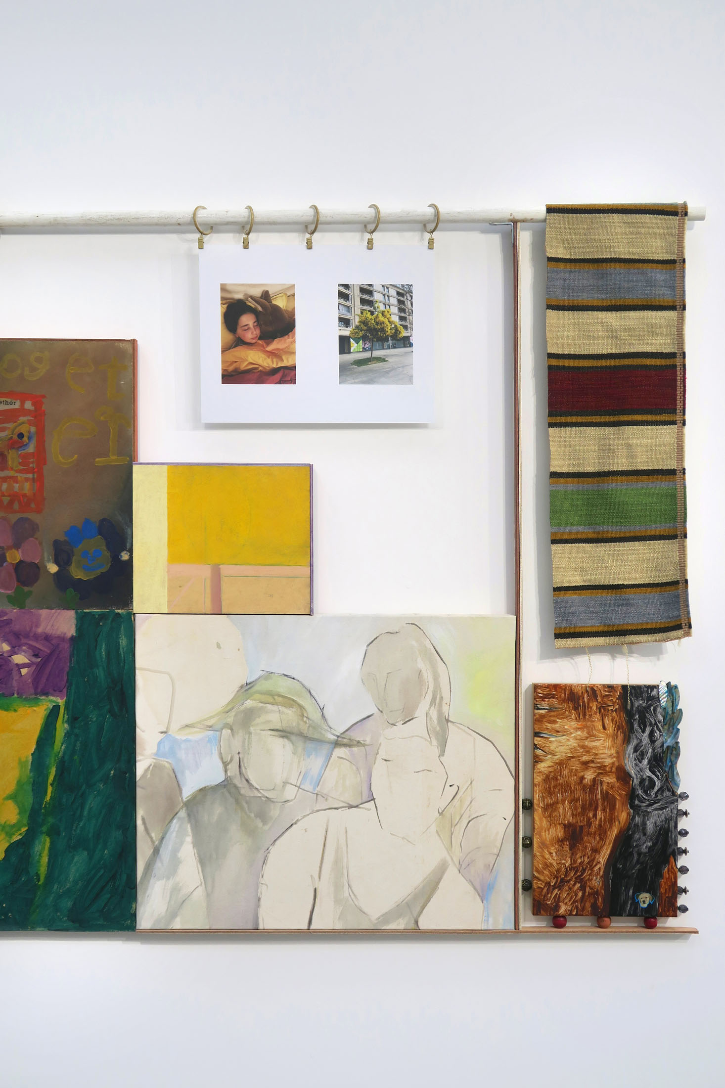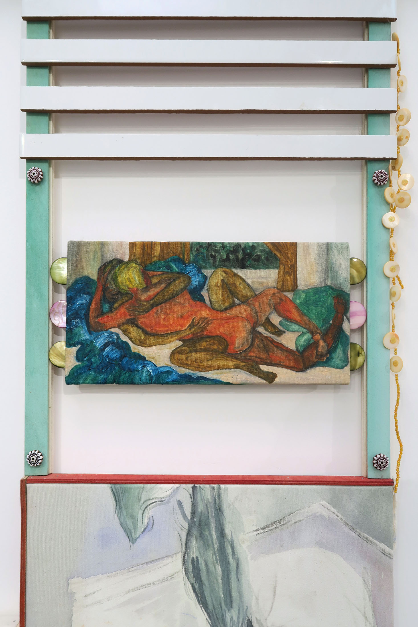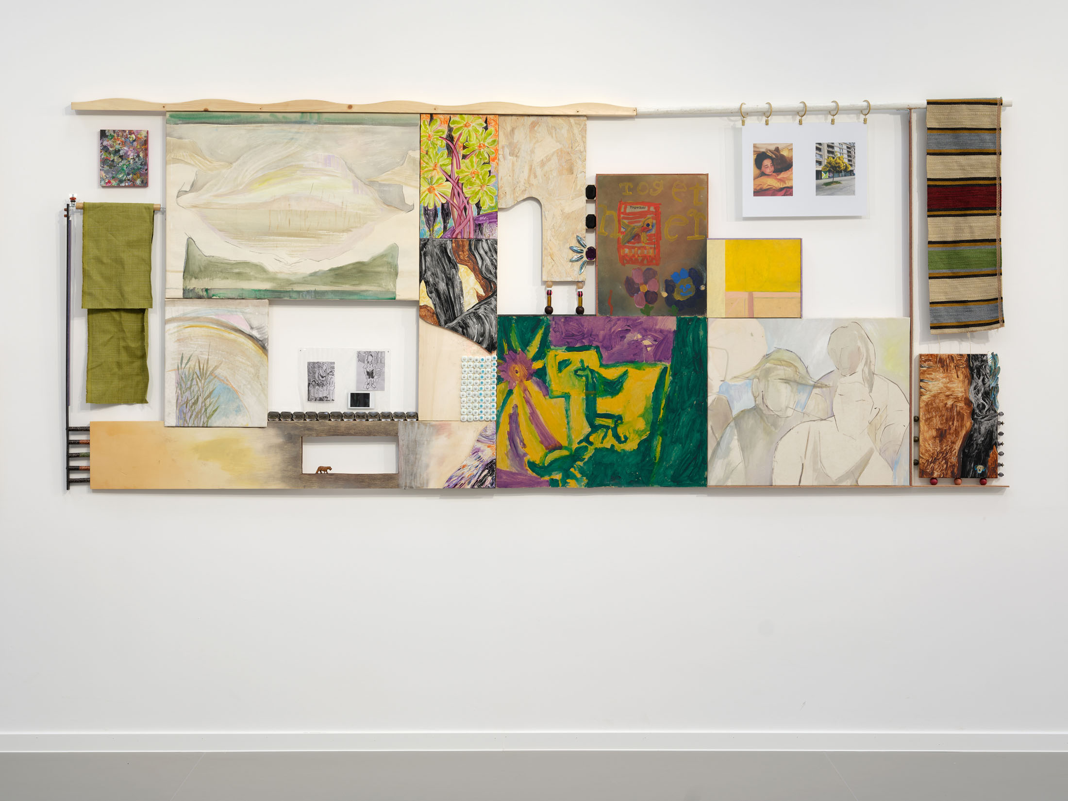 At the entrance, the work Barrier – consisting of a movable gate and a painting – greets visitors. It references rural labor and animal husbandry while also addressing notions of boundaries and belonging. As the first threshold of the exhibition, it marks the passage from the familiar into Jacent’s distinctive cosmos. On the upper floor, a band of objects and materials unfolds like an open, fragmentary timeline. Fabric remnants, floral motifs, small figurines, and pieces of jewelry evoke biographical moments and scenes from daily life. Some elements appear as quick sketches, others condense into more complex image fields, forming a rhythm of moods and memories.