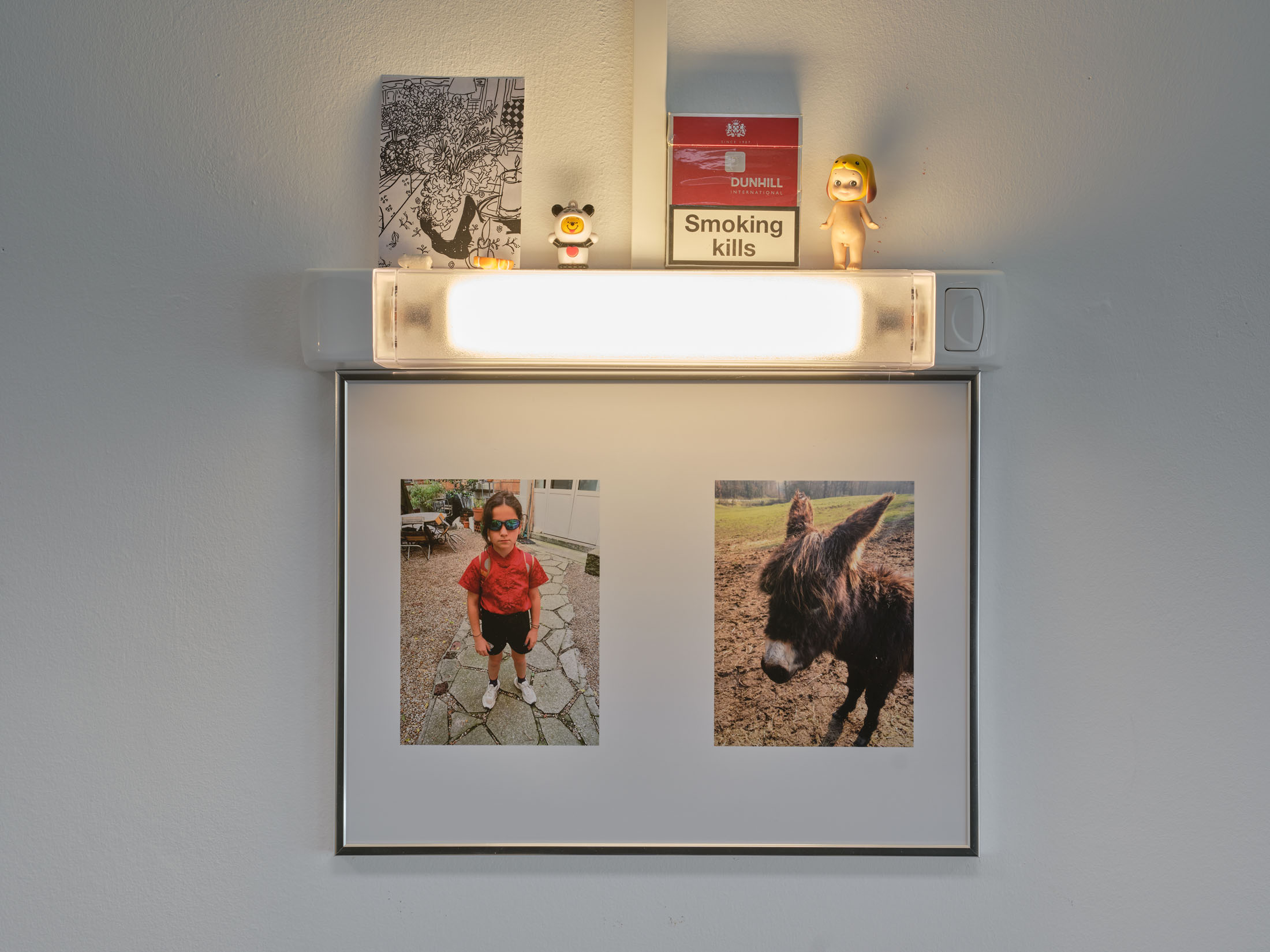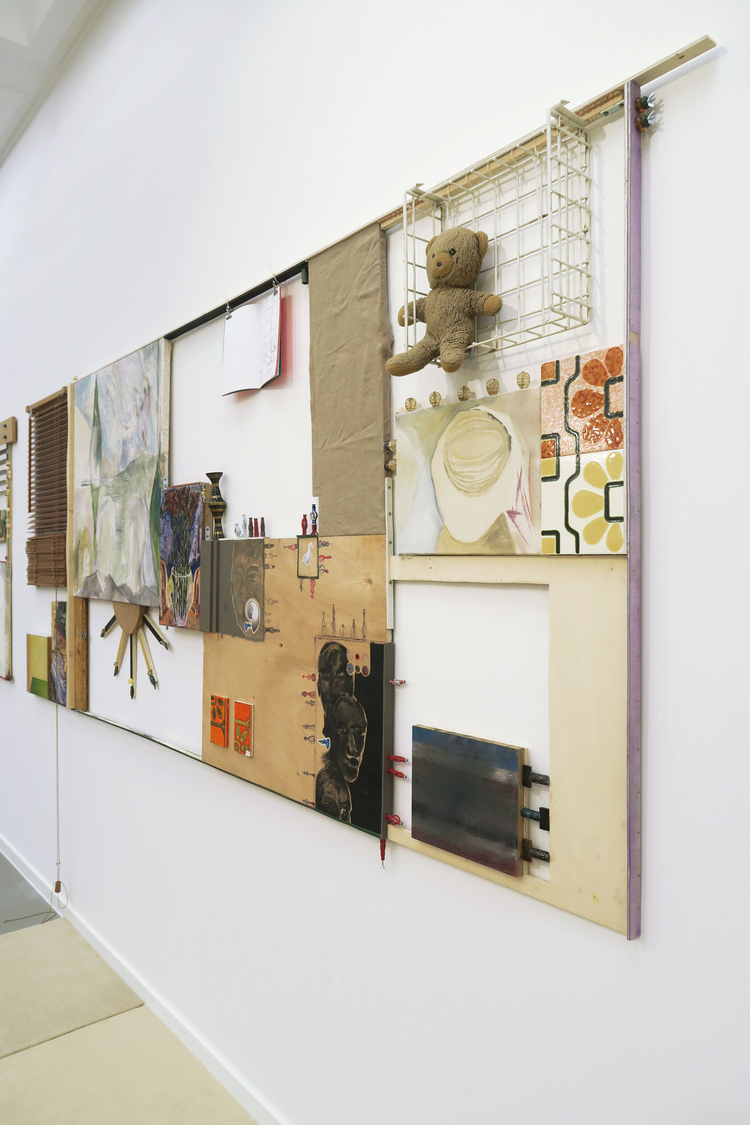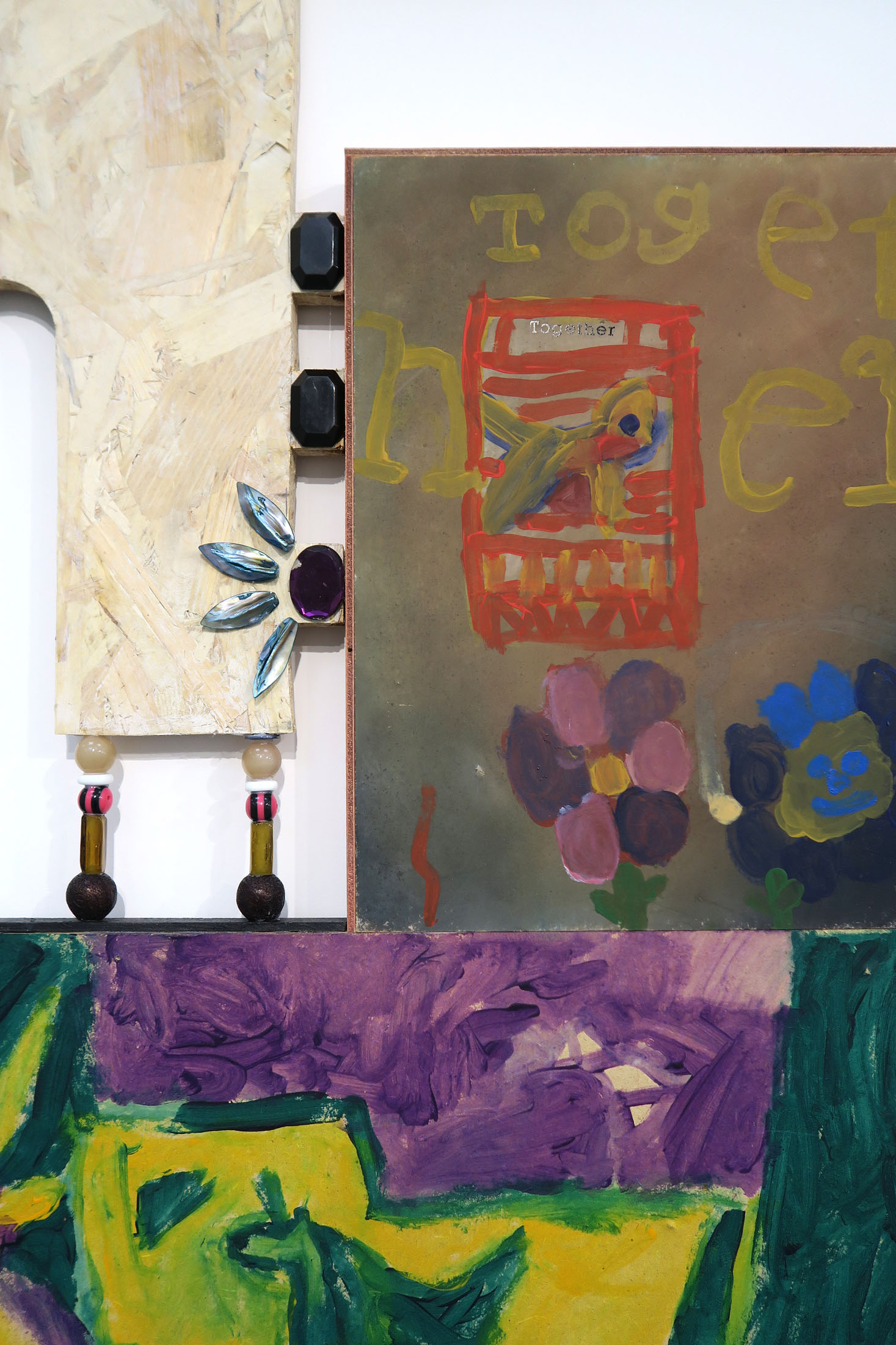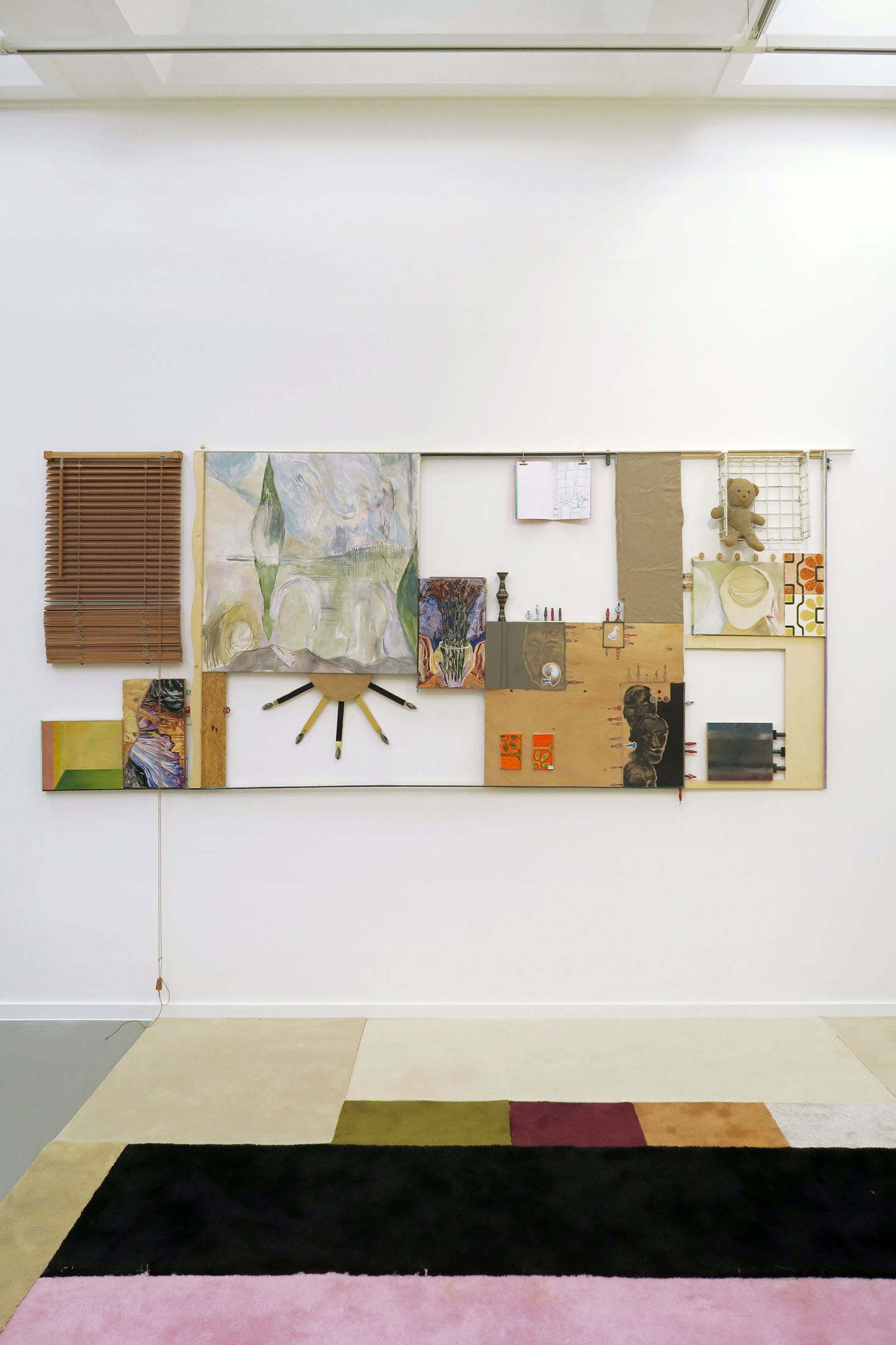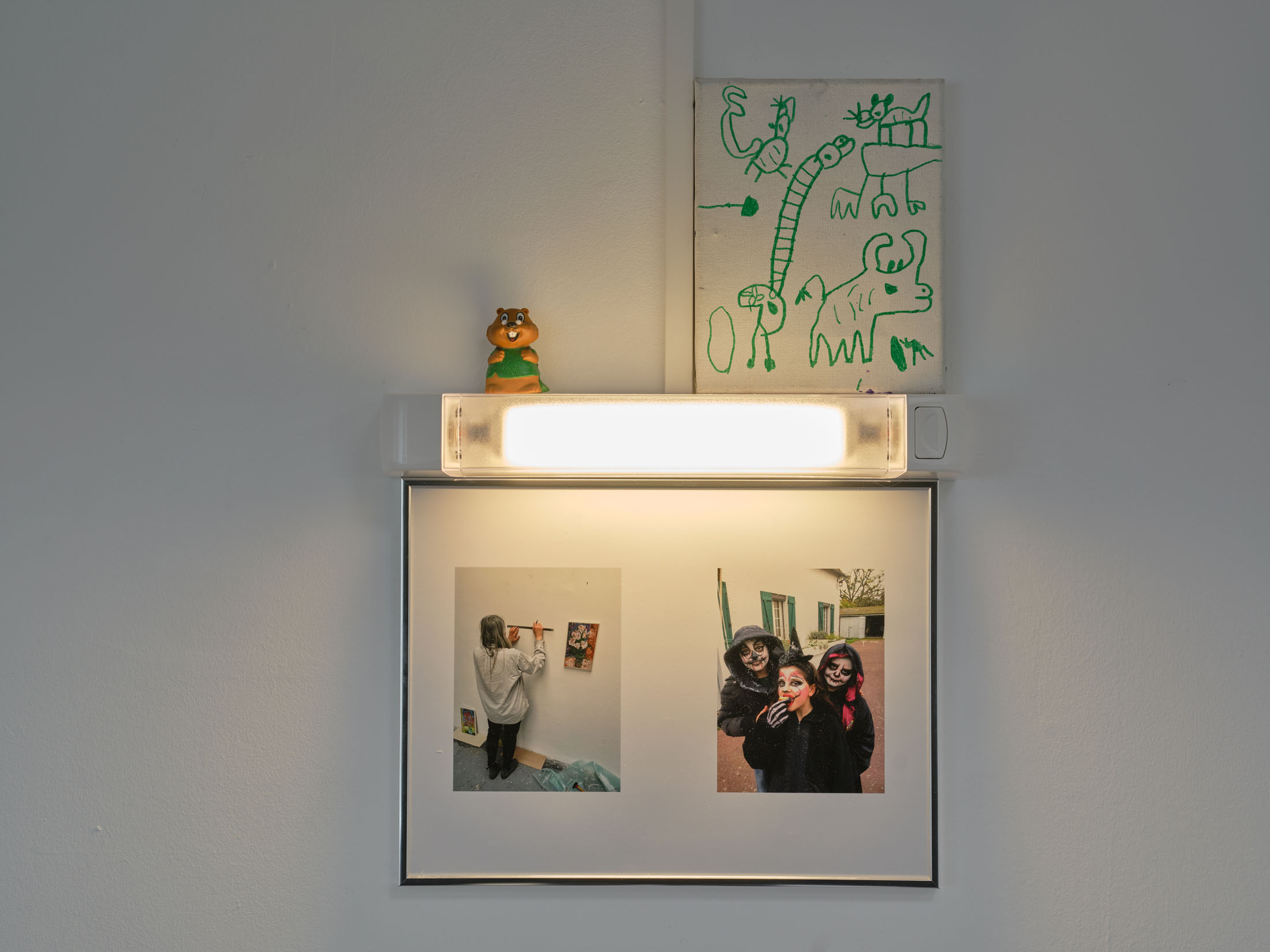 At the entrance, the work Barrier – consisting of a movable gate and a painting – greets visitors. It references rural labor and animal husbandry while also addressing notions of boundaries and belonging. As the first threshold of the exhibition, it marks the passage from the familiar into Jacent’s distinctive cosmos. On the upper floor, a band of objects and materials unfolds like an open, fragmentary timeline. Fabric remnants, floral motifs, small figurines, and pieces of jewelry evoke biographical moments and scenes from daily life. Some elements appear as quick sketches, others condense into more complex image fields, forming a rhythm of moods and memories.