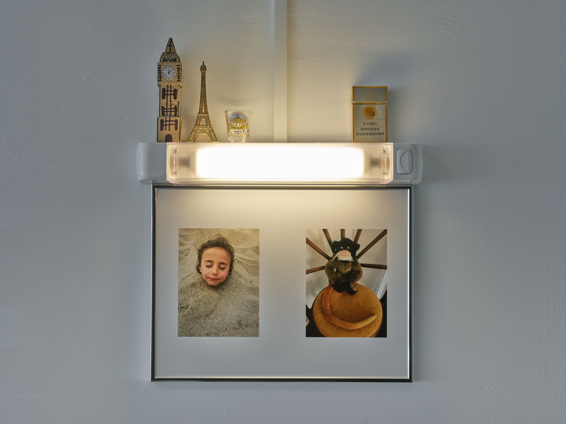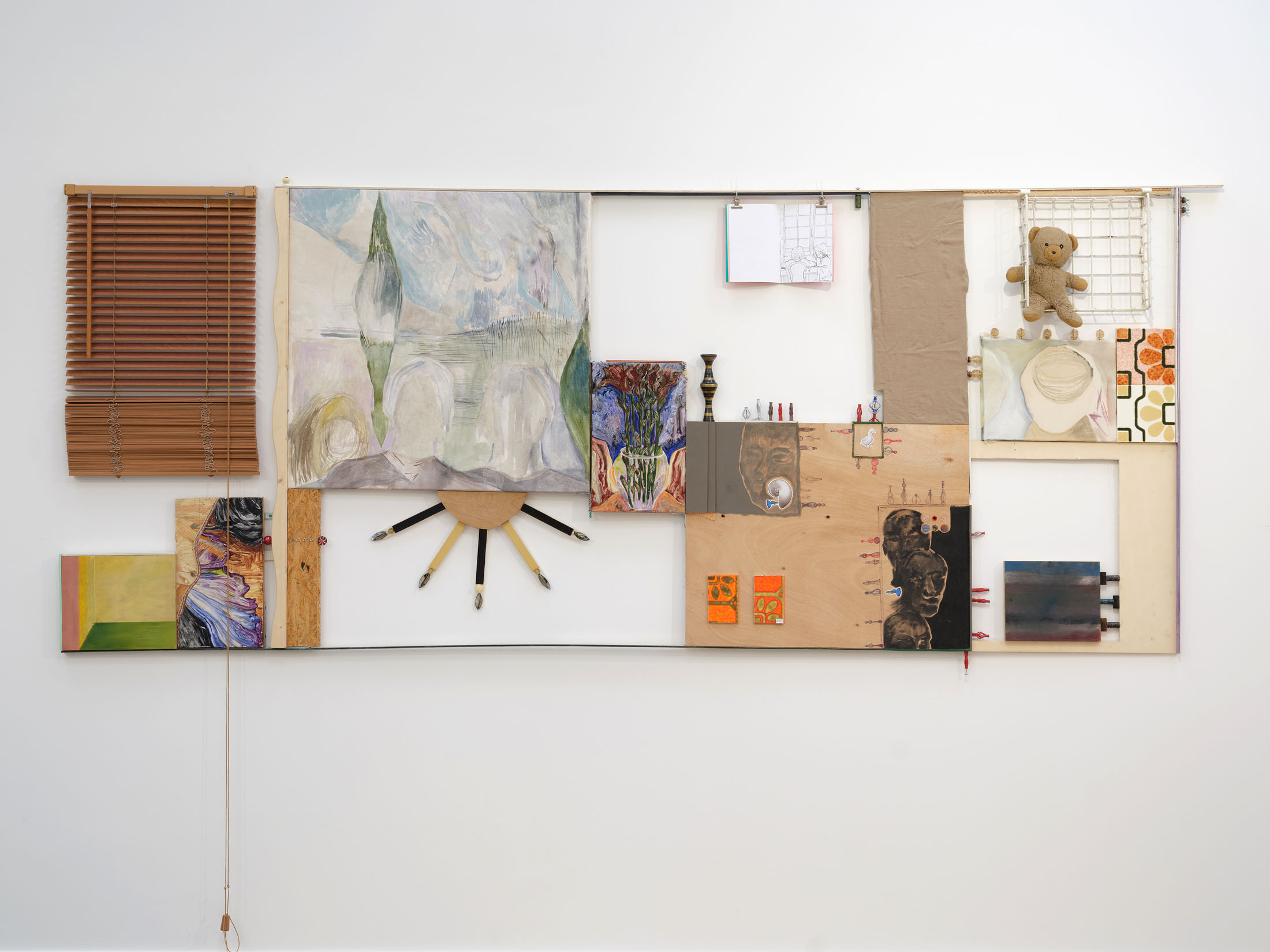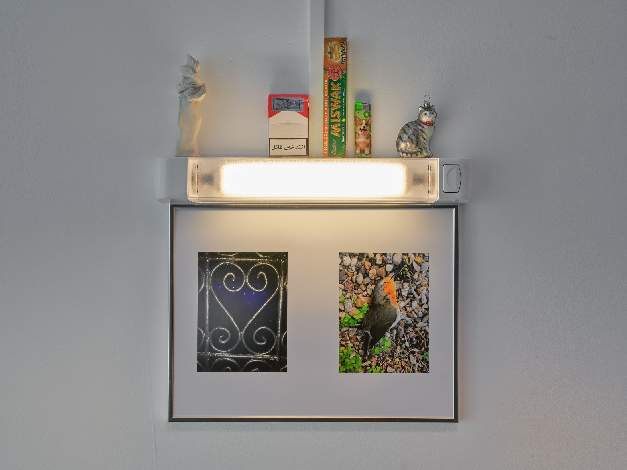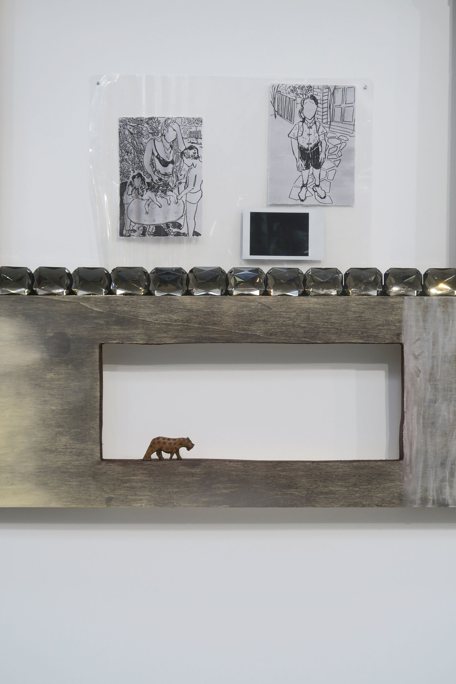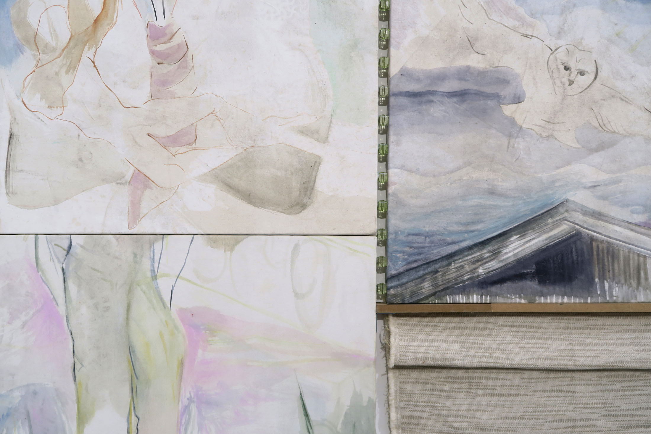 At the entrance, the work Barrier – consisting of a movable gate and a painting – greets visitors. It references rural labor and animal husbandry while also addressing notions of boundaries and belonging. As the first threshold of the exhibition, it marks the passage from the familiar into Jacent’s distinctive cosmos. On the upper floor, a band of objects and materials unfolds like an open, fragmentary timeline. Fabric remnants, floral motifs, small figurines, and pieces of jewelry evoke biographical moments and scenes from daily life. Some elements appear as quick sketches, others condense into more complex image fields, forming a rhythm of moods and memories.