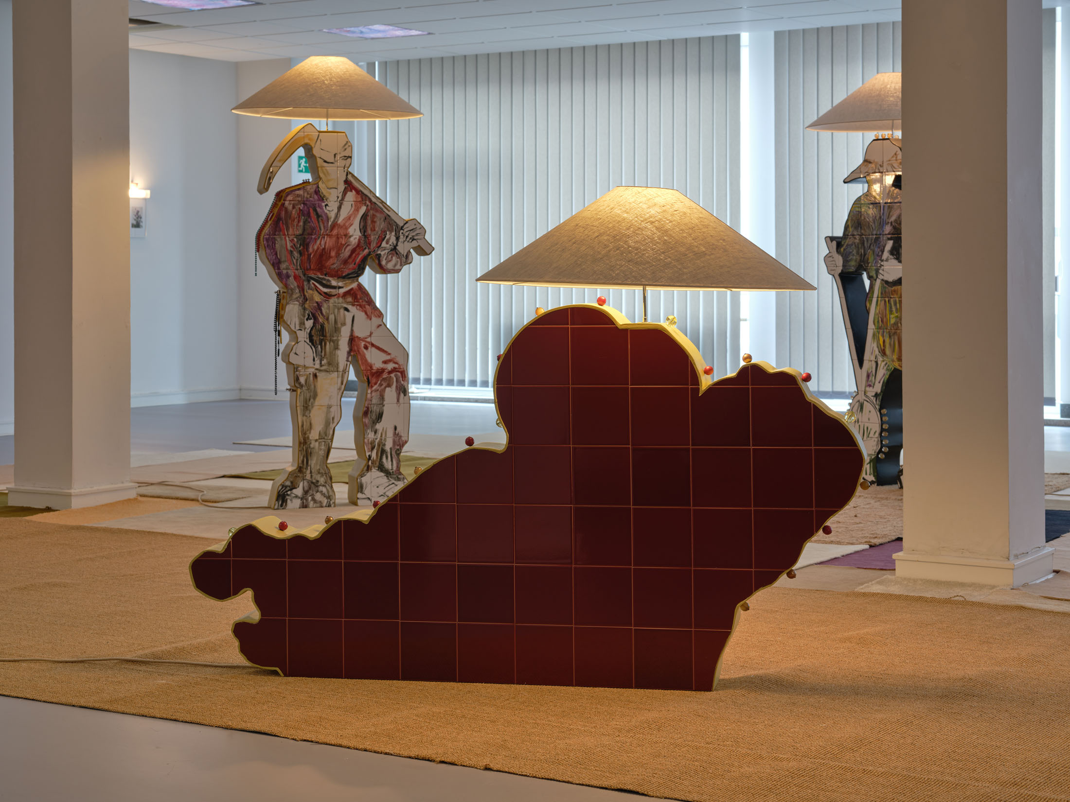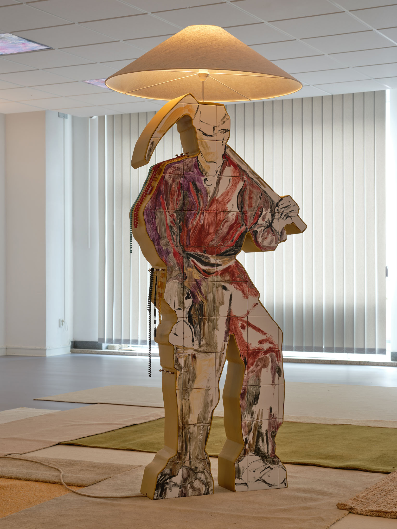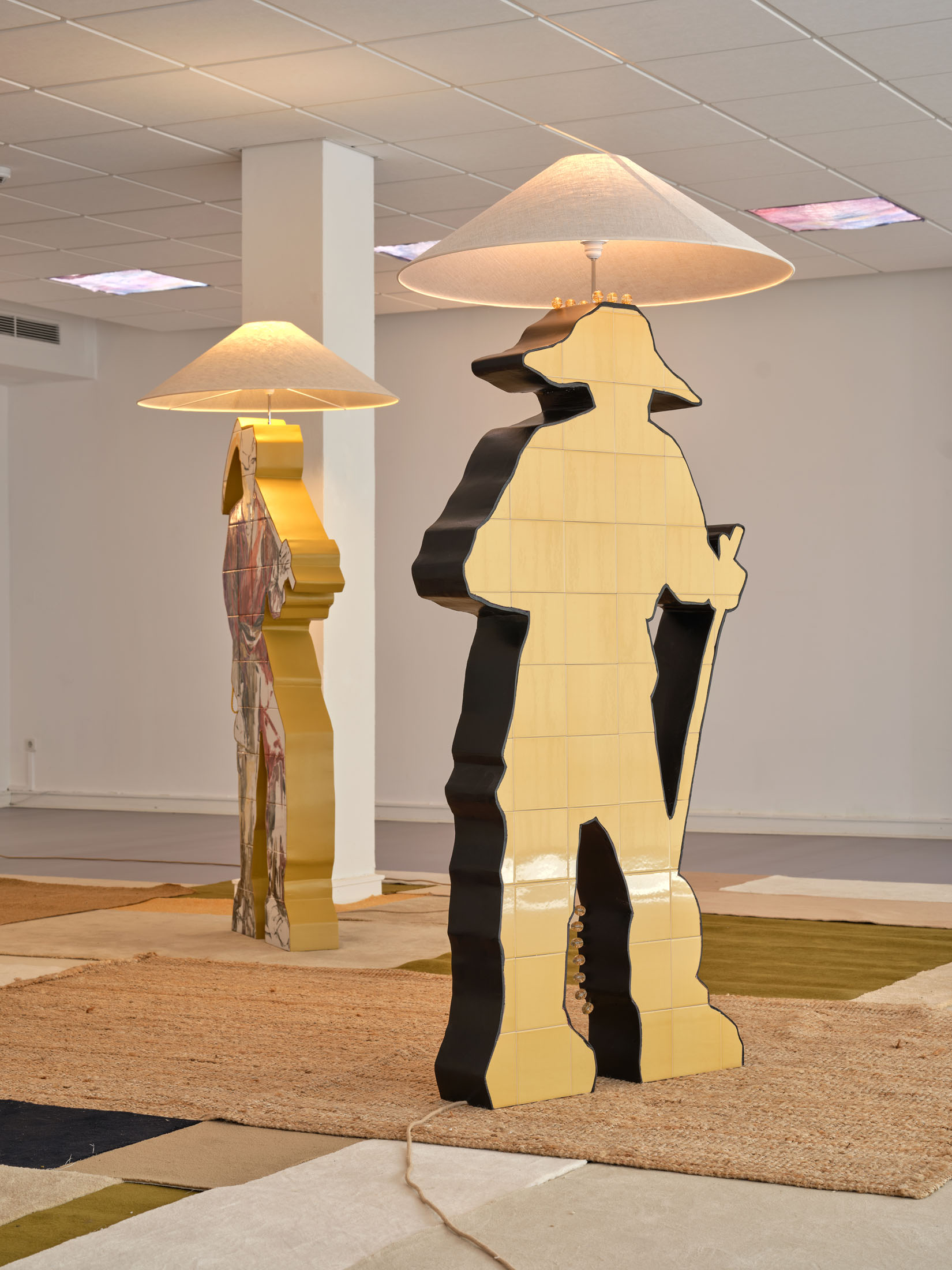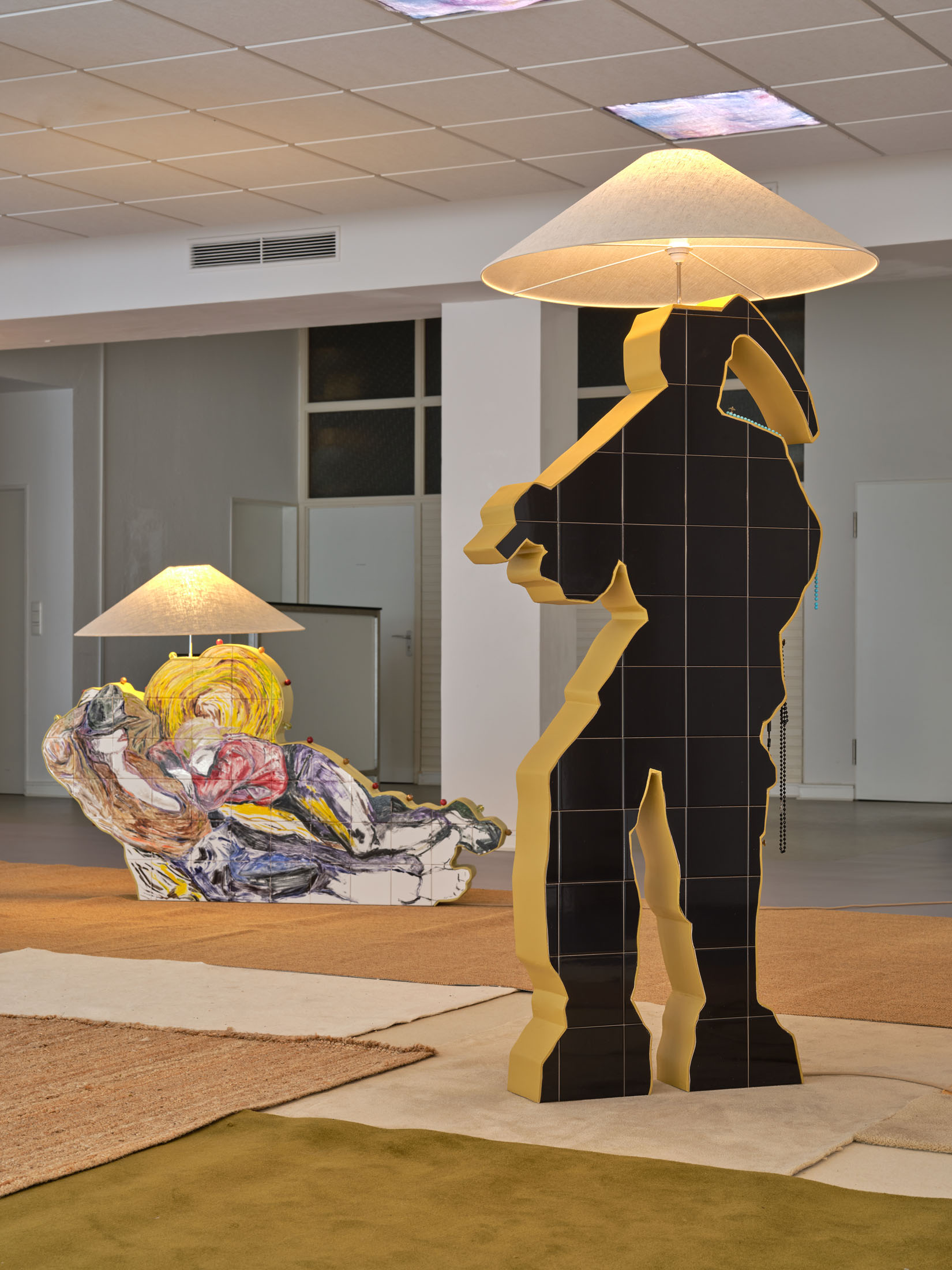 The paintings on tiles possess a particular immediacy: often created in a single gesture, they resemble sketches or captured thoughts. In some works, one can sense the influence of Jade’s grandmother, the sculptor Agnès Racine, whose small bronze figures are integrated into the installation. In the basement, visitors encounter the local Siegen figures Henner and Frieder. Originally created in 1902 as bronze sculptures for the Düsseldorf Industrial and Trade Exhibition, Jacent reimagine them as large illuminated sculptures. Heroic symbols of industrial labor are transformed into open, ambiguous figures of a plural society. Gender roles remain deliberately undefined; adornment and light lend the figures a celebratory character. Past and future, the local and the global, enter into a vivid dialogue.