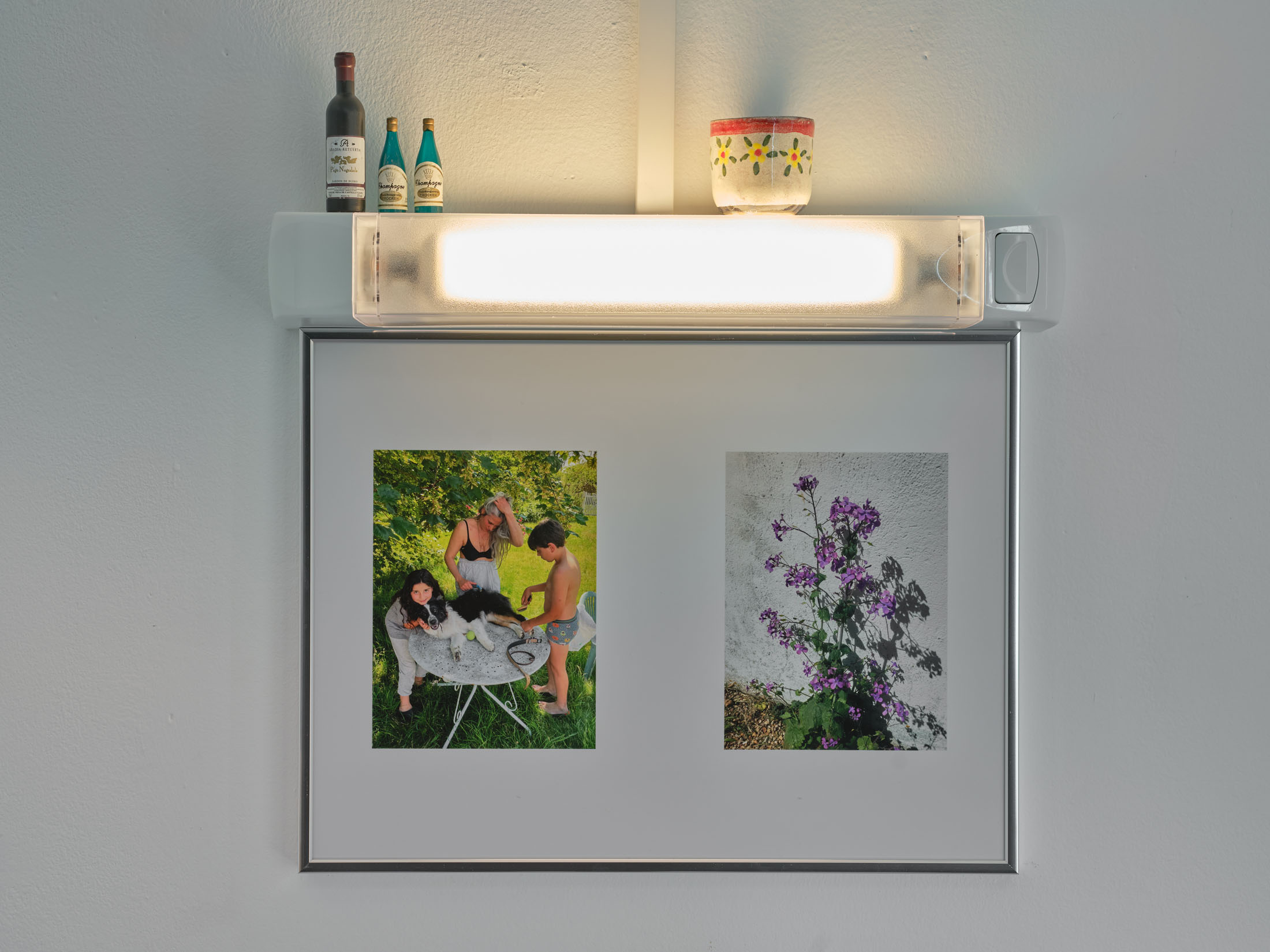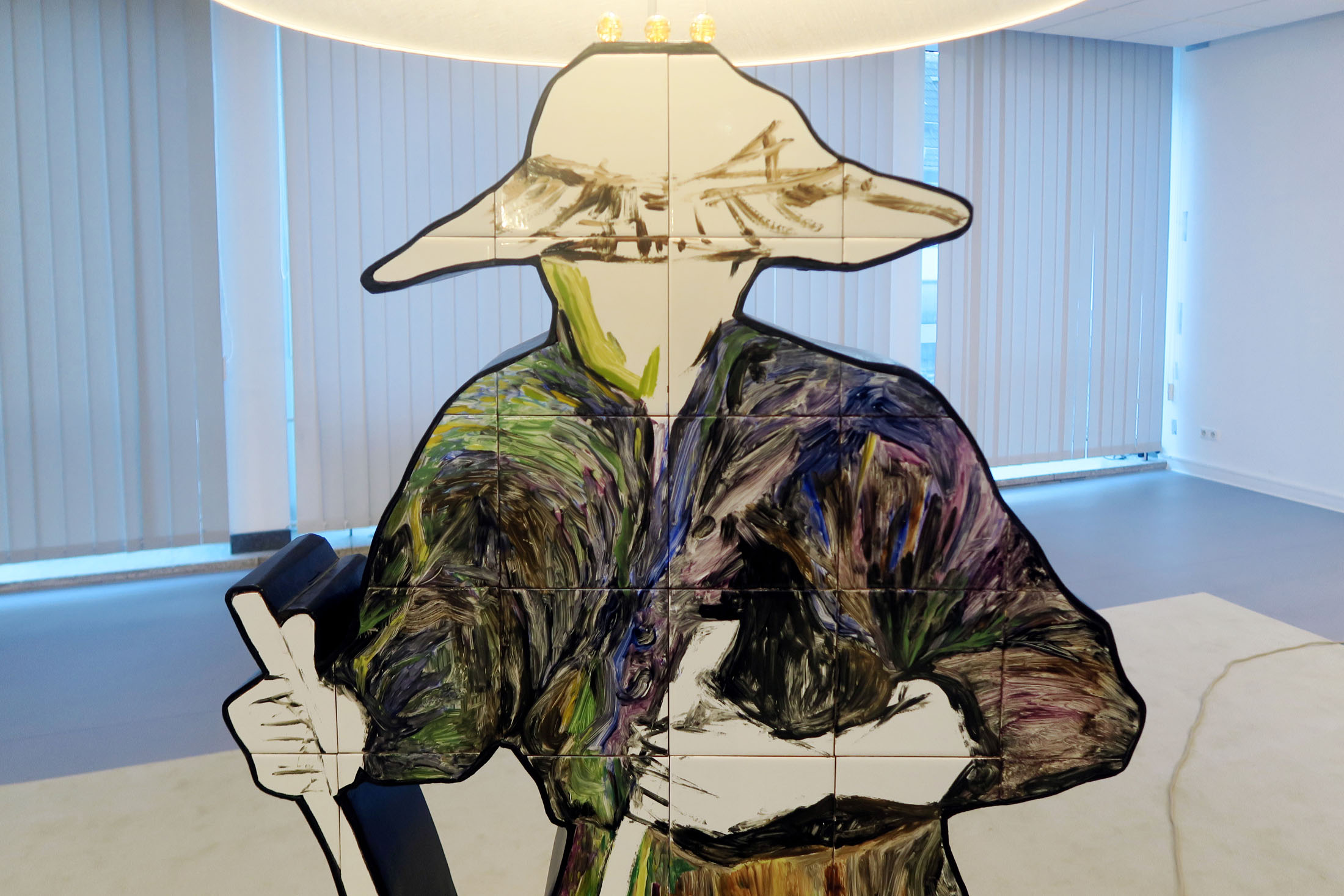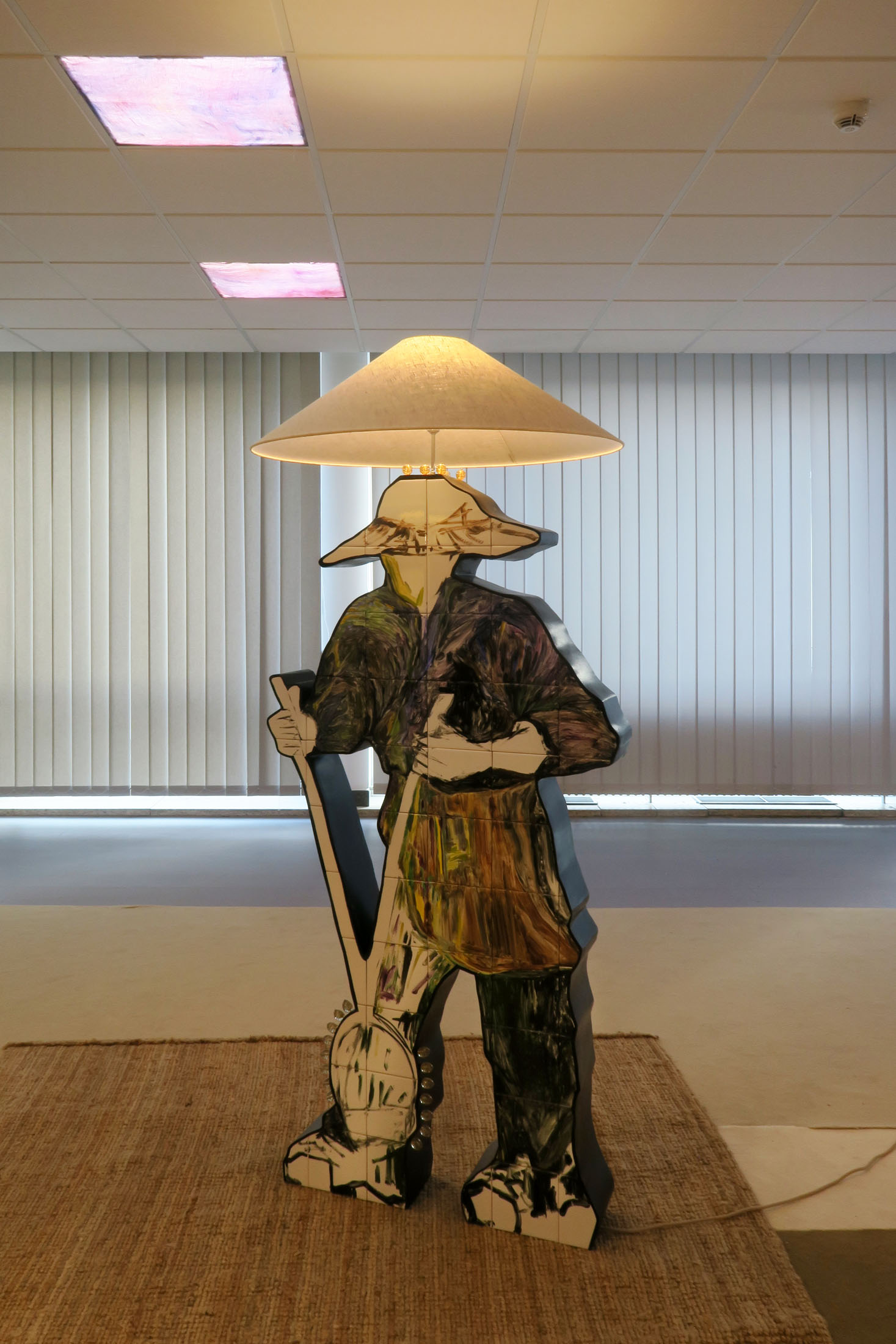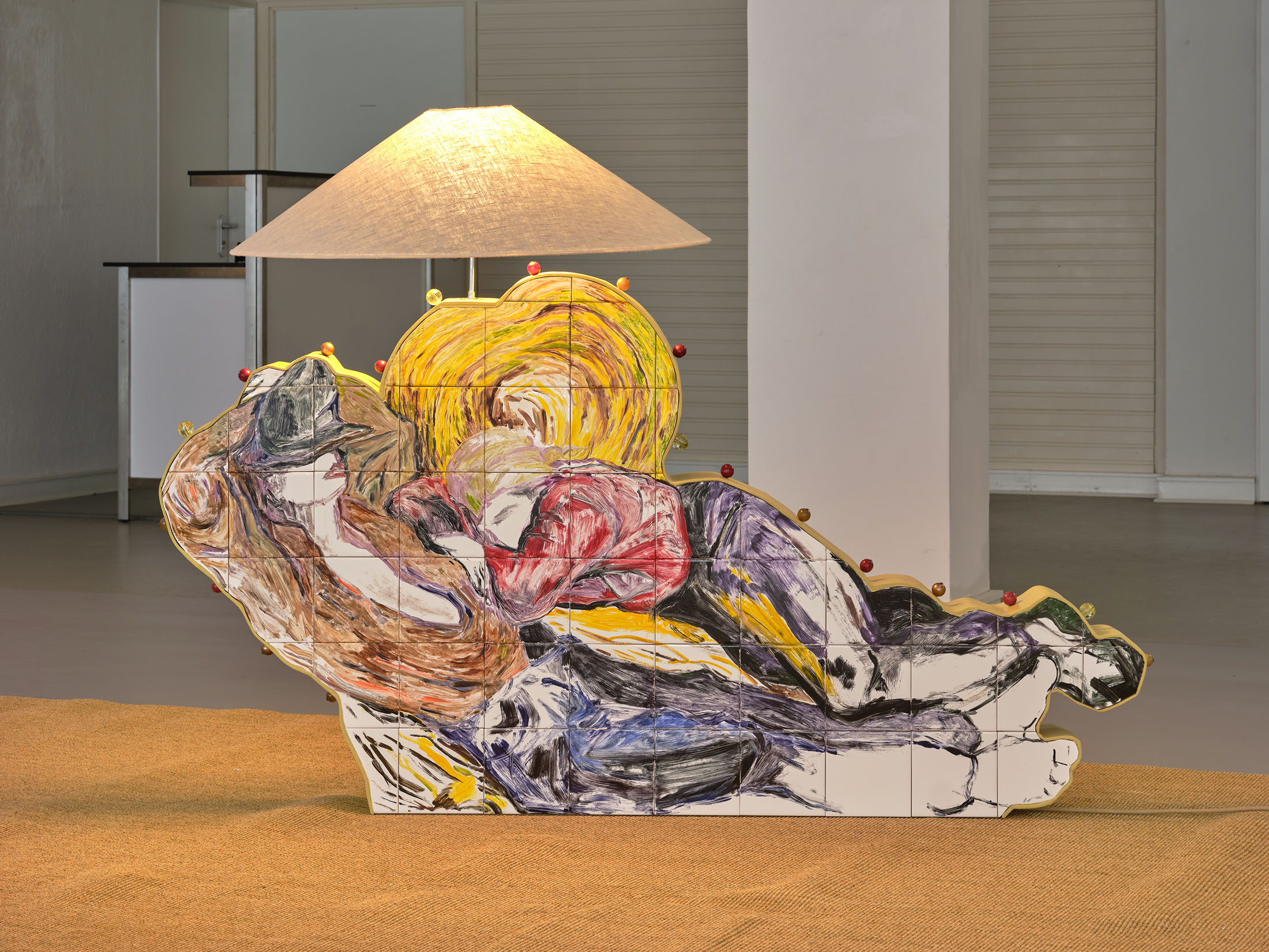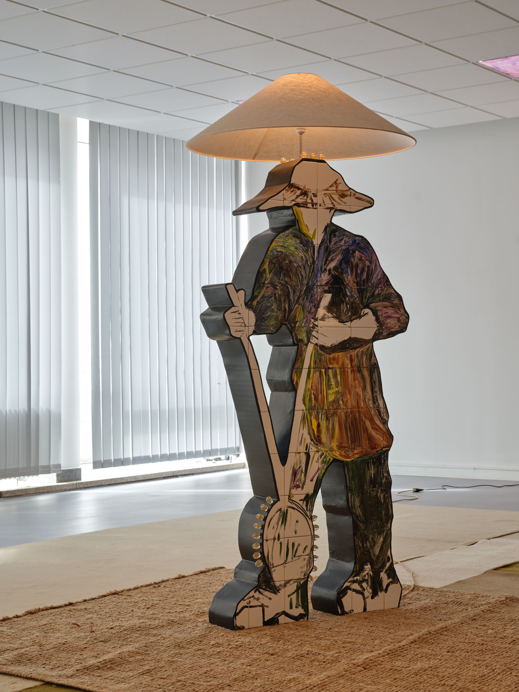 The paintings on tiles possess a particular immediacy: often created in a single gesture, they resemble sketches or captured thoughts. In some works, one can sense the influence of Jade’s grandmother, the sculptor Agnès Racine, whose small bronze figures are integrated into the installation. In the basement, visitors encounter the local Siegen figures Henner and Frieder. Originally created in 1902 as bronze sculptures for the Düsseldorf Industrial and Trade Exhibition, Jacent reimagine them as large illuminated sculptures. Heroic symbols of industrial labor are transformed into open, ambiguous figures of a plural society. Gender roles remain deliberately undefined; adornment and light lend the figures a celebratory character. Past and future, the local and the global, enter into a vivid dialogue.