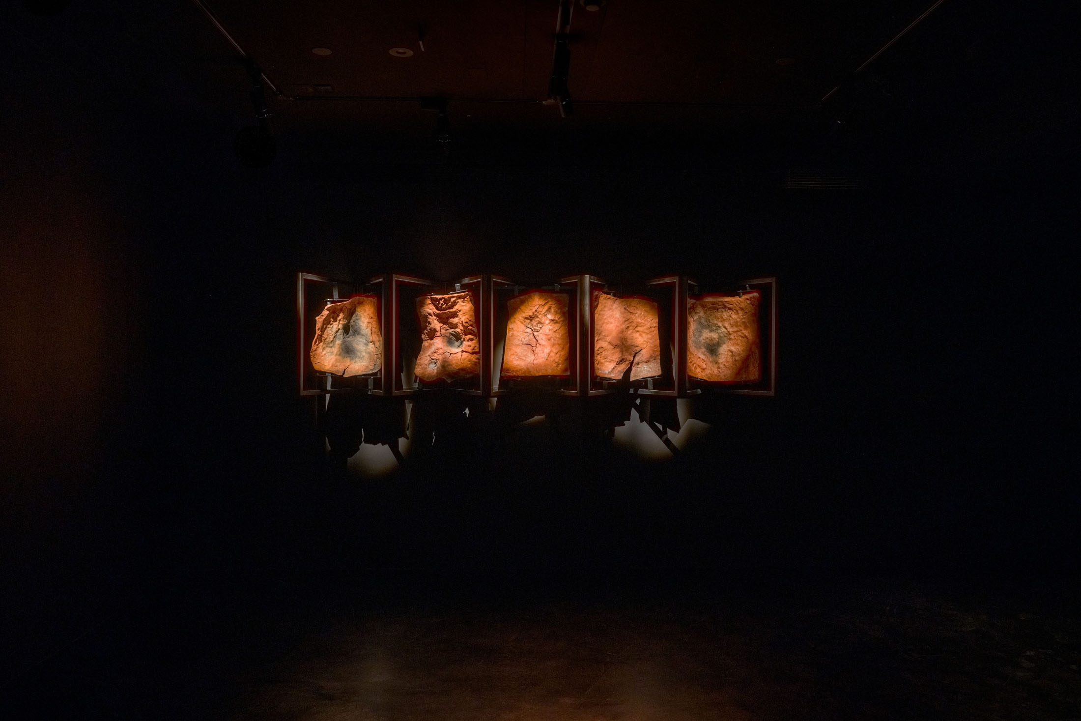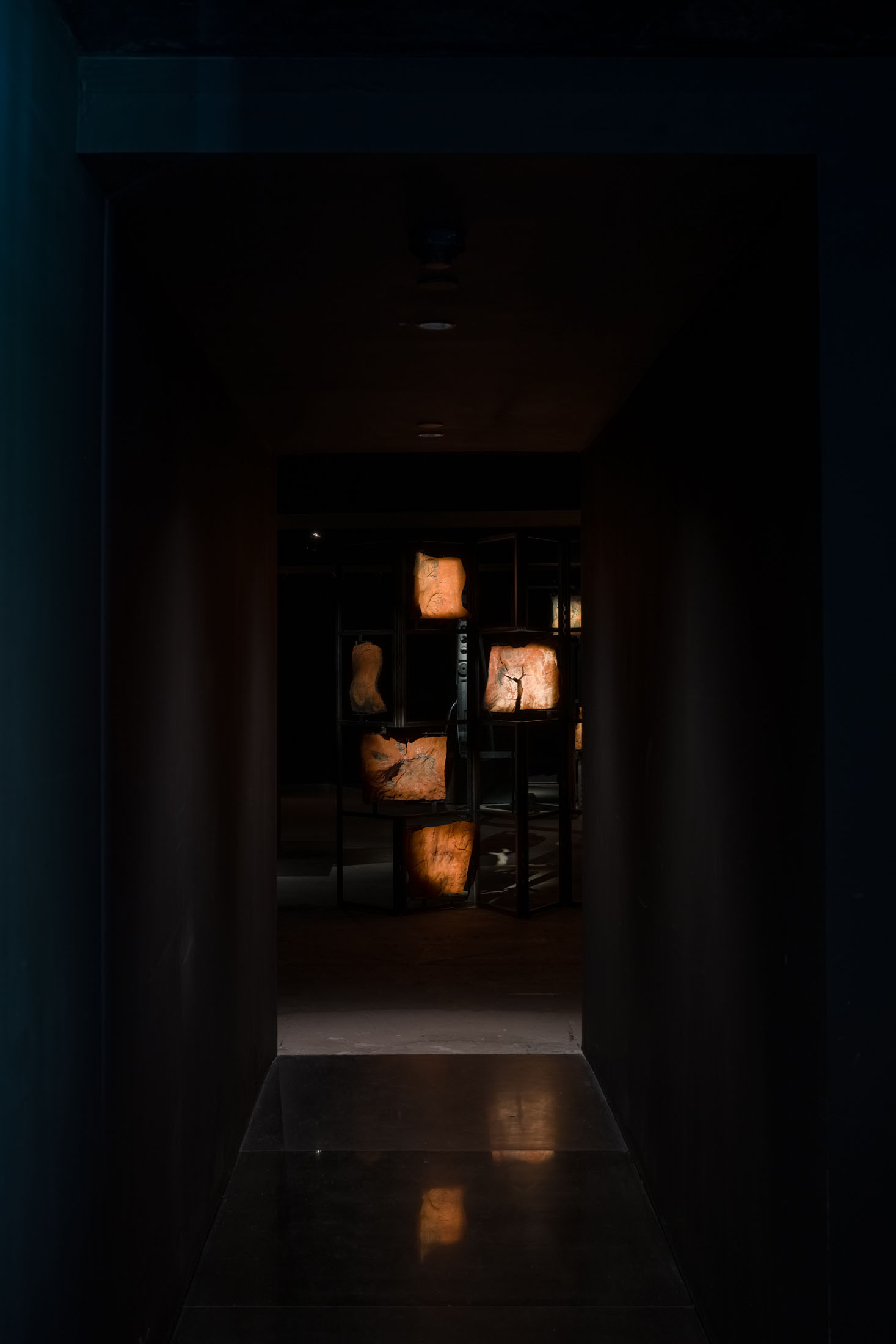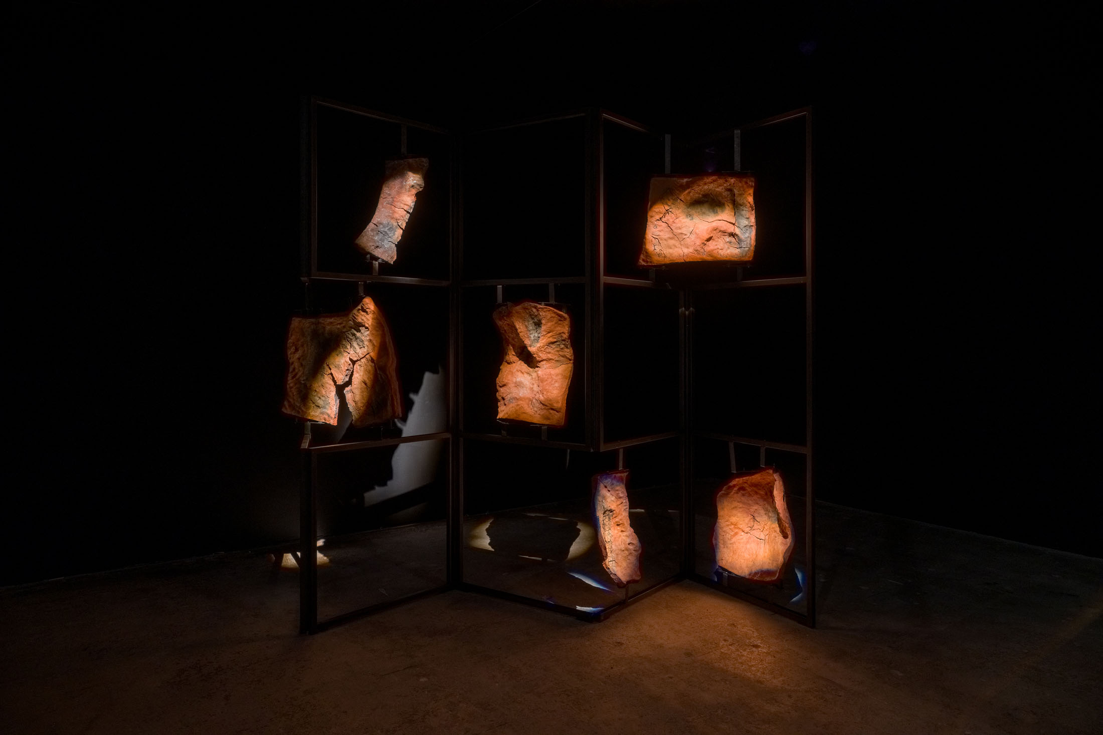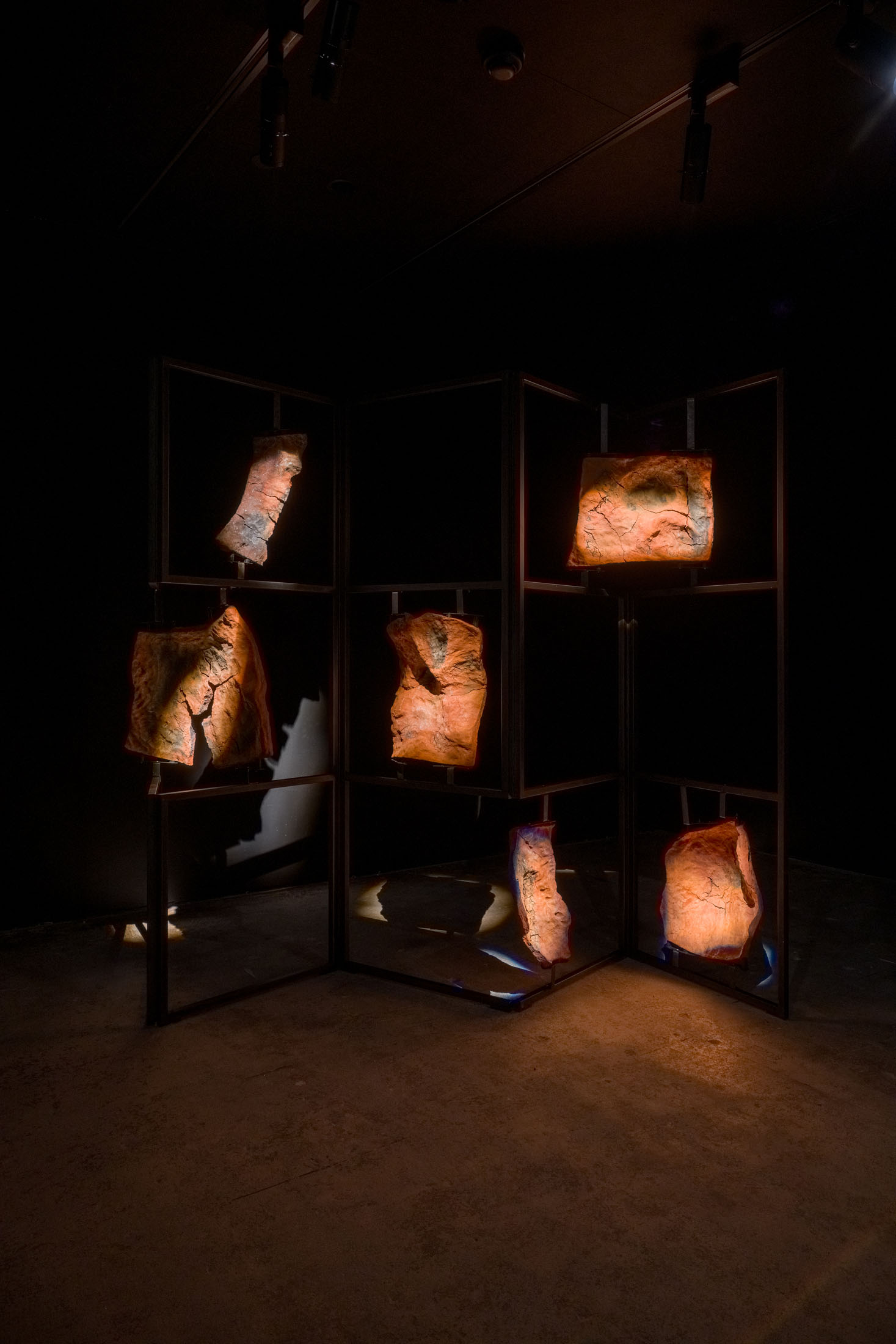 For her third solo exhibition at the gallery, Gork directs her practice towards the existential entanglement of the individual within the matrices of inherited trauma, social fragmentation, and affective lacunae; lacks or wounds which determine her on a somatic and psychological level, but which can only be known through the inadequate abstraction of history. Drawing on her own family history, research into historical records, and informal fieldwork, Gama seeks to transmute Gork’s reflections on the spectral undercurrents of American and Japanese imperialism—in particular the charged silences surrounding the Battle of Okinawa, the island’s continued military occupation, and its quasicolonial relationship with the mainland—into a psychoacoustic landscape within the gallery. Her series of titular works, Gama, draw their name from the Okinawan term for cave, and are scattered across the upper and lower floors as a sequence of haunting ceramic reliefs. These caverns have a complex and ambivalent history in Ryukuan culture, from their archaic usage as burial sites, ritualistic settings, and refuges to their violent perversion by wartime occupation. Cast using a type of red clay unique to Okinawa, their earthen forms mirror the complex interior topographies of the island’s limestone caverns alongside their resultant echoes. Appearing as earthen envelopes punctuating the darkness, these sculptures seem to encapsulate the internal tension between security and vulnerability, wholeness and fragmentation, ligation and dissociation—recalling at once both the hearth and the abyss. Conceived less as static architectures than as permeable membranes, their seeming mobility reflects an anachronic sense of thrownness or dislocation, perhaps echoing the suspension of the subject within the purgatory of historical memory.