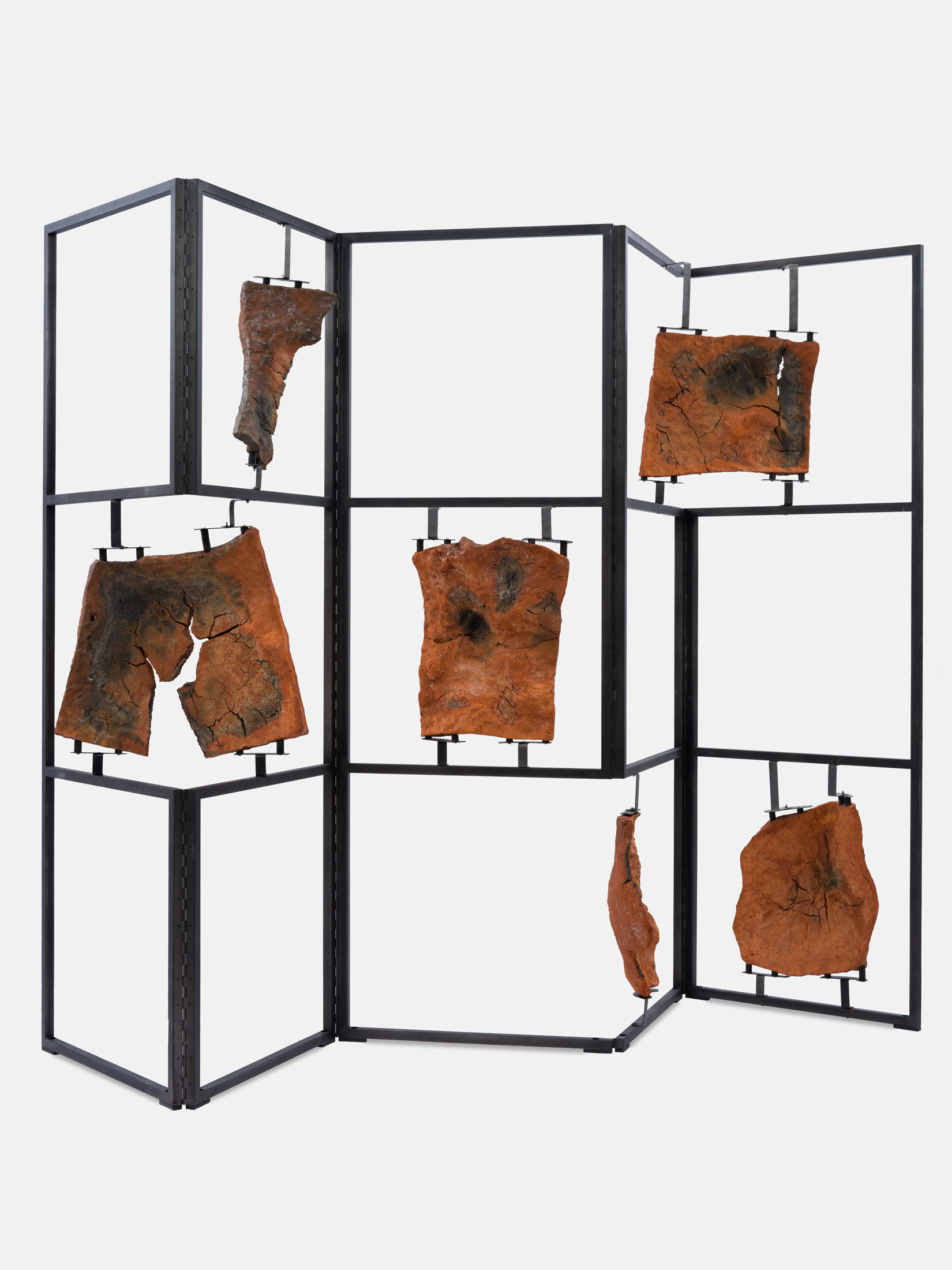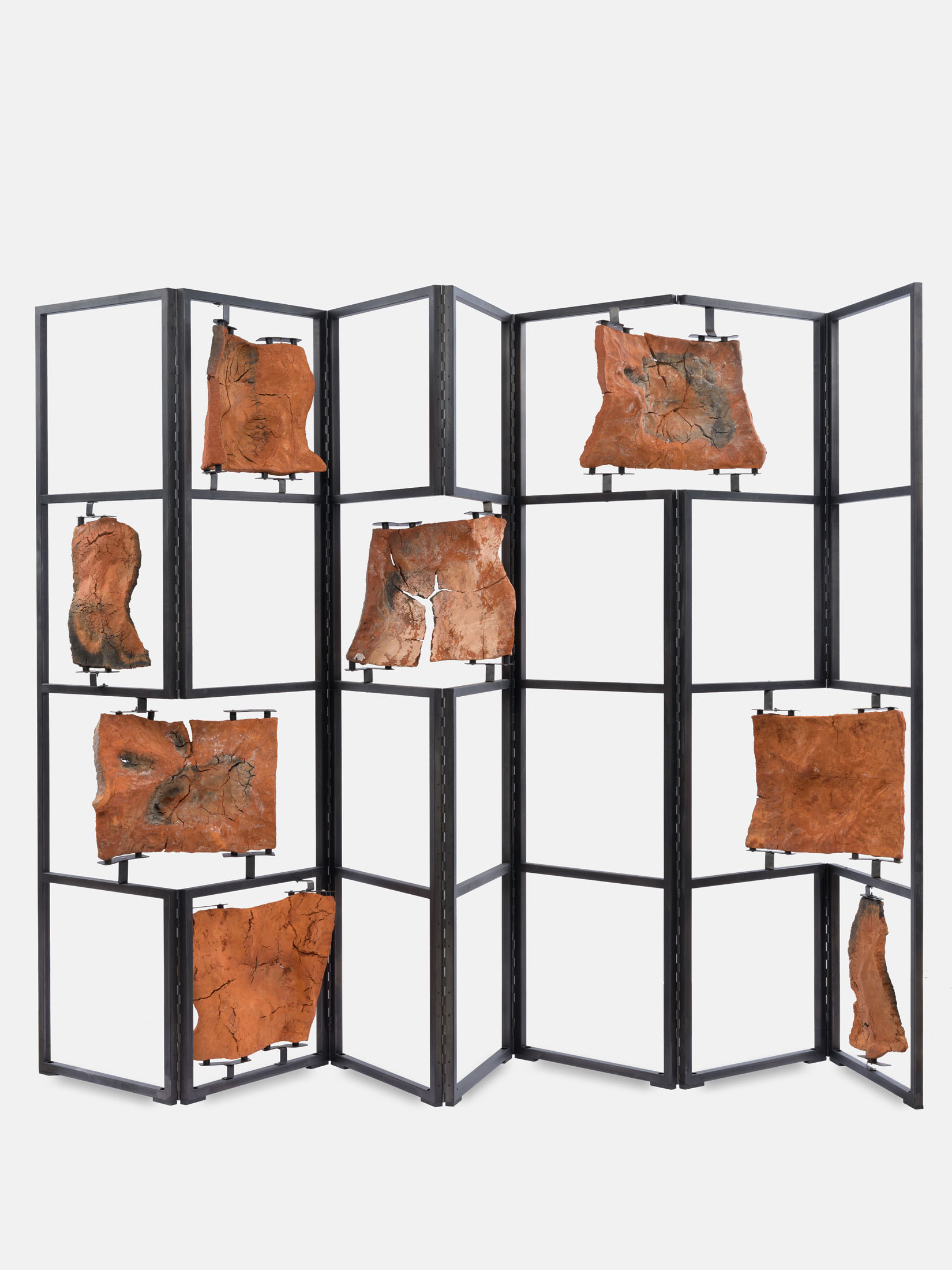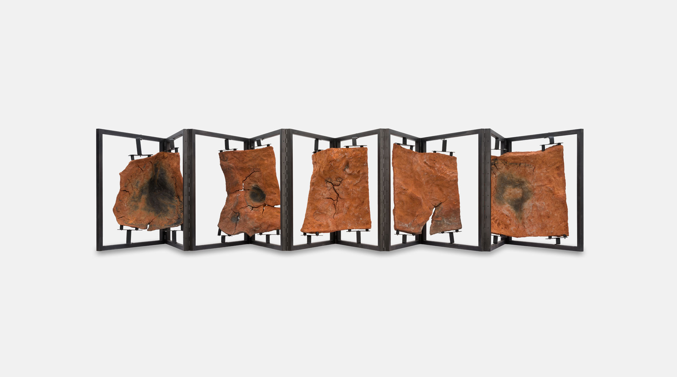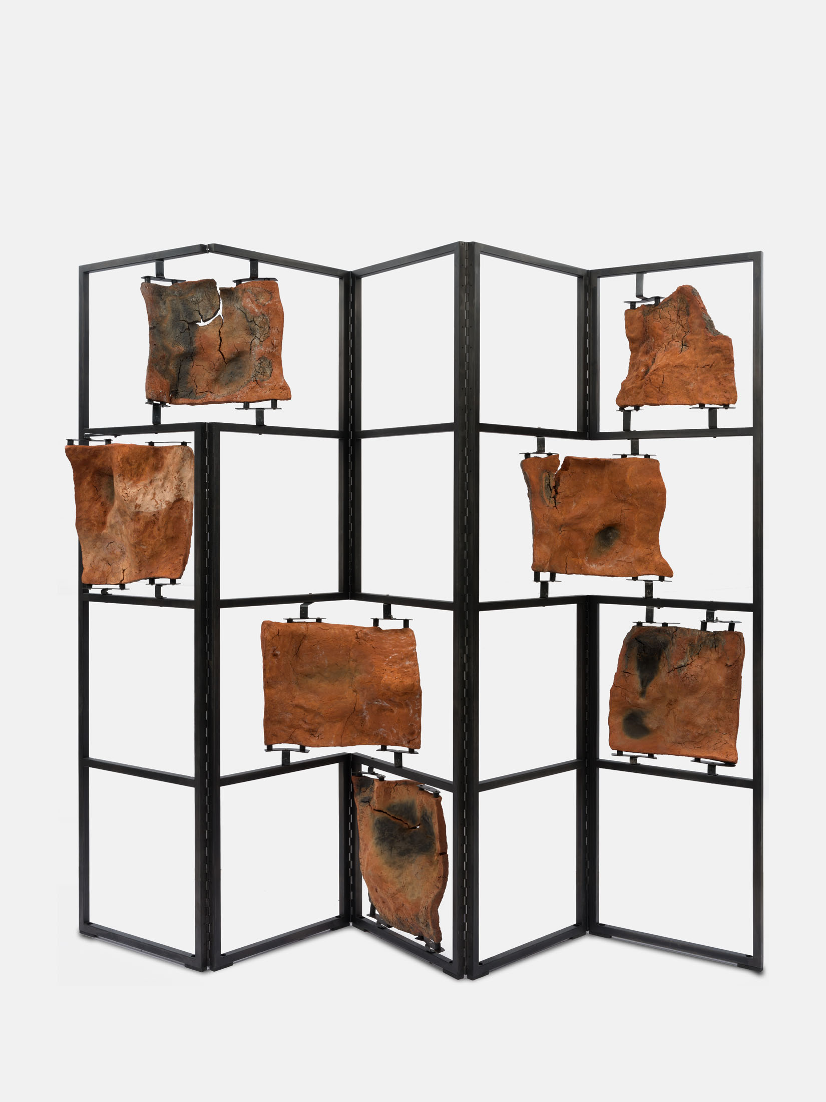 For her third solo exhibition at the gallery, Gork directs her practice towards the existential entanglement of the individual within the matrices of inherited trauma, social fragmentation, and affective lacunae; lacks or wounds which determine her on a somatic and psychological level, but which can only be known through the inadequate abstraction of history. Drawing on her own family history, research into historical records, and informal fieldwork, Gama seeks to transmute Gork’s reflections on the spectral undercurrents of American and Japanese imperialism—in particular the charged silences surrounding the Battle of Okinawa, the island’s continued military occupation, and its quasicolonial relationship with the mainland—into a psychoacoustic landscape within the gallery. Her series of titular works, Gama, draw their name from the Okinawan term for cave, and are scattered across the upper and lower floors as a sequence of haunting ceramic reliefs. These caverns have a complex and ambivalent history in Ryukuan culture, from their archaic usage as burial sites, ritualistic settings, and refuges to their violent perversion by wartime occupation. Cast using a type of red clay unique to Okinawa, their earthen forms mirror the complex interior topographies of the island’s limestone caverns alongside their resultant echoes. Appearing as earthen envelopes punctuating the darkness, these sculptures seem to encapsulate the internal tension between security and vulnerability, wholeness and fragmentation, ligation and dissociation—recalling at once both the hearth and the abyss. Conceived less as static architectures than as permeable membranes, their seeming mobility reflects an anachronic sense of thrownness or dislocation, perhaps echoing the suspension of the subject within the purgatory of historical memory.