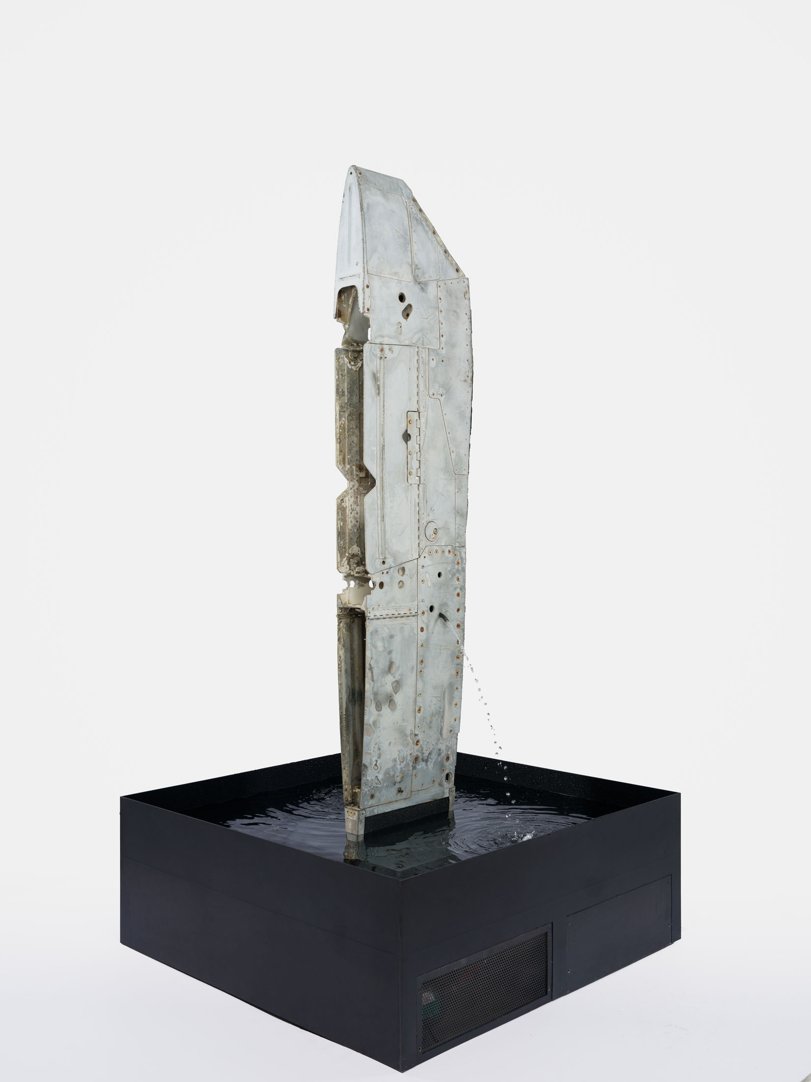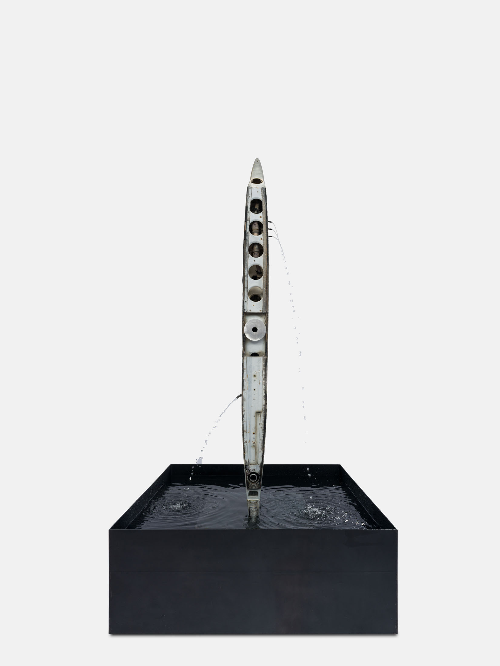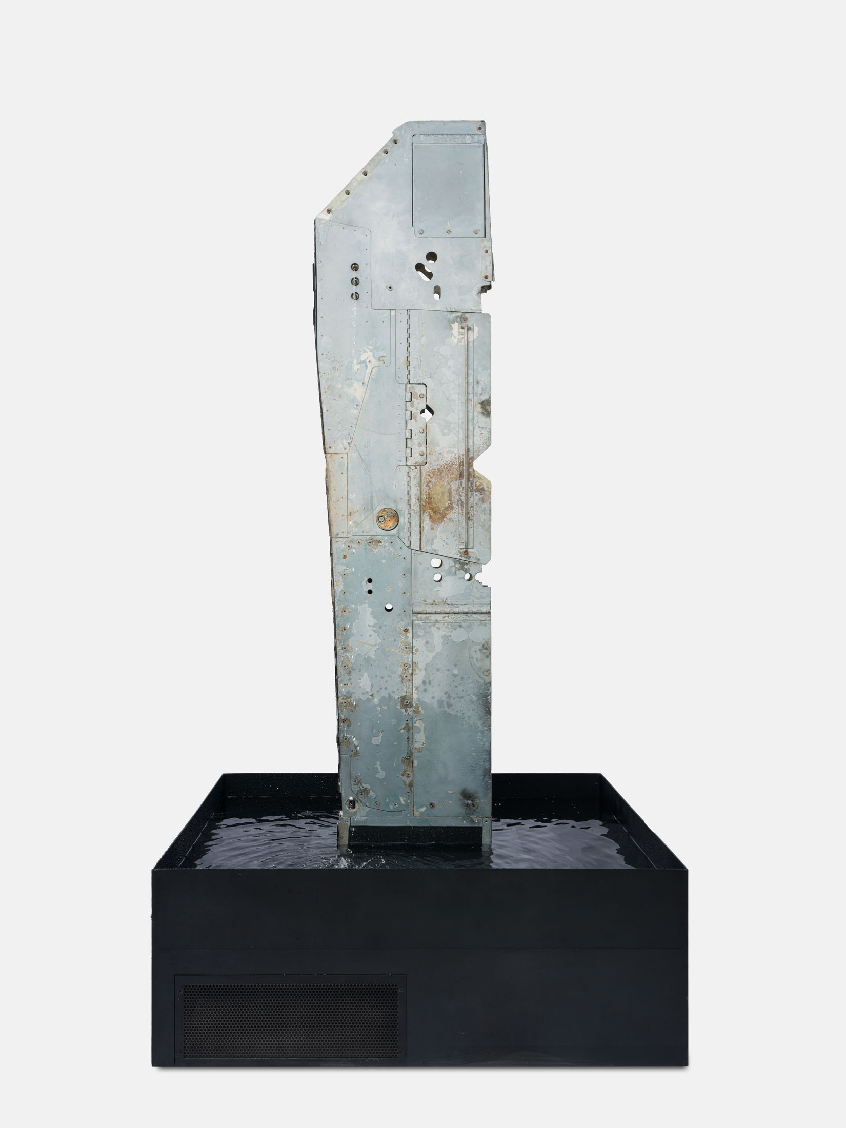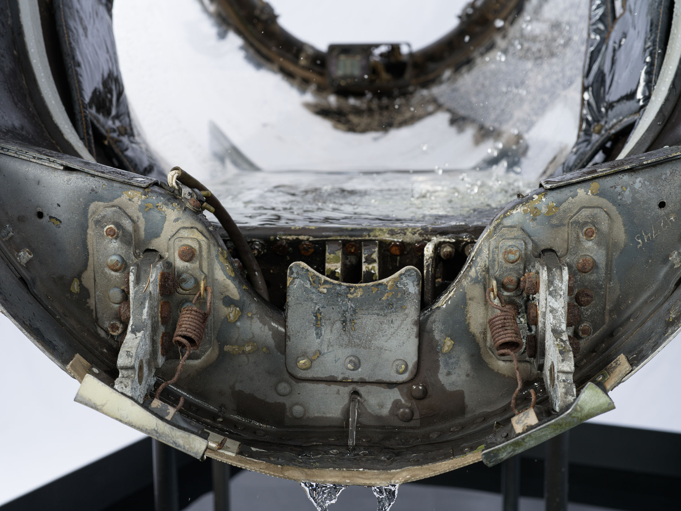 The organic contours of the Gama works are animated by the sound of water and metal emanating from a series of new sculptures entitled HNZF. Assembled from military aviation scrap, these works collapse multiple conflicting material histories into a single object—they touch on the hippiefied expressivity of scrap metal sculpture, the origins of intermedia art in American imperialism and military R&D, as well as the appropriation of “Eastern” mysticism by the Western world. Referencing the form of so-called “zen fountains” often found in new age or therapeutic settings, Gork’s take on these devices transforms them from spurious new age tchotchkes into decidedly uncomfortable generators of noise. The anticipated rhythm of meditative, slowly dripping water is brutally disrupted by recurrent eruptions of non-diegetic sound—a gnawing fullness which paradoxically leaves one empty. These sculptures provoke an involuntary embodying of dissonance, disrupting the self-satisfied assumption of critical distance which typifies our contemporary relationship to both art and history.