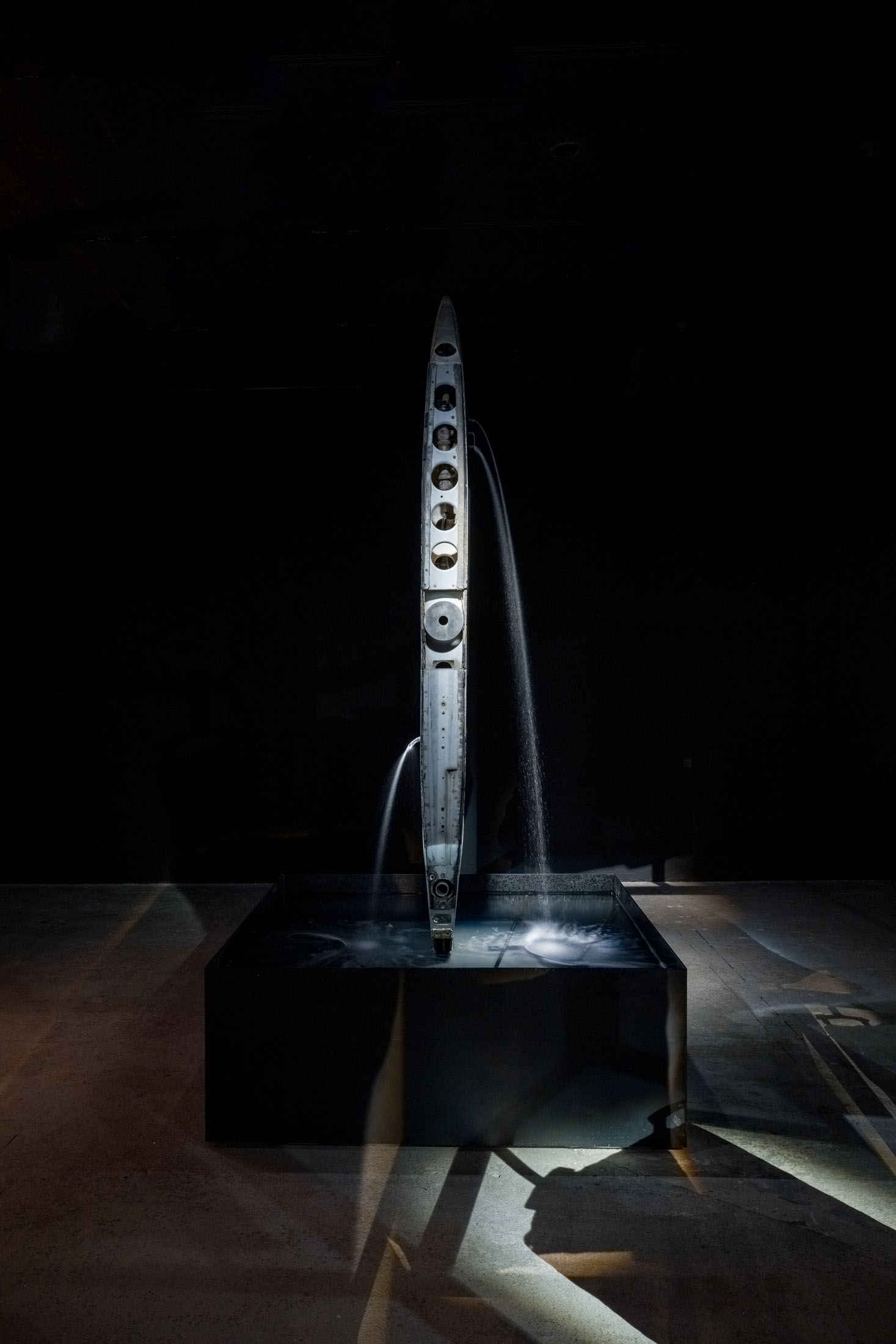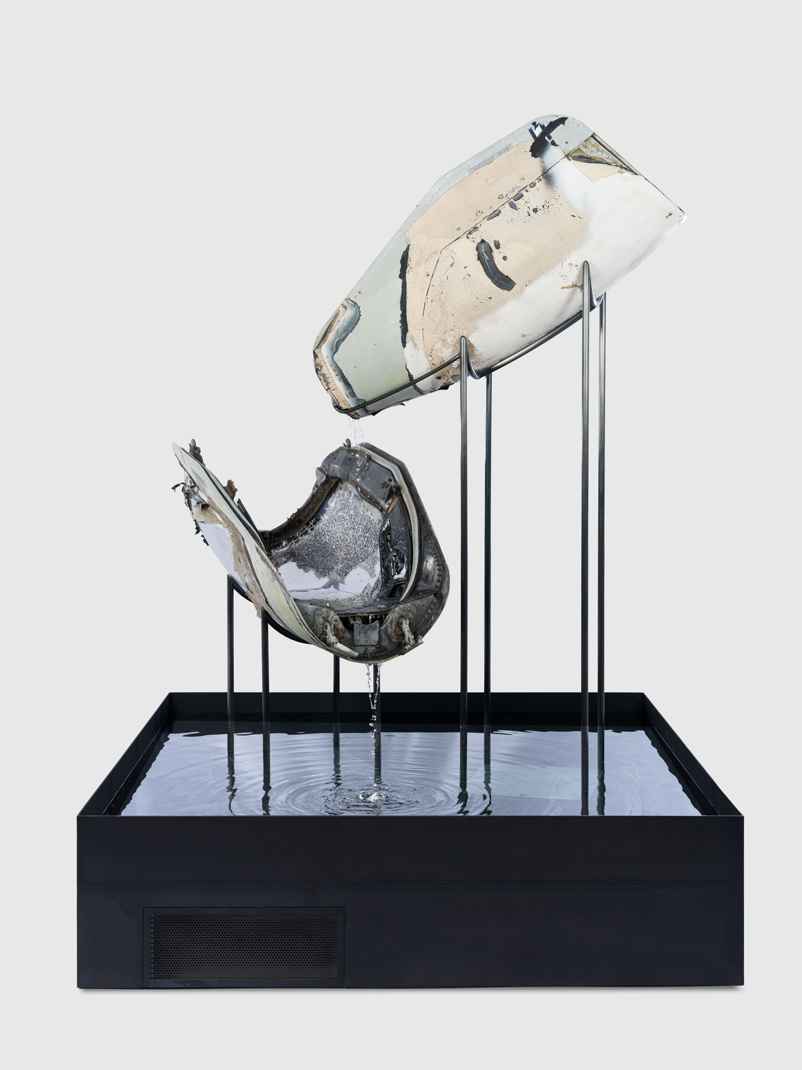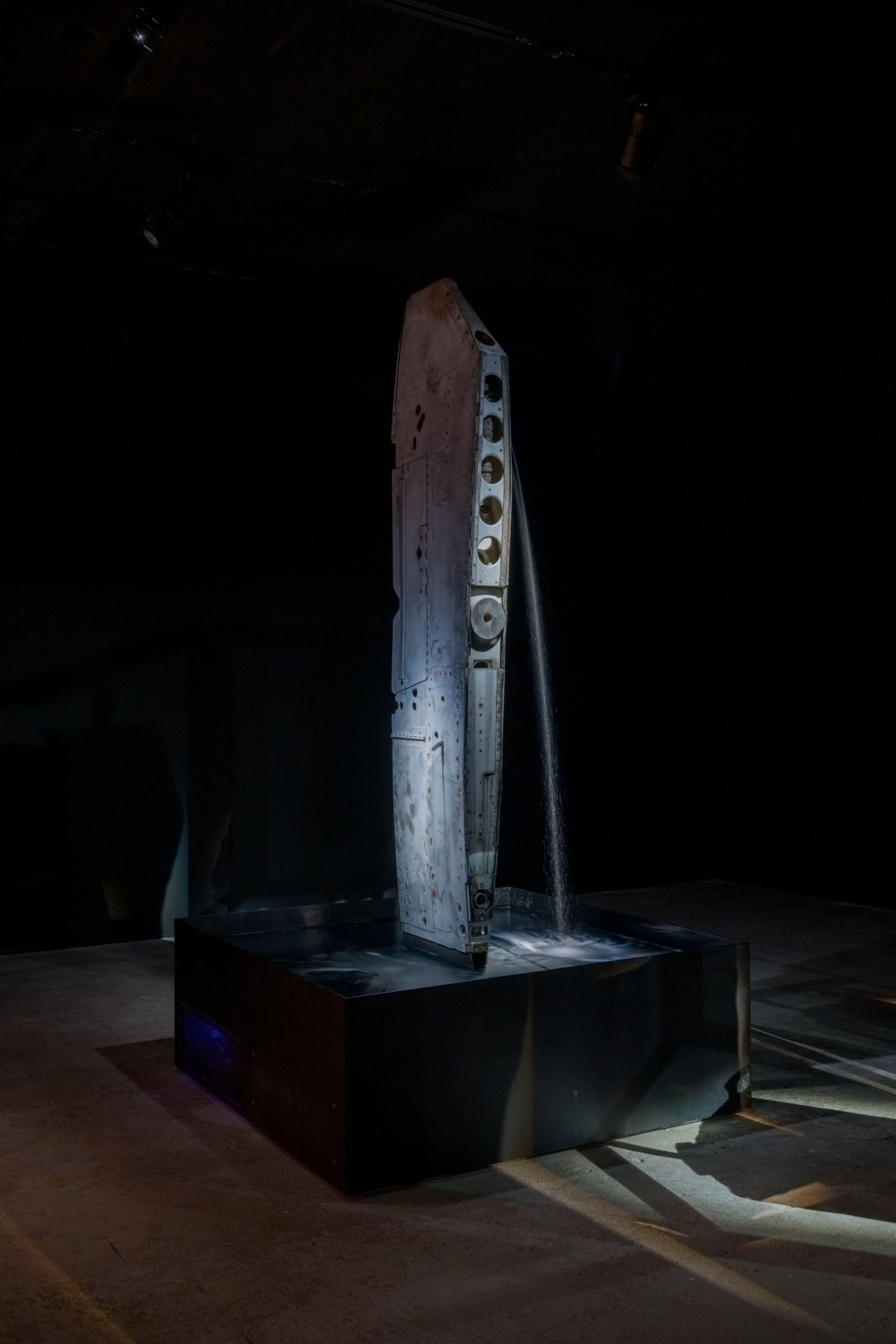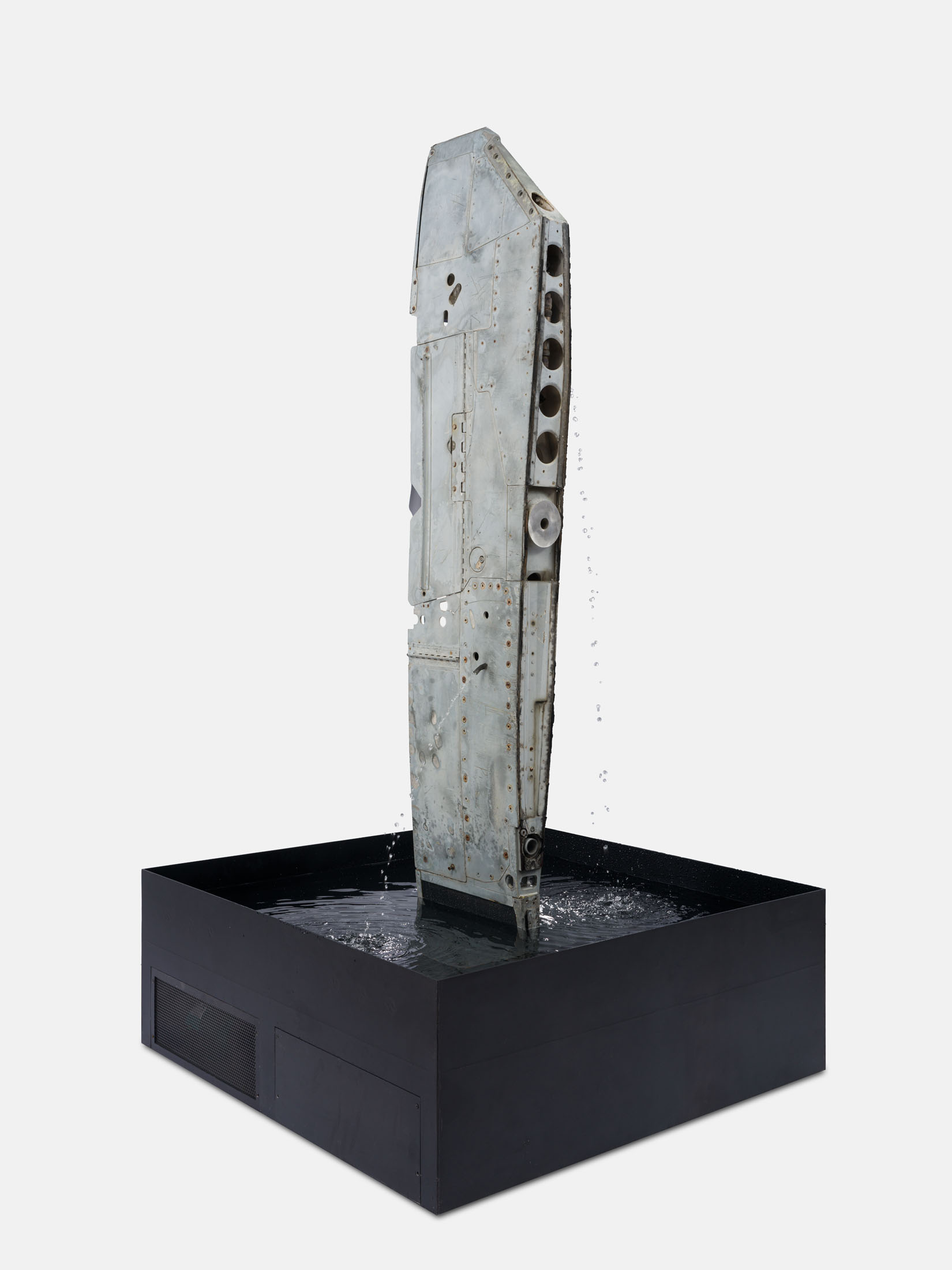 The organic contours of the Gama works are animated by the sound of water and metal emanating from a series of new sculptures entitled HNZF. Assembled from military aviation scrap, these works collapse multiple conflicting material histories into a single object—they touch on the hippiefied expressivity of scrap metal sculpture, the origins of intermedia art in American imperialism and military R&D, as well as the appropriation of “Eastern” mysticism by the Western world. Referencing the form of so-called “zen fountains” often found in new age or therapeutic settings, Gork’s take on these devices transforms them from spurious new age tchotchkes into decidedly uncomfortable generators of noise. The anticipated rhythm of meditative, slowly dripping water is brutally disrupted by recurrent eruptions of non-diegetic sound—a gnawing fullness which paradoxically leaves one empty. These sculptures provoke an involuntary embodying of dissonance, disrupting the self-satisfied assumption of critical distance which typifies our contemporary relationship to both art and history.