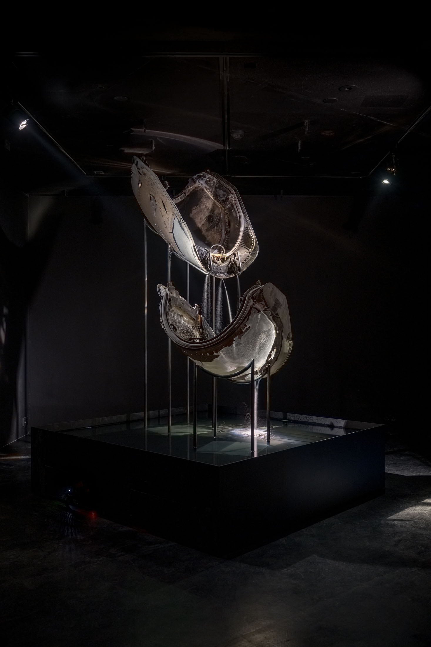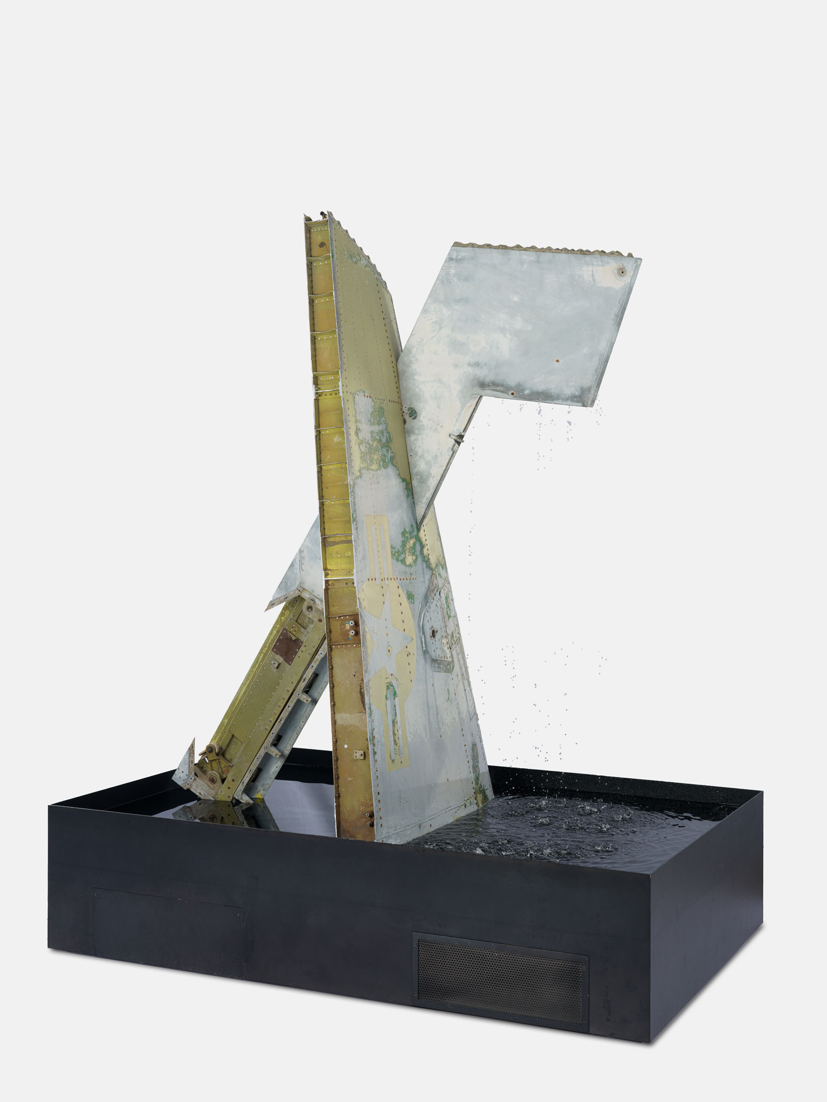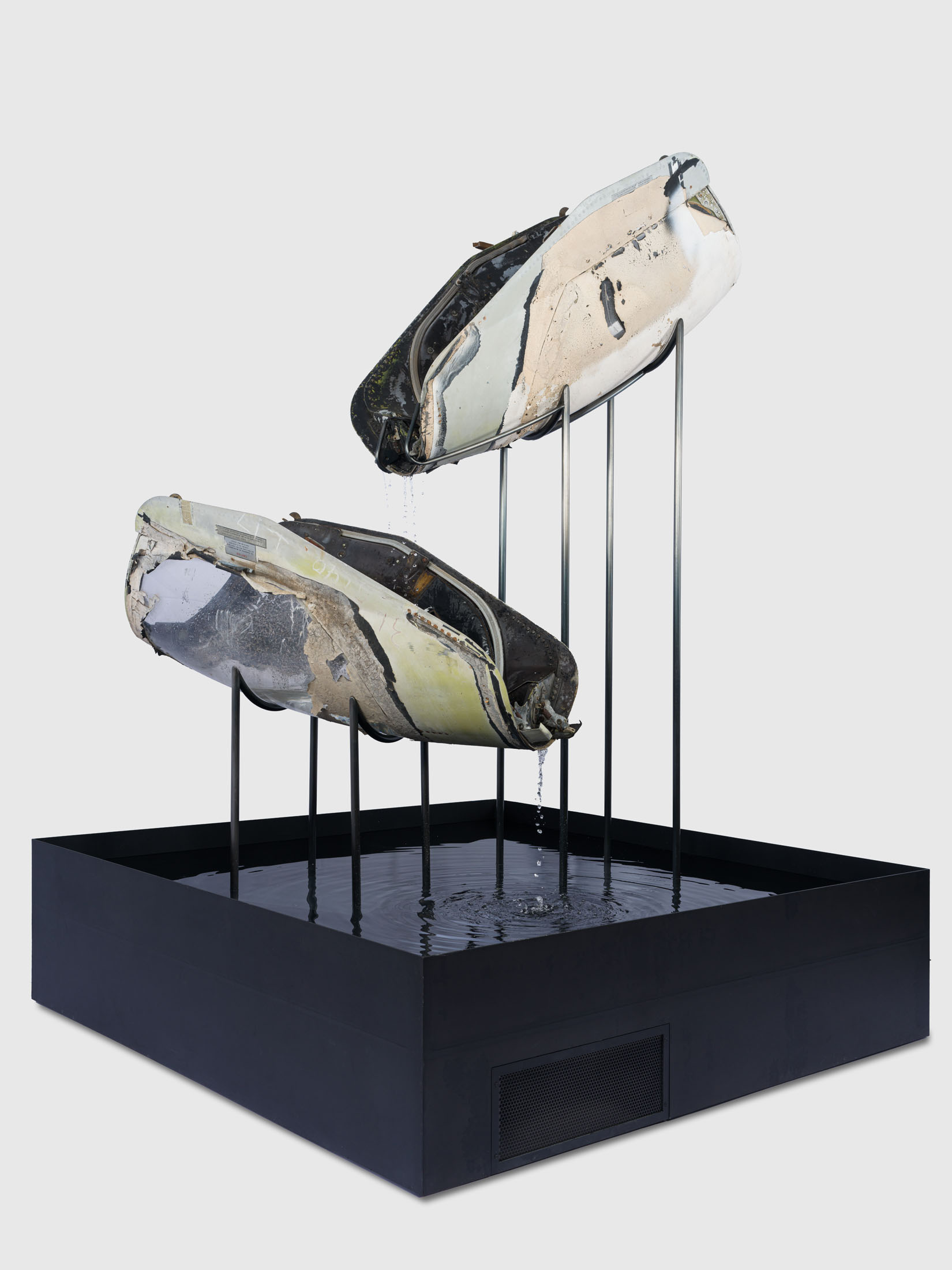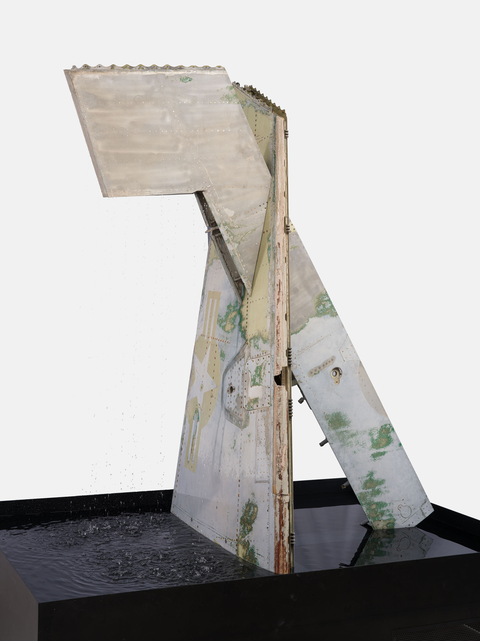The organic contours of the Gama works are animated by the sound of water and metal emanating from a series of new sculptures entitled HNZF. Assembled from military aviation scrap, these works collapse multiple conflicting material histories into a single object—they touch on the hippiefied expressivity of scrap metal sculpture, the origins of intermedia art in American imperialism and military R&D, as well as the appropriation of “Eastern” mysticism by the Western world. Referencing the form of so-called “zen fountains” often found in new age or therapeutic settings, Gork’s take on these devices transforms them from spurious new age tchotchkes into decidedly uncomfortable generators of noise. The anticipated rhythm of meditative, slowly dripping water is brutally disrupted by recurrent eruptions of non-diegetic sound—a gnawing fullness which paradoxically leaves one empty. These sculptures provoke an involuntary embodying of dissonance, disrupting the self-satisfied assumption of critical distance which typifies our contemporary relationship to both art and history.