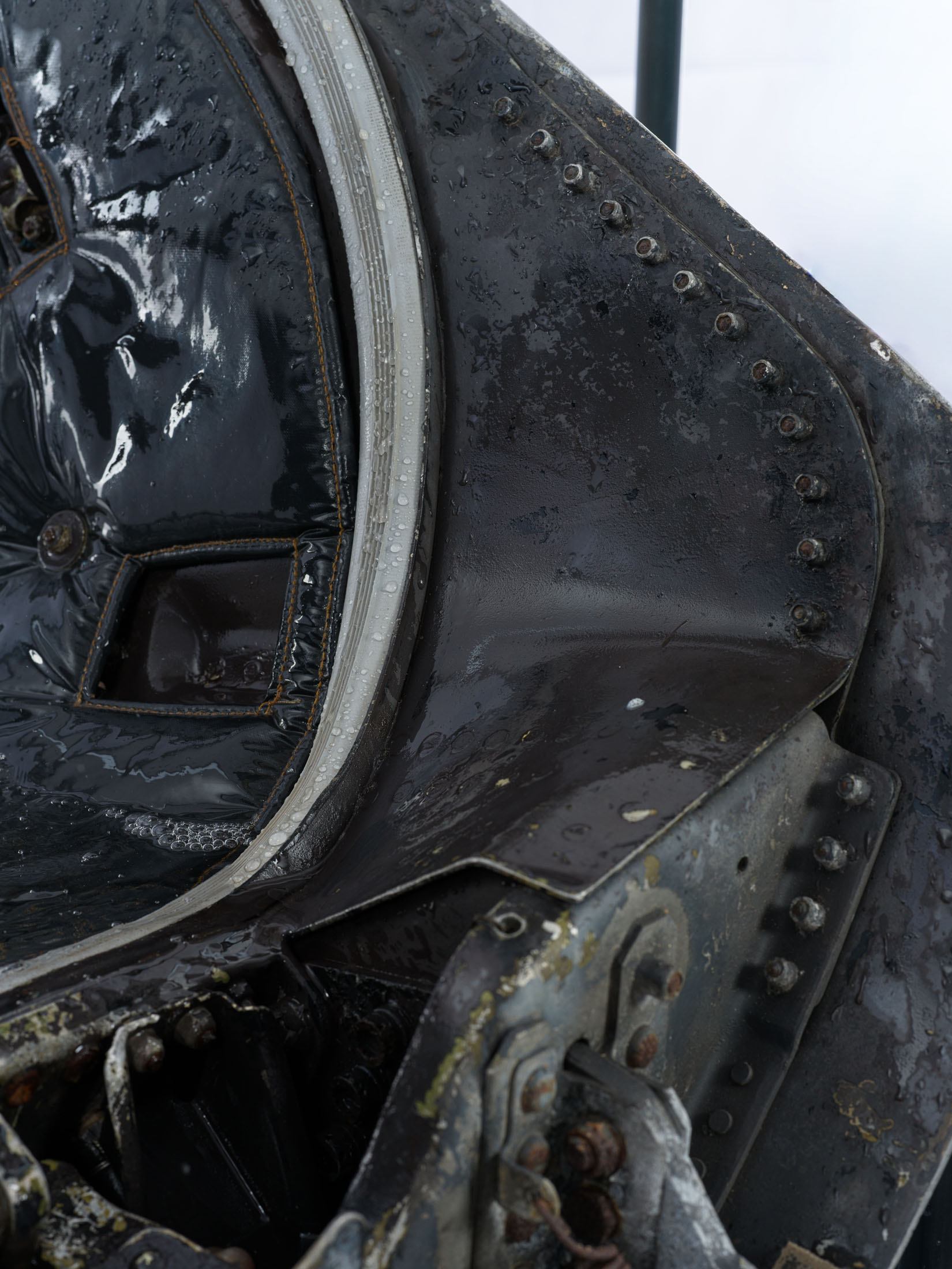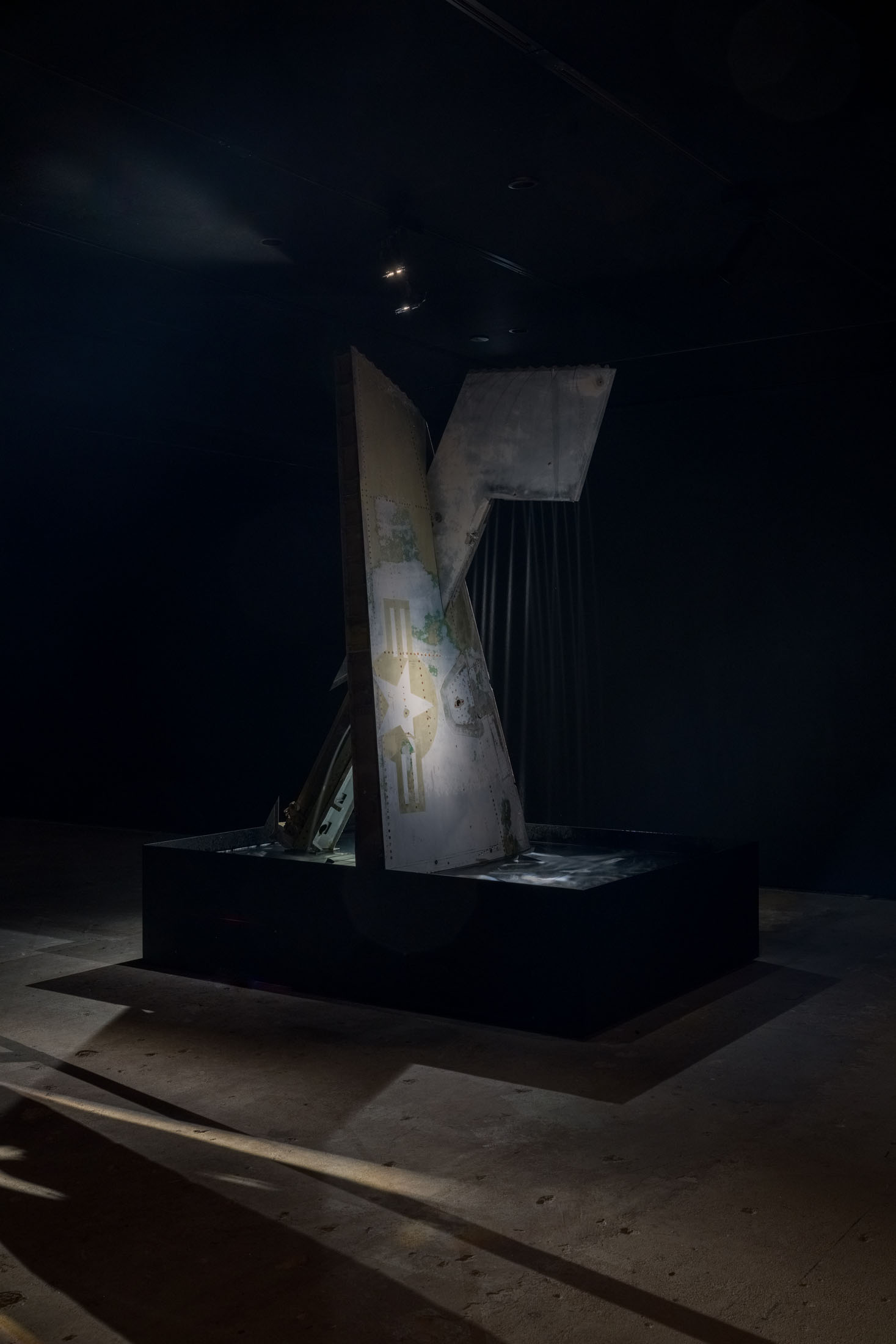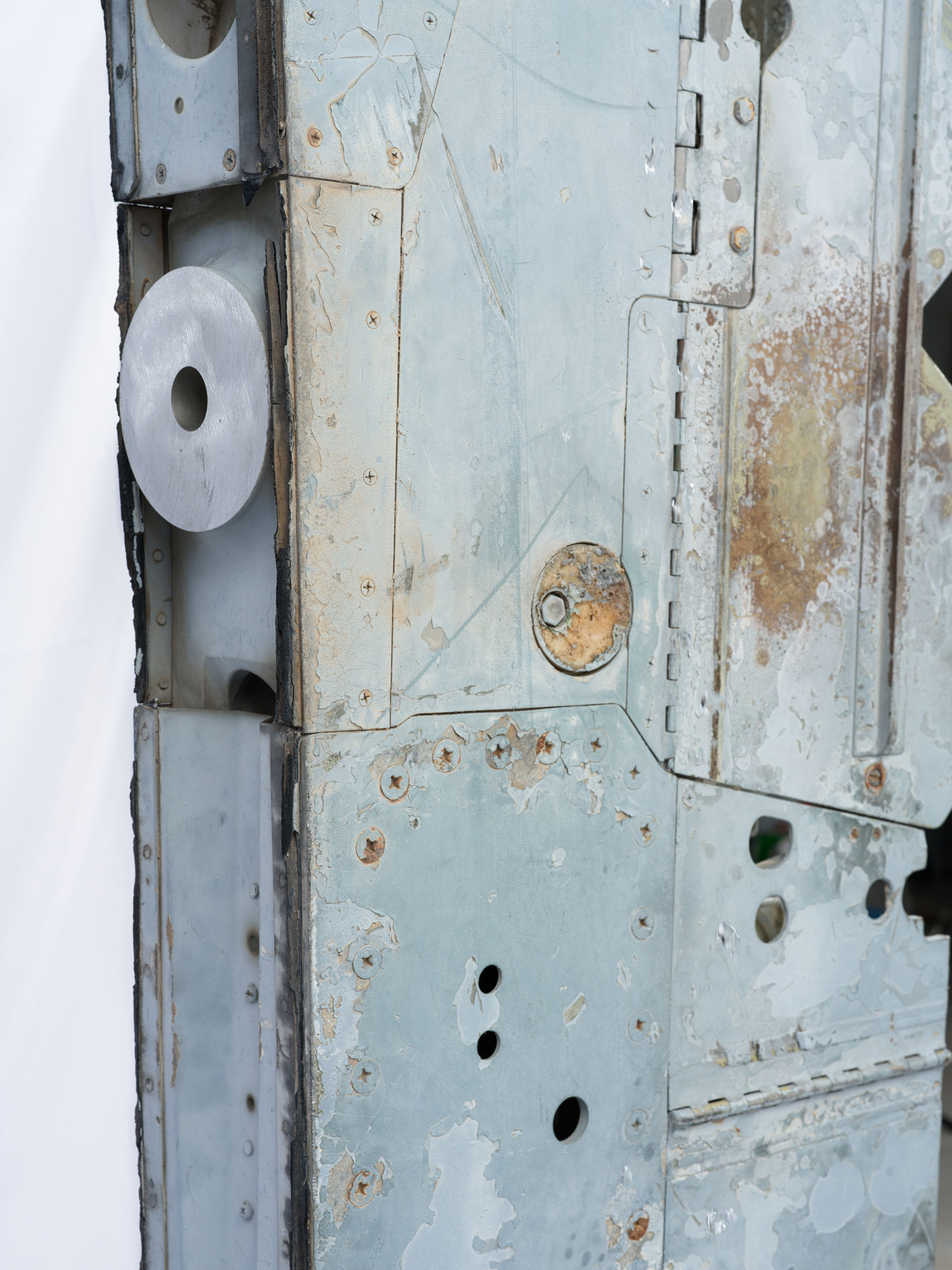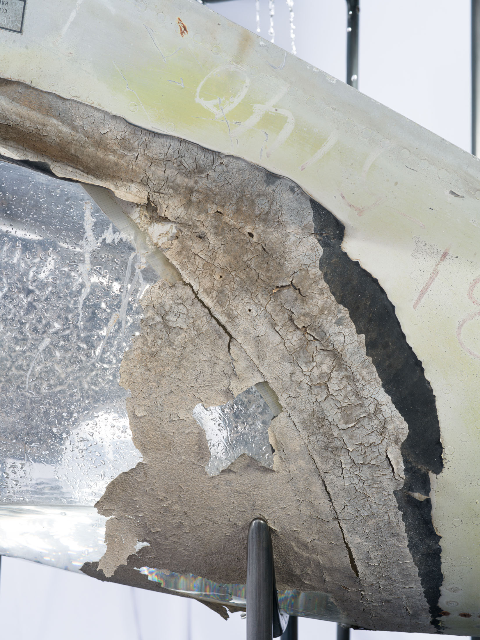 The organic contours of the Gama works are animated by the sound of water and metal emanating from a series of new sculptures entitled HNZF. Assembled from military aviation scrap, these works collapse multiple conflicting material histories into a single object—they touch on the hippiefied expressivity of scrap metal sculpture, the origins of intermedia art in American imperialism and military R&D, as well as the appropriation of “Eastern” mysticism by the Western world. Referencing the form of so-called “zen fountains” often found in new age or therapeutic settings, Gork’s take on these devices transforms them from spurious new age tchotchkes into decidedly uncomfortable generators of noise. The anticipated rhythm of meditative, slowly dripping water is brutally disrupted by recurrent eruptions of non-diegetic sound—a gnawing fullness which paradoxically leaves one empty. These sculptures provoke an involuntary embodying of dissonance, disrupting the self-satisfied assumption of critical distance which typifies our contemporary relationship to both art and history.