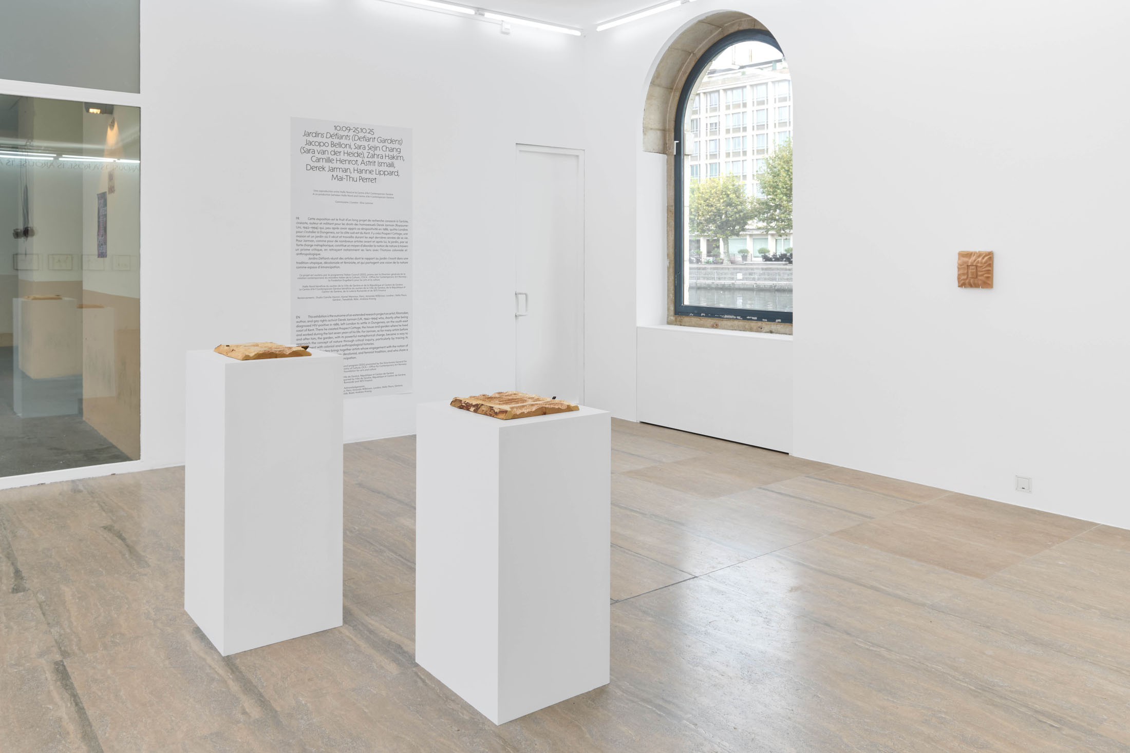 Jardins Défiants (Defiant Gardens). Exhibition viewJacopo Belloni, Hypnos, 2025Camille Henrot, Is it Possible to be Revolutionary and still like Flowers?, 2011-ongoing, Courtesy of Studio Camille Henrot and Mennour, ParisCamille Henrot, Is it Possible to be Revolutionary and still like Flowers?, 2011-ongoing, Courtesy of Studio Camille Henrot and Mennour, ParisLeft: Astrit Ismaili, Through and in and out of the Hole, 2023-ongoing. Right: Hanne Lippard, Arouses, 2025, Courtesy of the artist and LambdaLambdaLambda, PristinaAstrit Ismaili, Through and in and out of the Hole, 2023-ongoingHanne Lippard, Loveliness Extreme, 2025, Courtesy of the artist and LambdaLambdaLambda, PristinaMai-Thu Perret, In Darkness Let Me Dwell, 2010, Courtesy of the artist and Galerie Francesca Pia, ZurichZahra Hakim, Un Éclat d’une Lumière Perdue I, II & III, 2025, Carved woodZahra Hakim, Un Éclat d’une Lumière Perdue III, 2025Sara Sejin Chang (Sara van der Heide), The Garden, 2014Derek Jarman, Household God III (Wagner), 1989, Courtesy of Amanda Wilkinson Gallery, LondonDerek Jarman, Household God III (Wagner), 1989, Courtesy of Amanda Wilkinson Gallery, London