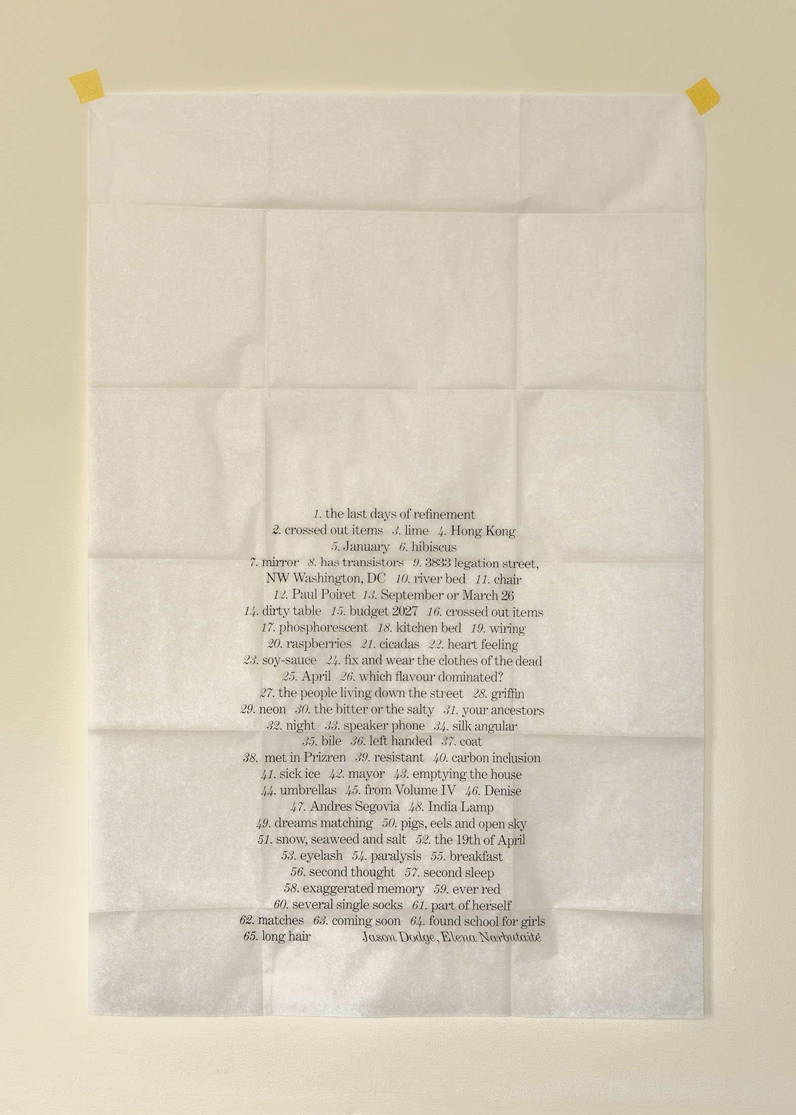 1. the last days of refinement 2. crossed out items 3. lime 4. Hong Kong 5. 2027 January 6. hibiscus 7. mirror 8. has transistors 9. 3833 legation street, NW Washington,DC 10. river bed 11. chair 12. Paul Poiret 13. September or March 26 14. dirty table 15. budget 2027 16. crossed out items 17. phosphorescent 18. kitchen bed 19. wiring 20. raspberries 21. cicadas 22. heart feeling 23. soy-sauce 24. fix and wear the clothes of the dead 25. April 26. which flavour dominated? 27. the people living down the street 28. griffin 29. neon 30. the bitter or the salty 31. your ancestors 32. April 32. Night 33. speakerphone 34. silk angular 35. bile 36. left handed 37. coat 38. met in Prizren 39. resistant 40. carbon Inclusion 41. sick ice 42. mayor 43. emptying the house 44. umbrellas 45. from Volume IV 46. Denise 47. Andres Segovia 48. India Lamp 49. dreams matching 50. pigs, eels and open sky 51. snow, seaweed and salt 52. the 19th of April 53. eyelash 54. paralysis 55. breakfast 56. second thought 57. second sleep 58. exaggerated memory 59. ever red 60. several single socks 61. part of herself 62. matches 63. coming soon 64. found school for girls 65. Long hair