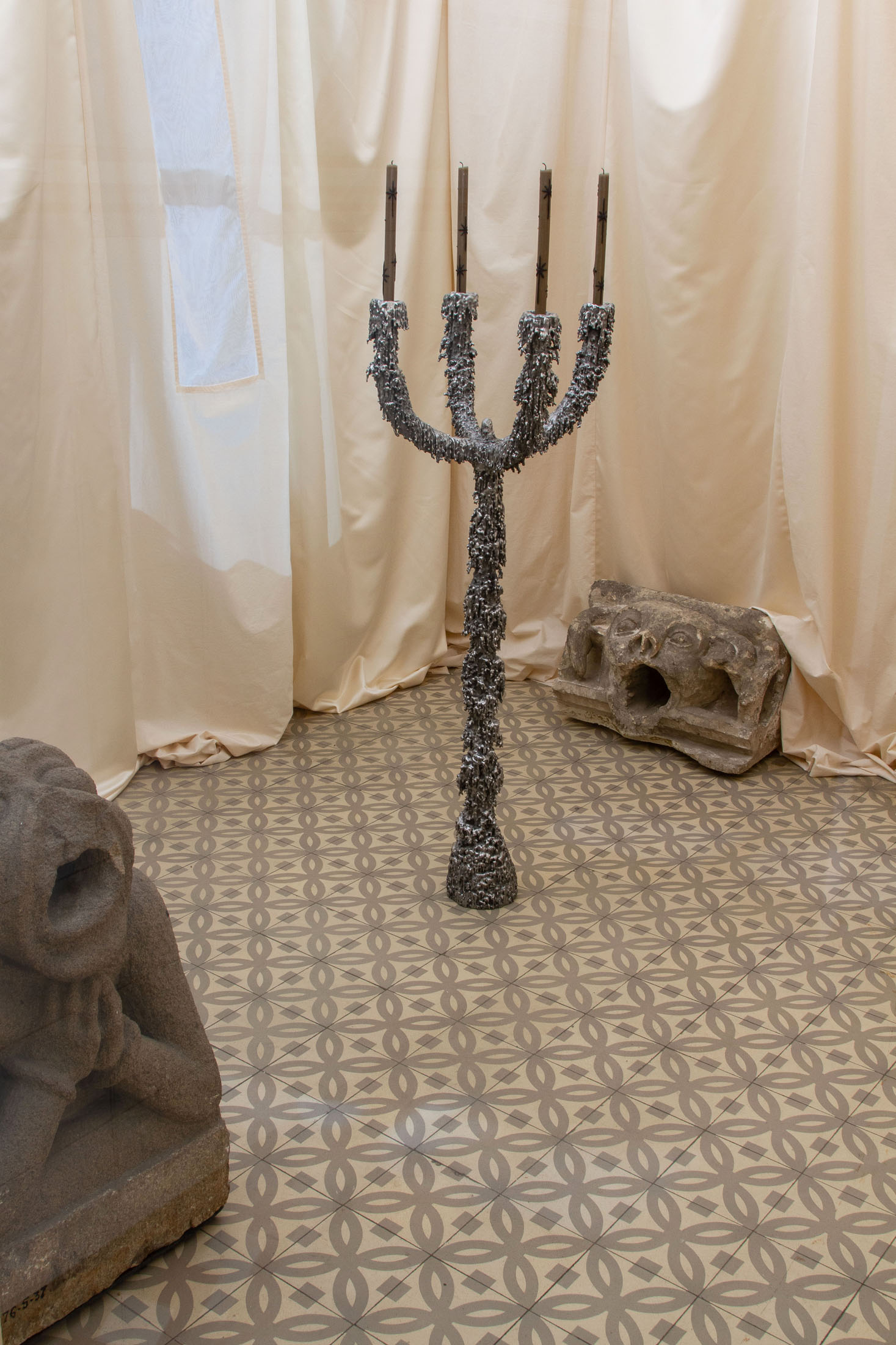 Blending antiques from the Musée Dobrée’s collections with original art works, Kaës creates an environment where forms seem to emerge from a dream. Textures expand or hollow out, materials capture or scatter light, and motifs borrowed from Nantes’ medieval architecture – grotesques, friezes, bestiaries – are reinterpreted until they become floating, almost mystical signs. The space is structured like a rite of passage: the central hall – lit by a constellation of revamped light fixtures – acts as a living heart, around which the exhibition rooms fan out like secular chapels or intimate tableaux.