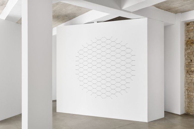In the first exhibition room, a complex framework of aluminum rods runs through the space and transports visitors into a deconstructed car production line. Within this structure, the front and rear bumpers of a car are connected via a cable system that seems to be under tension with a kind of battery, which is located at the center of the installation and forms its heart. It consists of crushed ores encased in epoxy resin and is in turn connected to alienated screens via cables. Another sculpture can be seen in the second exhibition room, which also consists of a bumper connected by cables and a flat screen. Both installations are illuminated and oriented towards the window, so that when looking from outside it appears as if one is looking into the presentation area of a car dealership.