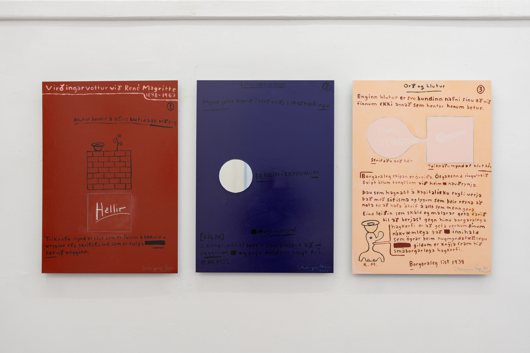 In Jóhanna’s exhibition, Steingrímur’s works are once again removed from their original context and re-situated within her own artistic framework. By doing so, she explores the interplay of influences between their practices — tracing how Steingrímur’s references to artists such as Marcel Broodthaers, Robert Filliou, Dorothy Iannone, and René Magritte continue to resonate in her own visual language.