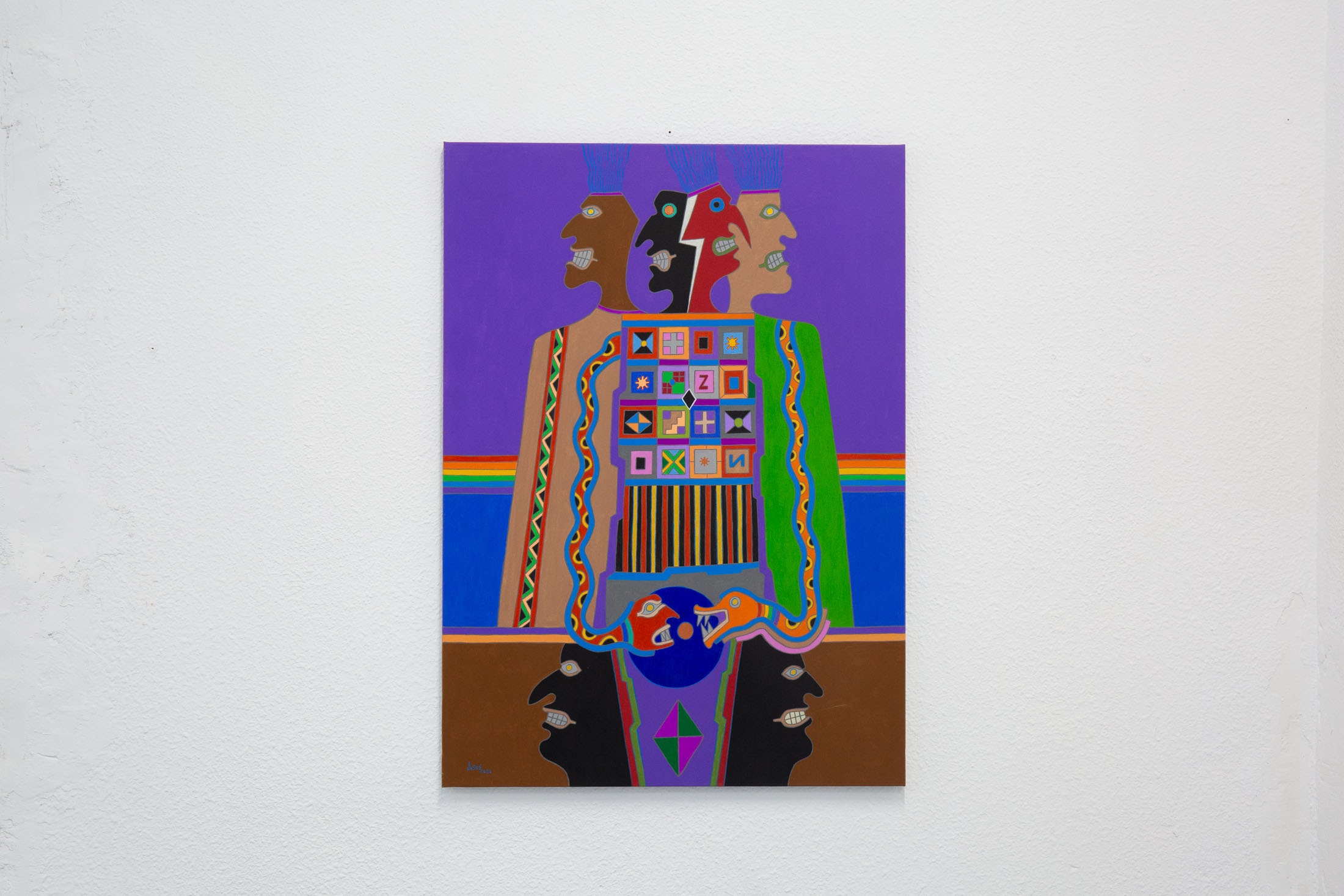 Josué’s paintings are distinguished by their defined planes and vibrant colors, as well as by the vitality of their geometric compositions, which emphasize the connections between elements drawn from textile patterns, rural architectural structures, the bodies of the apus, and the Andean deities alongside constellations and celestial bodies.