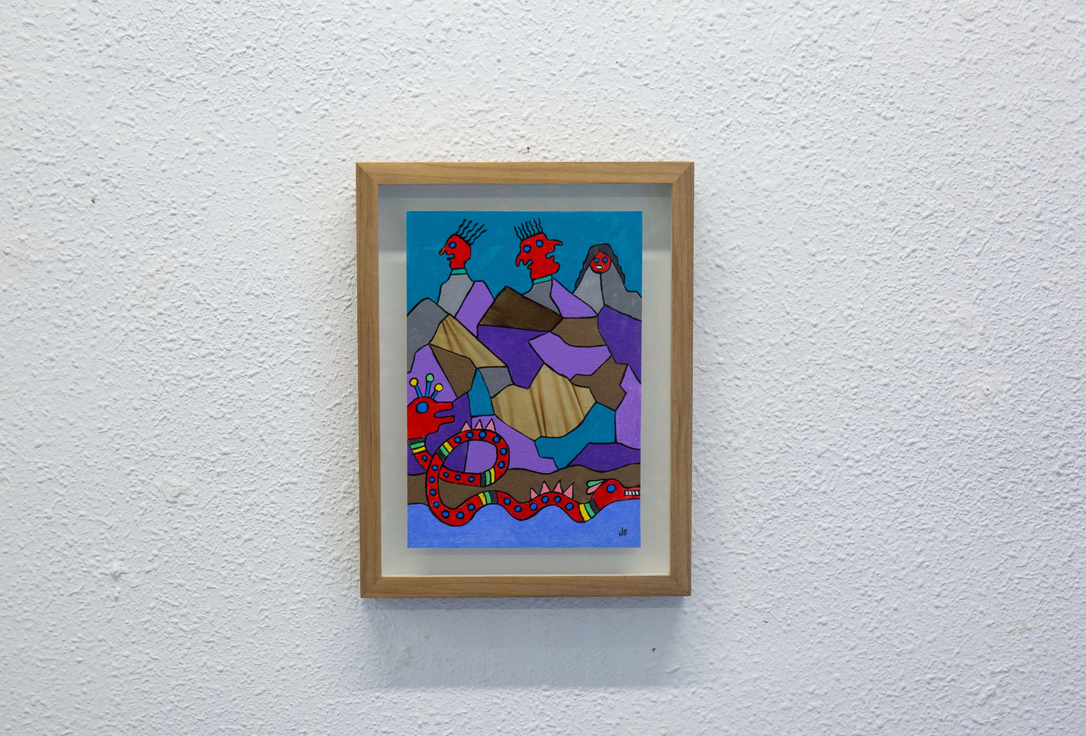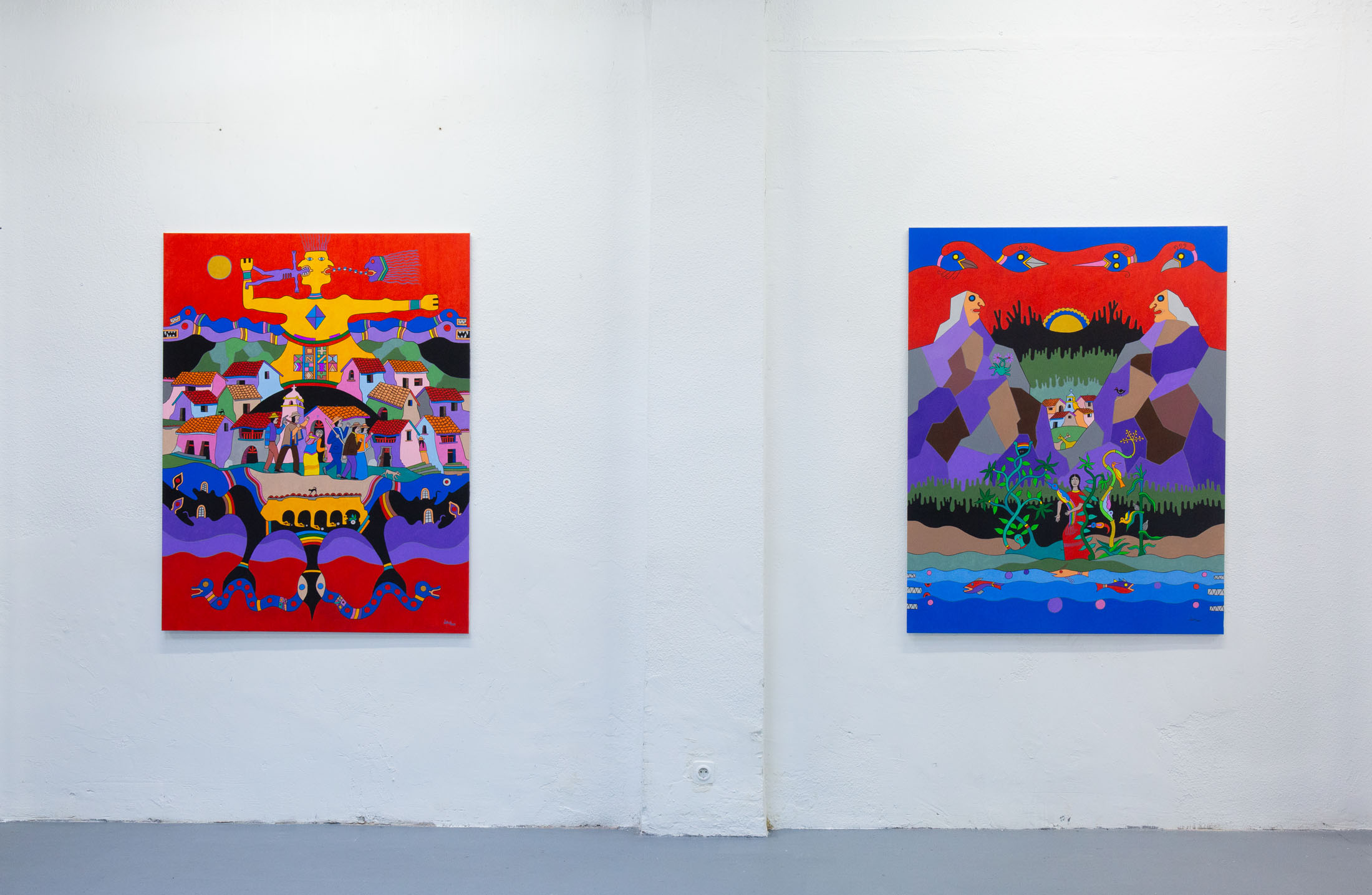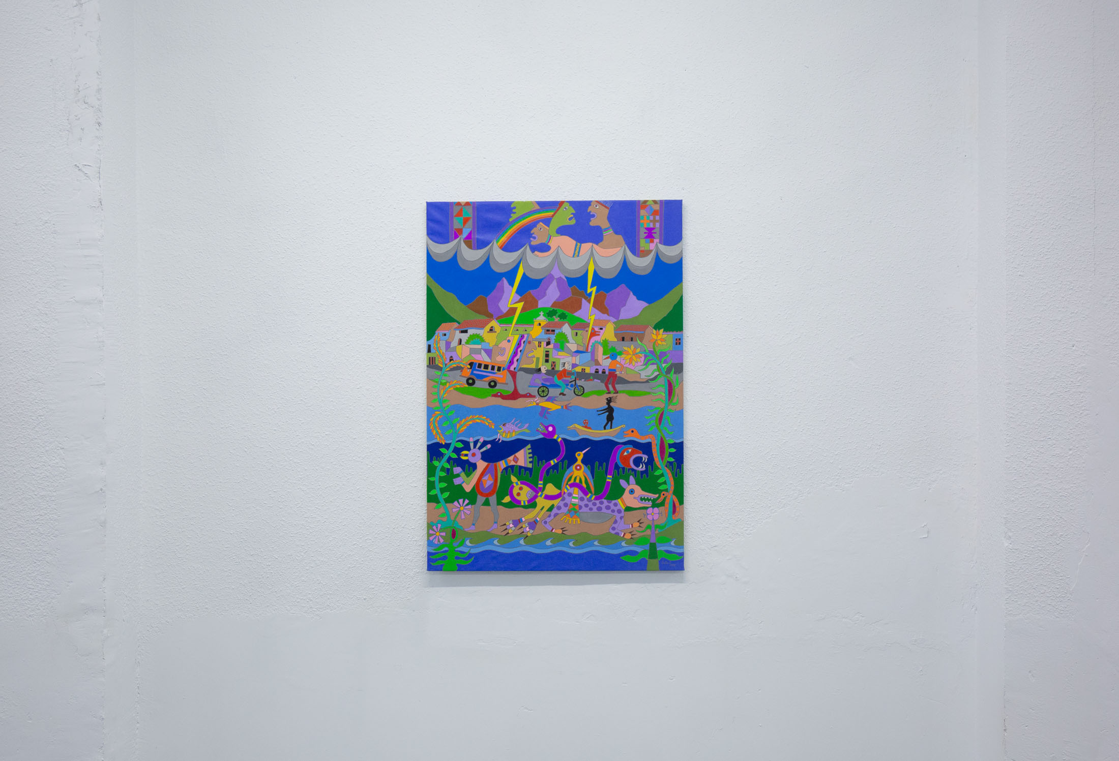 His first solo exhibition at Enhorabuena Espacio in Madrid takes its title from his work “The Breath of Time (2025)”. In it, Josué represents a network of coexistence among beings within the Uku Pacha (the underworld), the Kay Pacha (the world of the here and now), and the Hanan Pacha (the upper world). Mythology, as the breath of times past, calls forth a plural vision. There are divine beings such as Wiracocha, the creator of the universe—the axis that inhabits and sustains all things—as well as female deities, like Mama Huaco, whose presence and light extend toward the sky.