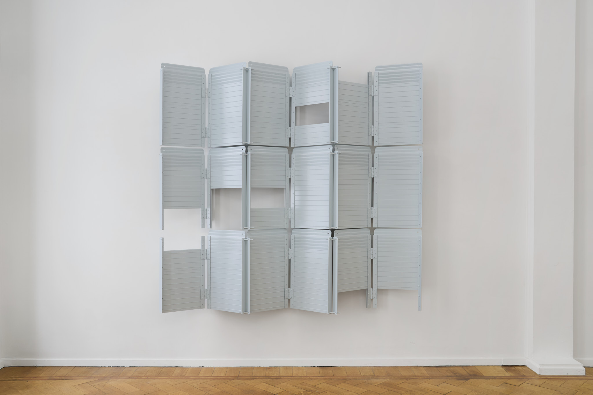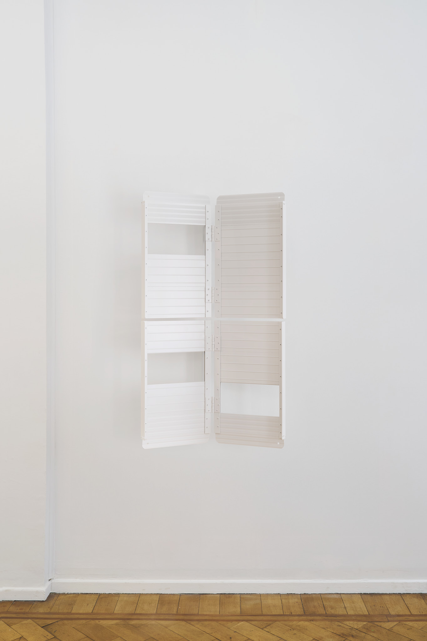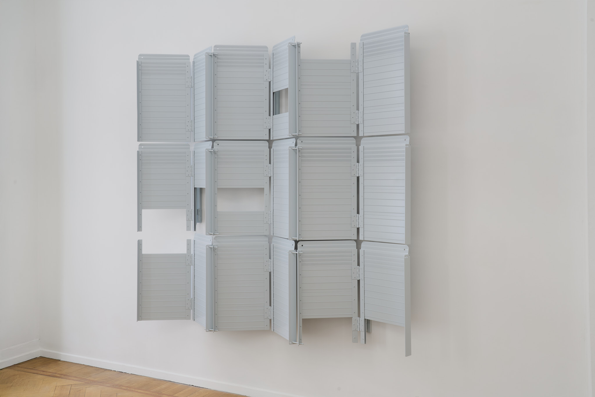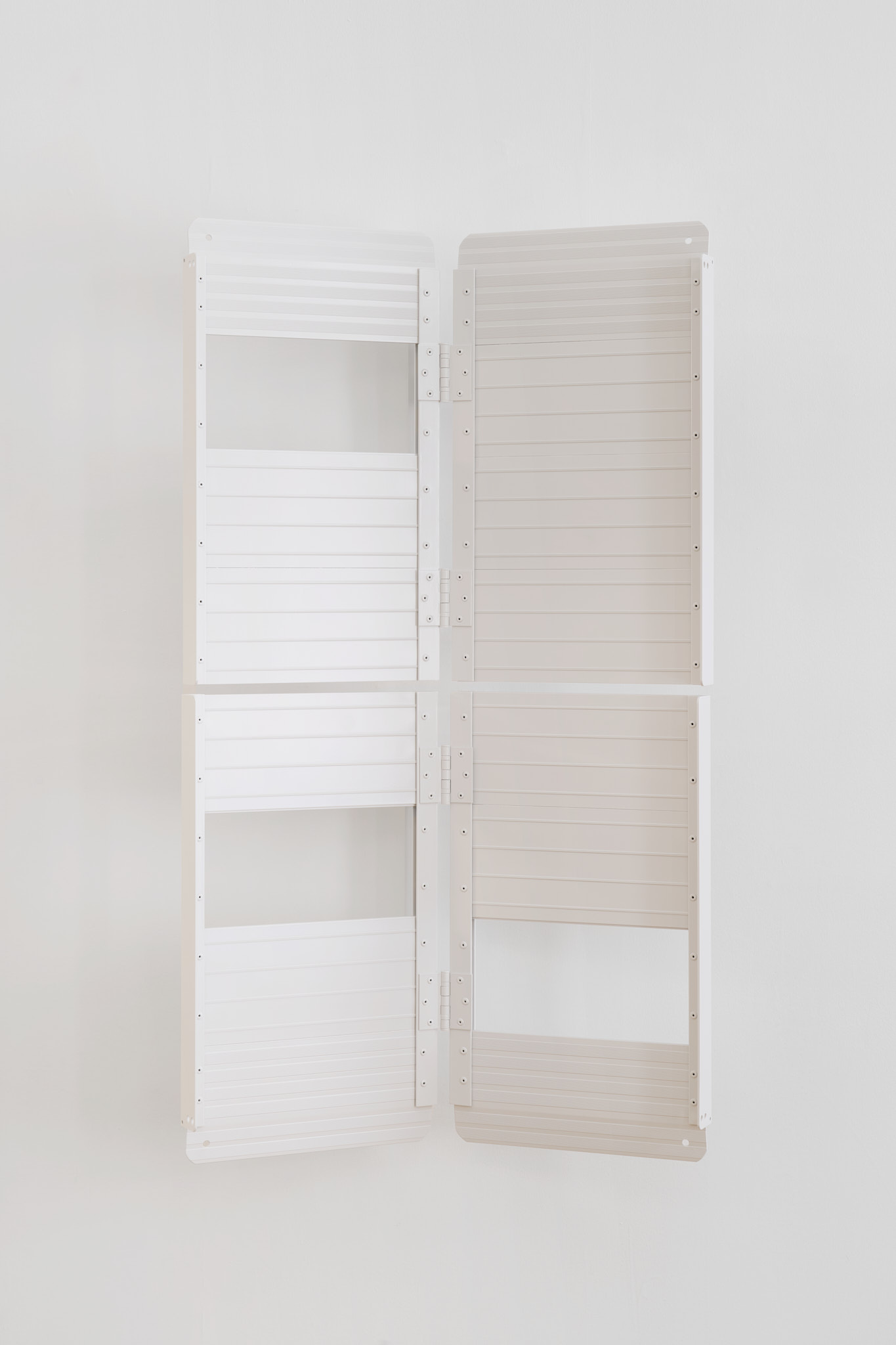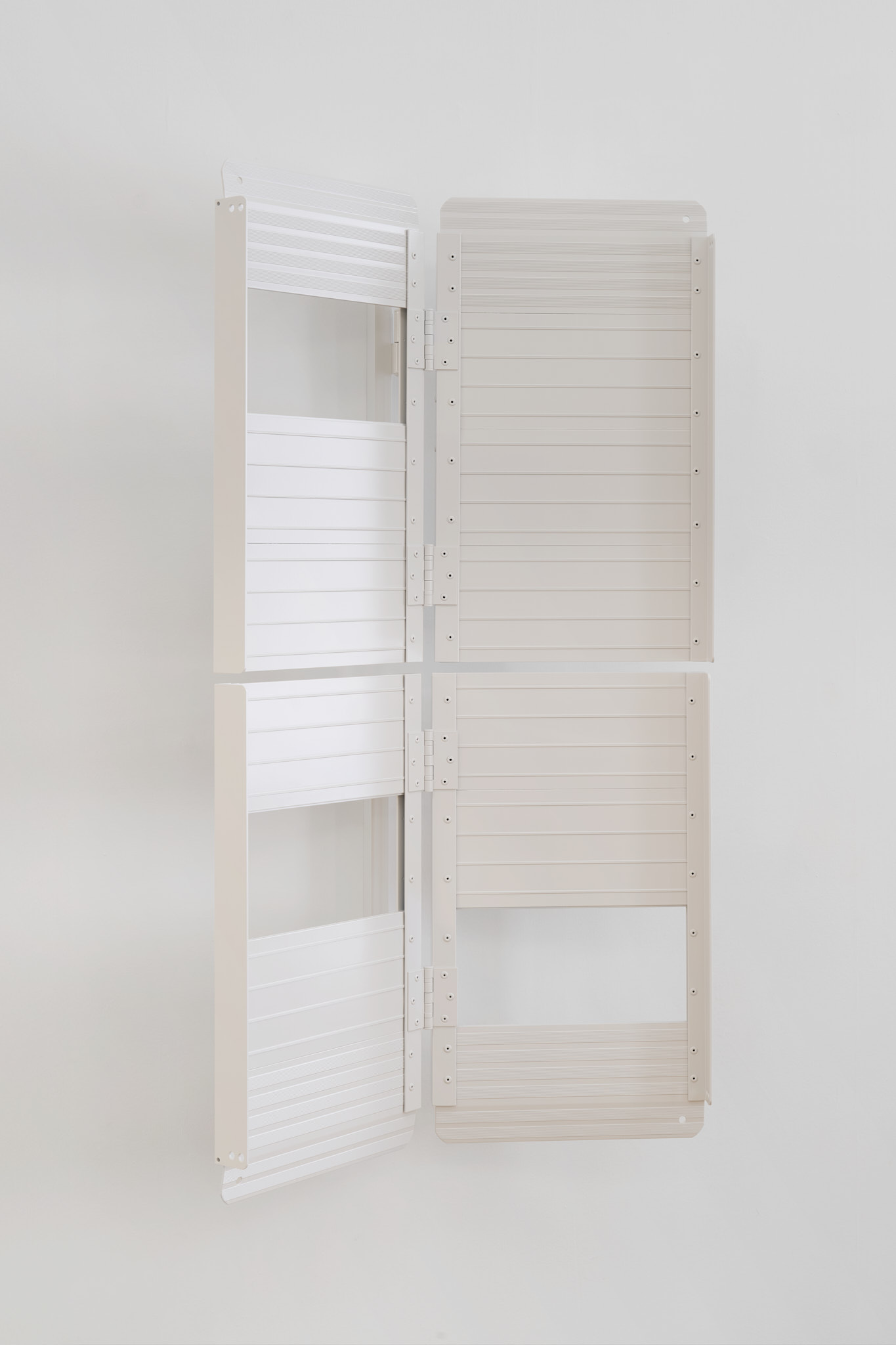 Unlike many historic artists, whose intervention on common objects hinged on a change of scale (Oldenburg), material (Koons), recognizability (Chamberlain), context (Warhol), Kakon chooses subtraction and formalization. The ramps are almost identical to their real counterparts except for their systematic repetition and their compliance to a new and systematized palette: They are collaged together into polyptych of various grays; their functionality is compromised by being placed vertically. Moreover, Kakon cuts away large parts of the ramps, leaving squared holes where matter used to be.