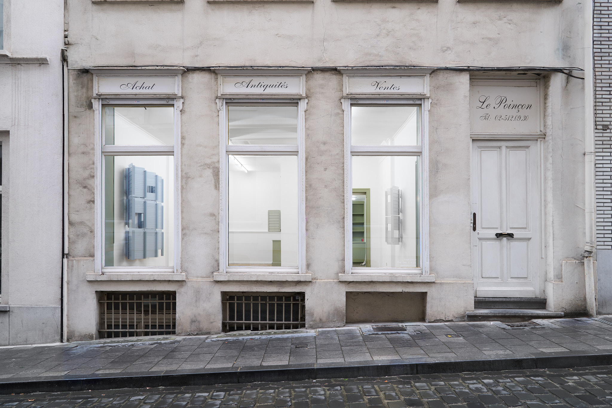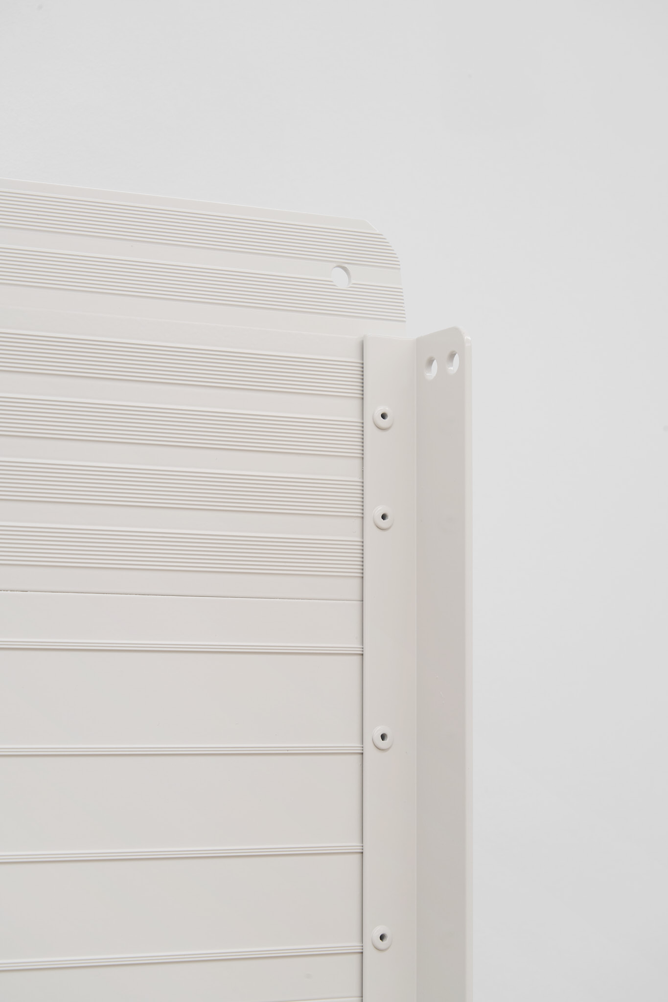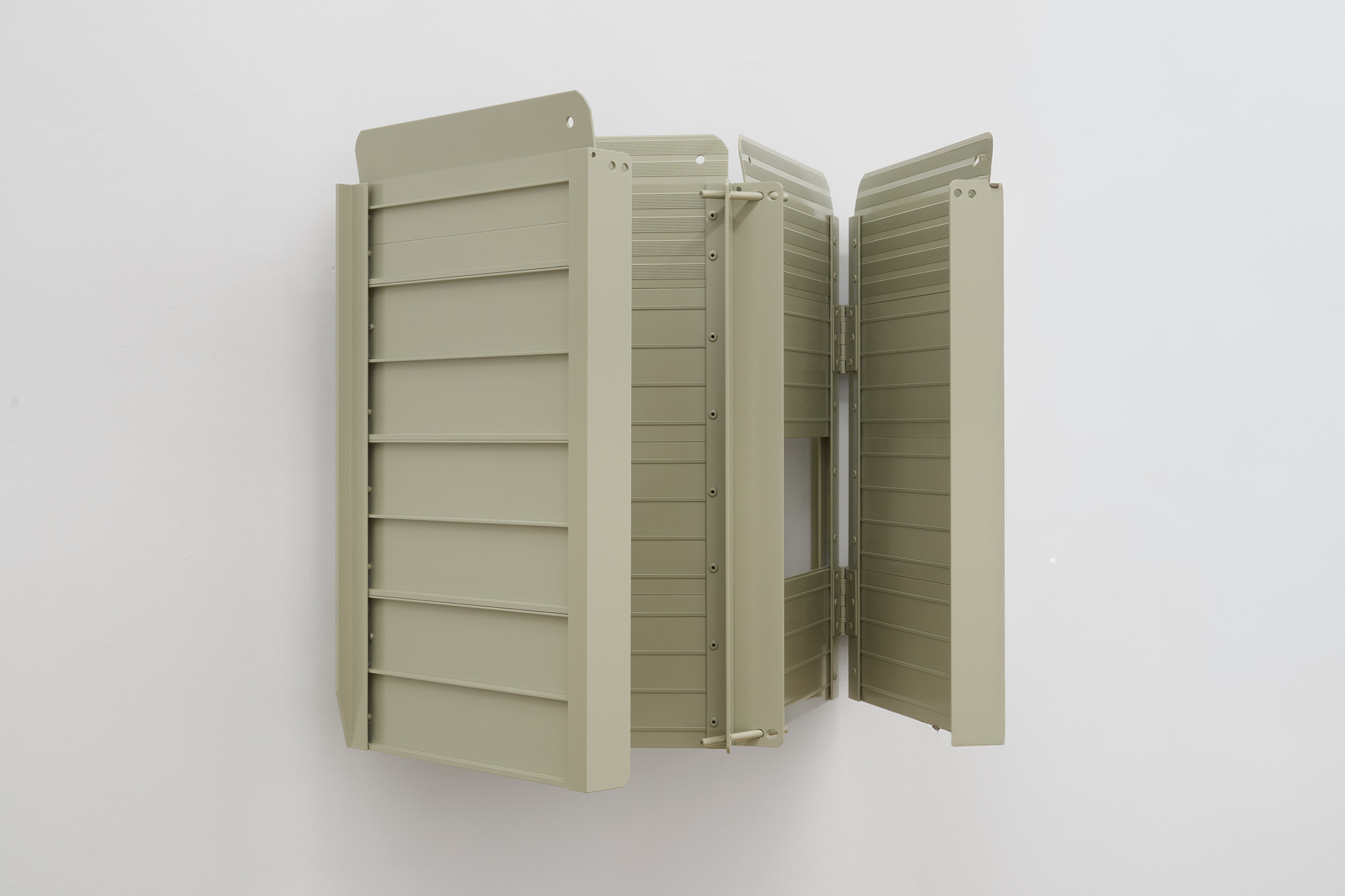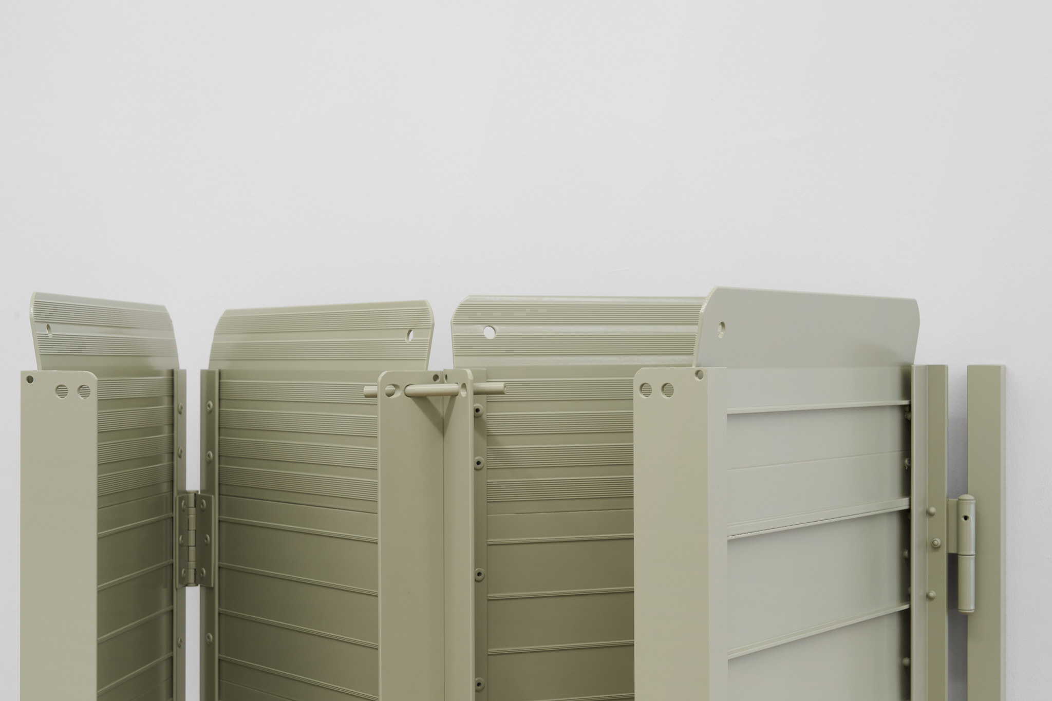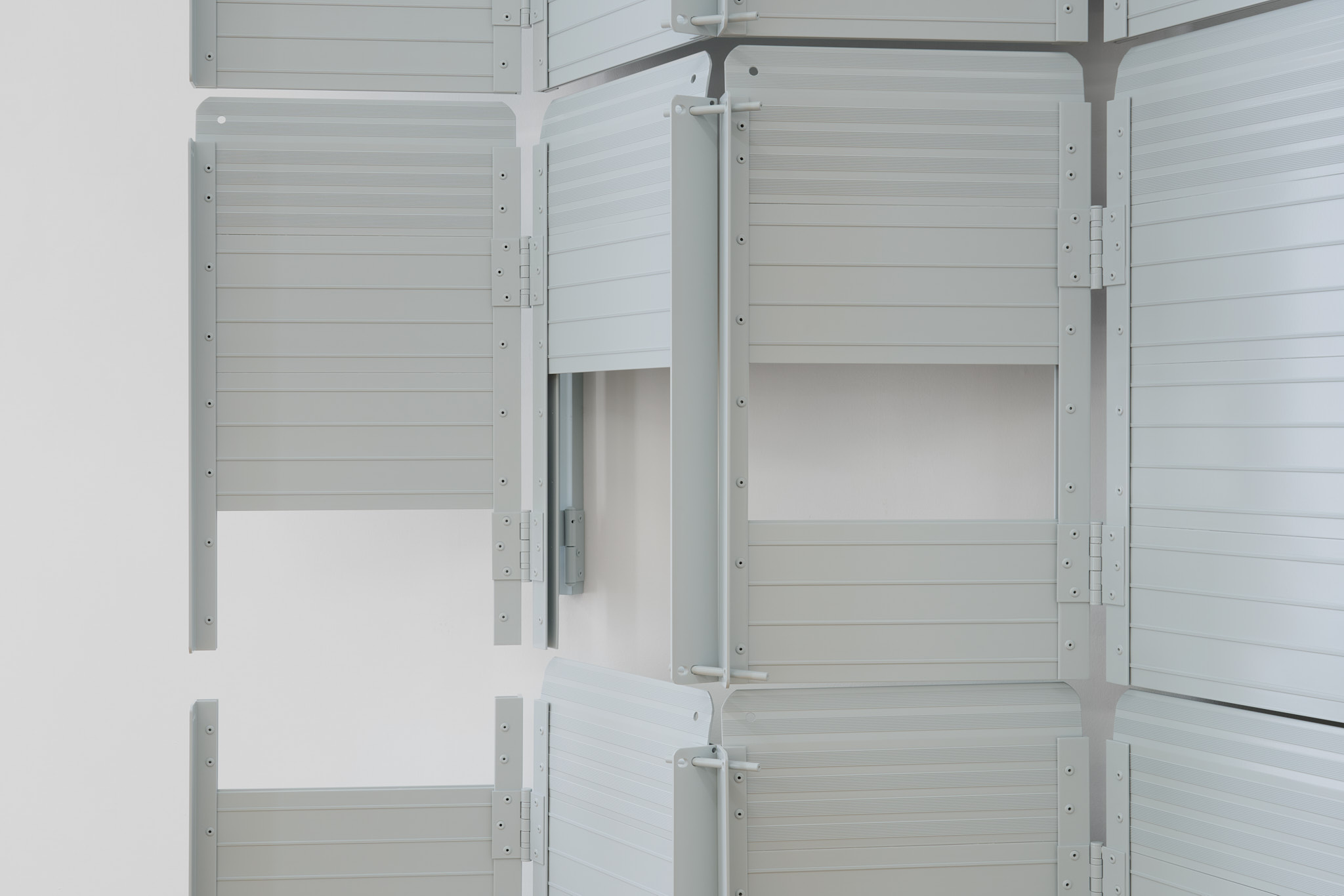 Unlike many historic artists, whose intervention on common objects hinged on a change of scale (Oldenburg), material (Koons), recognizability (Chamberlain), context (Warhol), Kakon chooses subtraction and formalization. The ramps are almost identical to their real counterparts except for their systematic repetition and their compliance to a new and systematized palette: They are collaged together into polyptych of various grays; their functionality is compromised by being placed vertically. Moreover, Kakon cuts away large parts of the ramps, leaving squared holes where matter used to be.