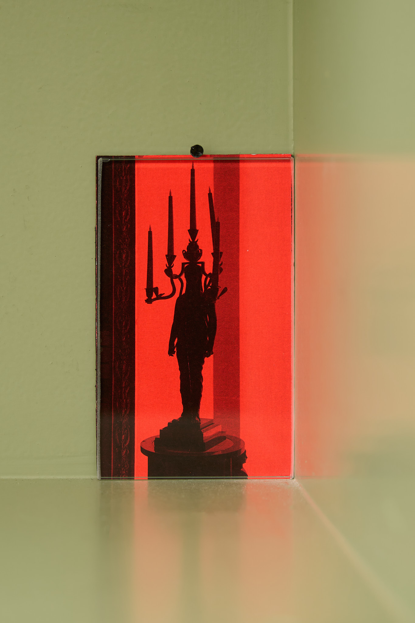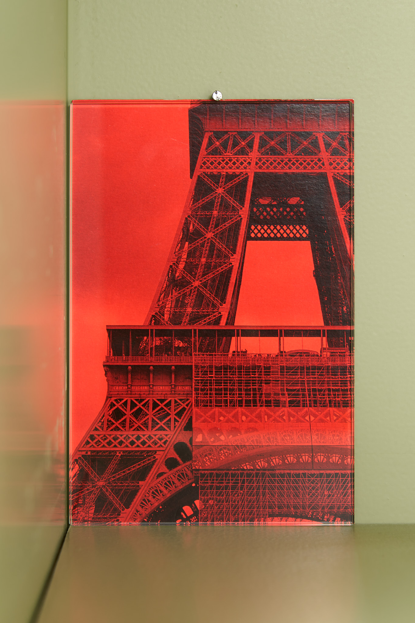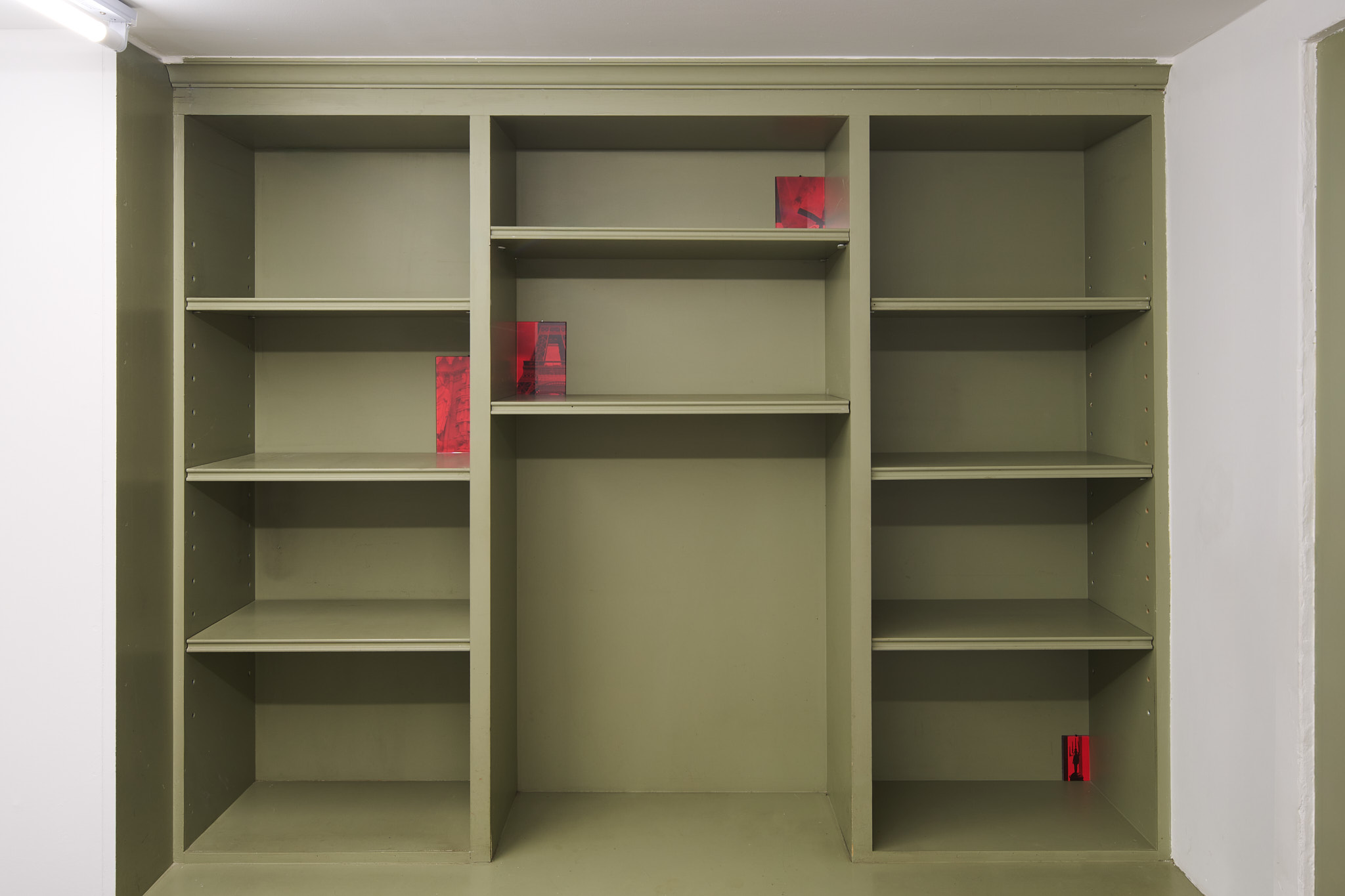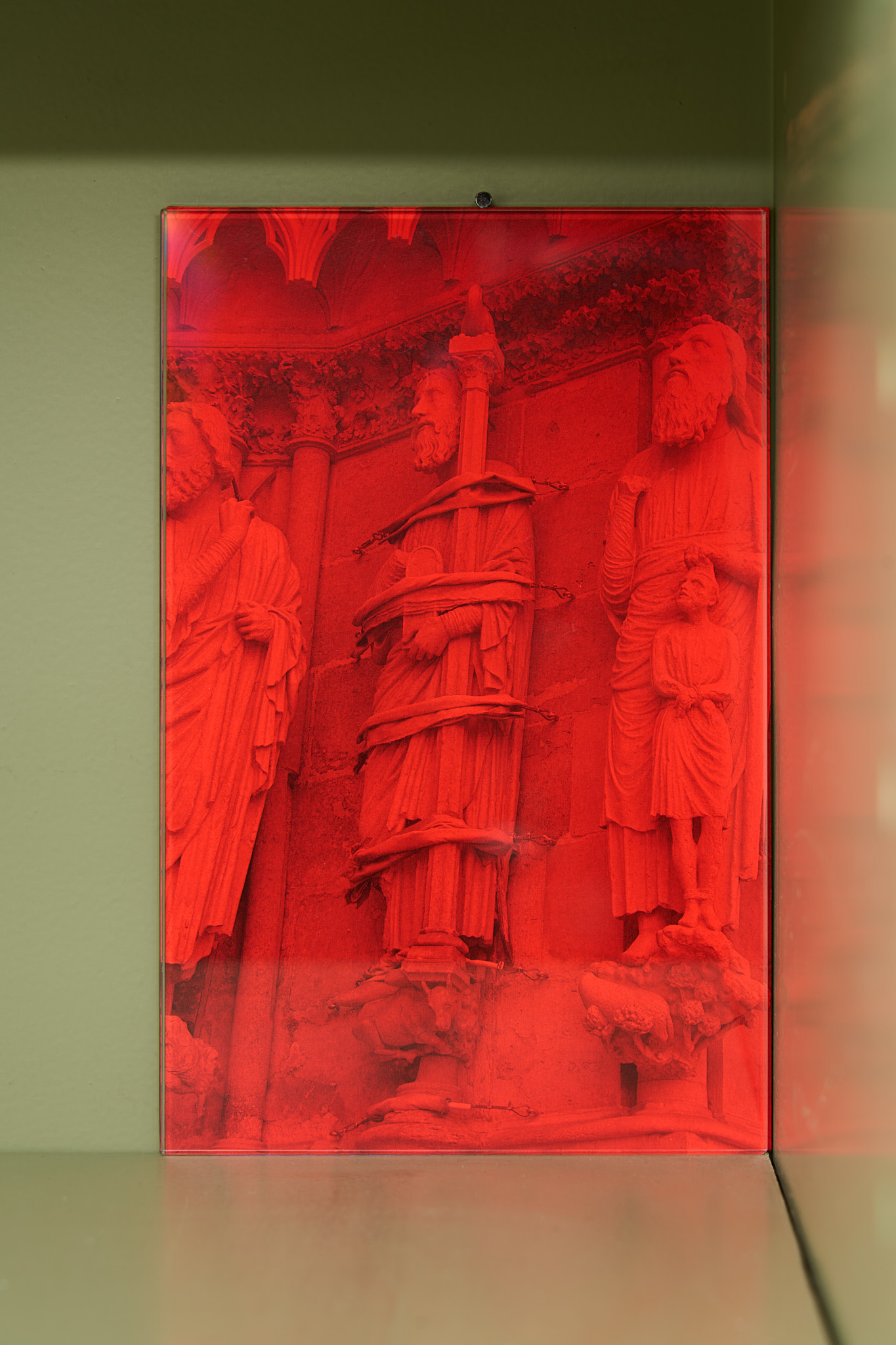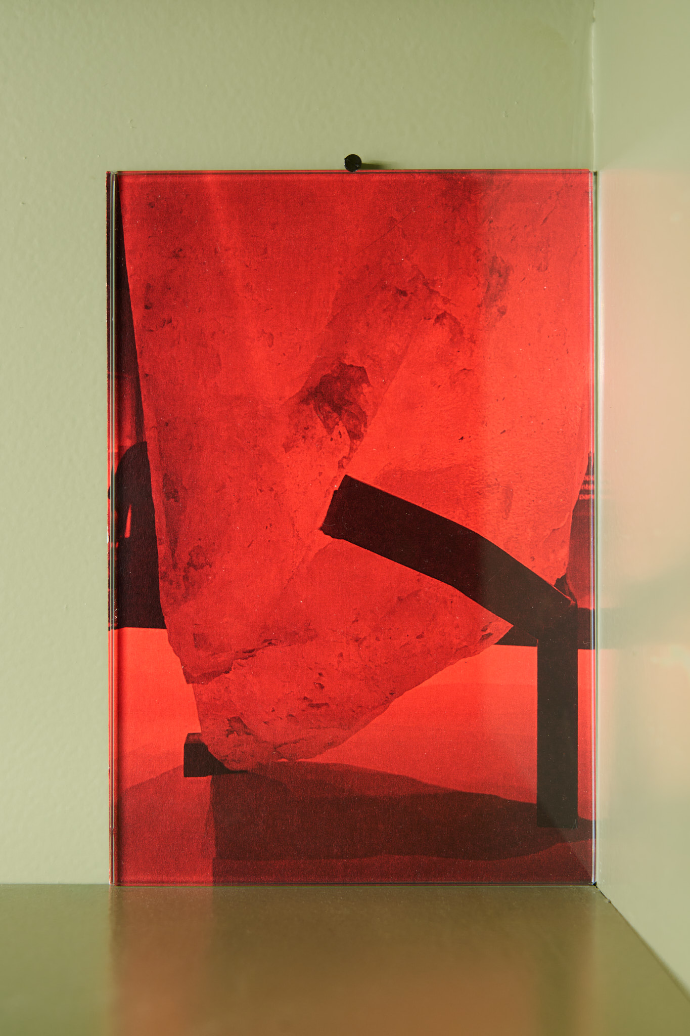 Kakon reflects on the ramps alongside monochrome red photographs of support structures such as scaffolding on buildings or religious statues. These photographs are a sublimated version of the ramps as they contain all of their elements: the act of vision is brought to the fore by the strong presence of the red filter on otherwise multicolor images; imagination is called upon with their slightly hallucinatory atmosphere; utilitarian objects such as scaffolding are aestheticized through photography not unlike the foldable ramps are through sculpture.