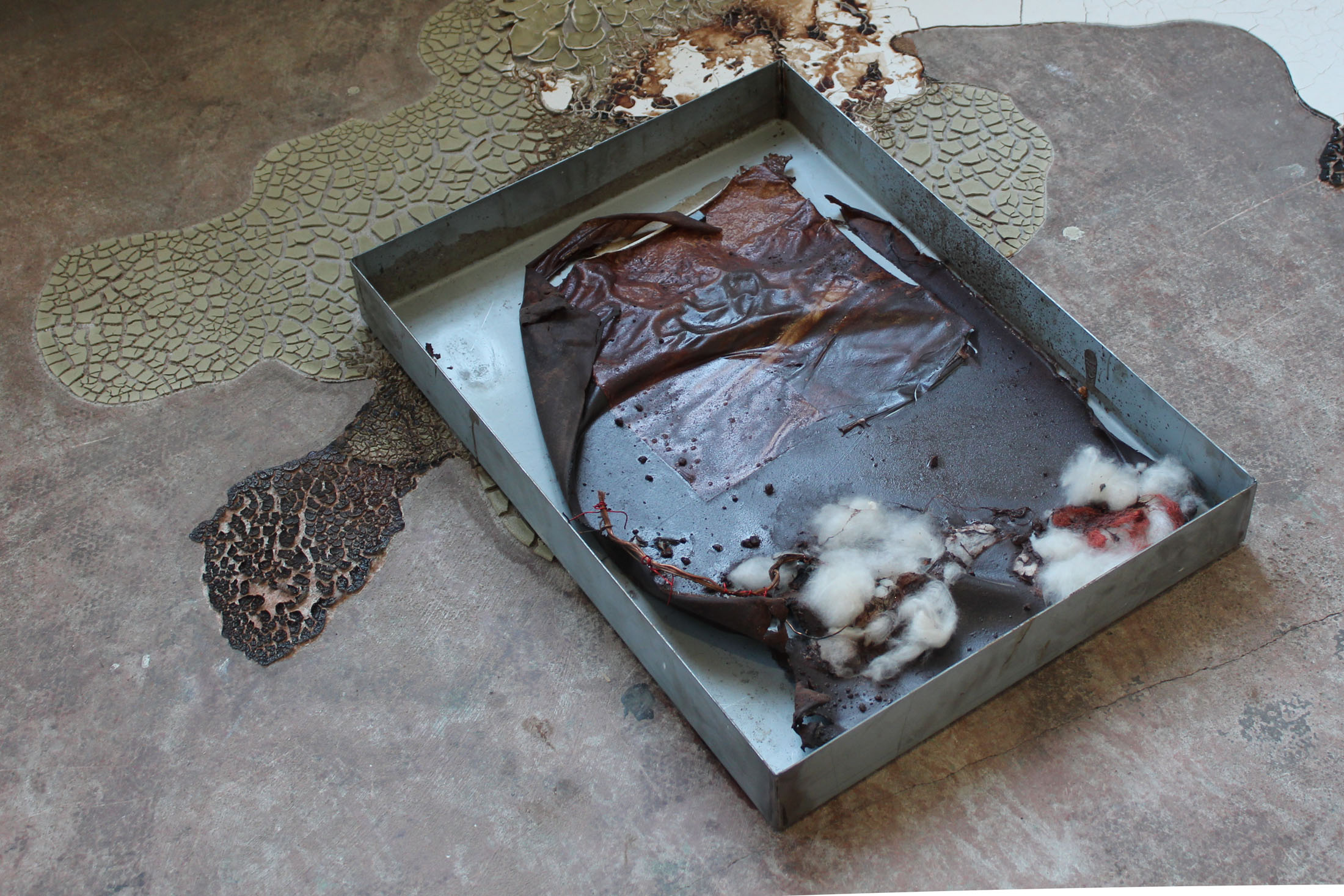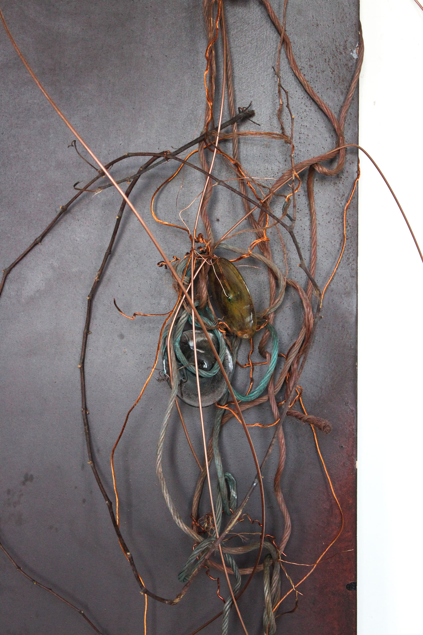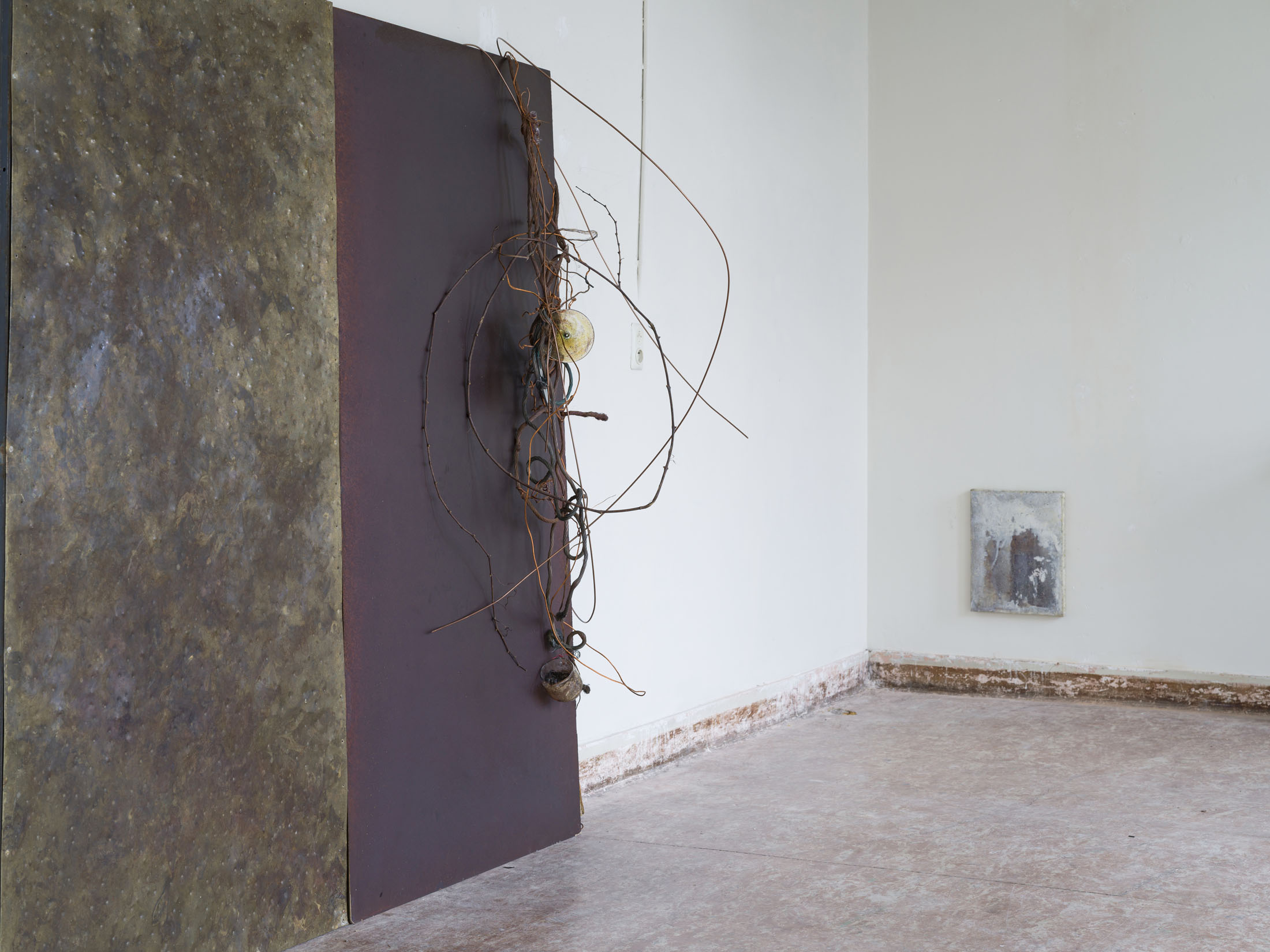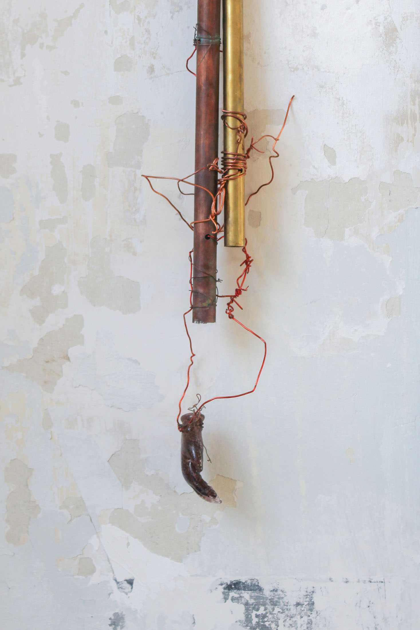 The assemblages are composed of steel, glass, copper, clay, and organic residues. These materials are assembled in ways that foreground their physical behaviour: weight-bearing, bending, oxidising, leaking, or resting against one another without a clear hierarchy. The resulting structures resemble an archaeological site of infrastructural fragments or internal systems, suggesting frameworks that continue to function while remaining visibly contingent.