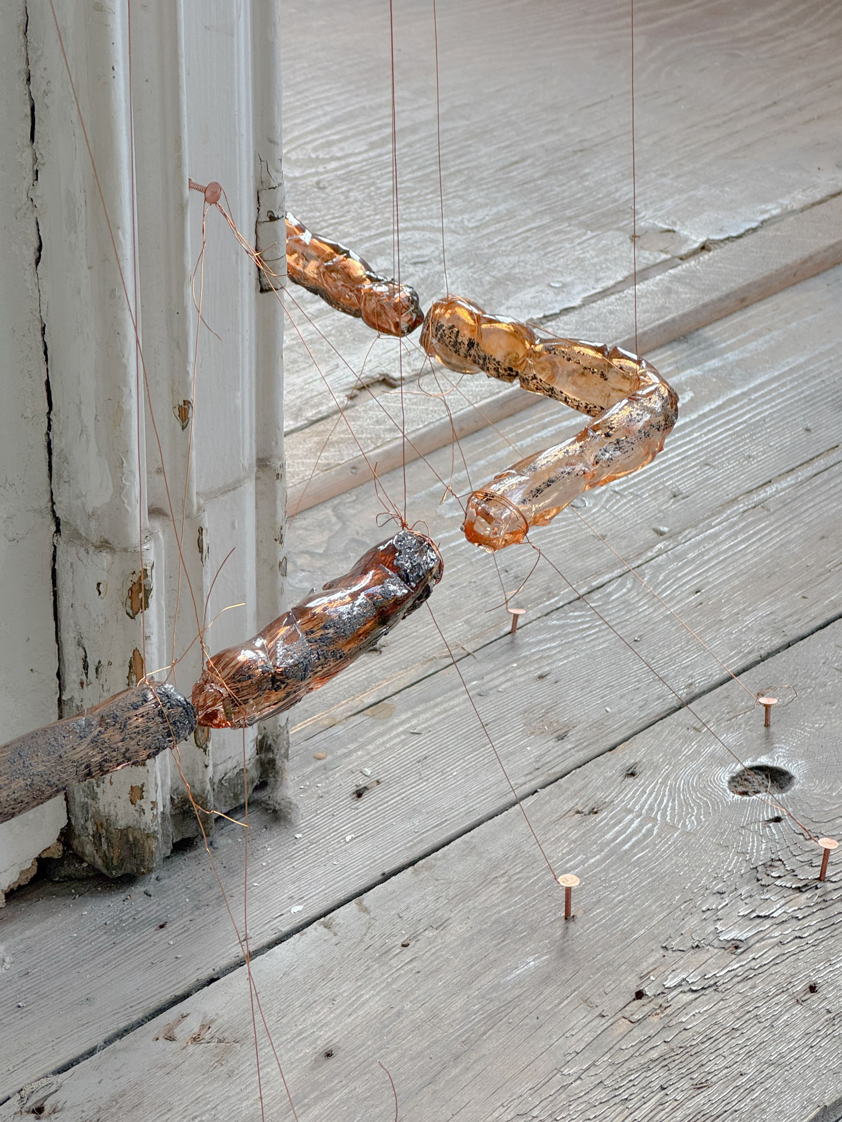 A central work within this constellation is [Title (year)], a glass sculptural installation referencing an elongated umbilical cord. The cord introduces a biological register into mountaincutters’ material vocabulary, situating questions of dependence and connection. Its presence draws attention to the conditions under which support is given, received, and eventually interrupted.