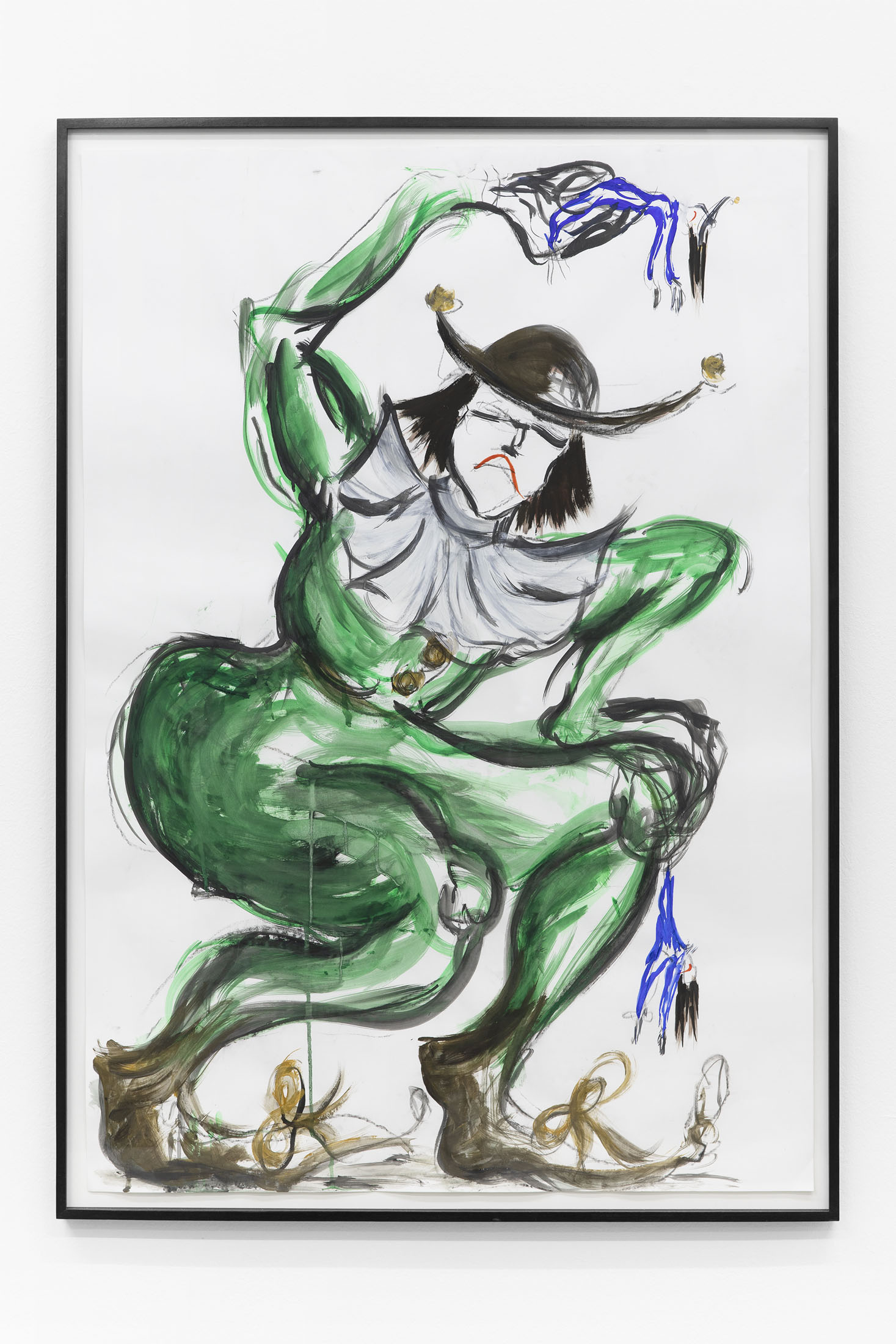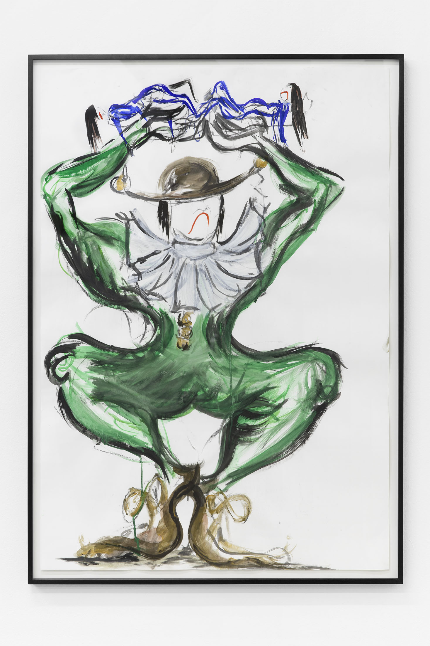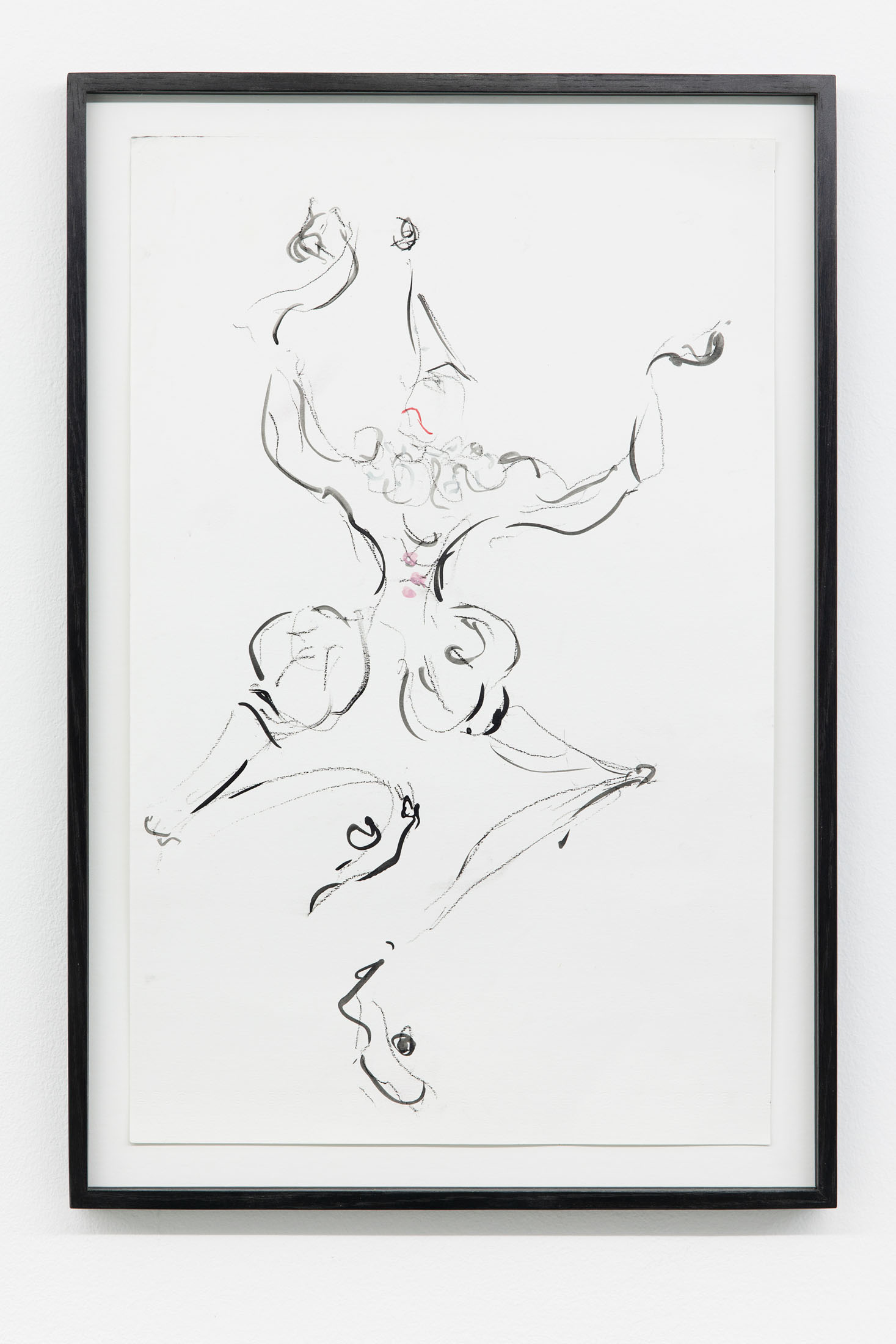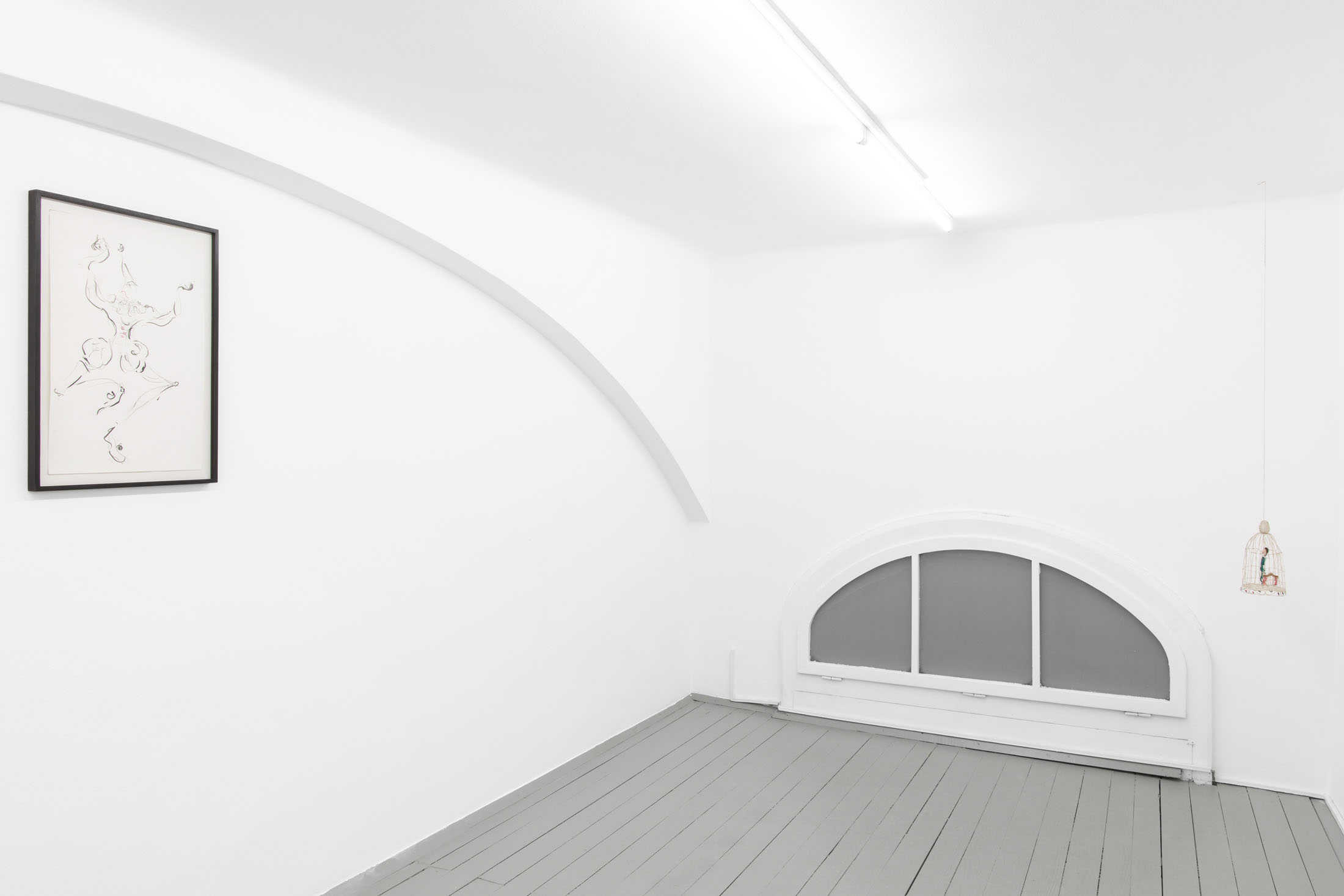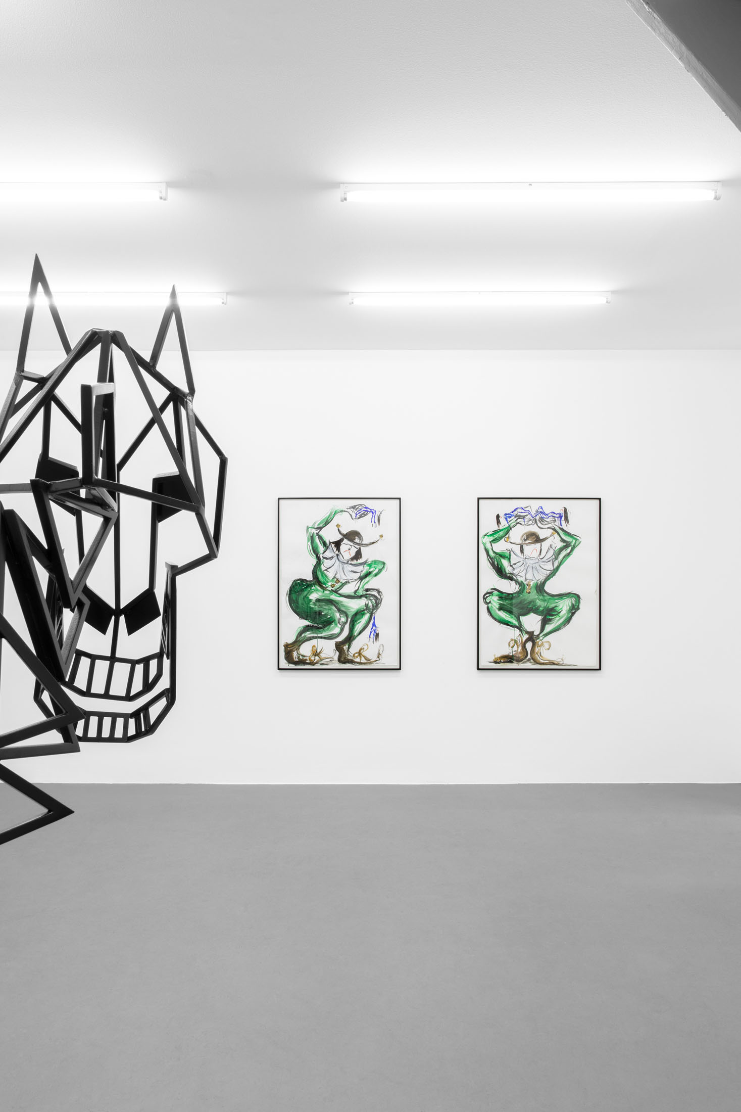 If the horse is our ominous greeter, the drawings scattered through the space are its secret script. In strong lines, Béna sketches puppet-like figures caught in ambiguous exchanges — gestures hovering between affection and aggression, care and control. These characters seem to rehearse private dramas, perhaps preparing for a performance that will never begin. Like clowns behind the curtain, their exaggerated movements both parody and reveal. They remind us that the grotesque is not always loud; sometimes, it whispers through quiet gestures, through small bodies entangled in fraught choreographies of our everyday.