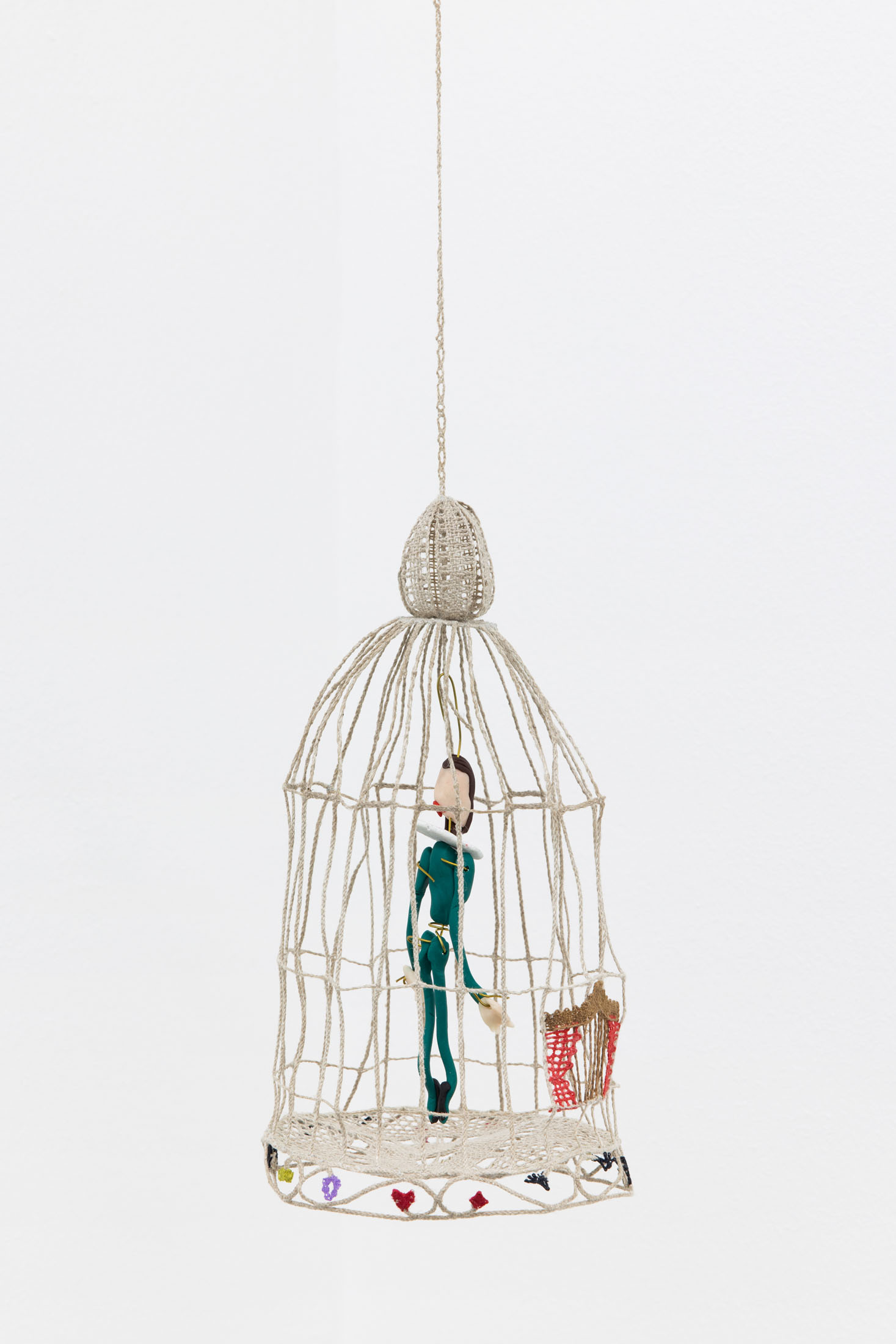 And then we meet the jester. No longer the free, sharp-tongued mocker of kings, here the jester is confined — trapped in a lace cage, a paradoxical prison made of delicacy. Lace, a material of bourgeois refinement, is repurposed as a barrier. What ought to be ornamental becomes structural, even punitive. The jester gazes out, caught between roles: entertainer and captive, insider and outsider. He is the embodiment of clownophobia itself: the fear that behind the painted smile, there is something unsettlingly real.