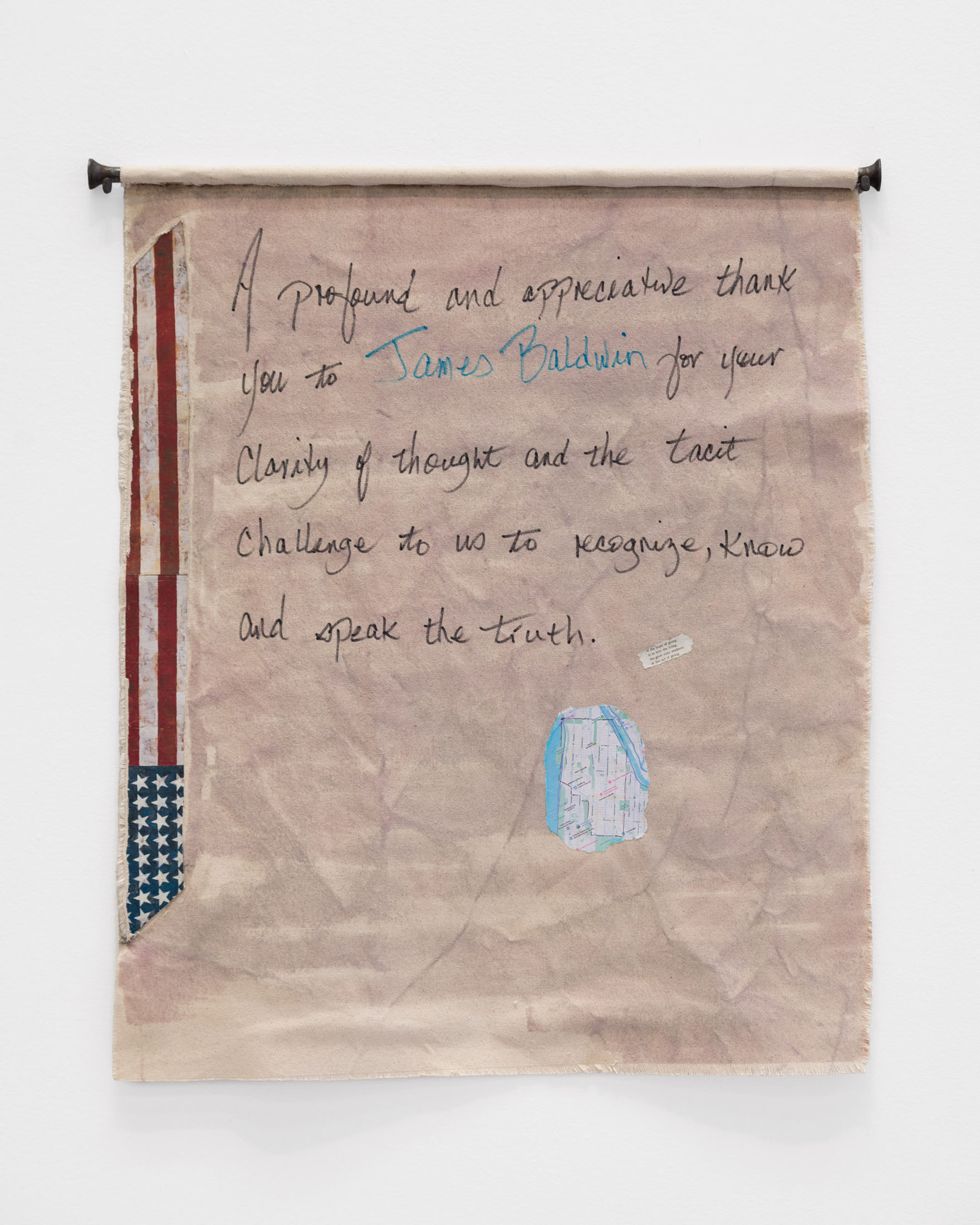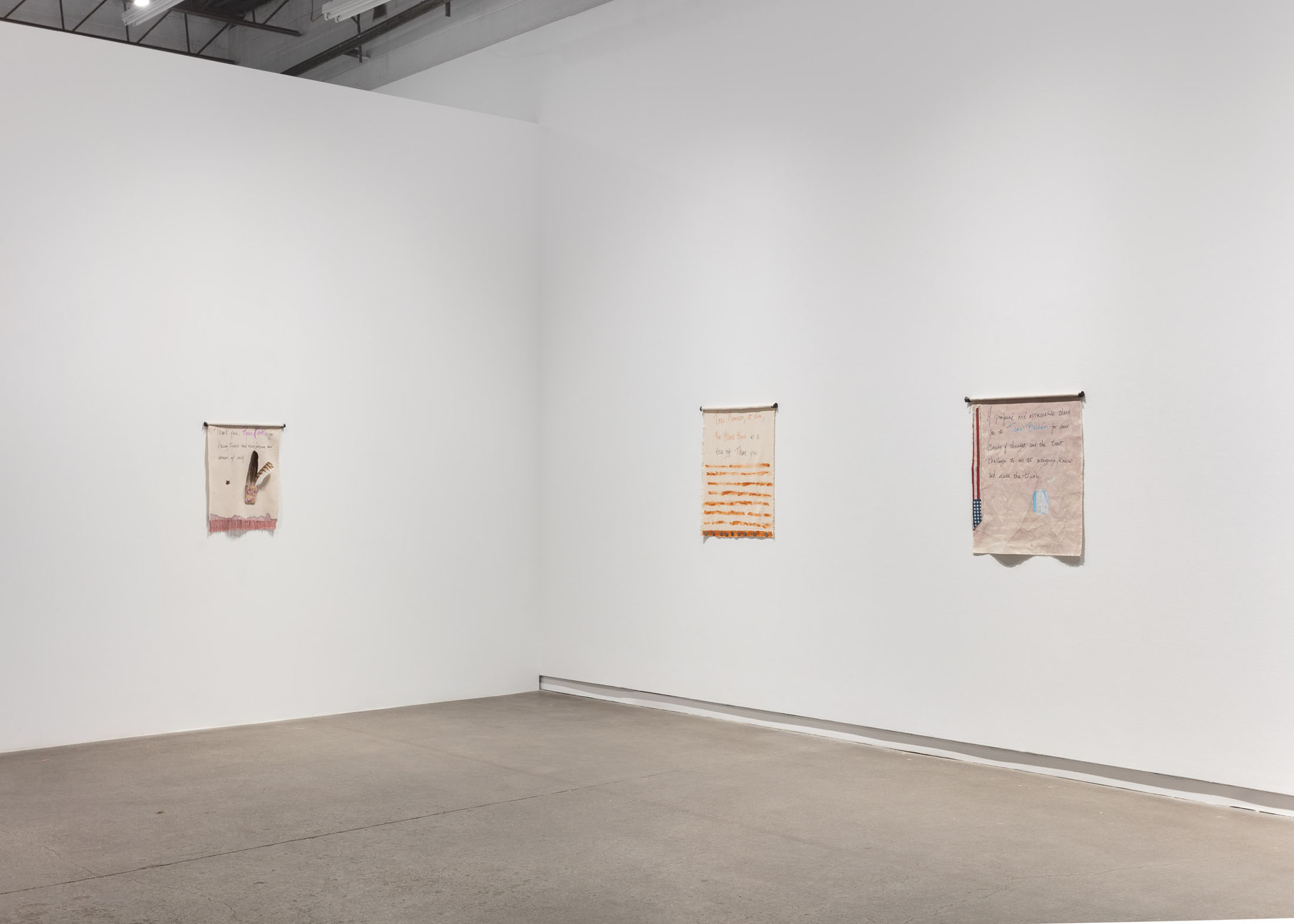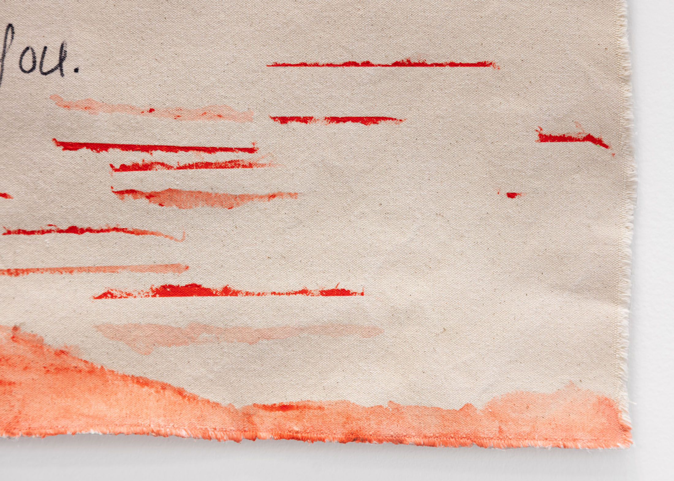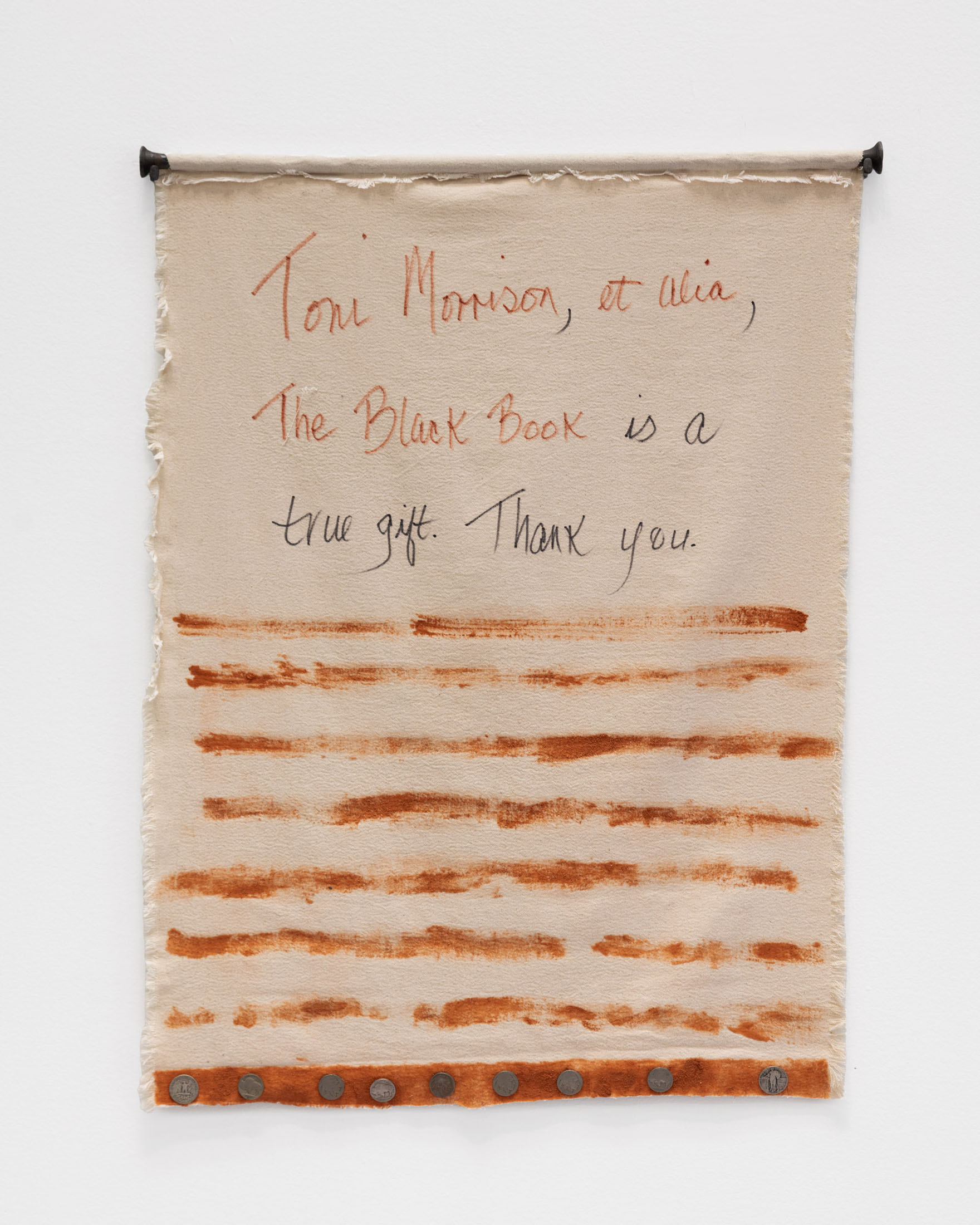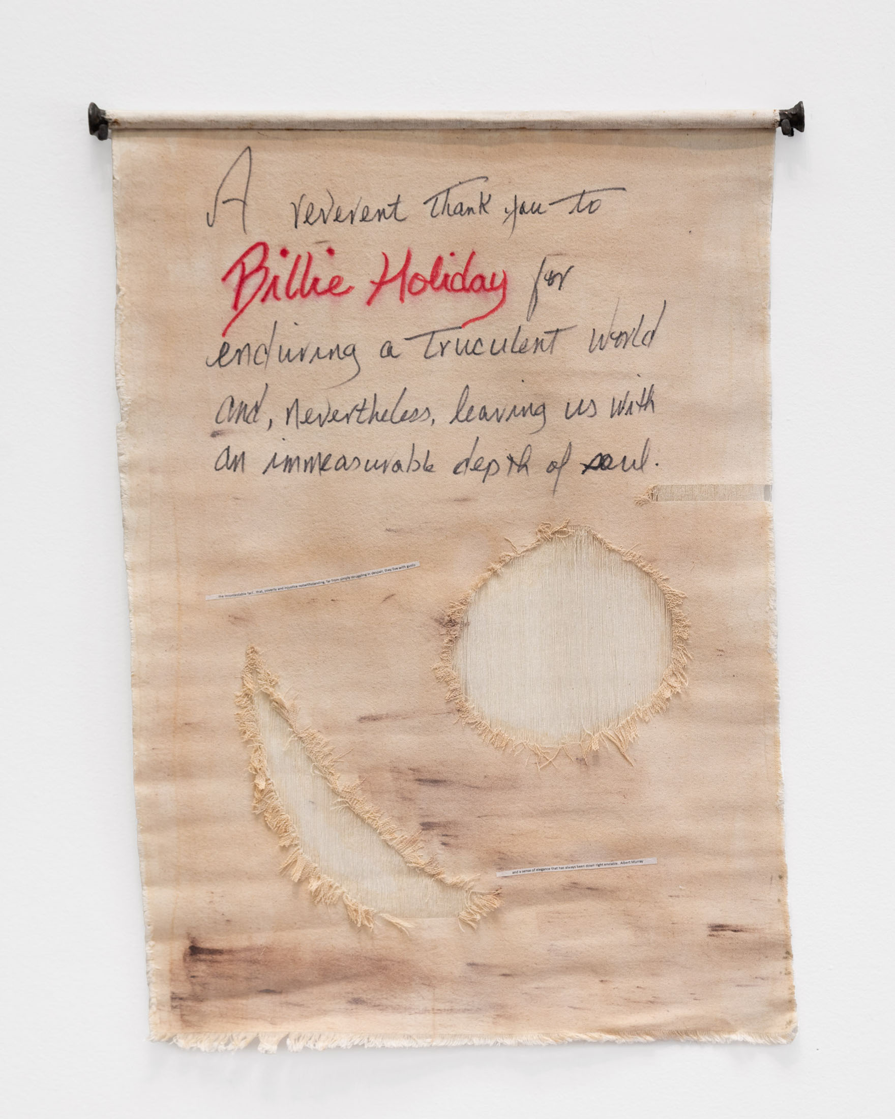 In Thank-you Notes, unstretched canvas hangs from heavy metal dowels, like unravelling scrolls. A scrawled message adorns each one, and painted sweeps of colour create a watery horizon. Clark uses materials such as wine, tea, blueberry juice, red brick dust, and rusted metal, many of which are recurring in her practice. Clark began using wine and tea in her work when she was living and working in Paris in the early 2000s, restricted to what was readily on hand. Used for protection in HooDoo and VooDoo communities, red brick dust is often scattered in front of the home’s entrance for protection and luck. Some of the canvases have been pulled to reveal bare vertical threads, a meditative, repetitive act that Clark often returns to in the studio, such as in Moral Disengagement (2014-17), an American flag that Clark unravelled over three years. Other works are wrinkled and then ironed out again, like well-handled pieces of paper.