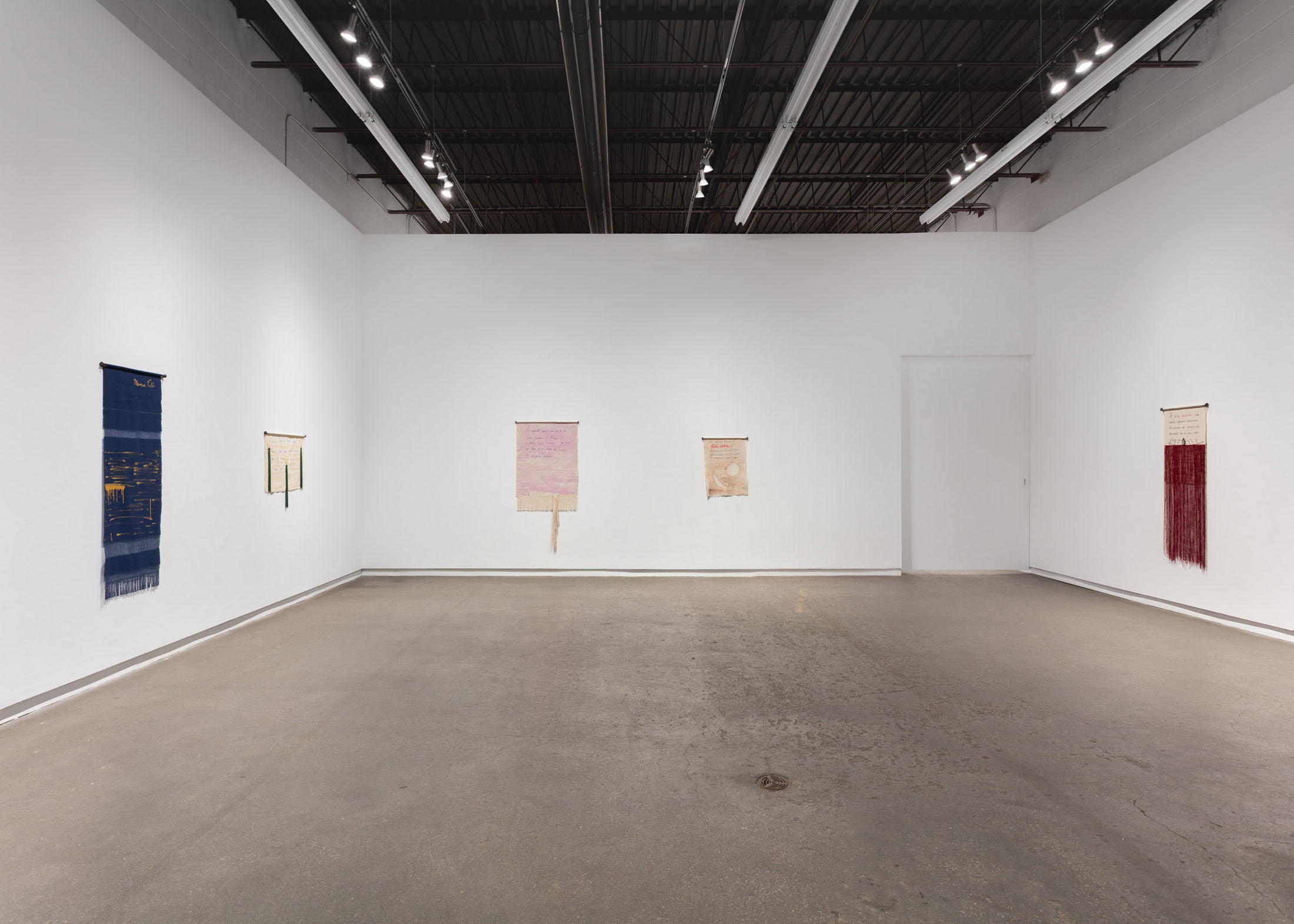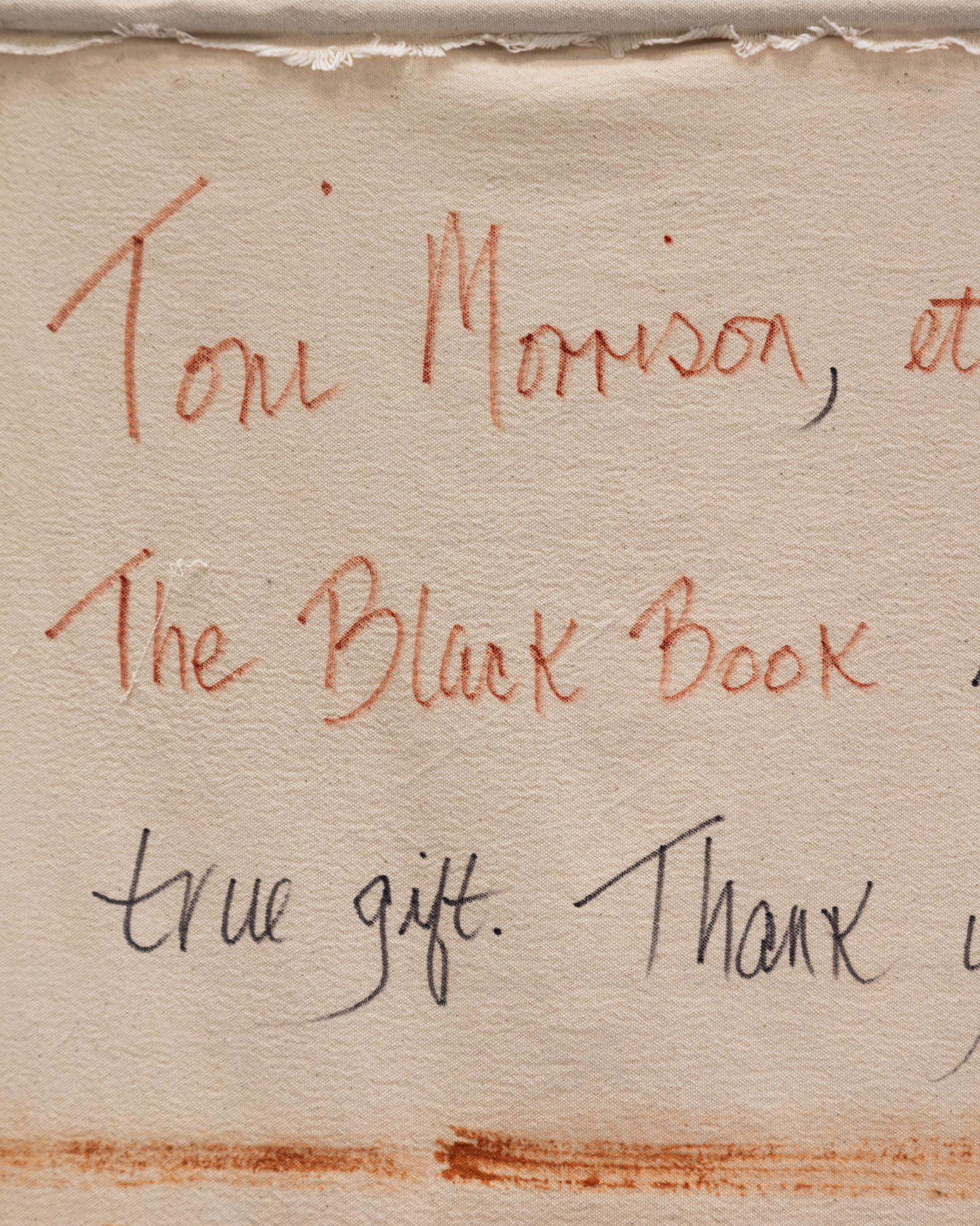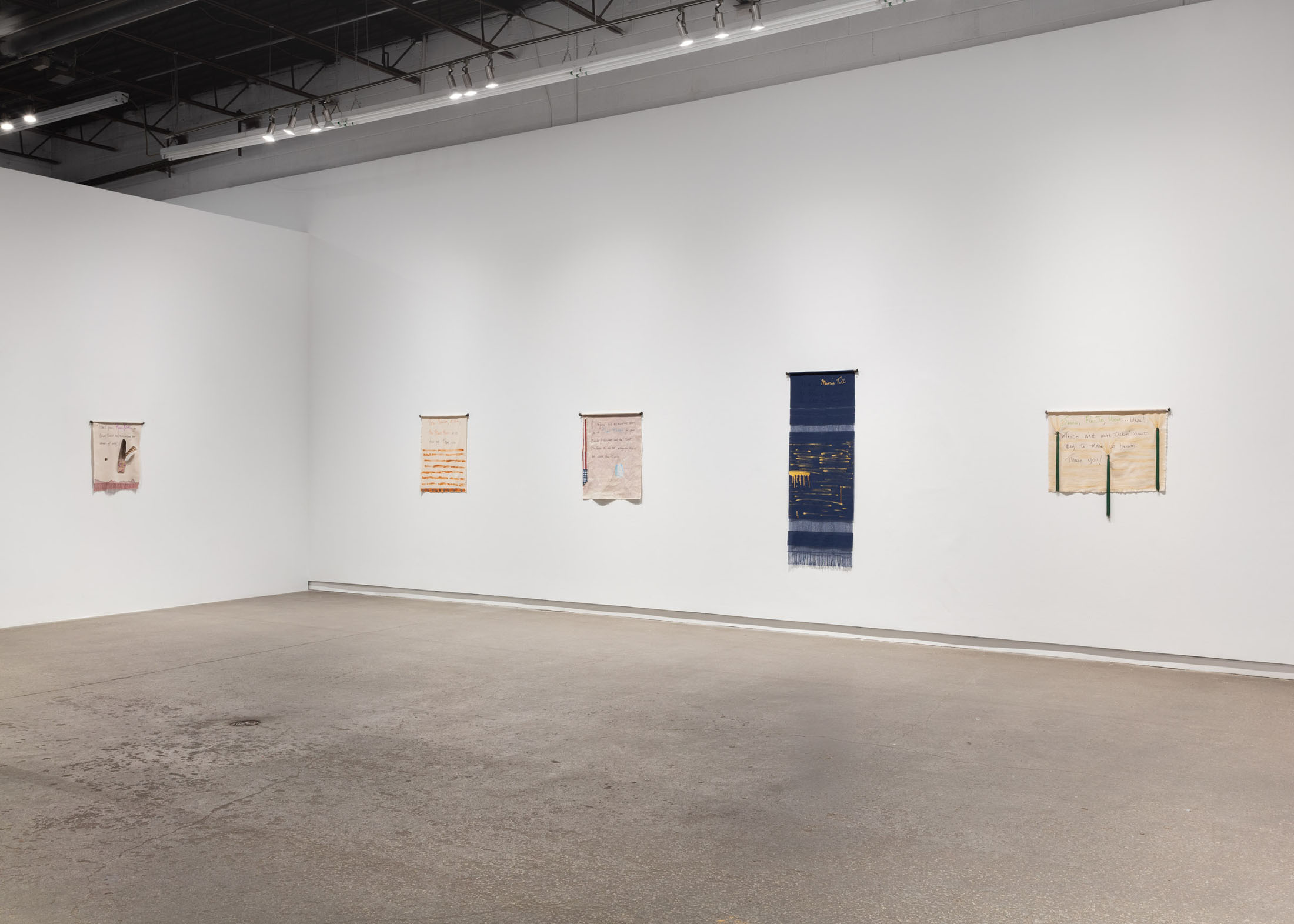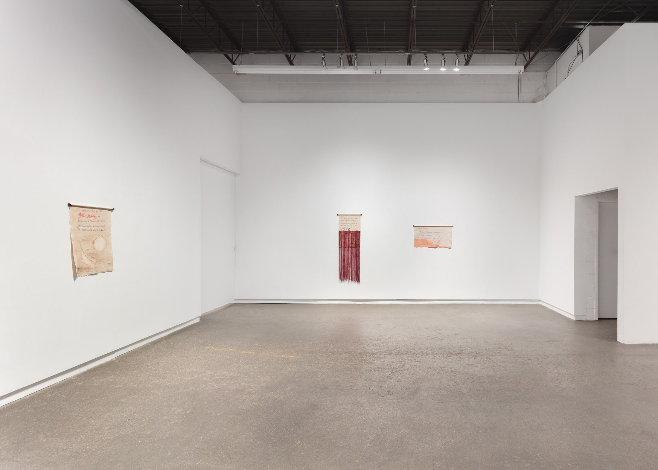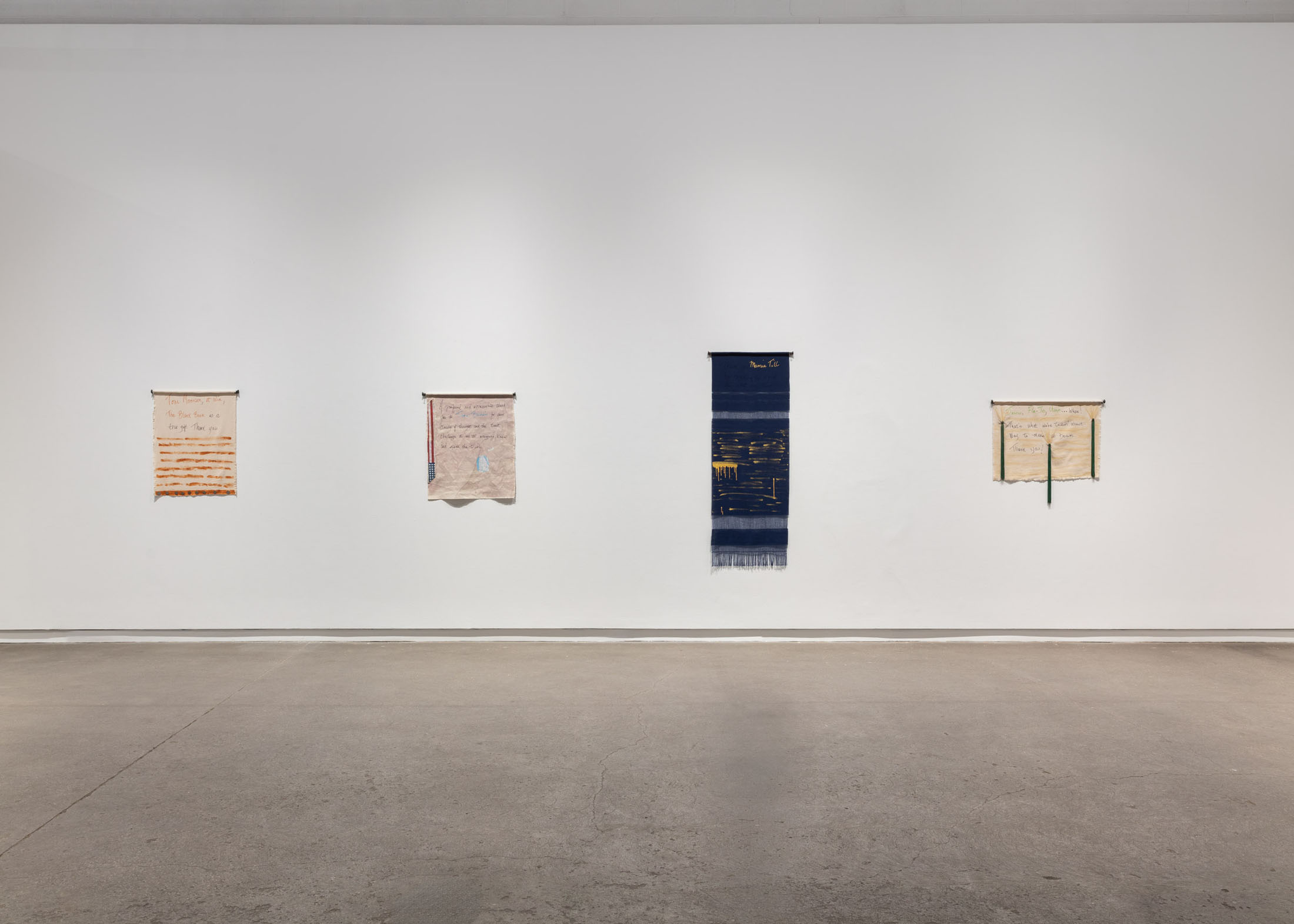 In Thank-you Notes, unstretched canvas hangs from heavy metal dowels, like unravelling scrolls. A scrawled message adorns each one, and painted sweeps of colour create a watery horizon. Clark uses materials such as wine, tea, blueberry juice, red brick dust, and rusted metal, many of which are recurring in her practice. Clark began using wine and tea in her work when she was living and working in Paris in the early 2000s, restricted to what was readily on hand. Used for protection in HooDoo and VooDoo communities, red brick dust is often scattered in front of the home’s entrance for protection and luck. Some of the canvases have been pulled to reveal bare vertical threads, a meditative, repetitive act that Clark often returns to in the studio, such as in Moral Disengagement (2014-17), an American flag that Clark unravelled over three years. Other works are wrinkled and then ironed out again, like well-handled pieces of paper.