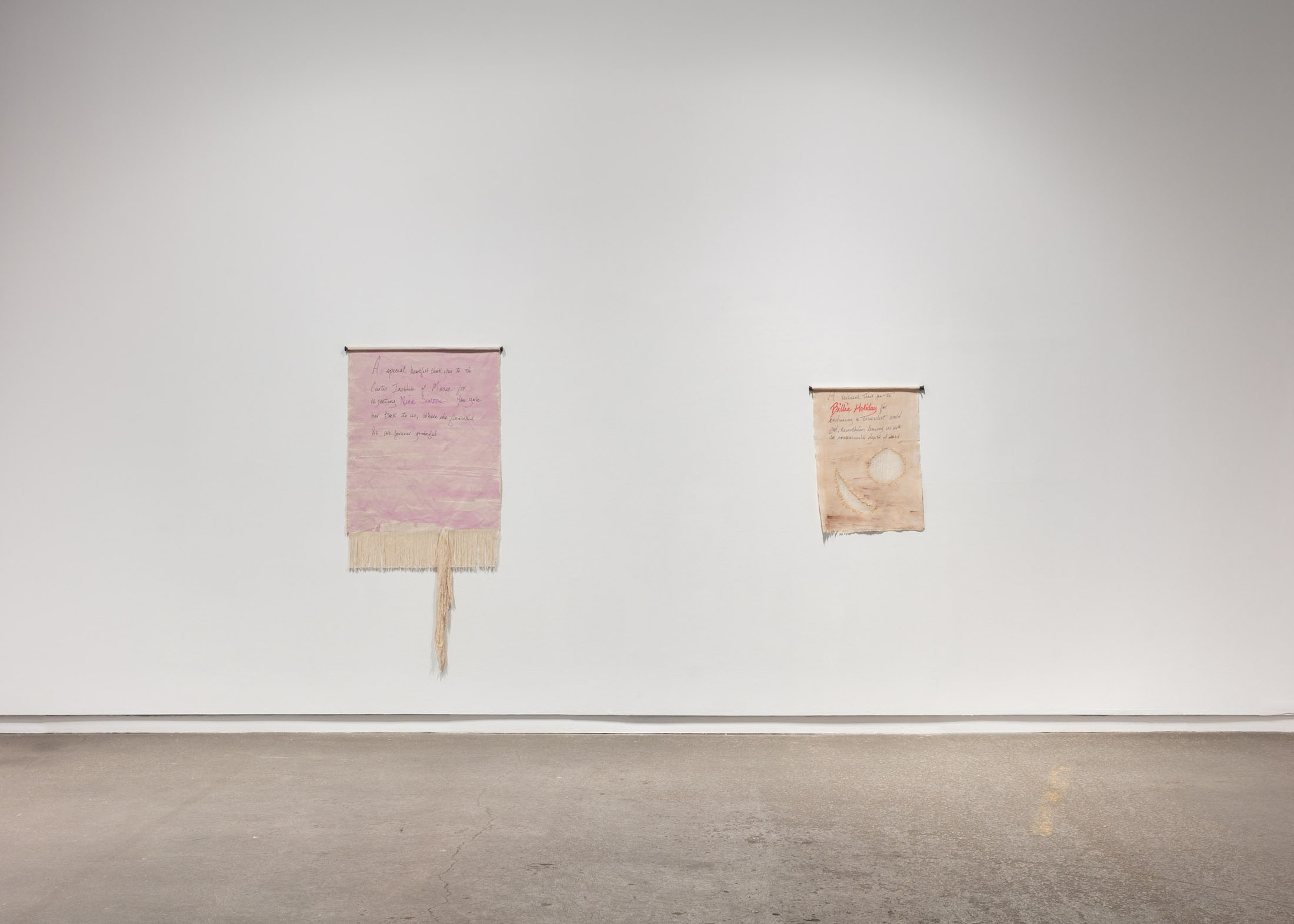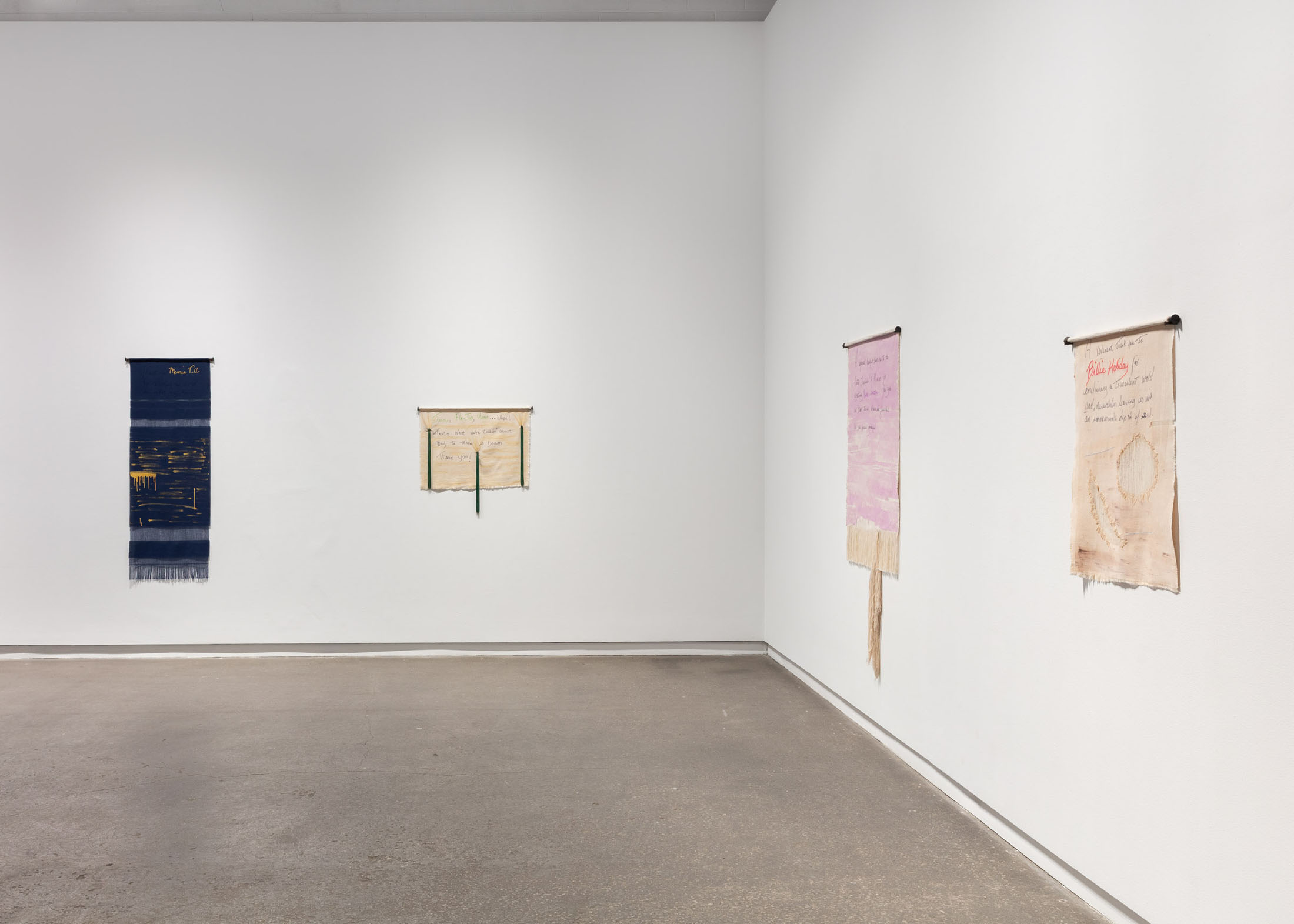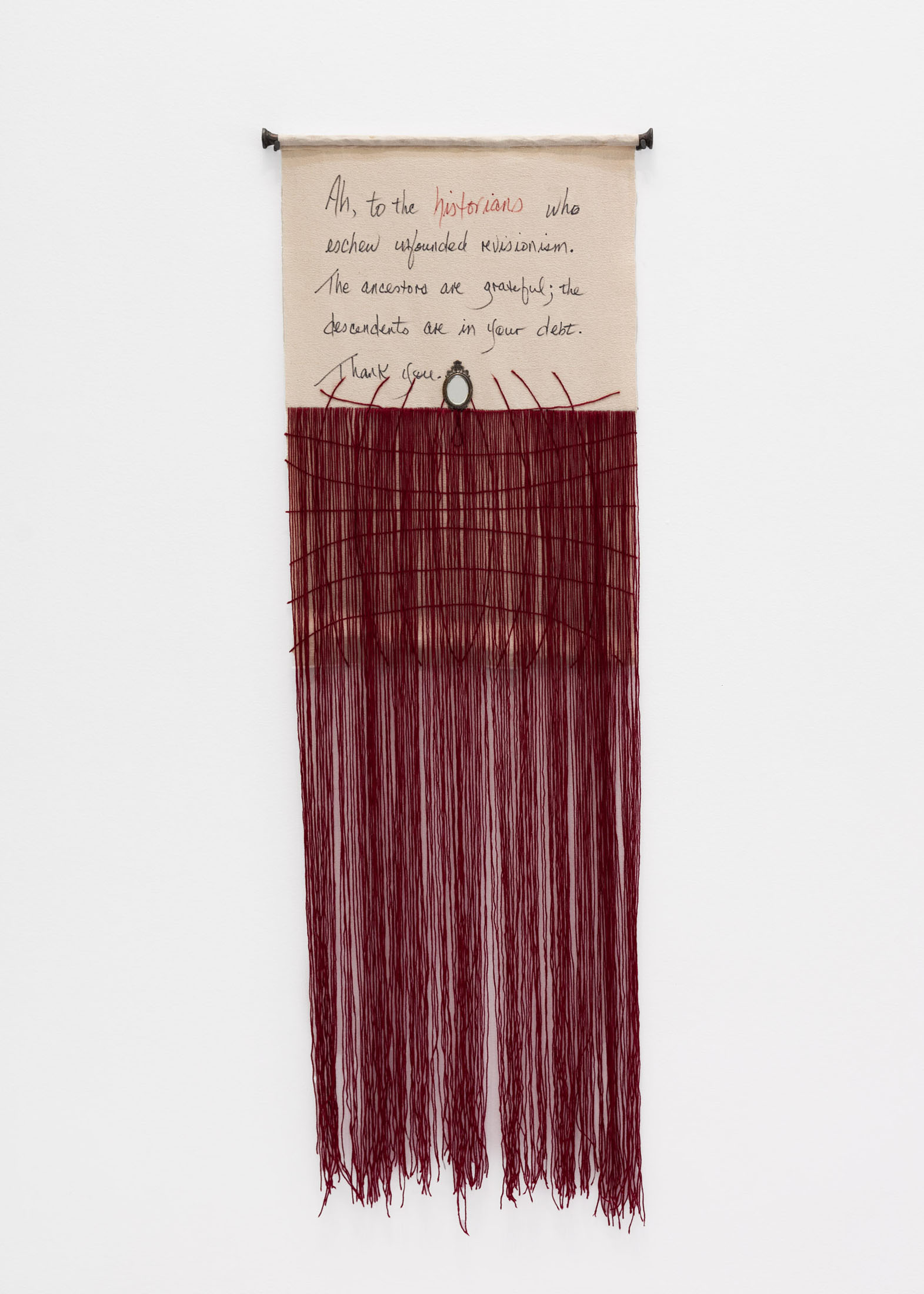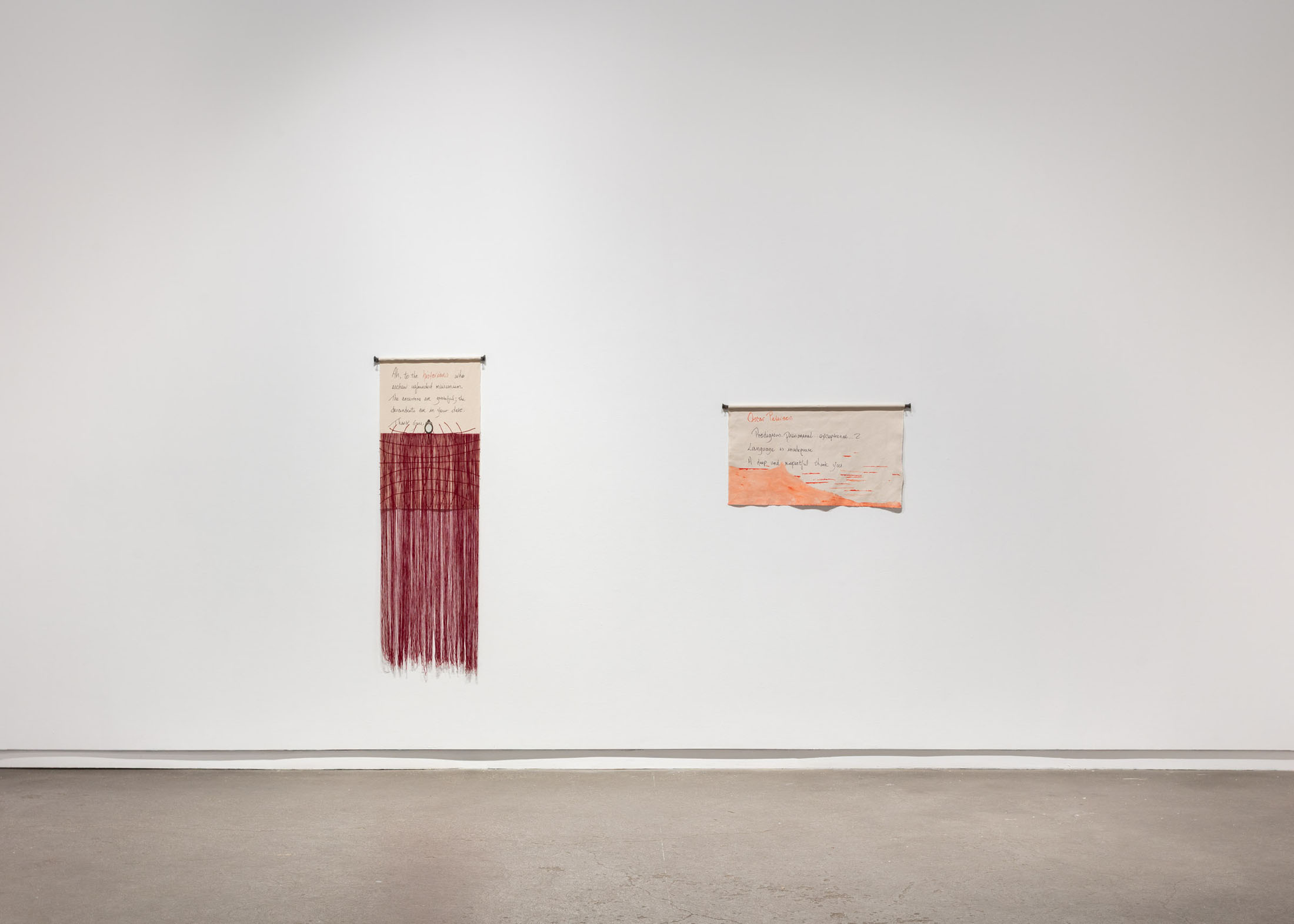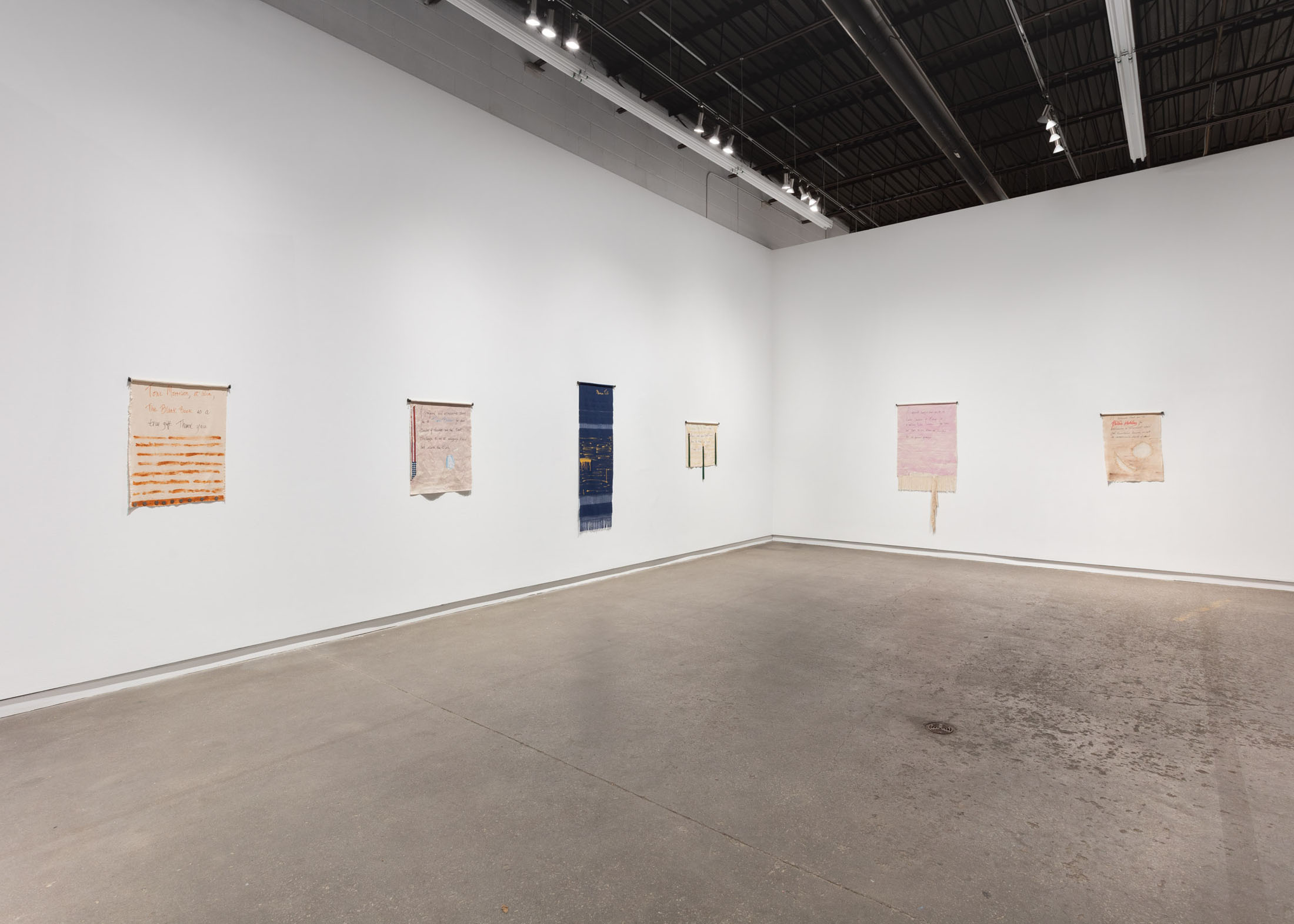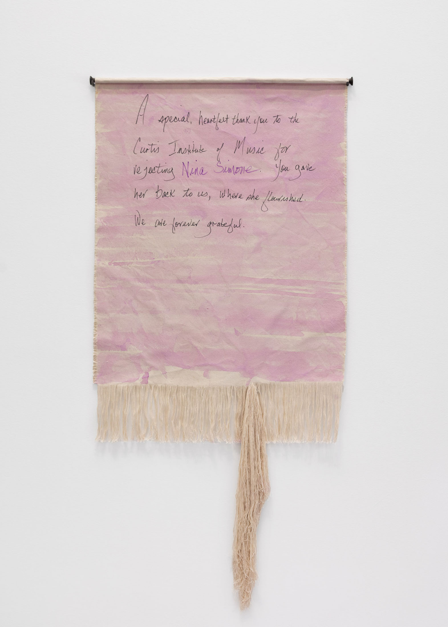 In Thank-you Notes, unstretched canvas hangs from heavy metal dowels, like unravelling scrolls. A scrawled message adorns each one, and painted sweeps of colour create a watery horizon. Clark uses materials such as wine, tea, blueberry juice, red brick dust, and rusted metal, many of which are recurring in her practice. Clark began using wine and tea in her work when she was living and working in Paris in the early 2000s, restricted to what was readily on hand. Used for protection in HooDoo and VooDoo communities, red brick dust is often scattered in front of the home’s entrance for protection and luck. Some of the canvases have been pulled to reveal bare vertical threads, a meditative, repetitive act that Clark often returns to in the studio, such as in Moral Disengagement (2014-17), an American flag that Clark unravelled over three years. Other works are wrinkled and then ironed out again, like well-handled pieces of paper.