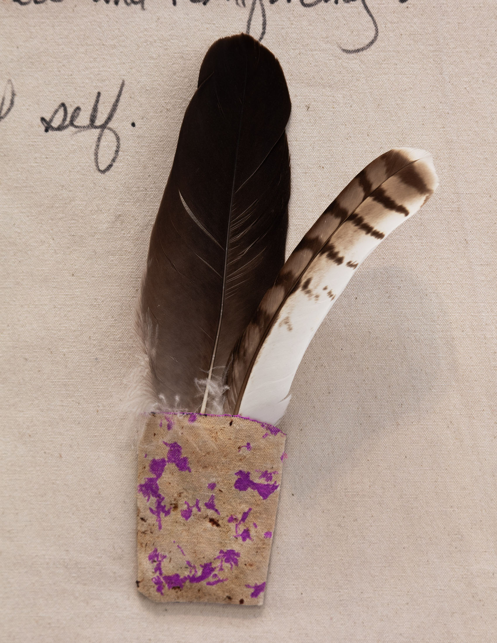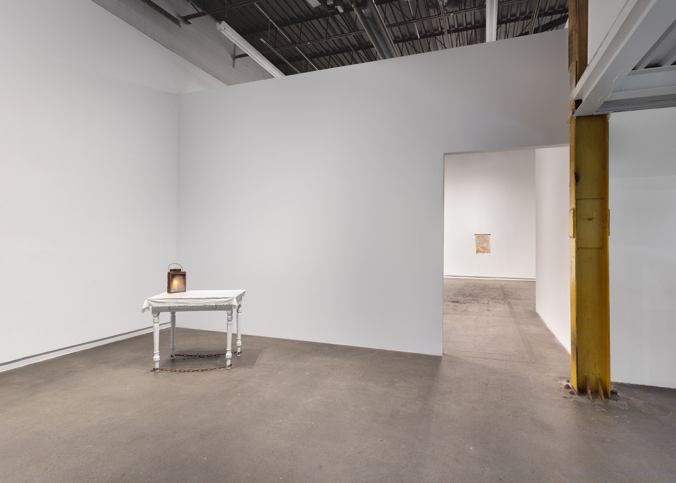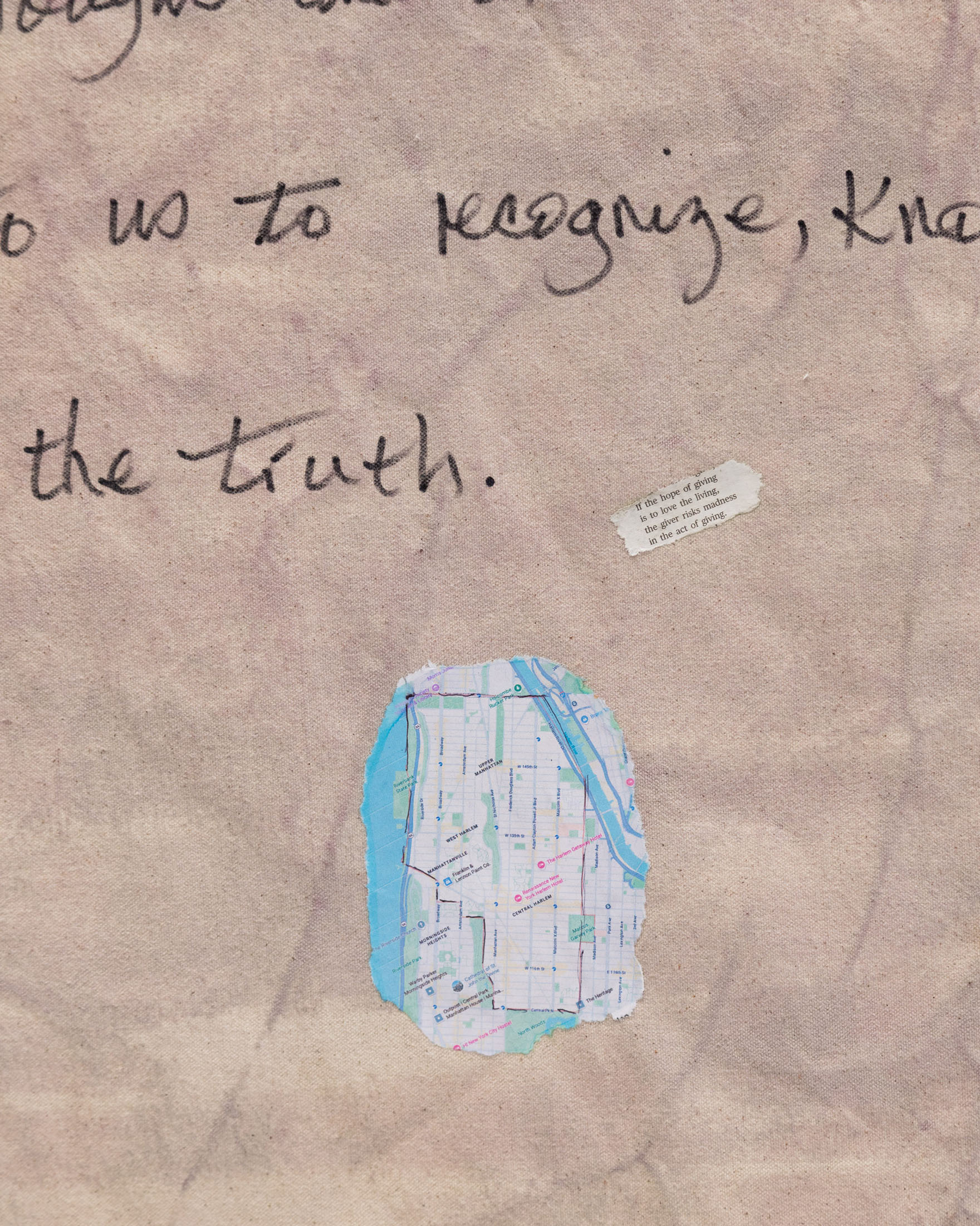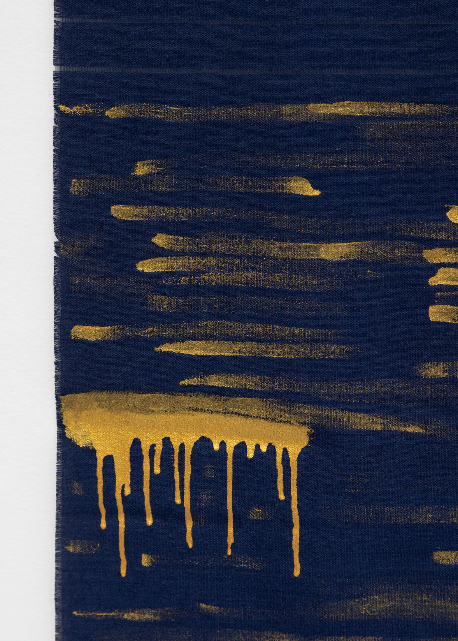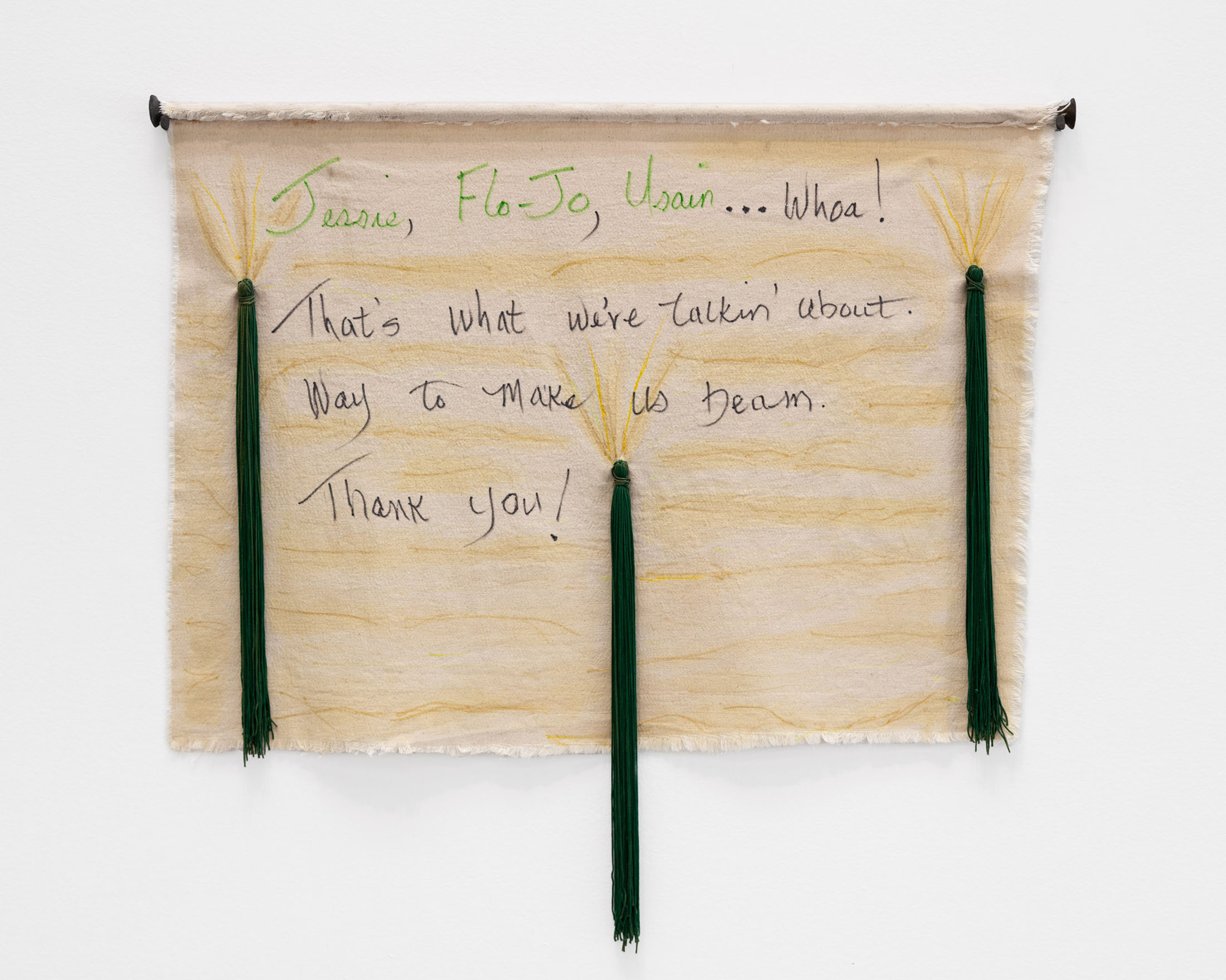 In Thank-you Notes, unstretched canvas hangs from heavy metal dowels, like unravelling scrolls. A scrawled message adorns each one, and painted sweeps of colour create a watery horizon. Clark uses materials such as wine, tea, blueberry juice, red brick dust, and rusted metal, many of which are recurring in her practice. Clark began using wine and tea in her work when she was living and working in Paris in the early 2000s, restricted to what was readily on hand. Used for protection in HooDoo and VooDoo communities, red brick dust is often scattered in front of the home’s entrance for protection and luck. Some of the canvases have been pulled to reveal bare vertical threads, a meditative, repetitive act that Clark often returns to in the studio, such as in Moral Disengagement (2014-17), an American flag that Clark unravelled over three years. Other works are wrinkled and then ironed out again, like well-handled pieces of paper.