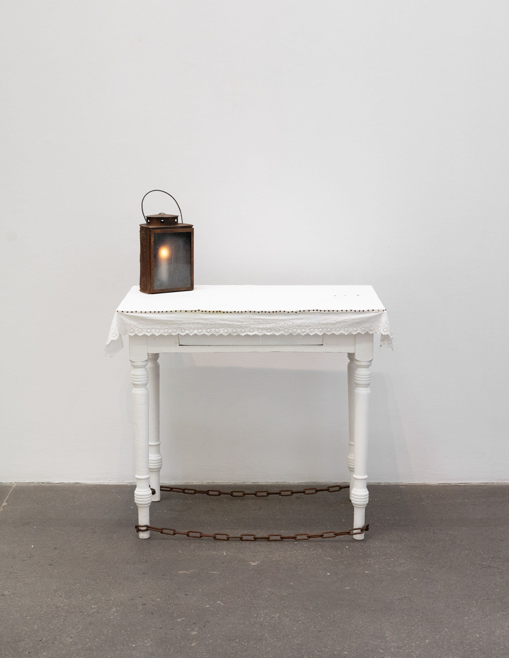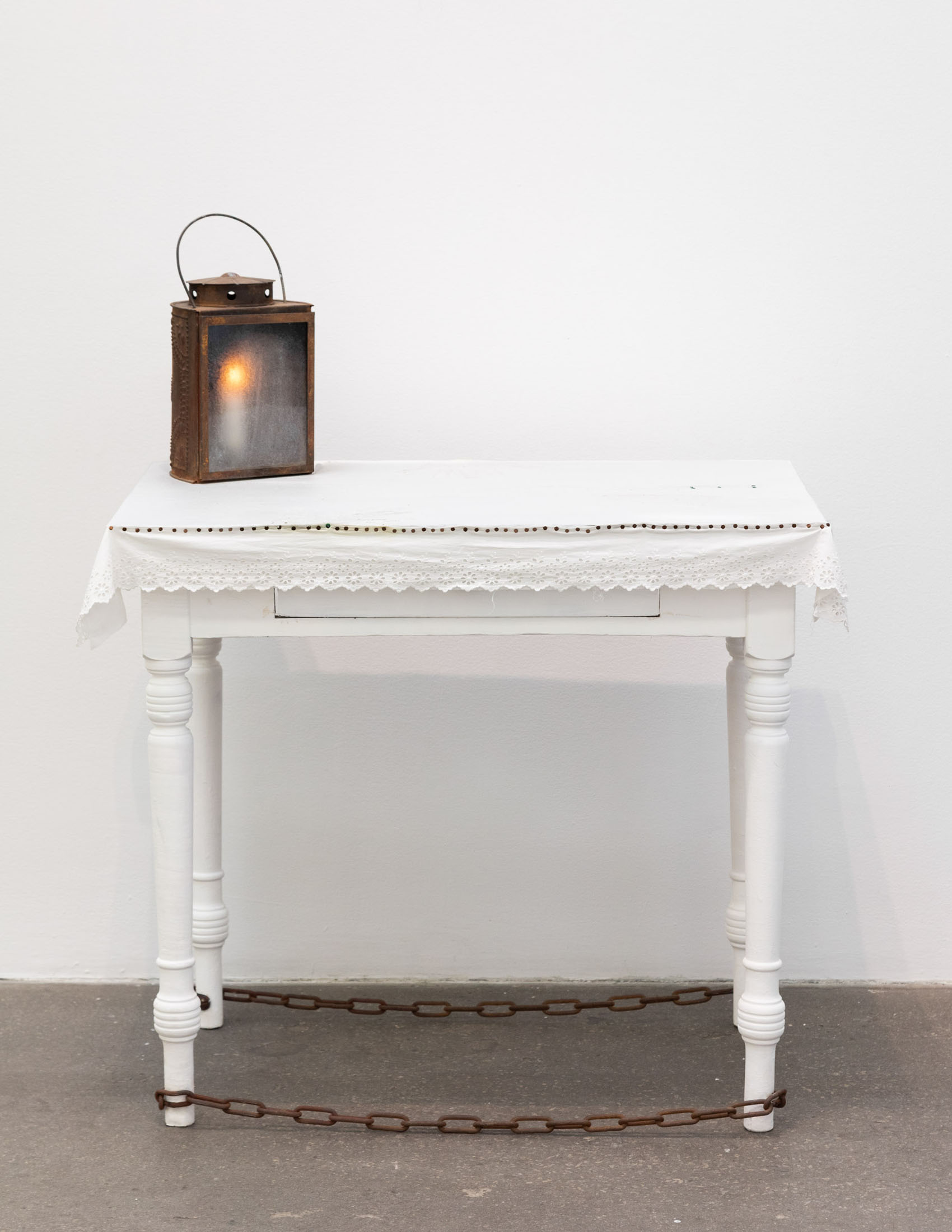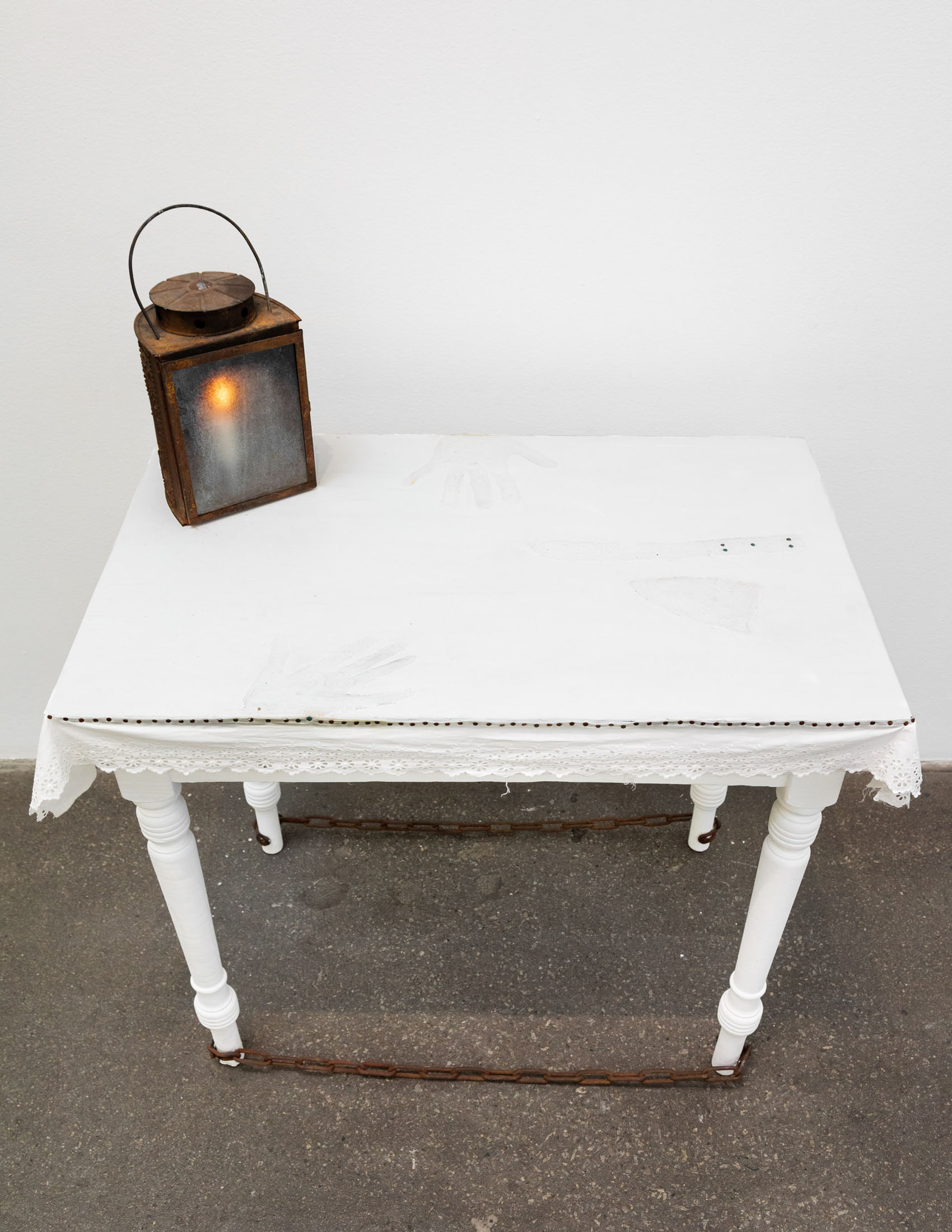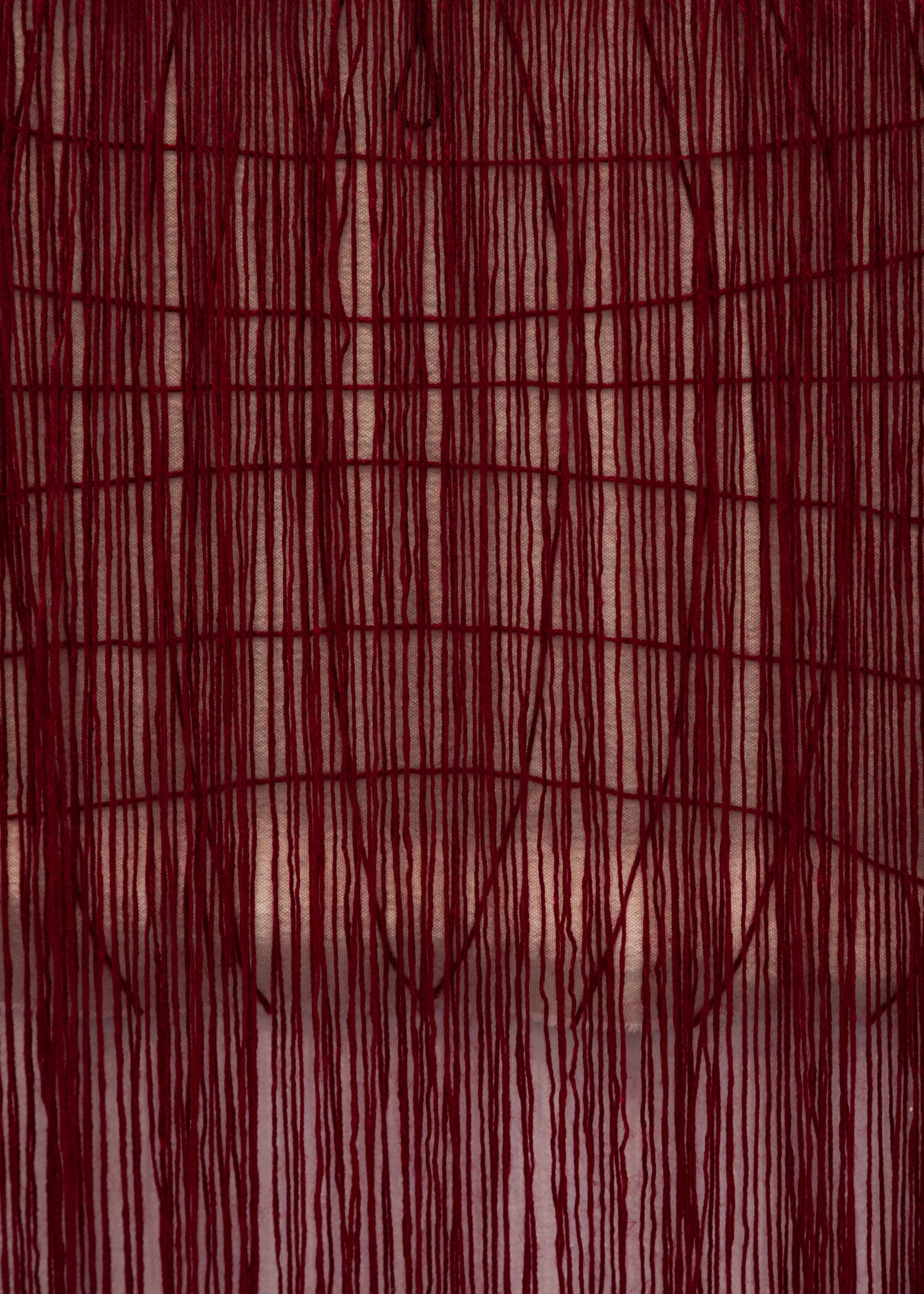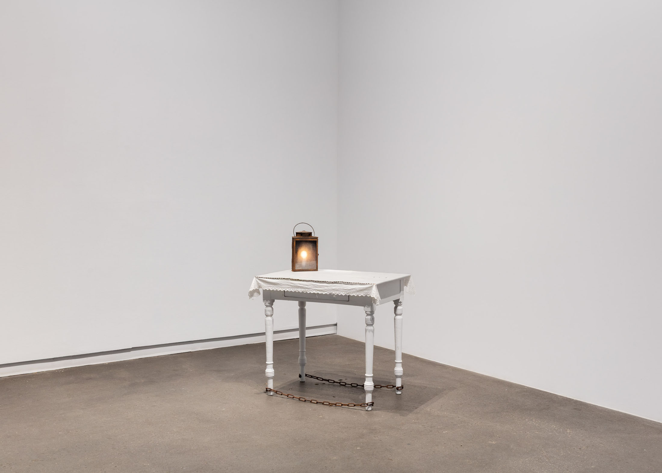 In Thank-you Notes, unstretched canvas hangs from heavy metal dowels, like unravelling scrolls. A scrawled message adorns each one, and painted sweeps of colour create a watery horizon. Clark uses materials such as wine, tea, blueberry juice, red brick dust, and rusted metal, many of which are recurring in her practice. Clark began using wine and tea in her work when she was living and working in Paris in the early 2000s, restricted to what was readily on hand. Used for protection in HooDoo and VooDoo communities, red brick dust is often scattered in front of the home’s entrance for protection and luck. Some of the canvases have been pulled to reveal bare vertical threads, a meditative, repetitive act that Clark often returns to in the studio, such as in Moral Disengagement (2014-17), an American flag that Clark unravelled over three years. Other works are wrinkled and then ironed out again, like well-handled pieces of paper.