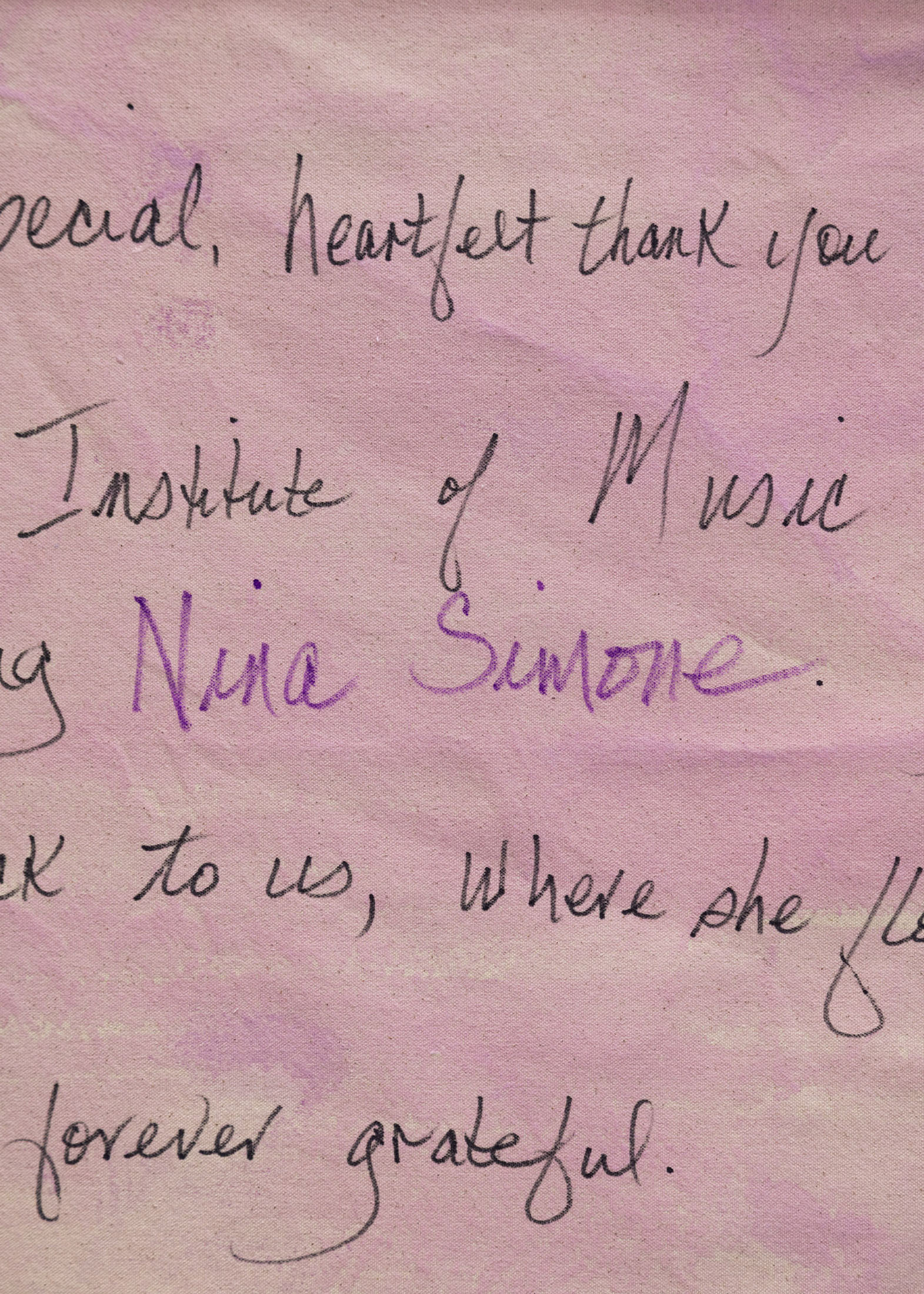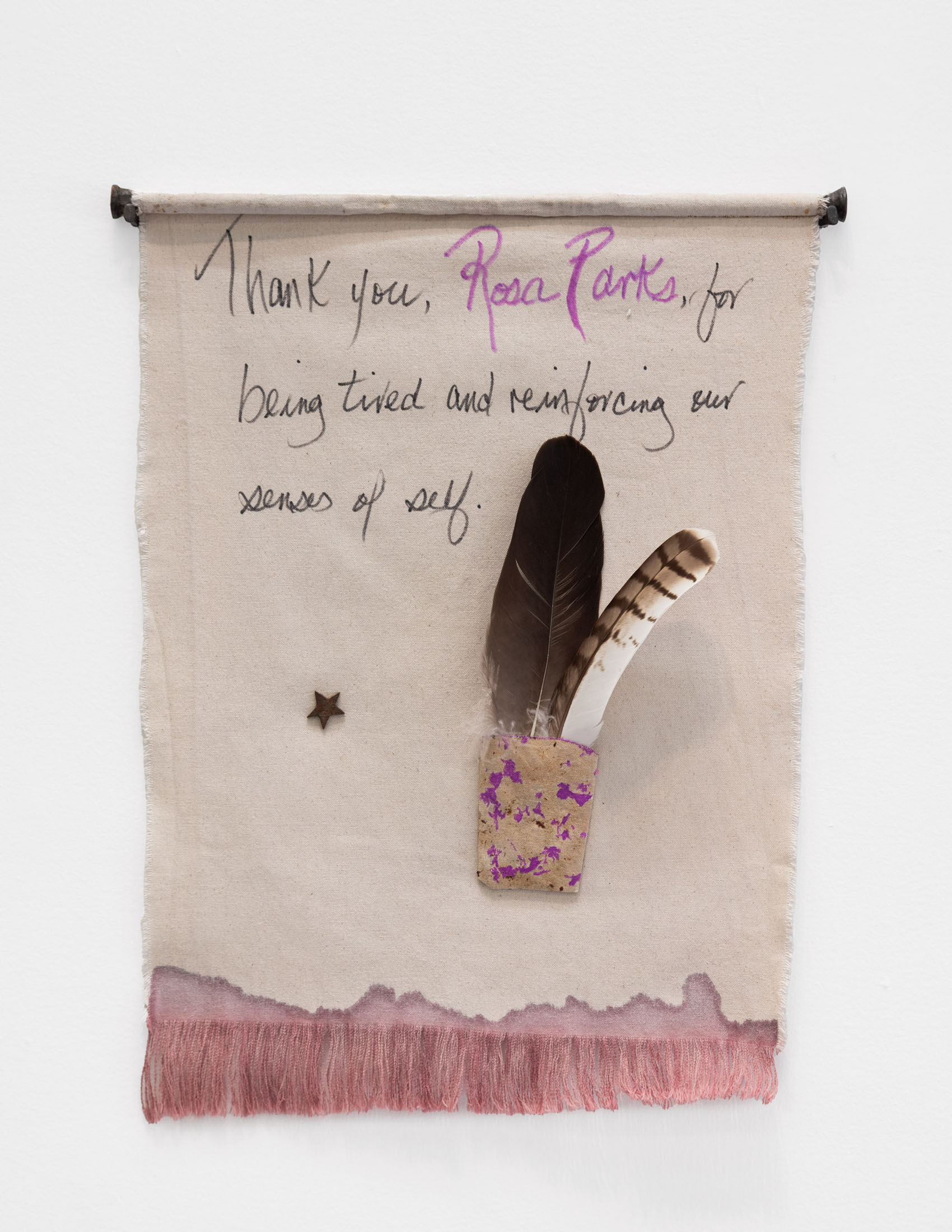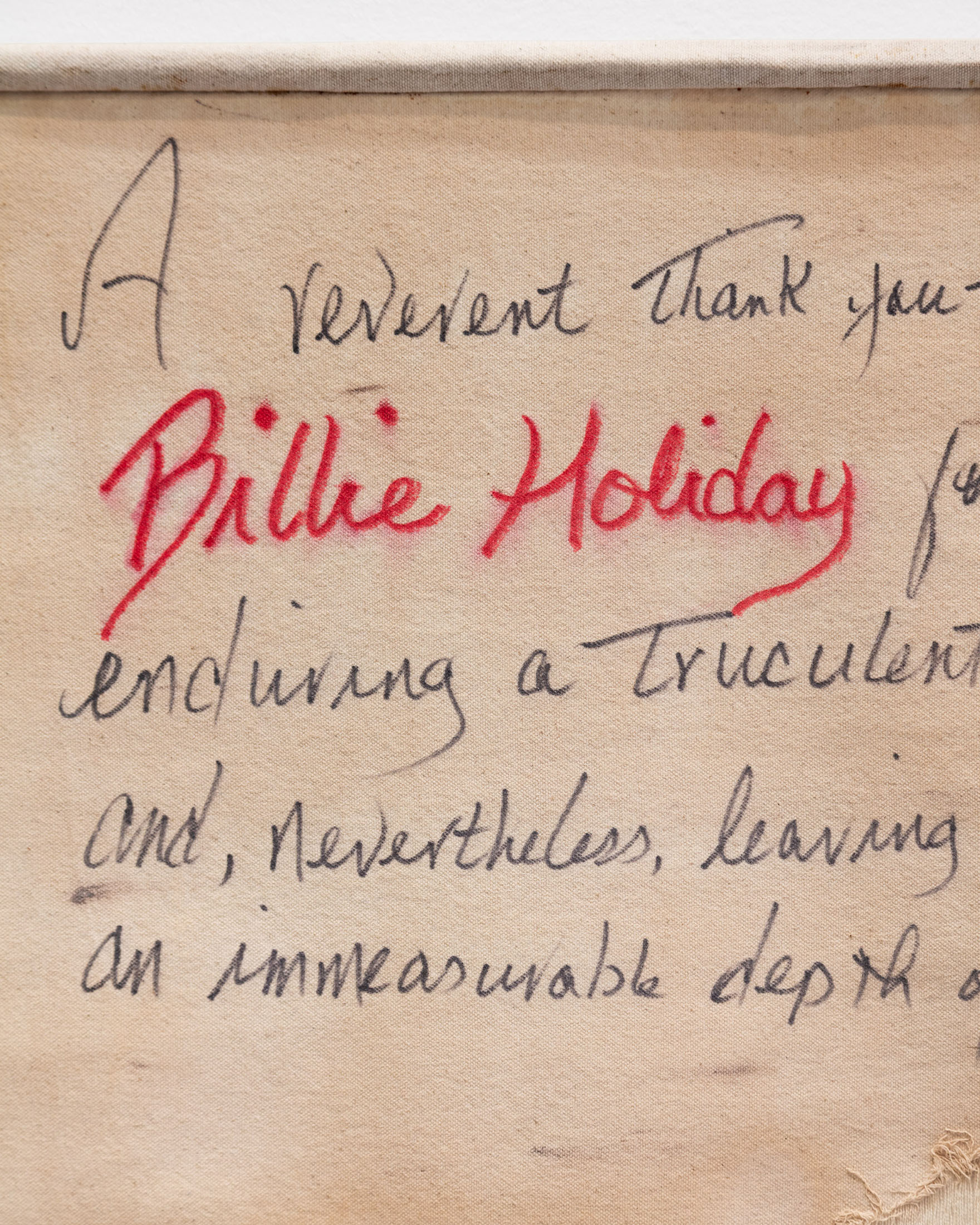 This body of work was made in response to growing revisionism, particularly in the United States, where museums, educational institutions, academics, and others who play a role in the telling of, and safekeeping of, history are being heavily threatened. In these works, Clark seeks to not only keep alive the names and histories of those she is worried might be forgotten – Billie Holiday, James Baldwin, Mamie Till, among others — but also to express her personal gratitude for their impact on our lives. “Thank you, Rosa Parks, for being tired and reinforcing our senses of self,” she writes.