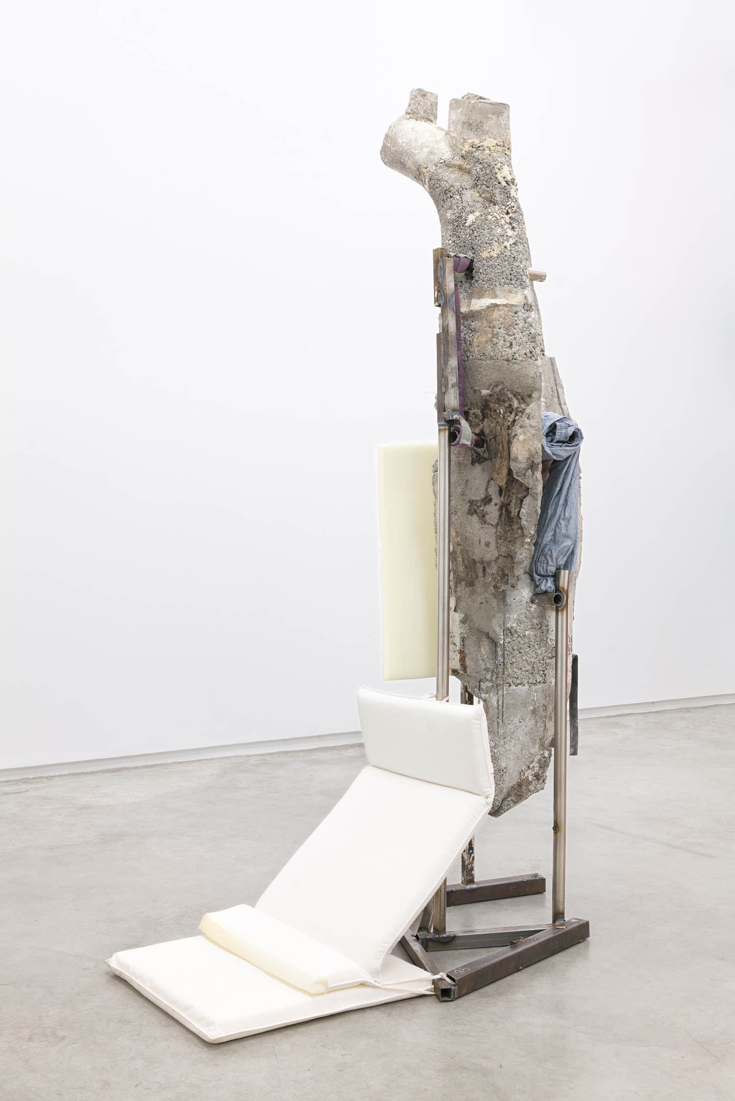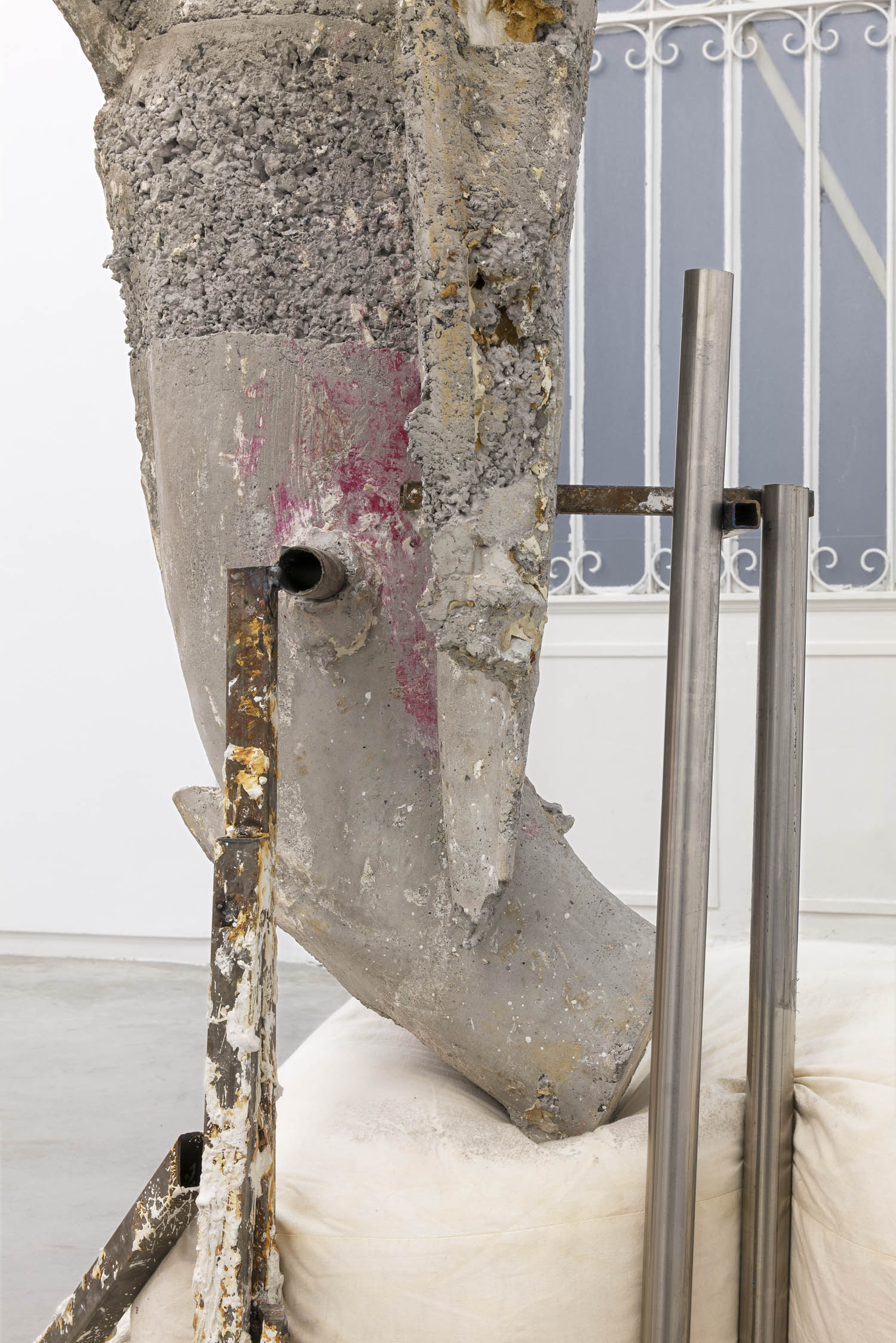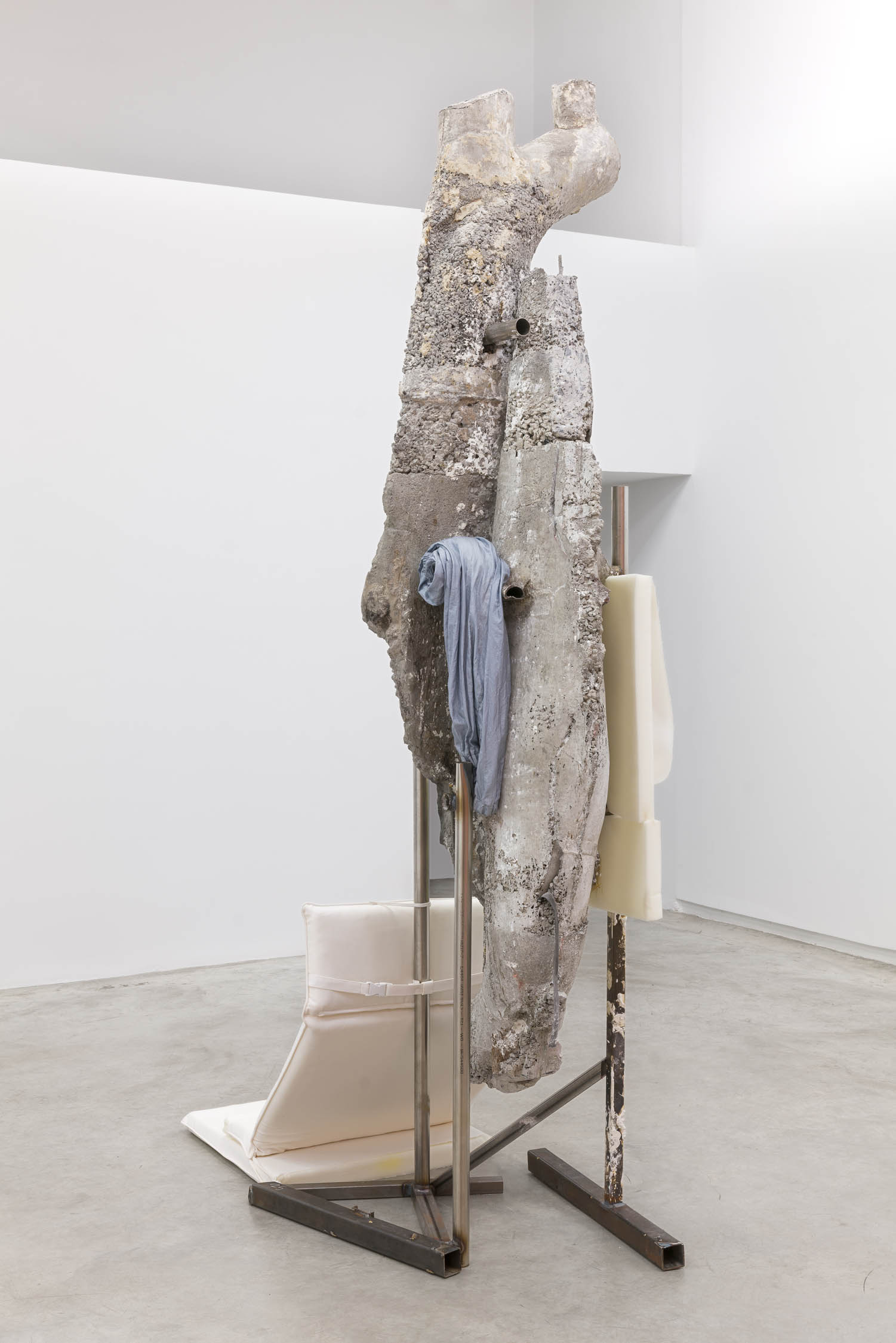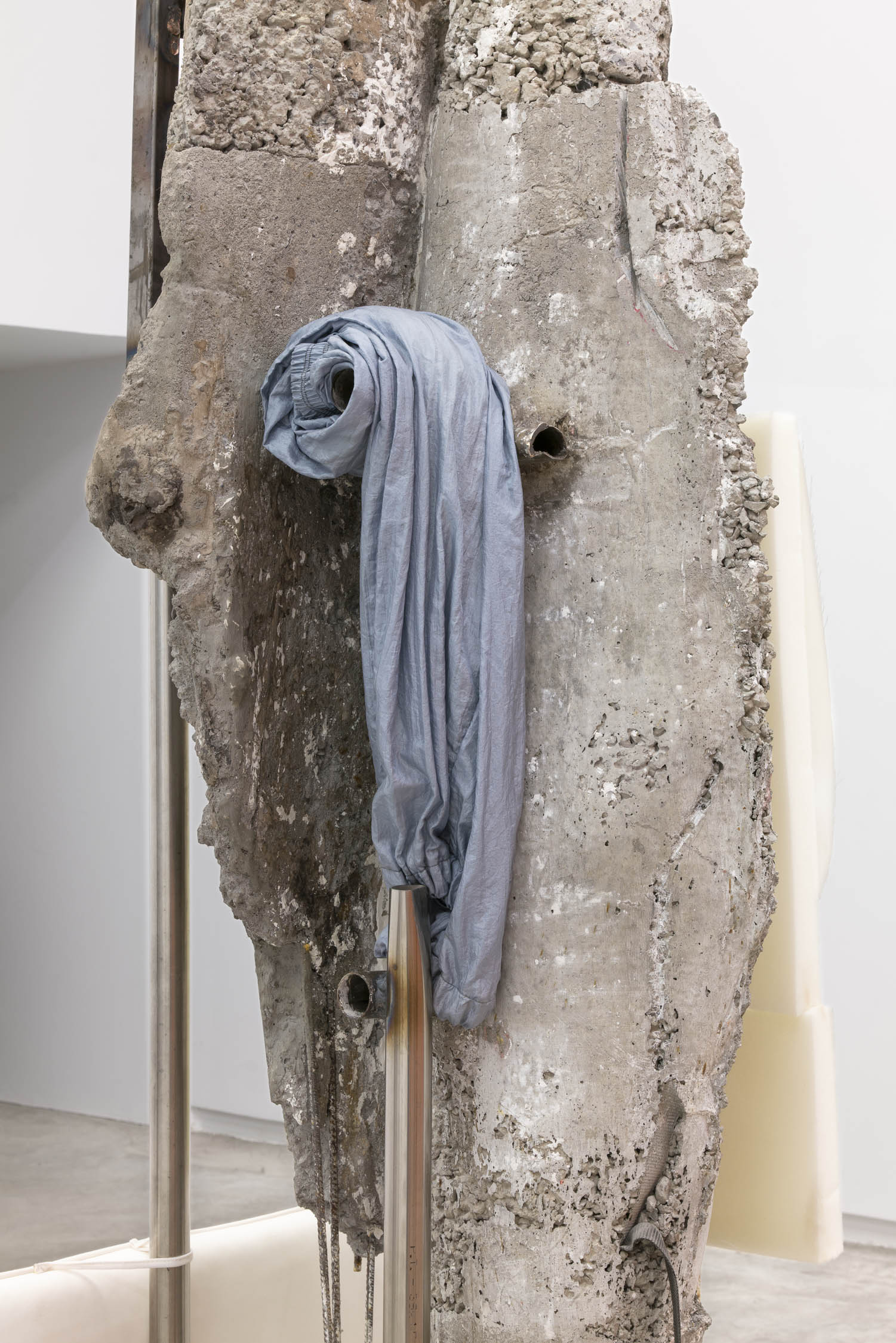 These concrete sculptures are anchored in a simultaneous movement of suspension and gravitation. They seem to rest on the ground sturdily, even though they are padded and cushioned by the use of other materials that transpose the form of the sculptural mould, and modulate their originally industrial nature. This hard, stony drift thus incorporates an element of comfort, more vulnerable and mobile, which, either as a cushion or as a dismembered mattress, elevates the works and cushions their hieratic nature. What were once impenetrable surfaces, except for those fissures where textile garments such as tracksuits or mackintoshes marked bright spots of colour in the industrial material, are now proposed as places of intense permeability.