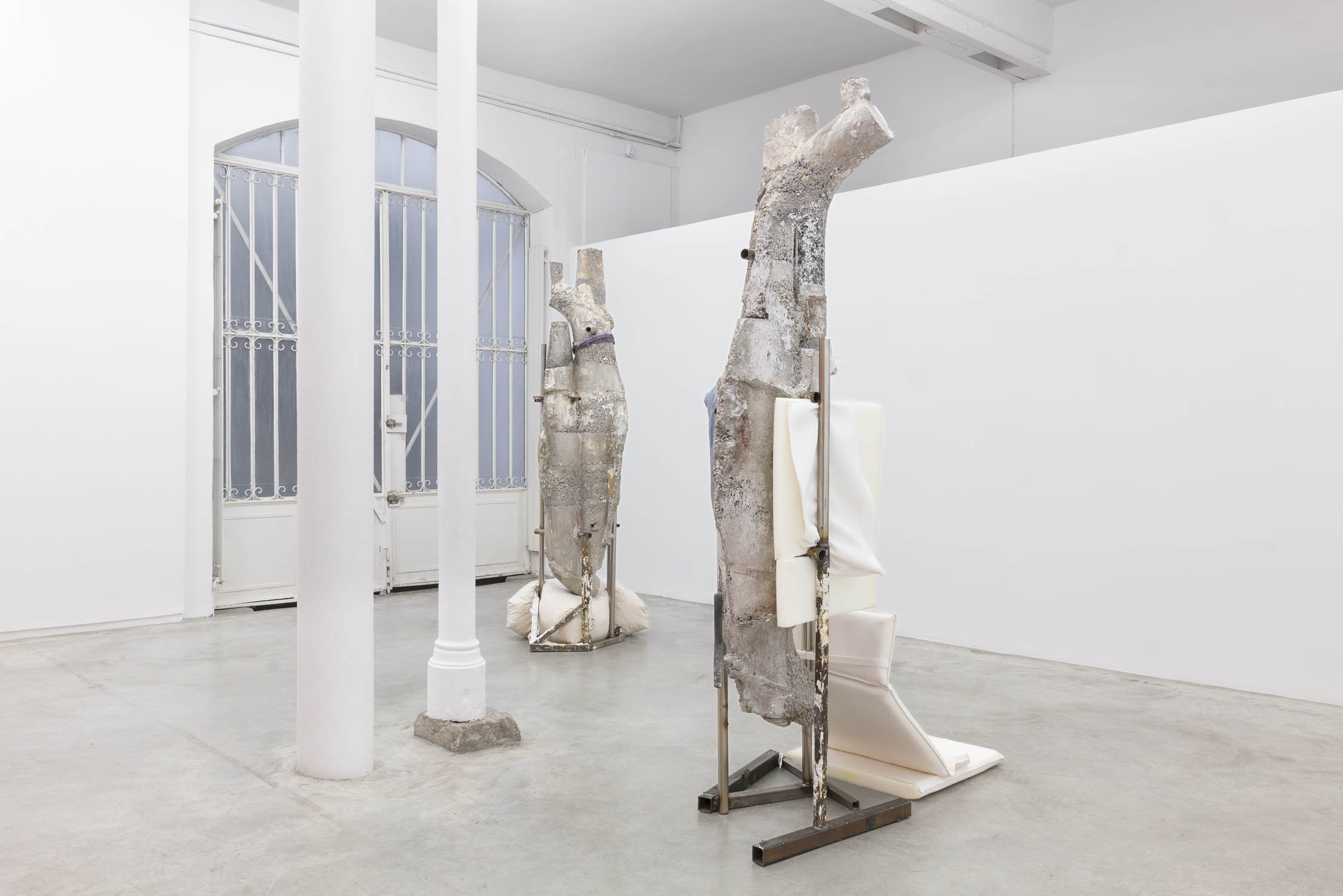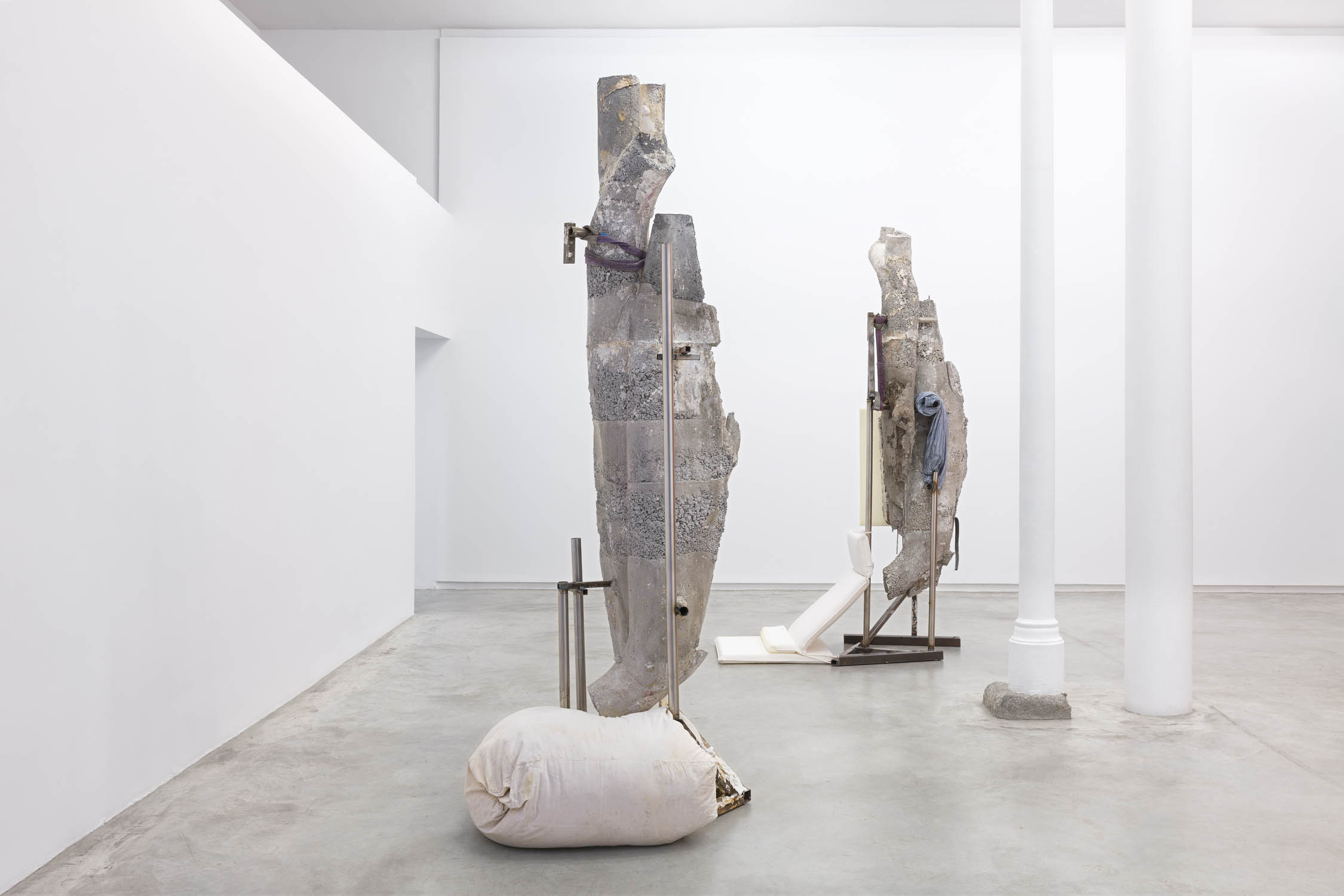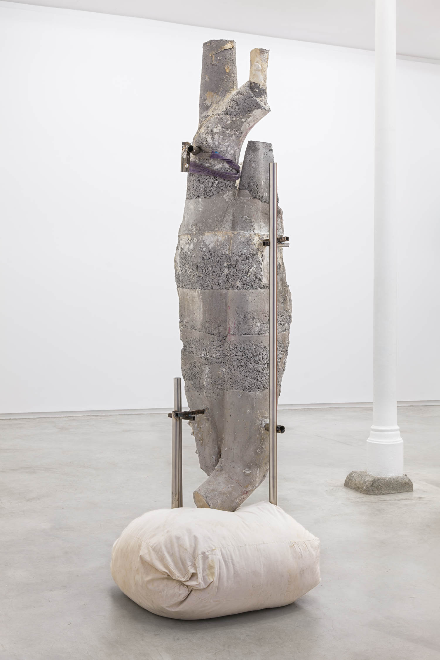These concrete sculptures are anchored in a simultaneous movement of suspension and gravitation. They seem to rest on the ground sturdily, even though they are padded and cushioned by the use of other materials that transpose the form of the sculptural mould, and modulate their originally industrial nature. This hard, stony drift thus incorporates an element of comfort, more vulnerable and mobile, which, either as a cushion or as a dismembered mattress, elevates the works and cushions their hieratic nature. What were once impenetrable surfaces, except for those fissures where textile garments such as tracksuits or mackintoshes marked bright spots of colour in the industrial material, are now proposed as places of intense permeability.