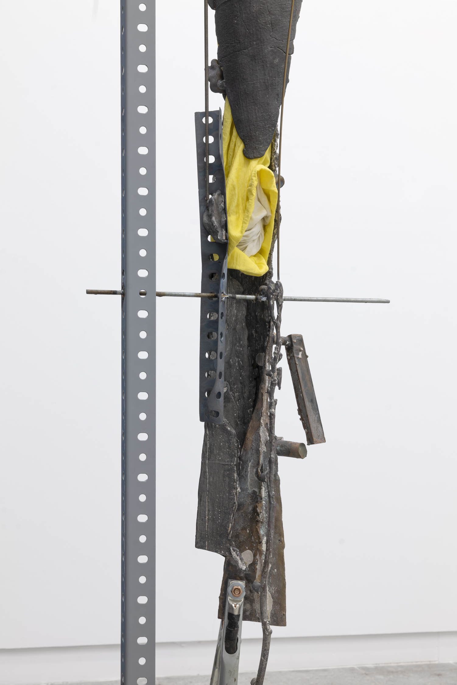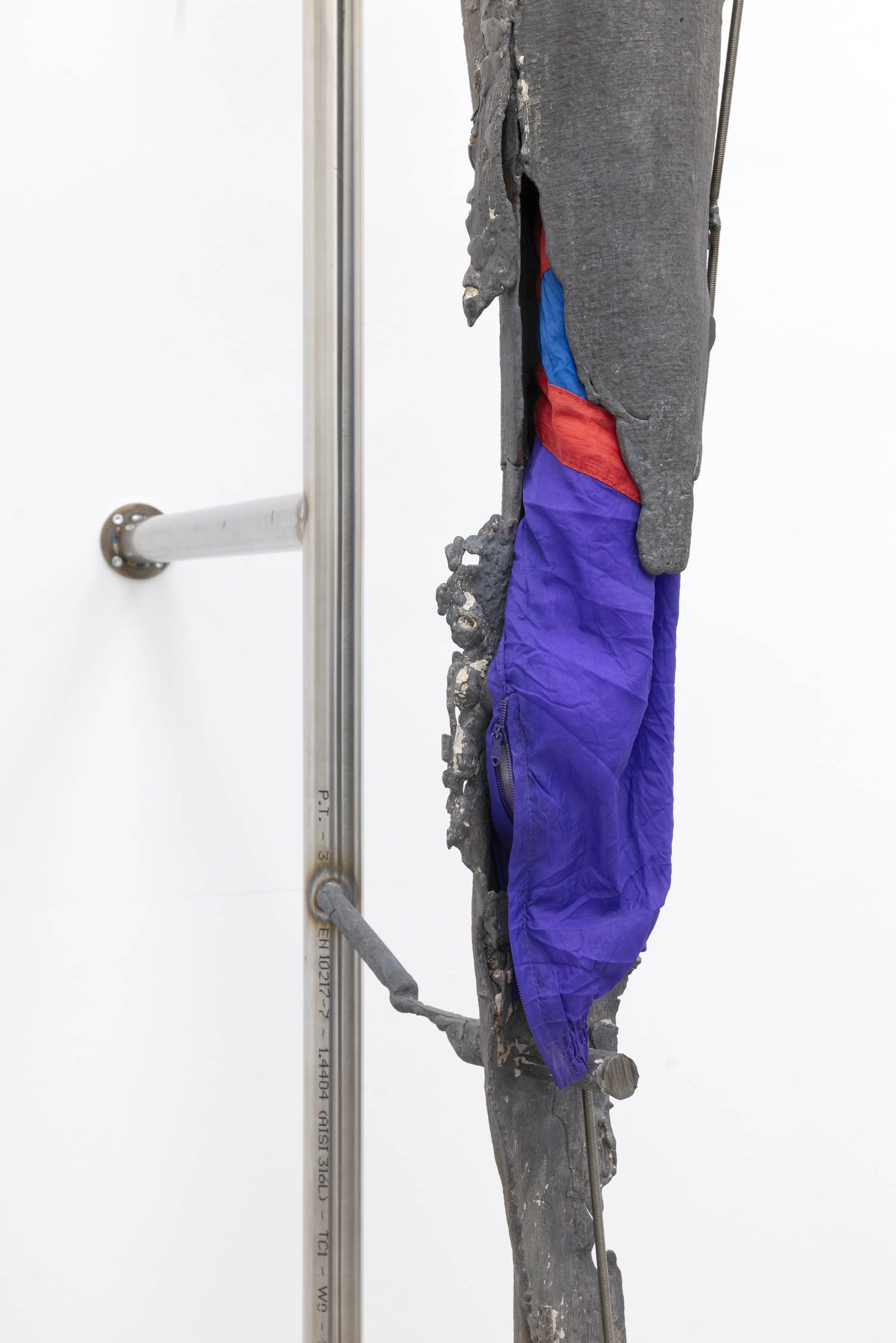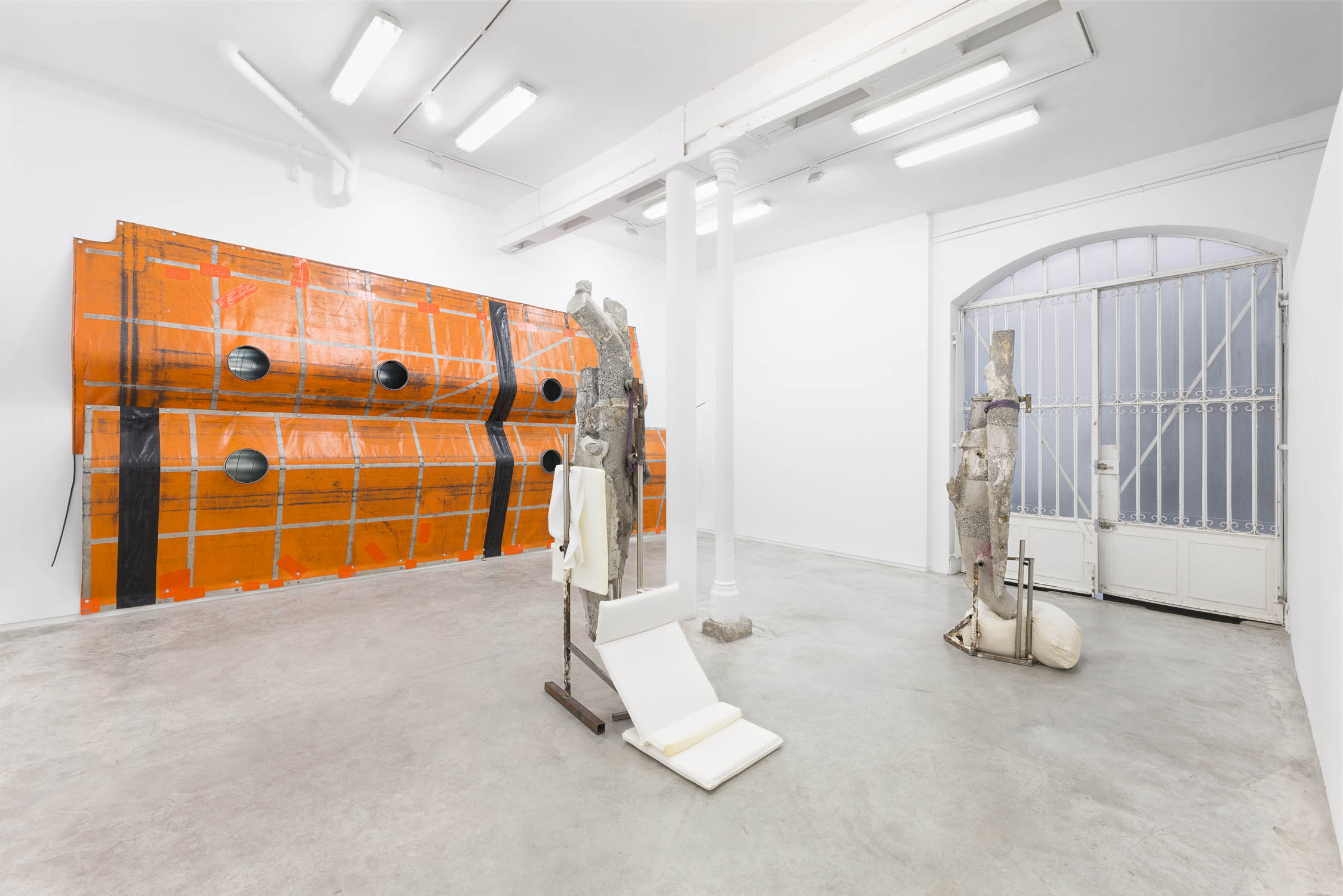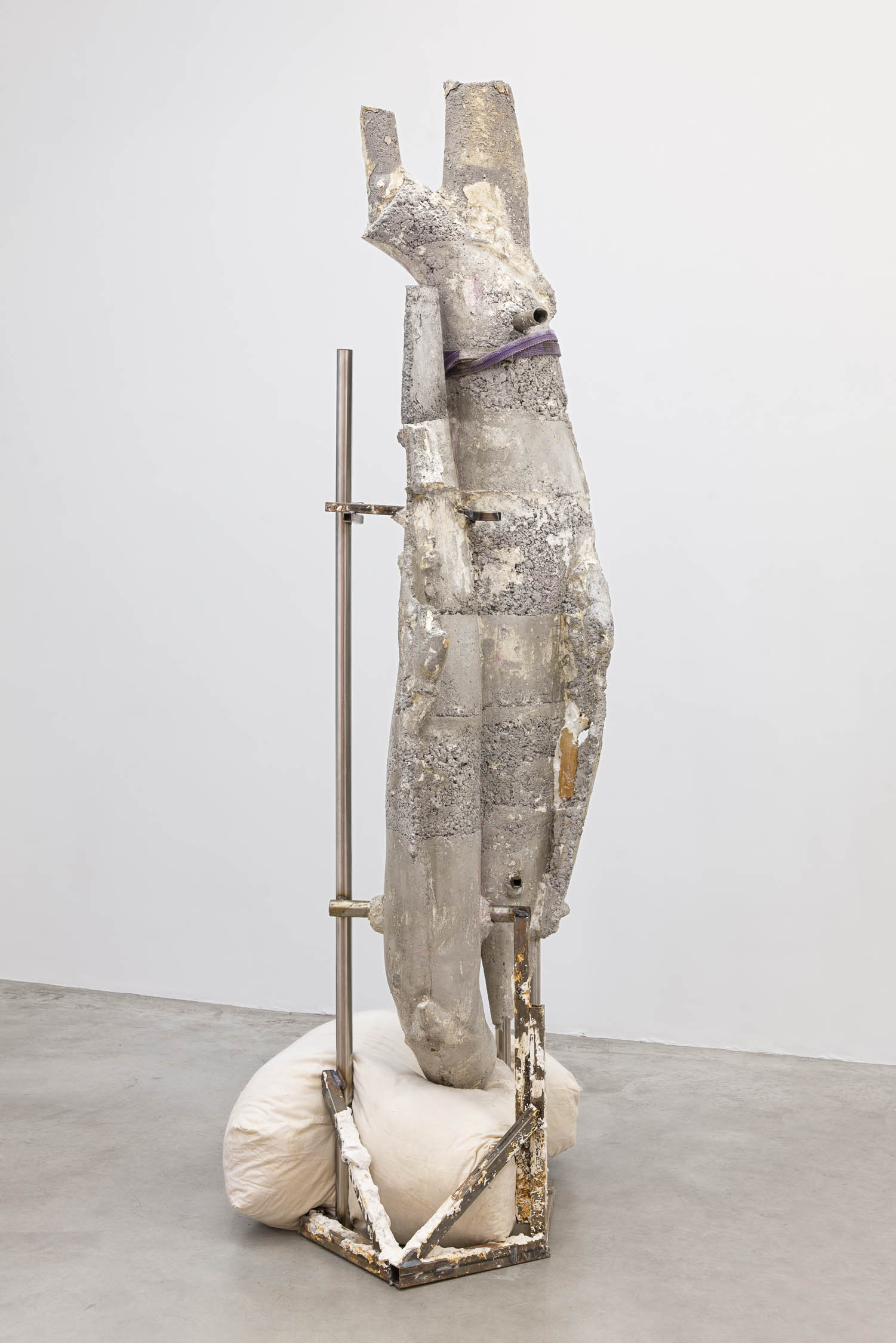 These concrete sculptures are anchored in a simultaneous movement of suspension and gravitation. They seem to rest on the ground sturdily, even though they are padded and cushioned by the use of other materials that transpose the form of the sculptural mould, and modulate their originally industrial nature. This hard, stony drift thus incorporates an element of comfort, more vulnerable and mobile, which, either as a cushion or as a dismembered mattress, elevates the works and cushions their hieratic nature. What were once impenetrable surfaces, except for those fissures where textile garments such as tracksuits or mackintoshes marked bright spots of colour in the industrial material, are now proposed as places of intense permeability.