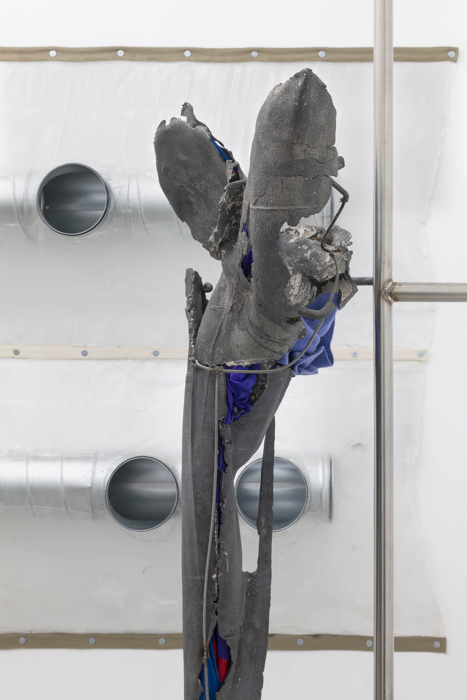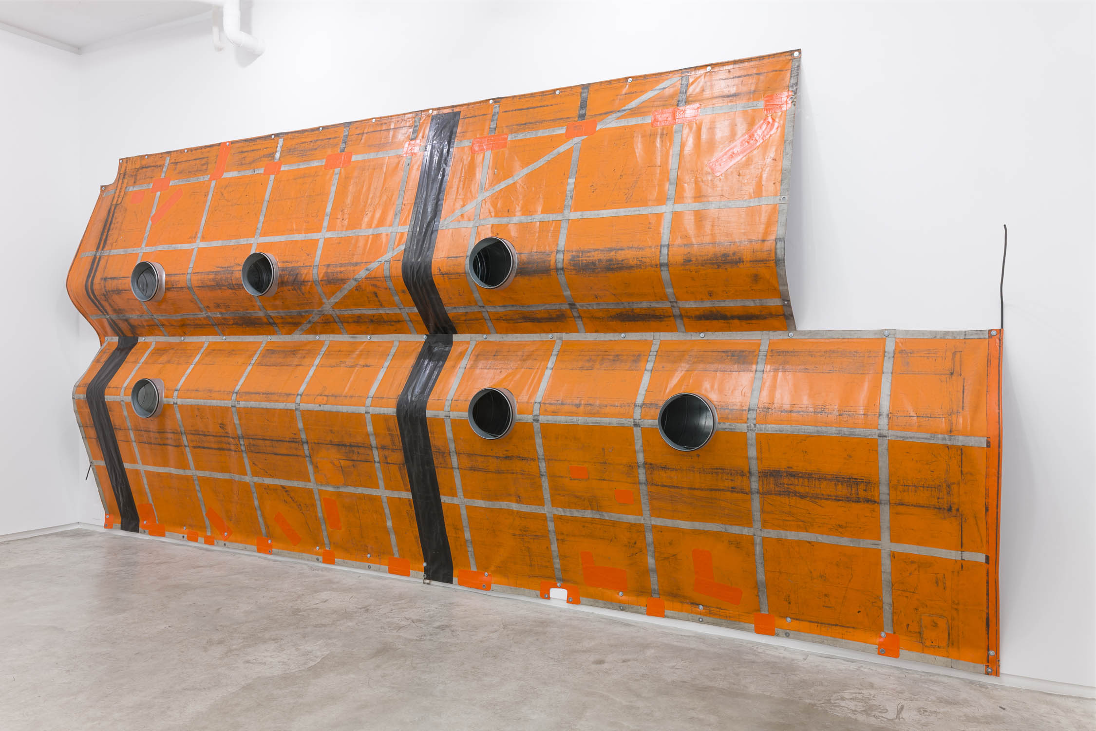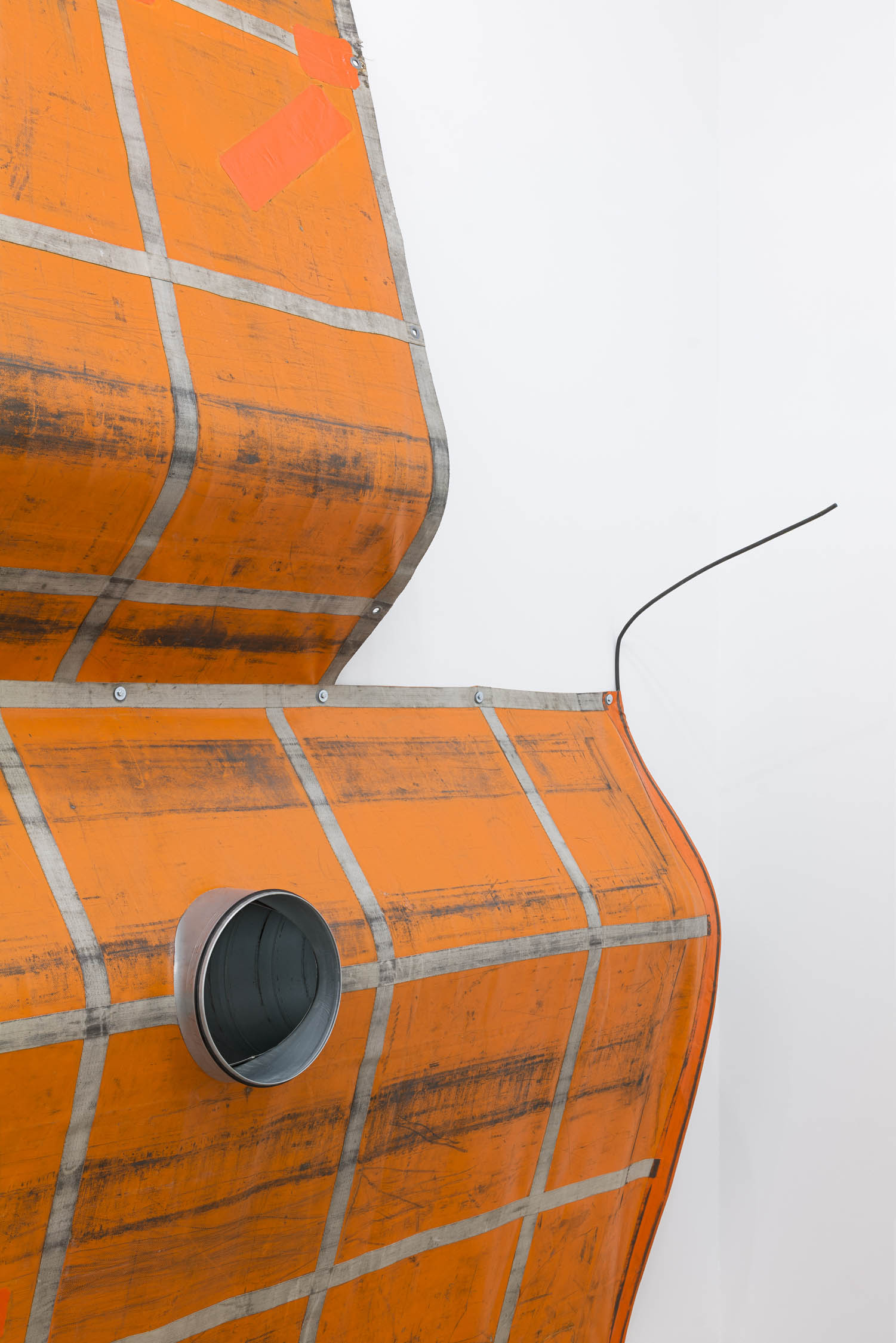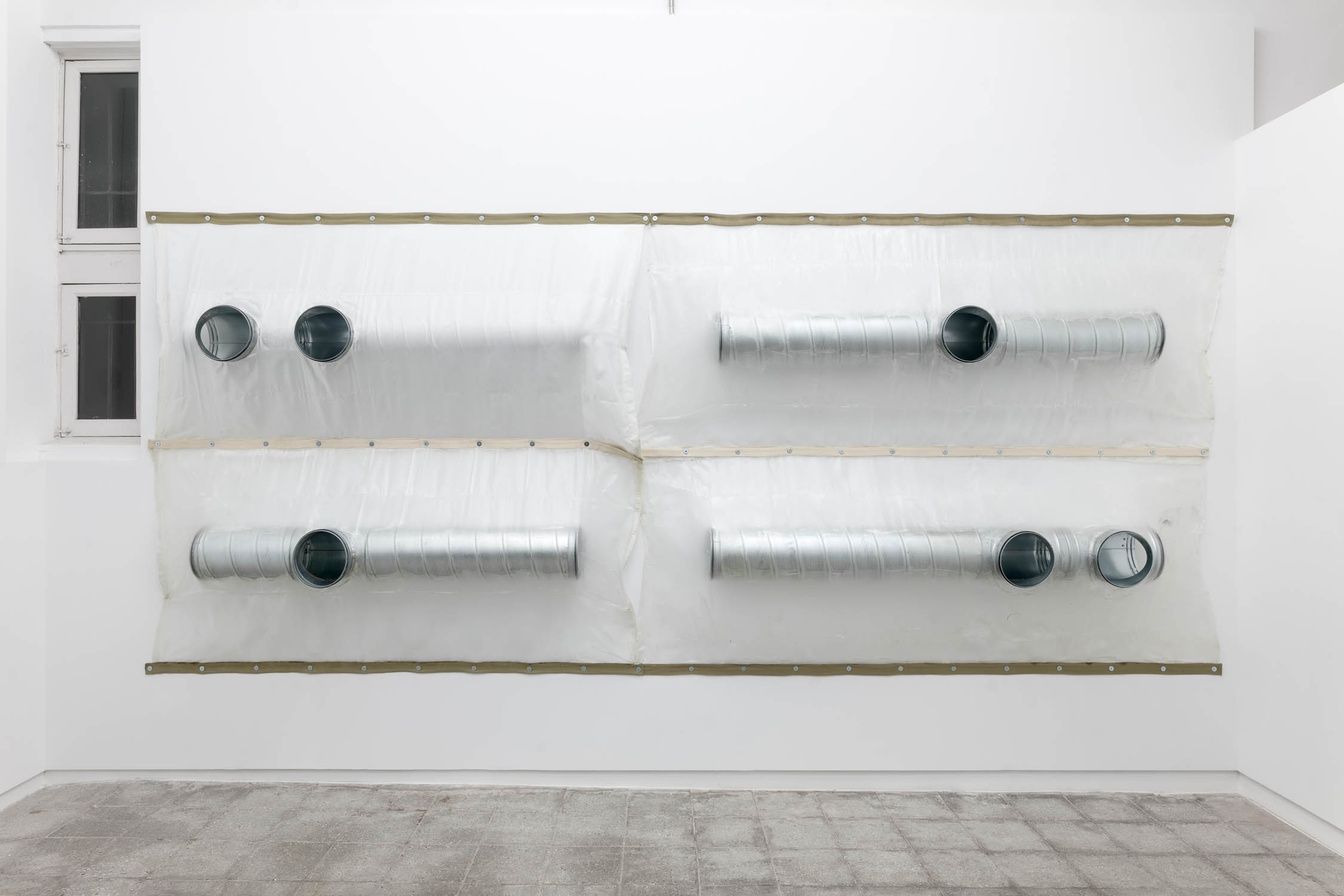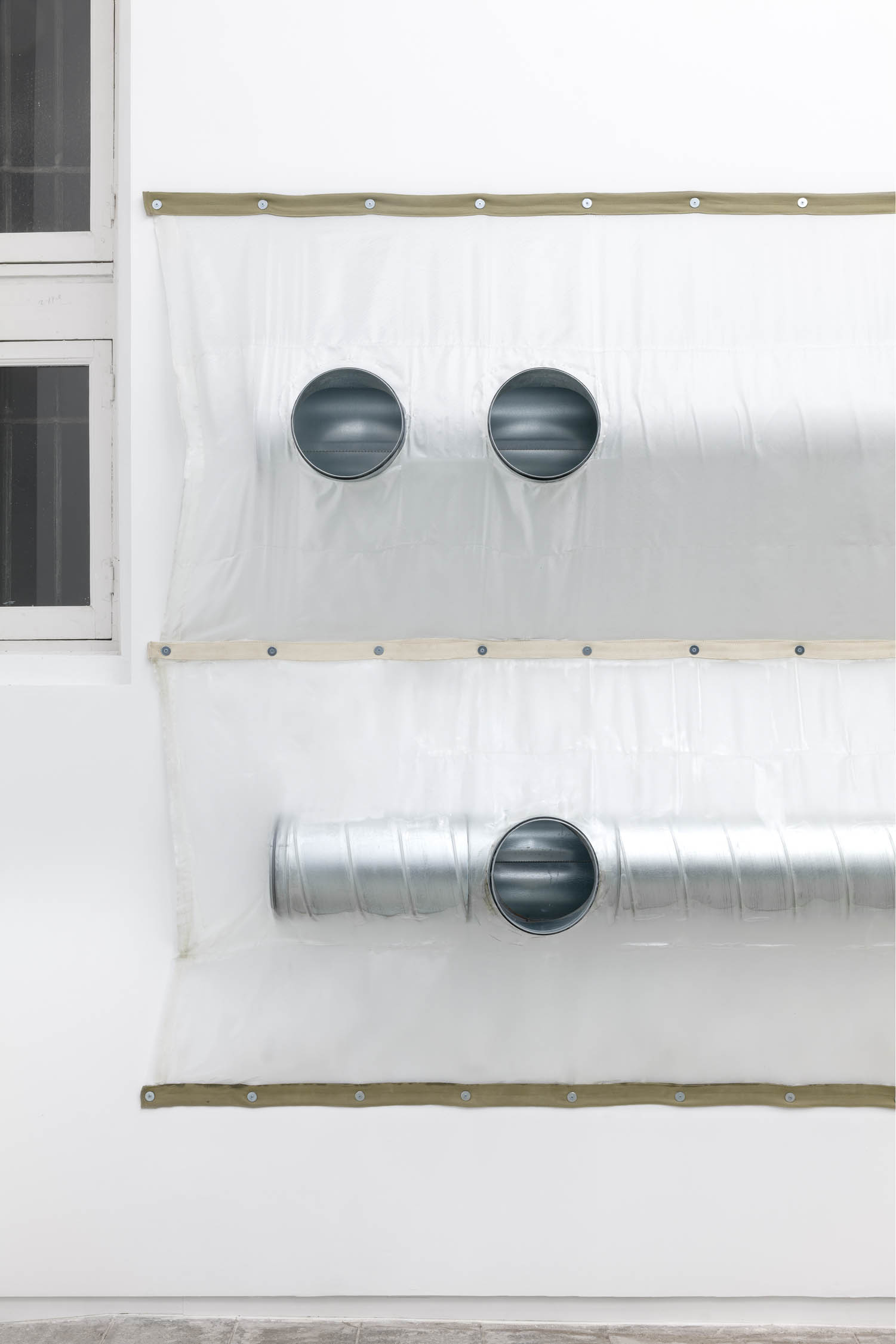 Industrial materials such as ventilation ducts and modified truck tarpaulins, or resin-soaked fibreglass fabric, form the wall pieces in both gallery spaces. These wall gestures are a continuation of the series Their weft, the grass (TW,TG), initiated in 2024 in space 1646 (The Hague). Holes that open up on the surface of the plastic sheet provide access to the interior of the pipes arranged transversally on the wall and allow the piece to be
