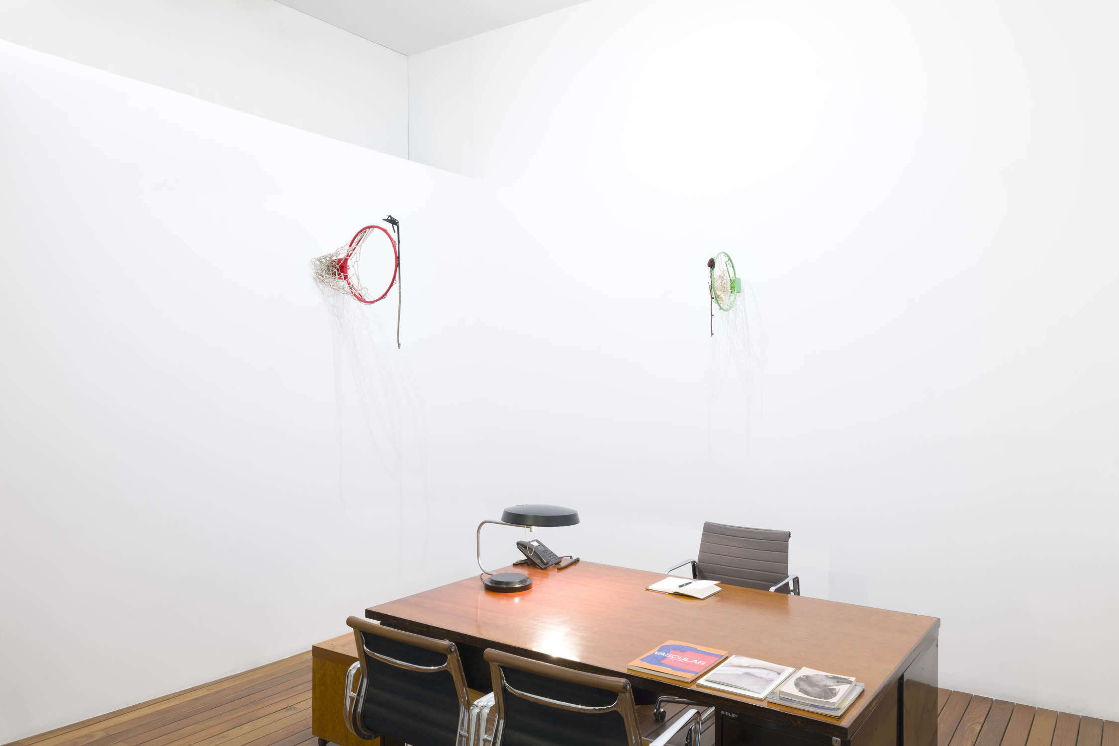 The wall pieces in both spaces seem to radiate light and generate an atmosphere and a place for the free-standing or foreground pieces. They are held in a balance between tension and distension, between what is shown and hidden, between transparency and structural clarity, and the blurring of a membrane. What provides cover also allows elements to appear.