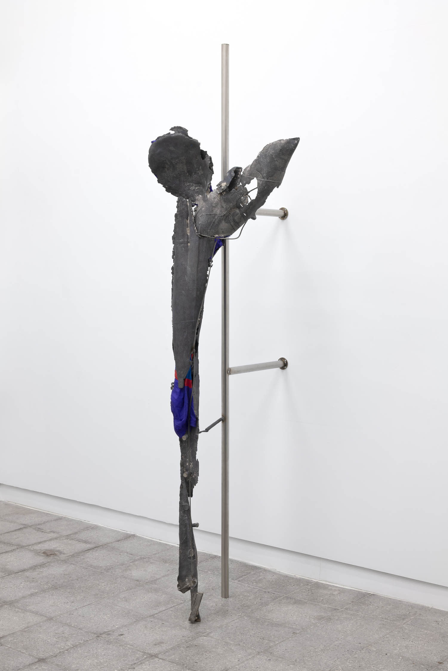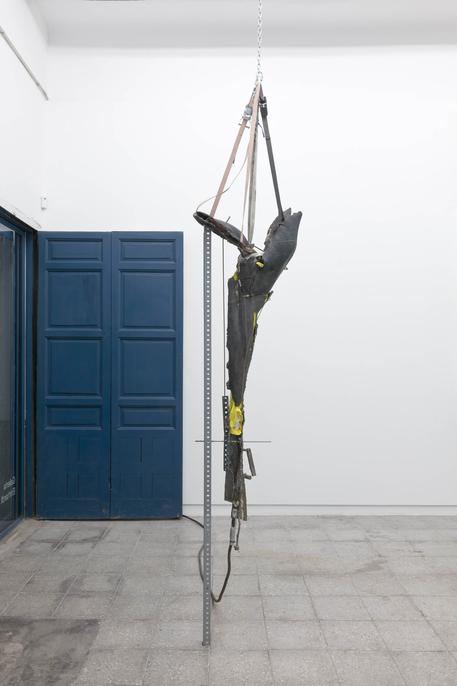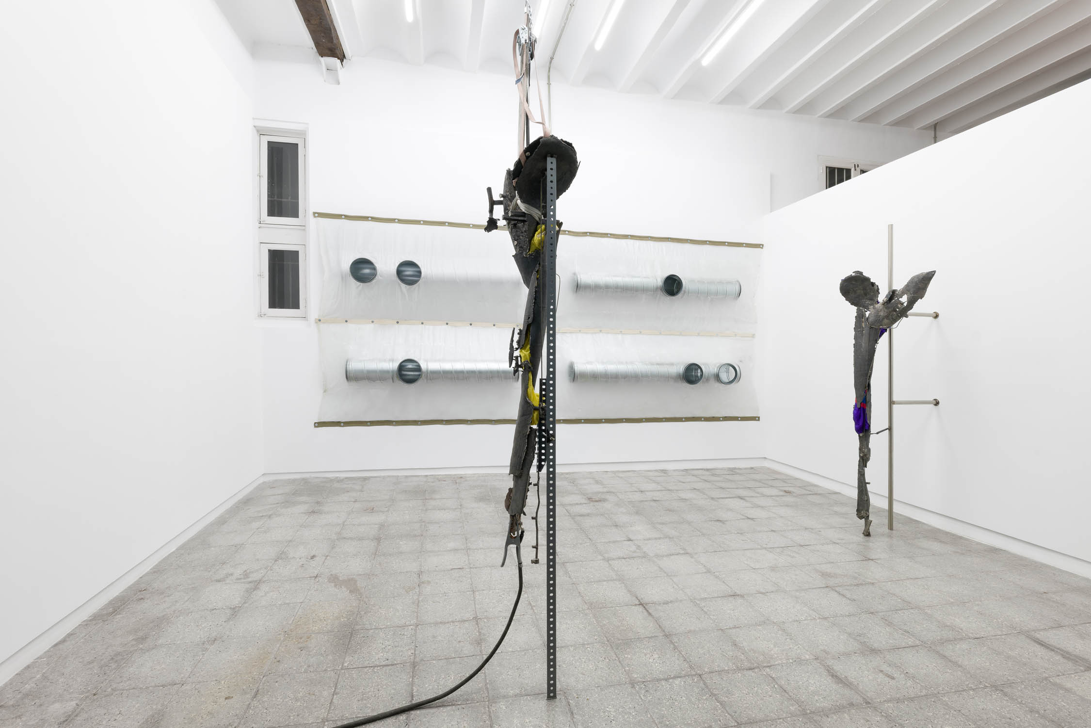 The next room holds an installation with a certain parallelism in its composition, constituting the backdrop for two floating, ethereal metal and textile sculptures that each contain garments that have been squeezed together. With different supports and anchorages (ceiling-floor and wall), the sculptures dancing column (Iris) (I) and (II) configure the space in a conceptual and architectural manner very different from the main room.