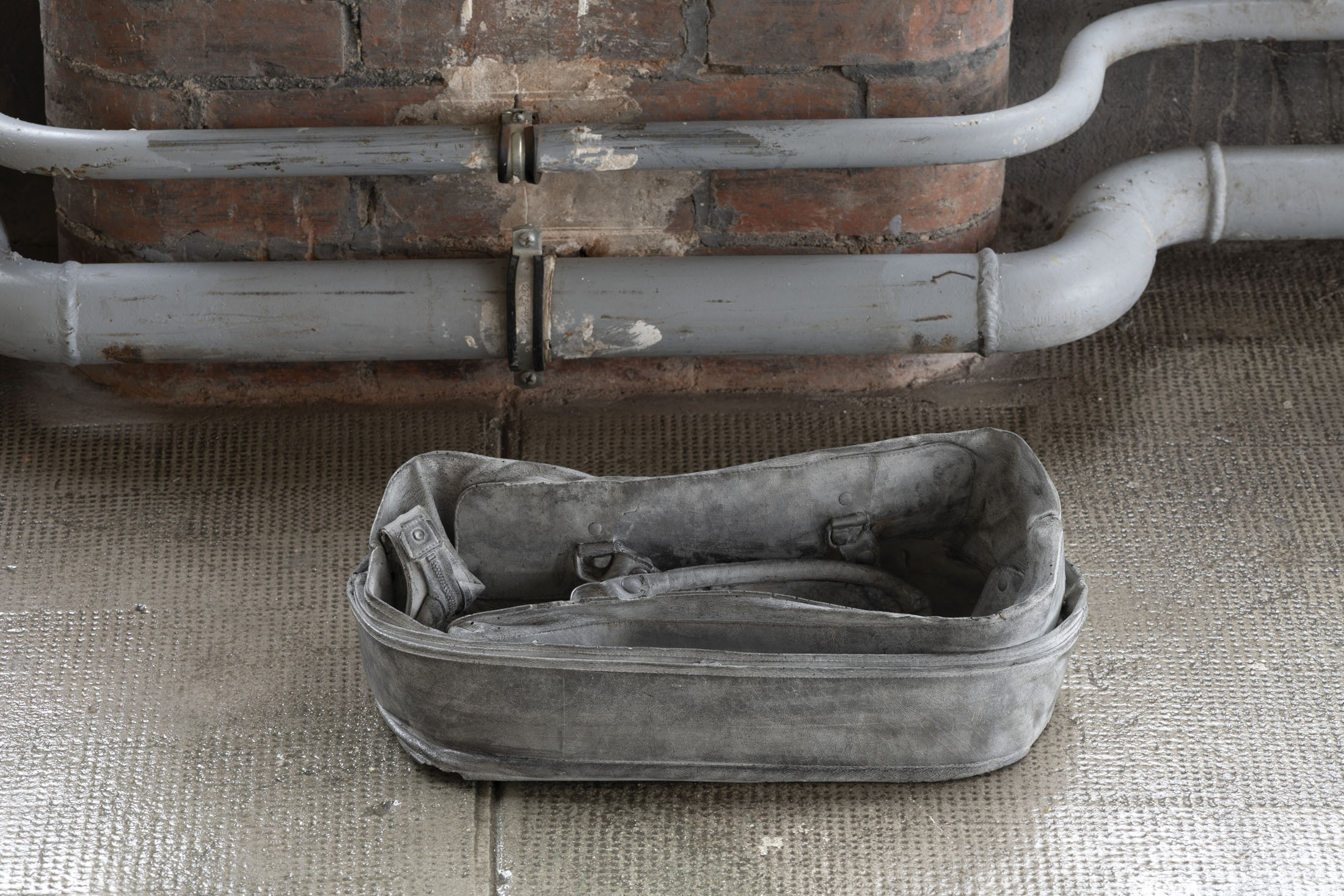 Gestures of tenderness are at the heart of this process, reflected in her way of arranging elements and juxtaposing opposites. Parentescos is a casting of a familiar, personally-significant object, the artist’s grandmother’s travel bag. She is interested in the plasticity of the object: made of soft leather, it can be filled and emptied, expanded and contracted, as if alive, breathing in and out.