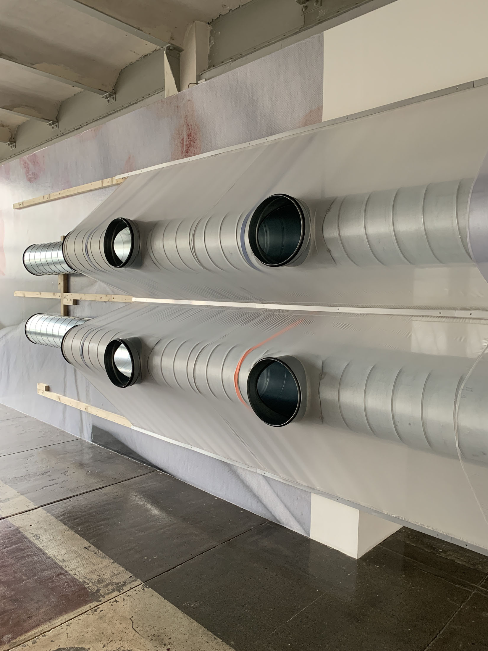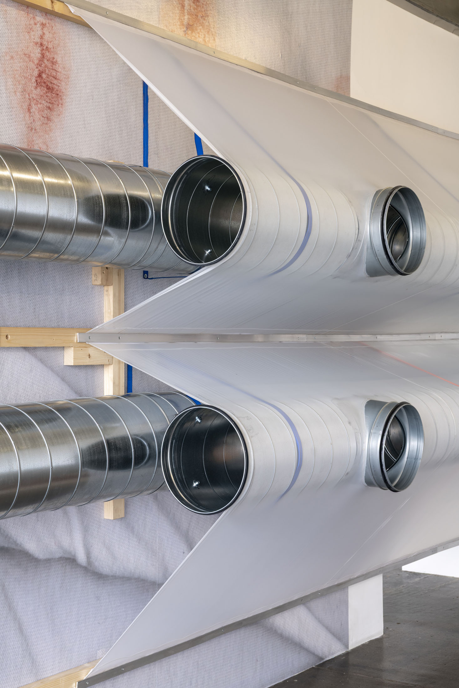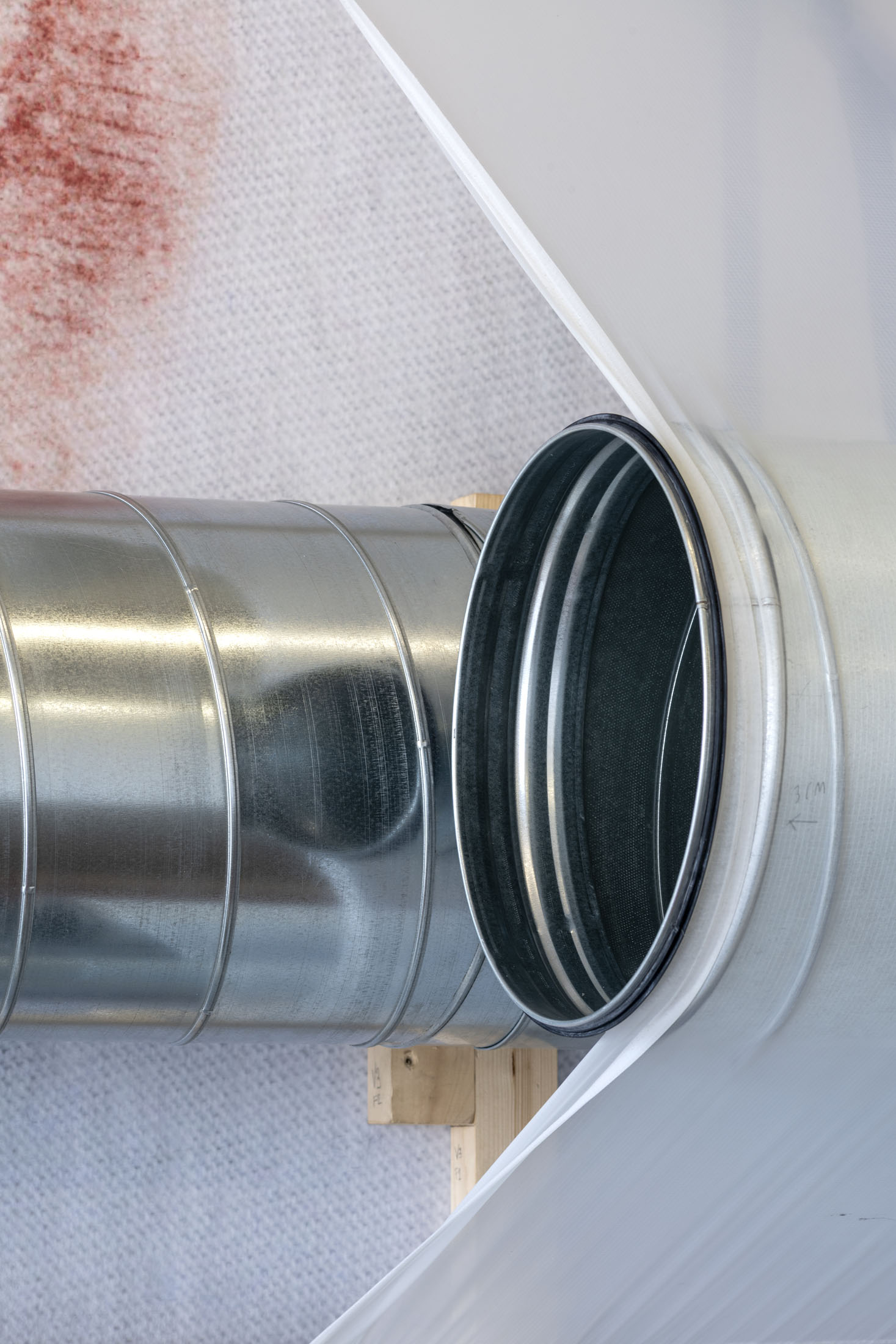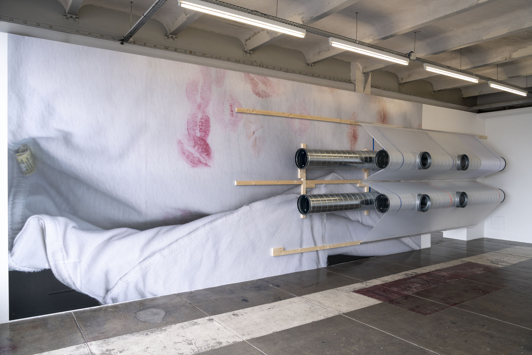 June Crespo treats printed objects as sculptural and architectural materials that she places in dialogue with the exhibition space, taken not as a constraint but as a partner to the work. The installation Rose trraction is comprised of a large-format, high-definition print of a scan of one of her T-shirts covered with lipstick marks. The artist cultivates a taste for oxymorons: galvanised steel ventilation ducts are veiled with parachute fabric trimmed with lace.