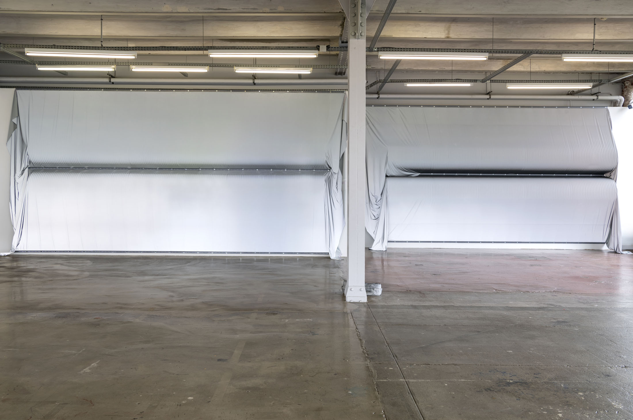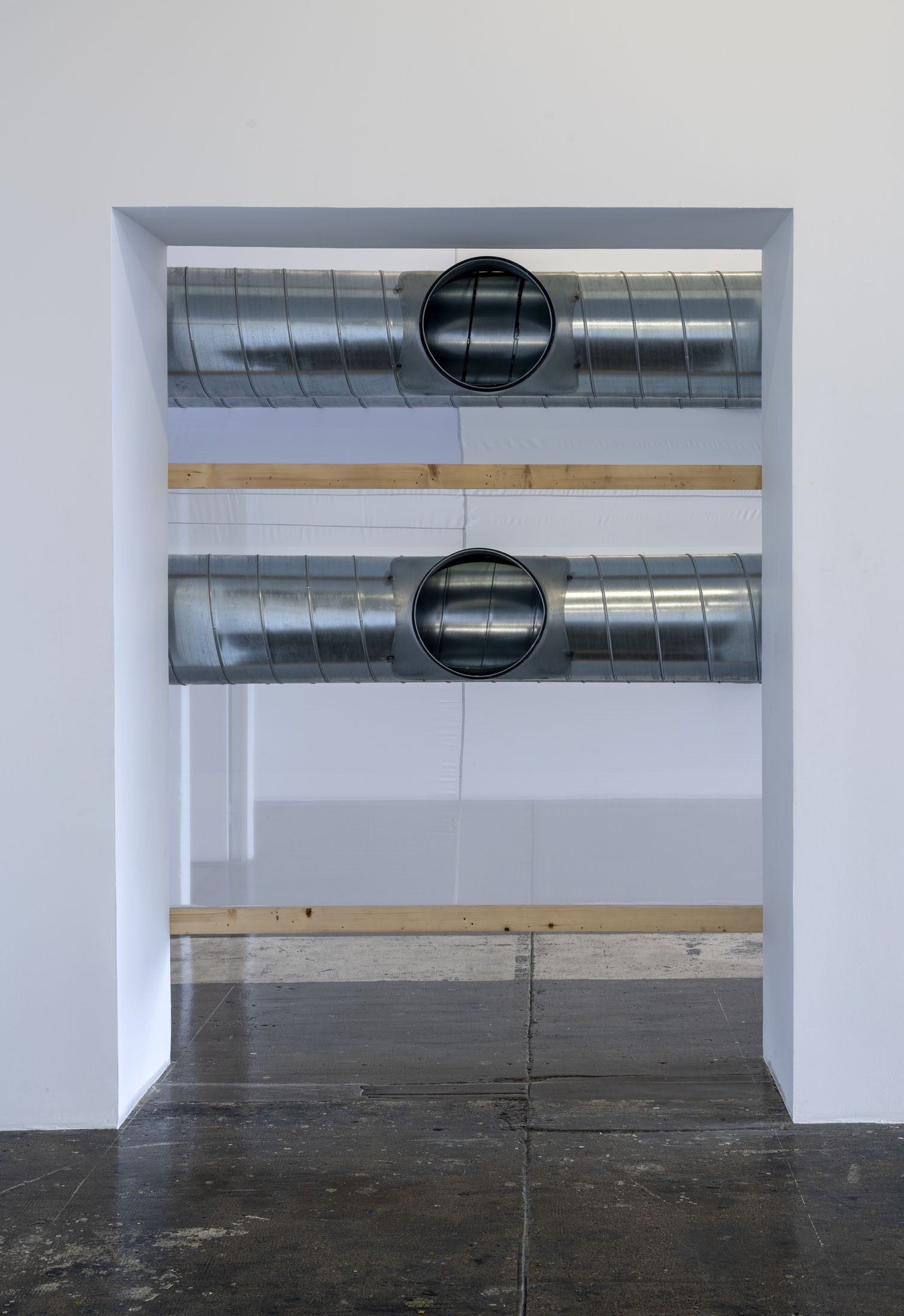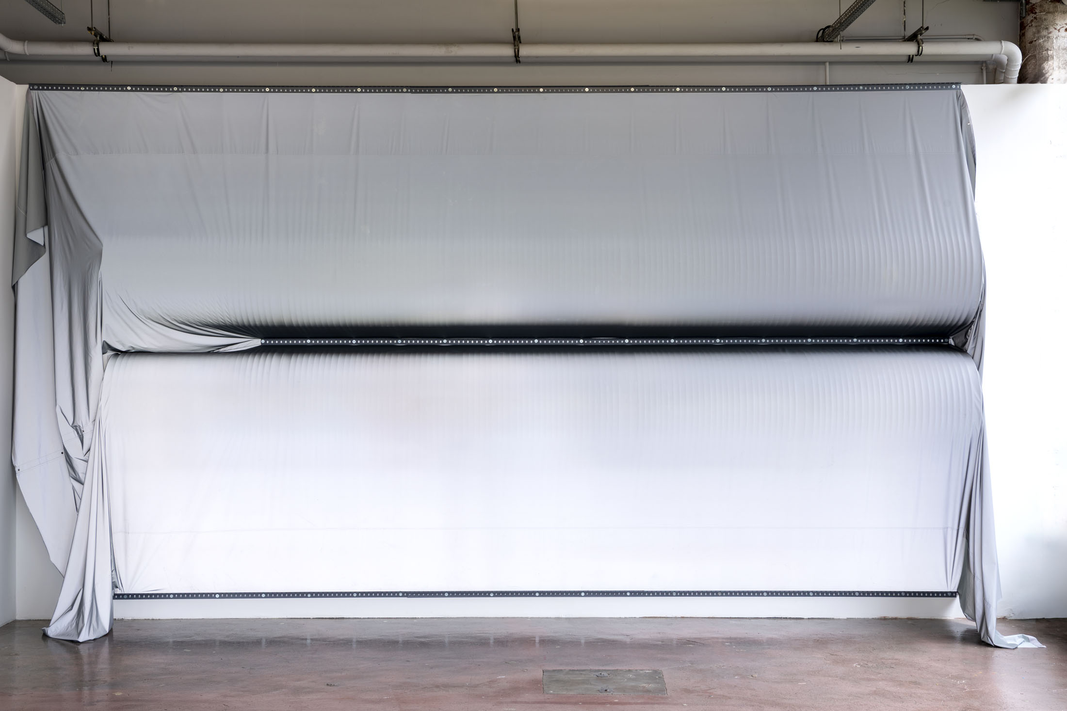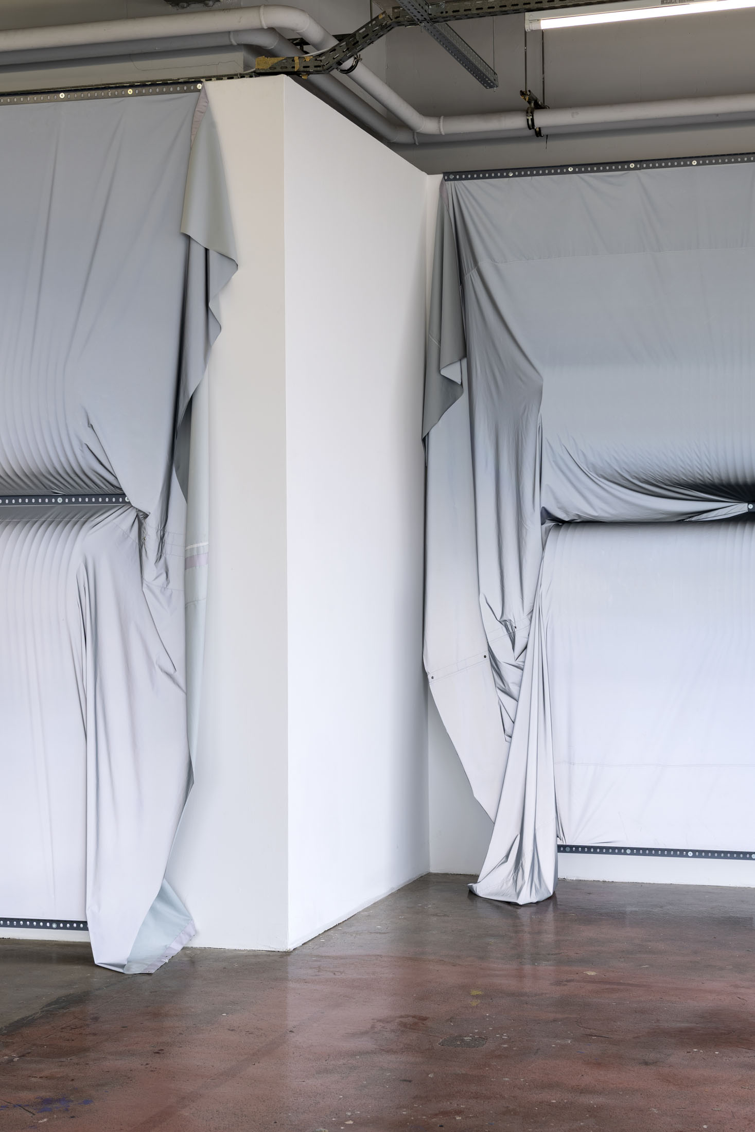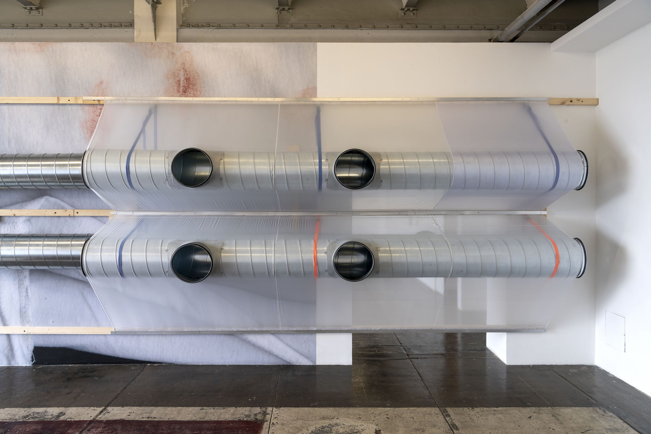 June Crespo treats printed objects as sculptural and architectural materials that she places in dialogue with the exhibition space, taken not as a constraint but as a partner to the work. The installation Rose trraction is comprised of a large-format, high-definition print of a scan of one of her T-shirts covered with lipstick marks. The artist cultivates a taste for oxymorons: galvanised steel ventilation ducts are veiled with parachute fabric trimmed with lace.