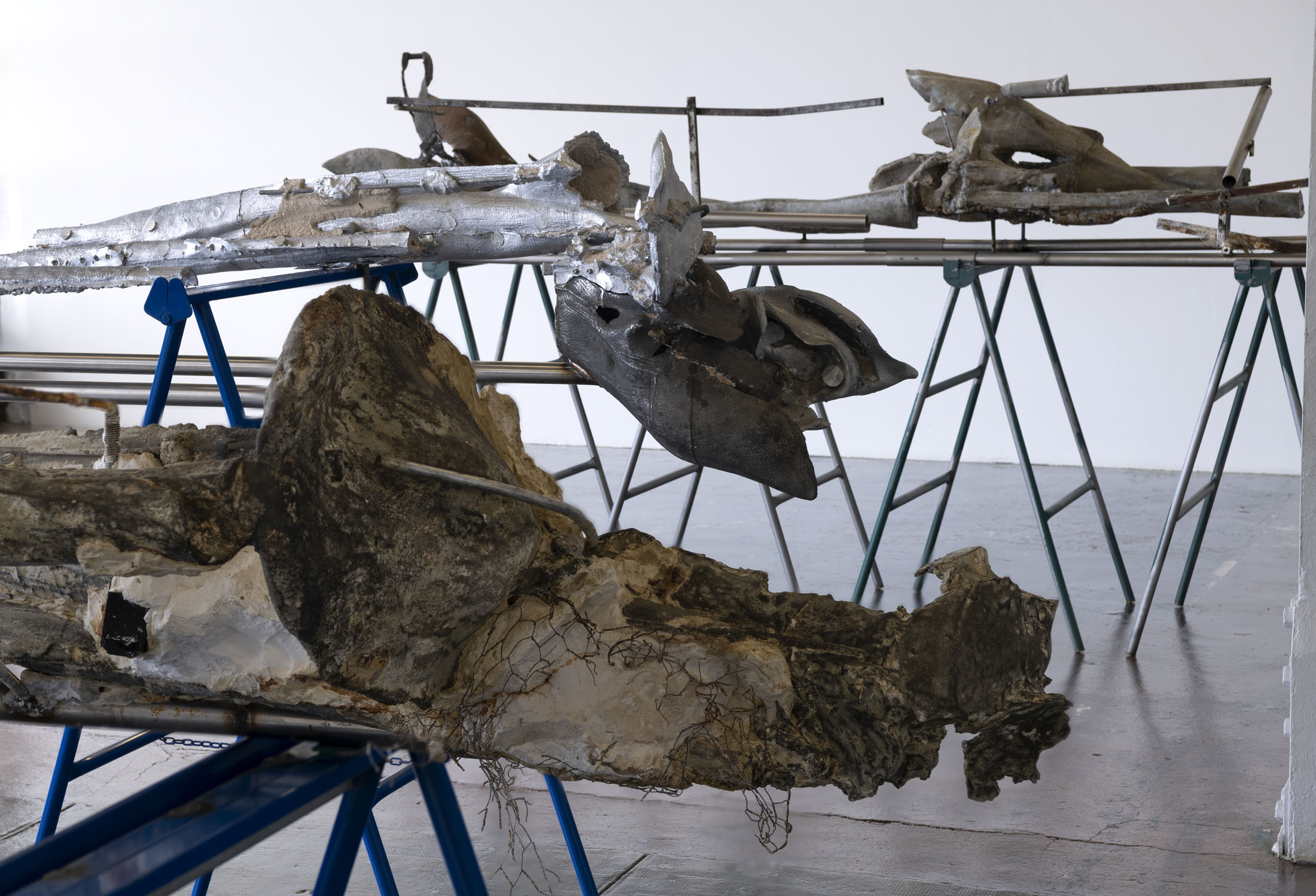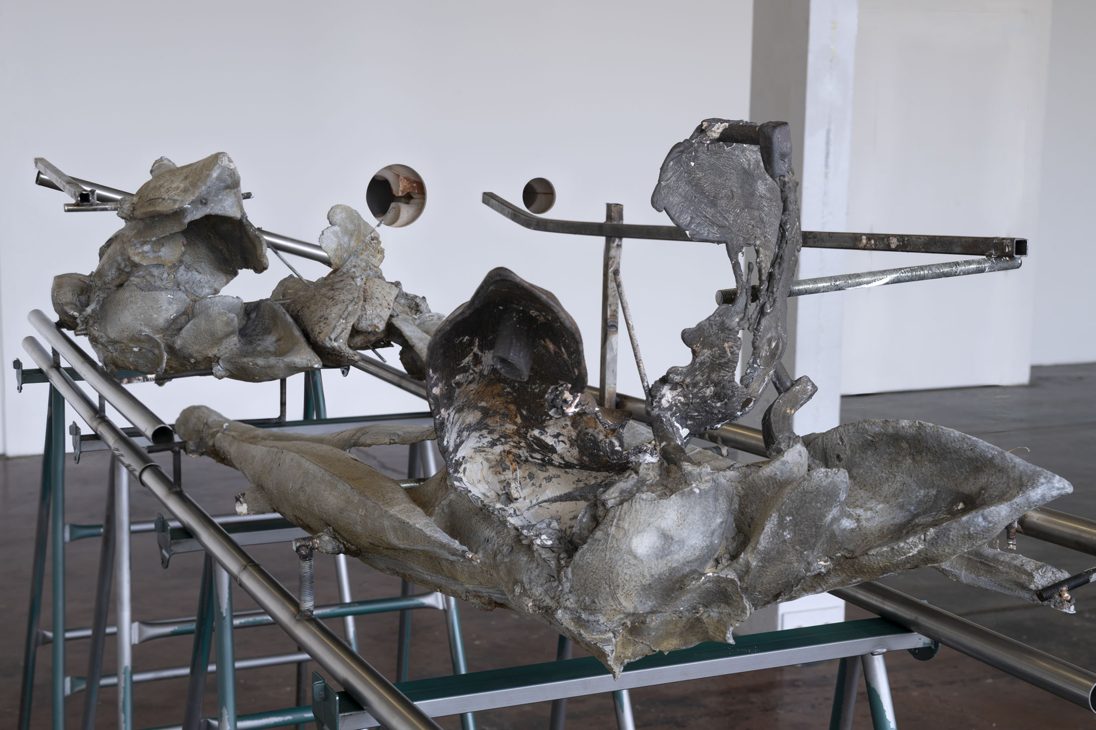 The original motif dissolves into irregularities and crevices; the forms that emerge become the channels, tubes or shells that constitute the formal vocabulary and strata of her sculptures. For Molar I and Molar II she made a cast of the pommel and padding of a riding saddle, which she melted down into stainless-steel multiples. In their superimpositions, one can discern the castings of plant stems, while the hollows sometimes shelter scraps of clothing.