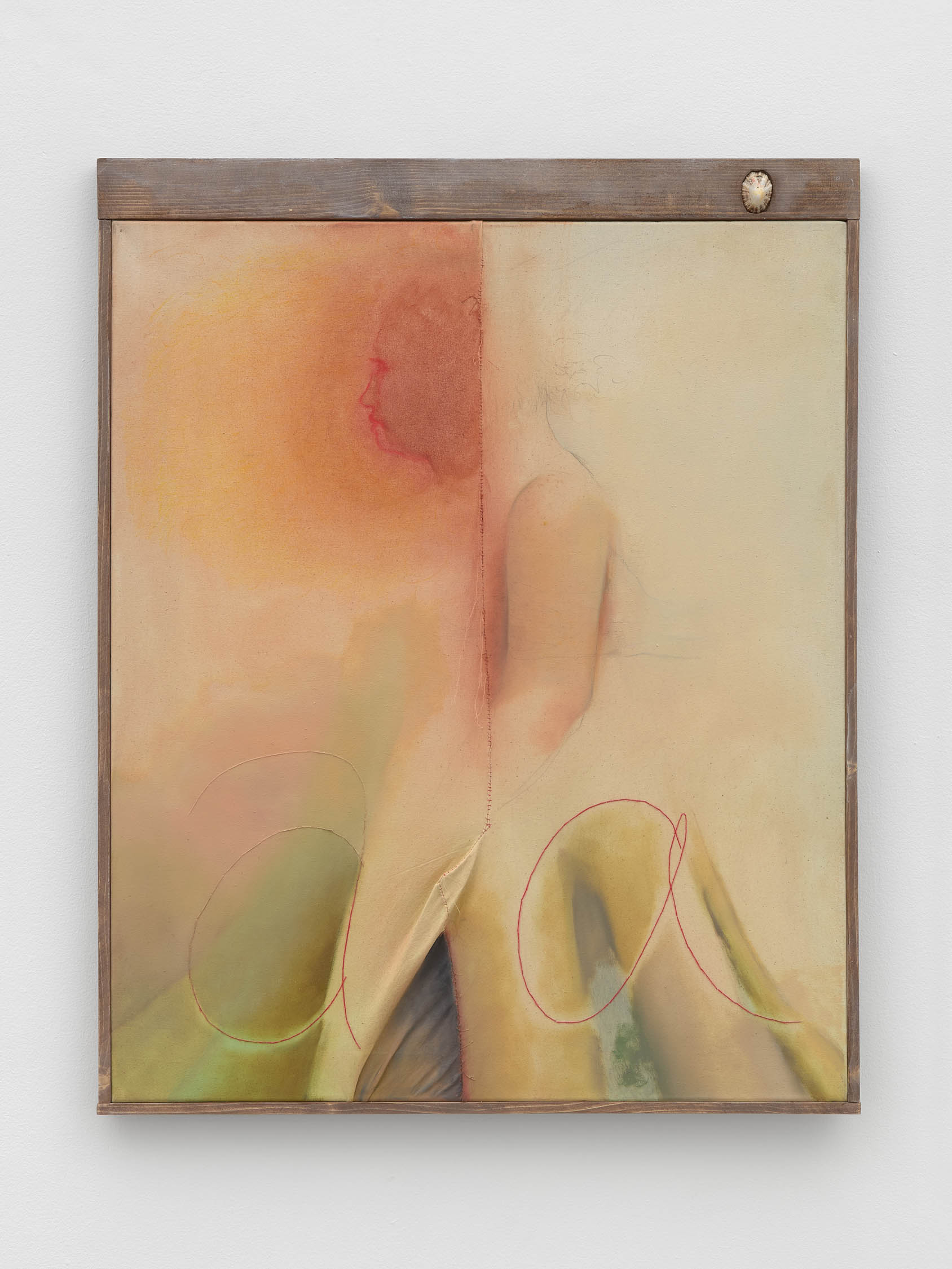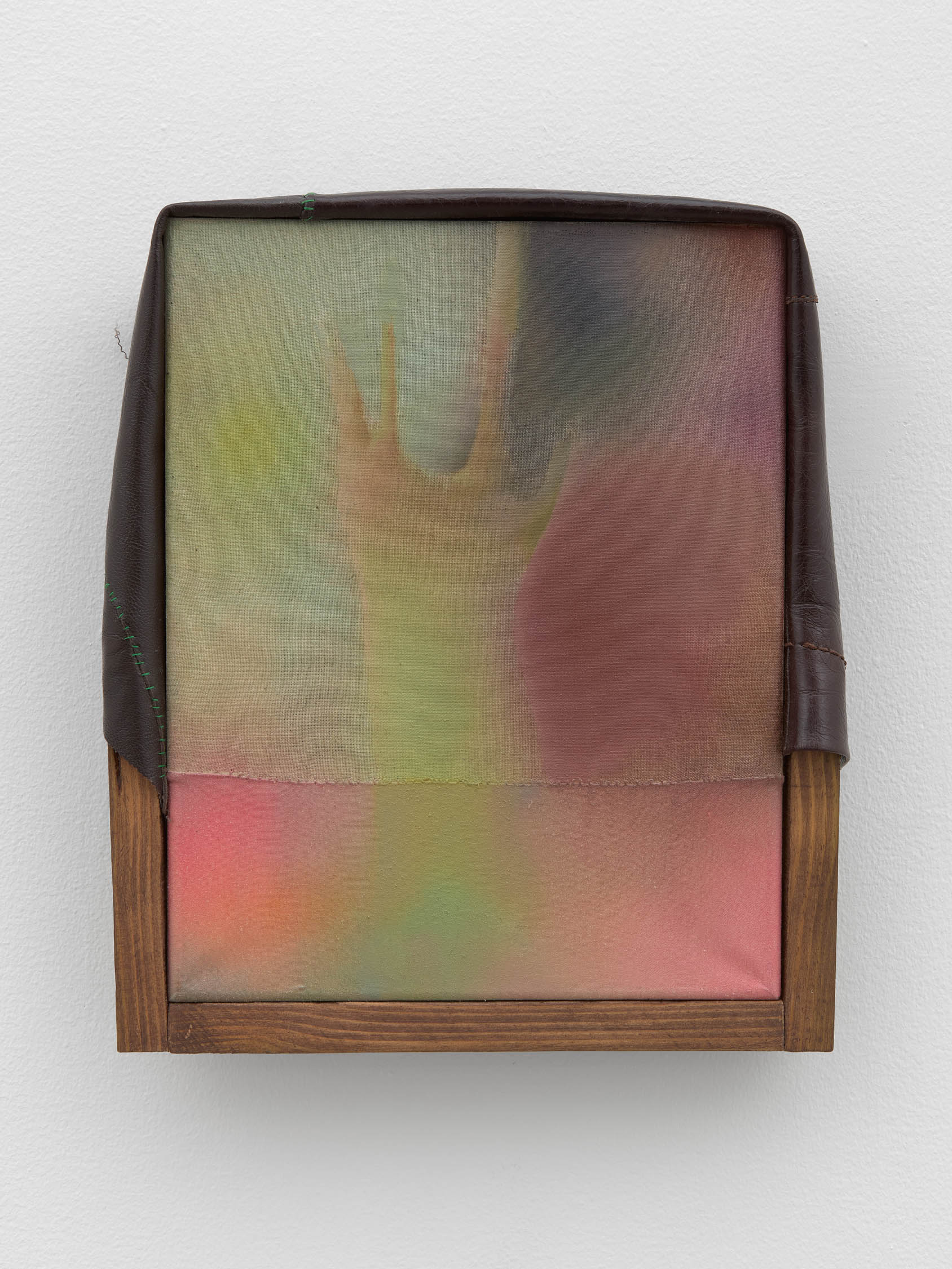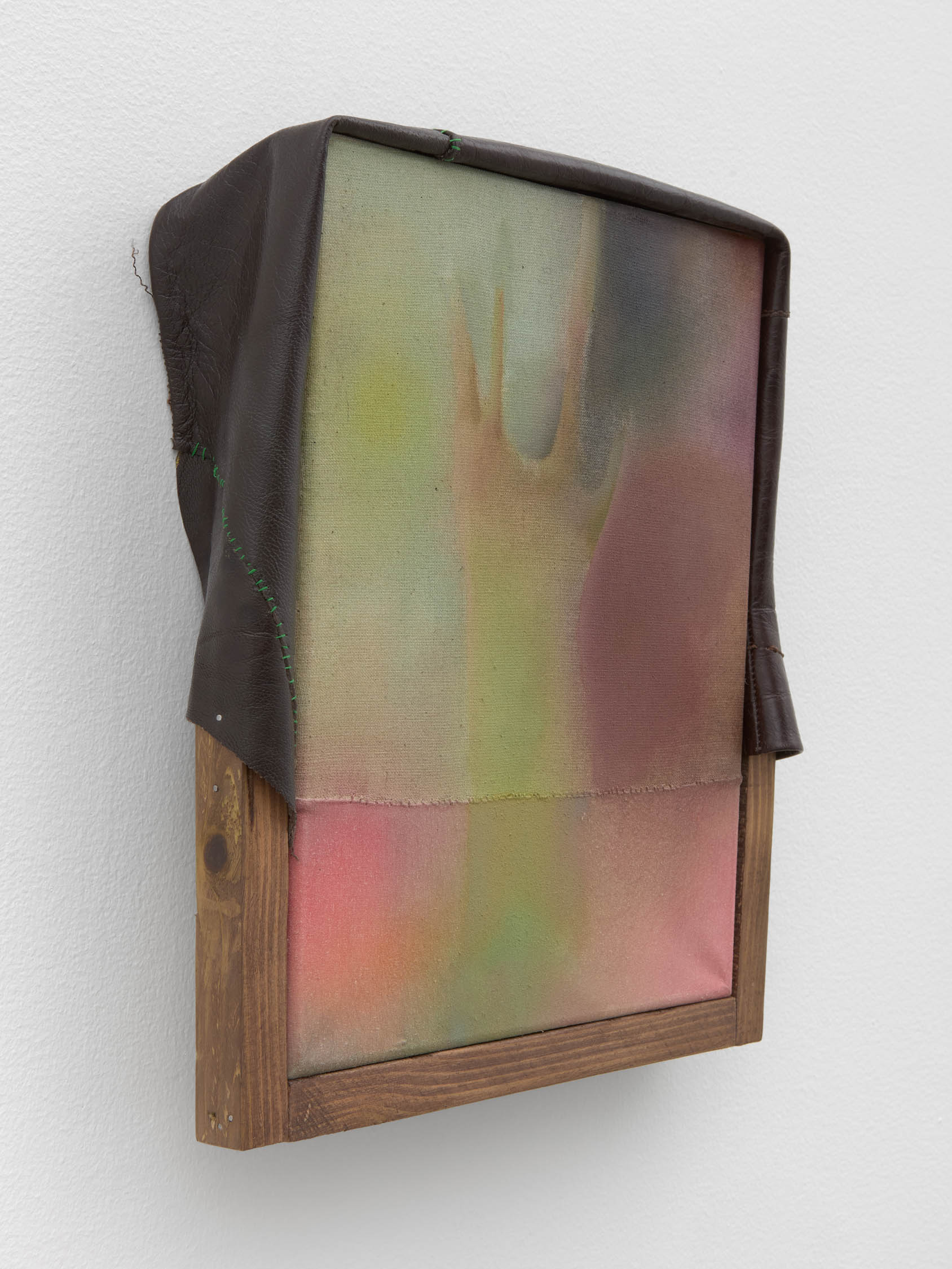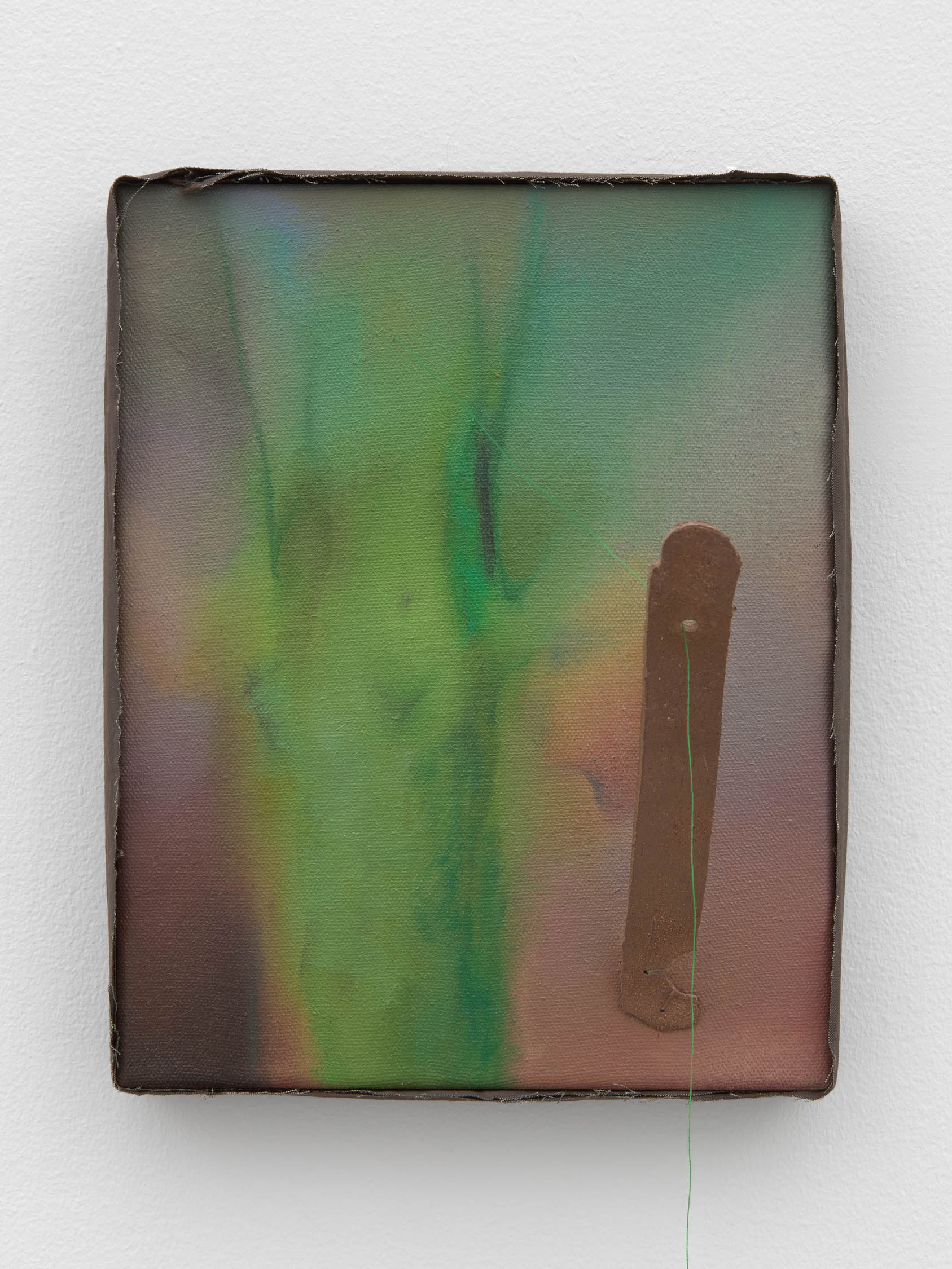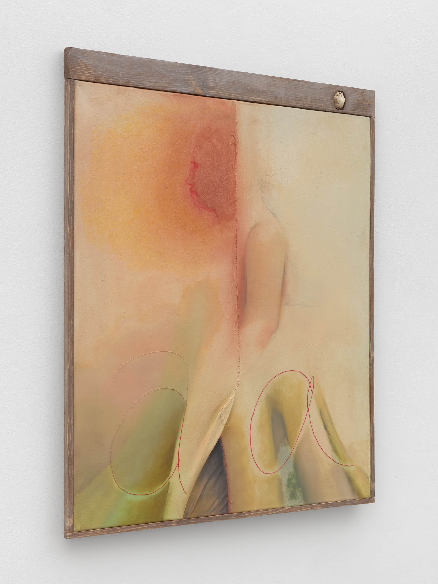 The soft sound of the double ‘s’ follows the hard bracket of the ‘c,’ itself contained within the echoing form of the parentheses. Hooked forwards, the curved spine of the punctuation mark is supple and shy. Sibilance flows outward from the central digraph of the word, cosset, which is a title, a location, and a limit. Cool and wet, the paintings leak, and meaning passes from image to object to text—the symbol in migration. Fabric applied to the top of a frame mops up the excesses of feeling, like a soggy sock on the bathroom floor.