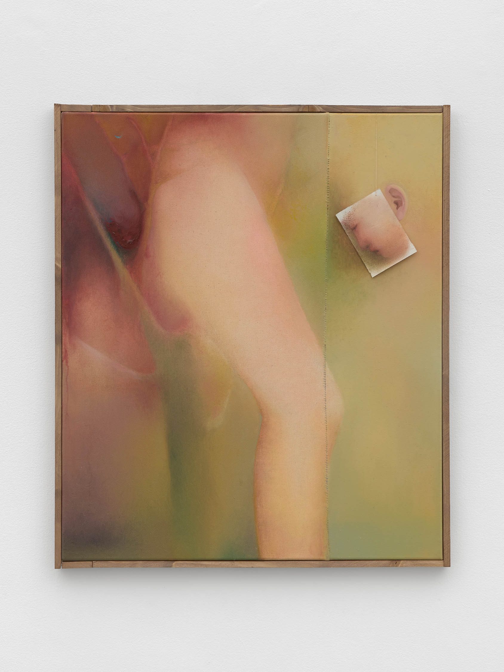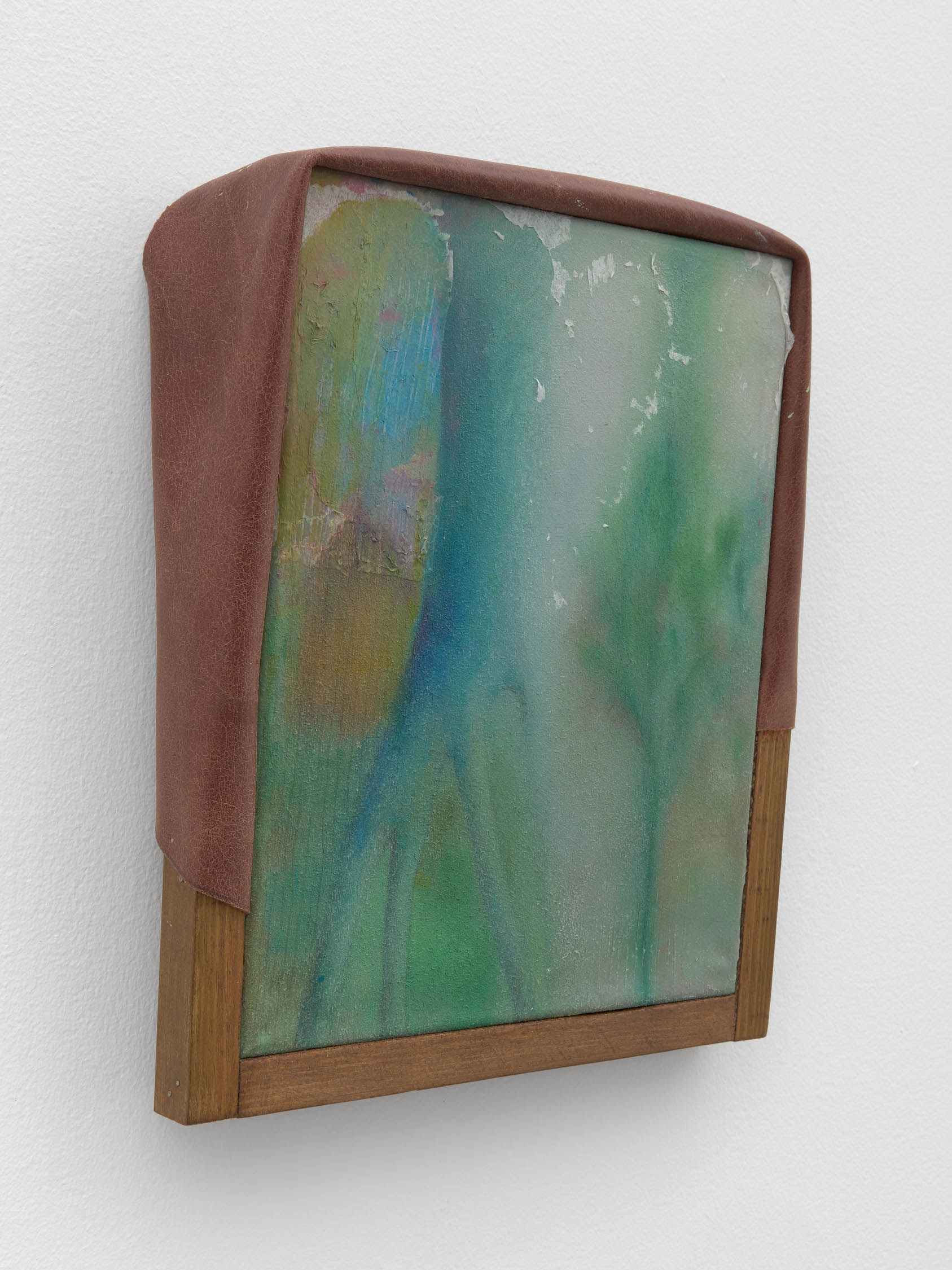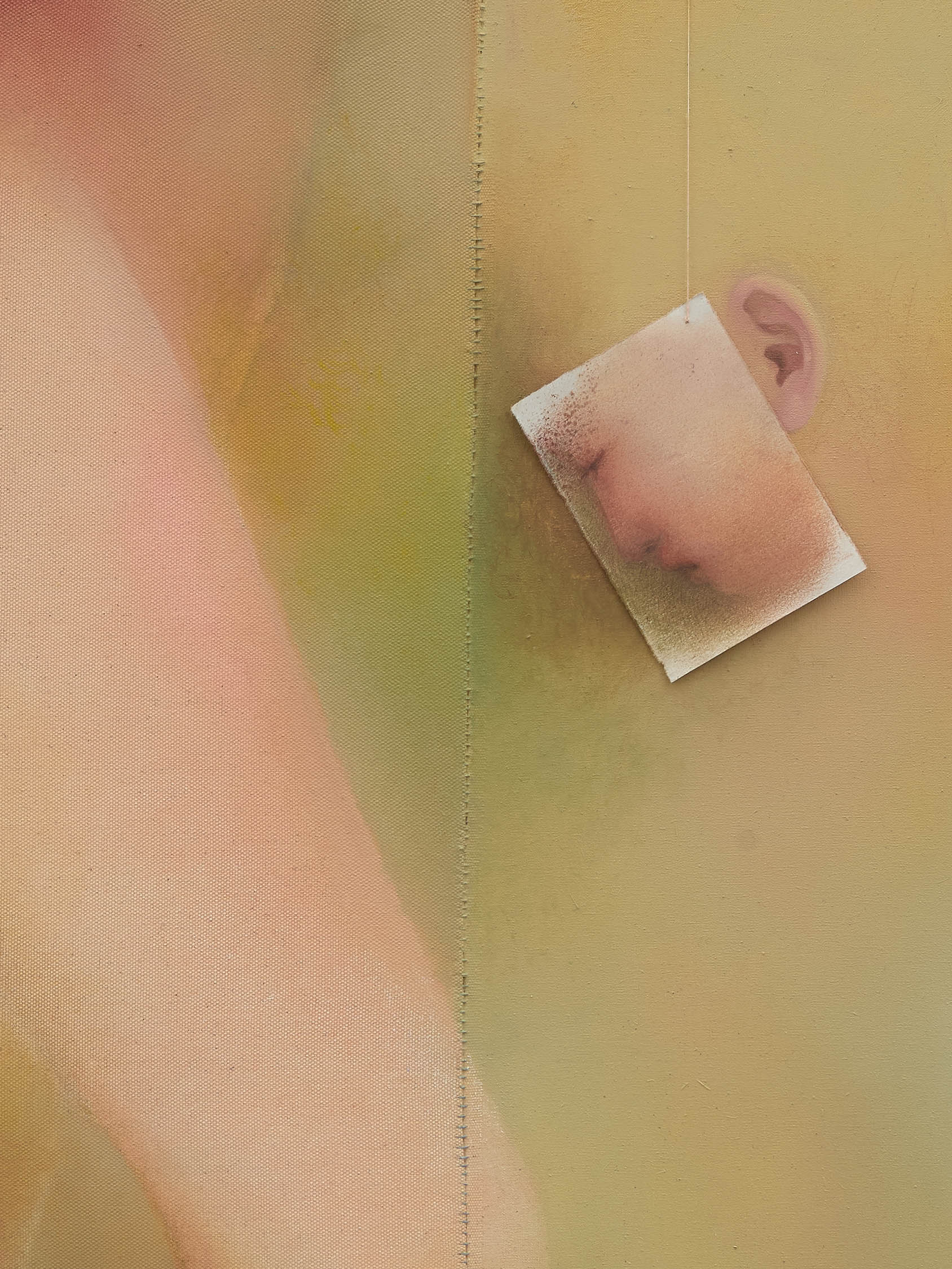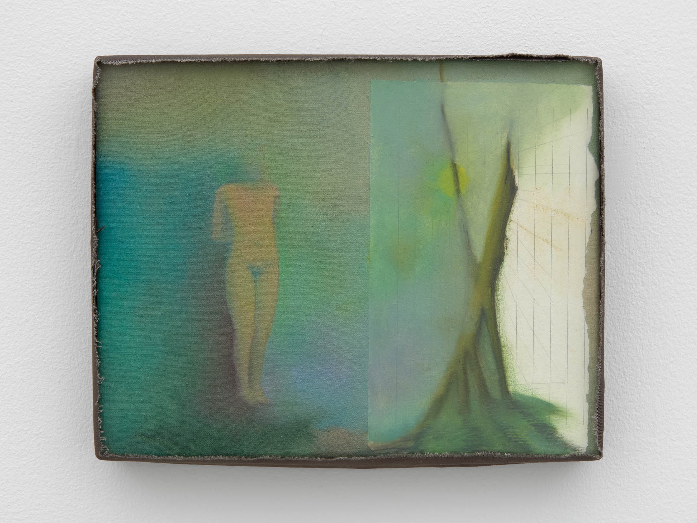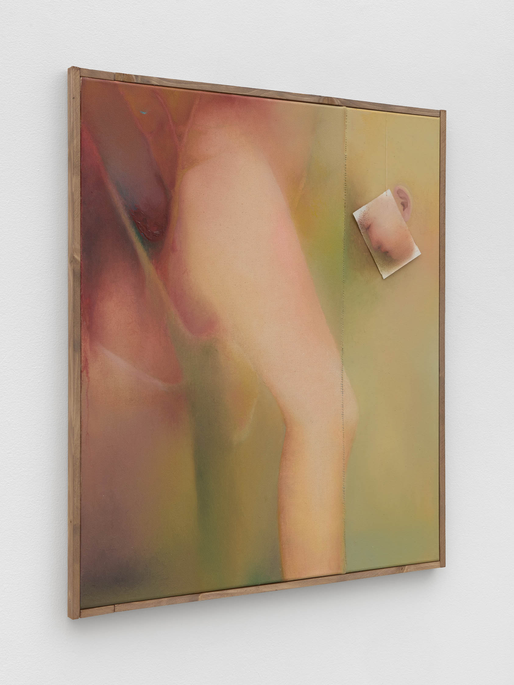 The soft sound of the double ‘s’ follows the hard bracket of the ‘c,’ itself contained within the echoing form of the parentheses. Hooked forwards, the curved spine of the punctuation mark is supple and shy. Sibilance flows outward from the central digraph of the word, cosset, which is a title, a location, and a limit. Cool and wet, the paintings leak, and meaning passes from image to object to text—the symbol in migration. Fabric applied to the top of a frame mops up the excesses of feeling, like a soggy sock on the bathroom floor.