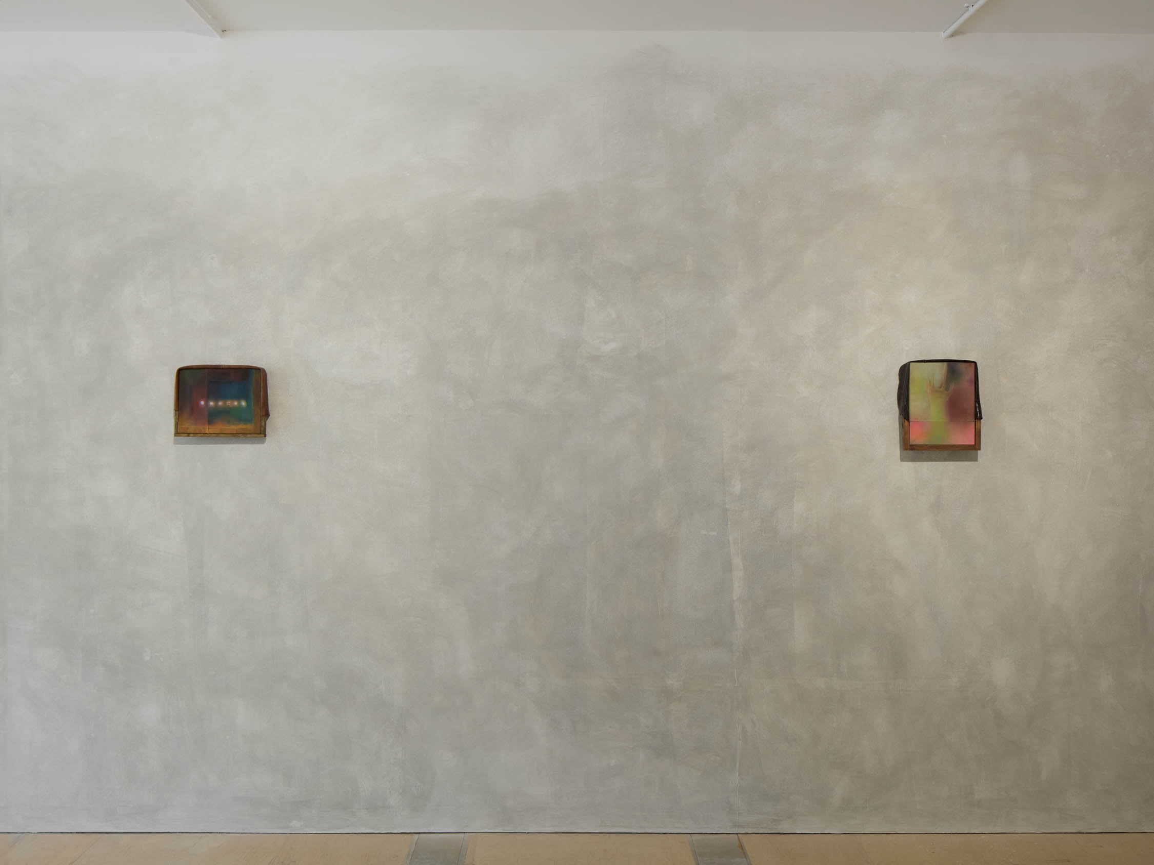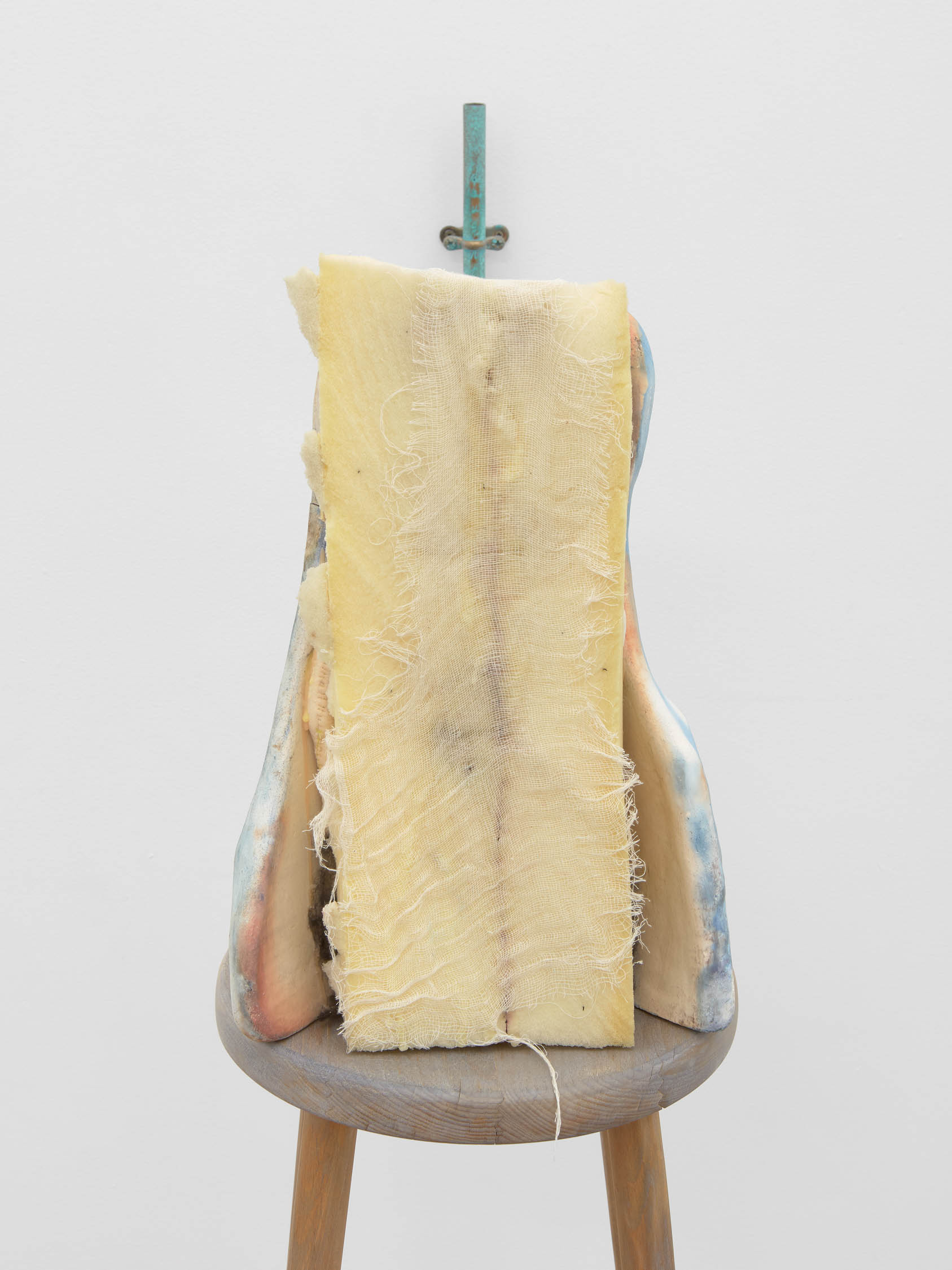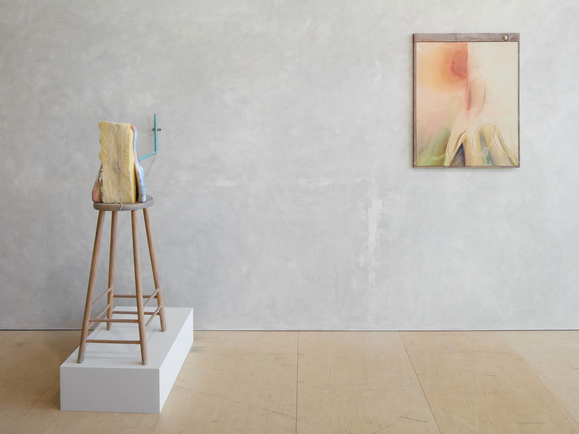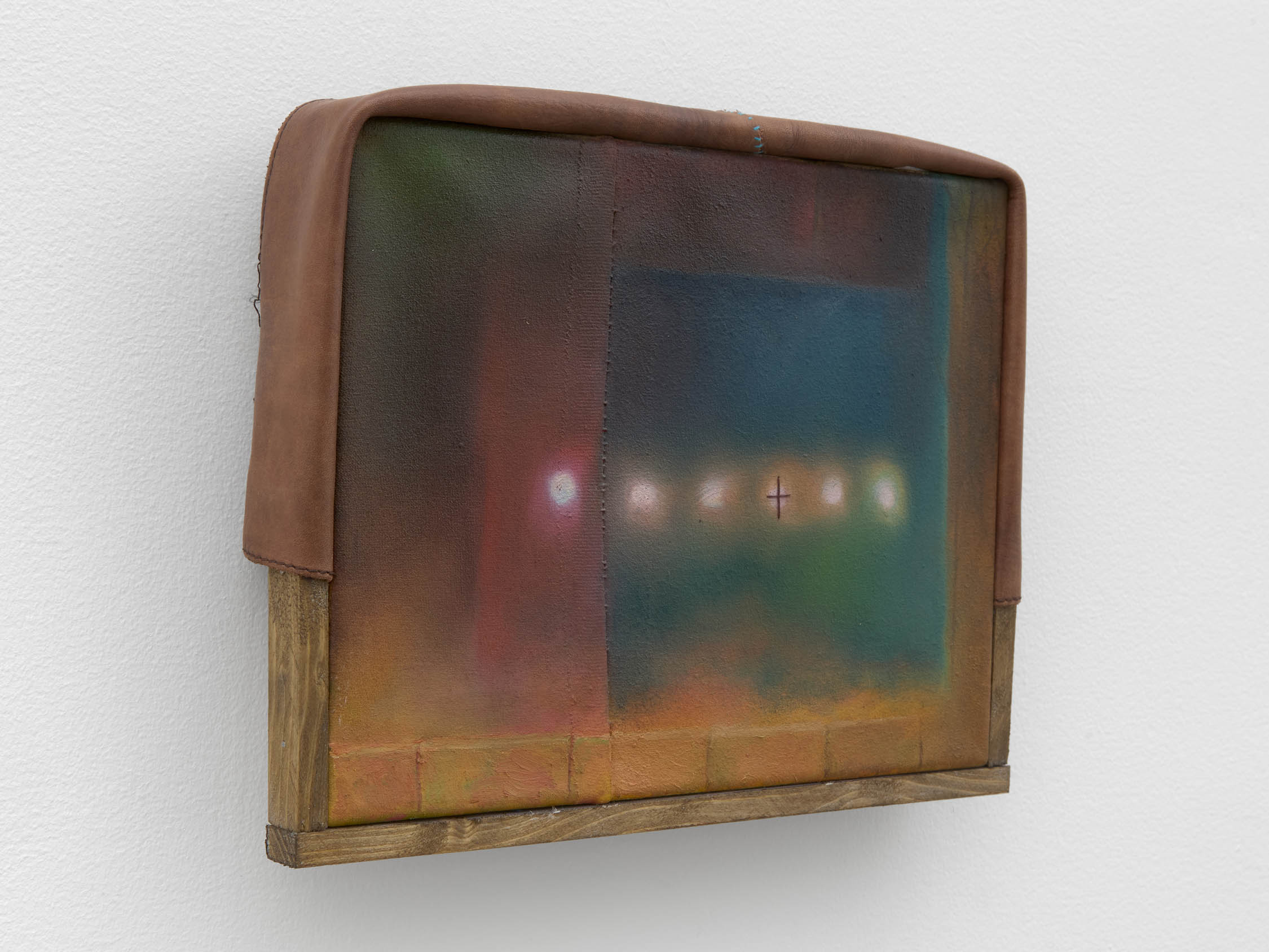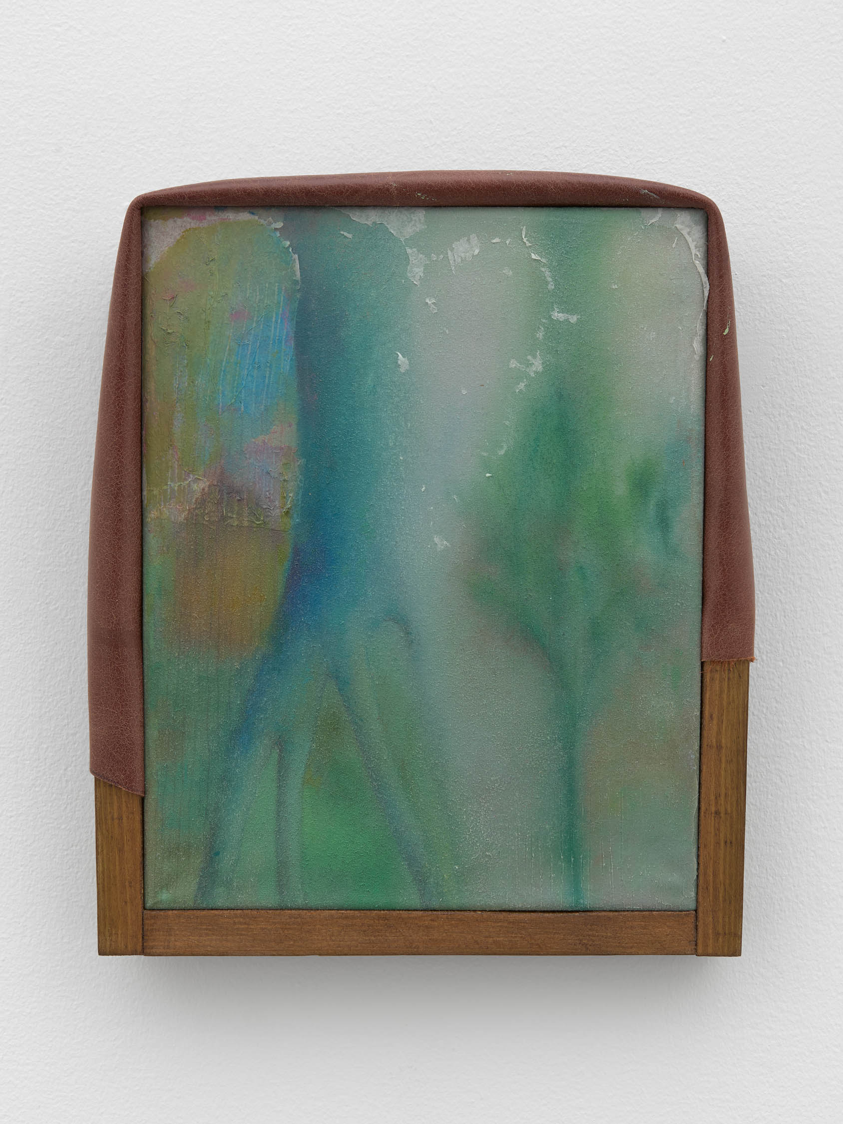 The soft sound of the double ‘s’ follows the hard bracket of the ‘c,’ itself contained within the echoing form of the parentheses. Hooked forwards, the curved spine of the punctuation mark is supple and shy. Sibilance flows outward from the central digraph of the word, cosset, which is a title, a location, and a limit. Cool and wet, the paintings leak, and meaning passes from image to object to text—the symbol in migration. Fabric applied to the top of a frame mops up the excesses of feeling, like a soggy sock on the bathroom floor.