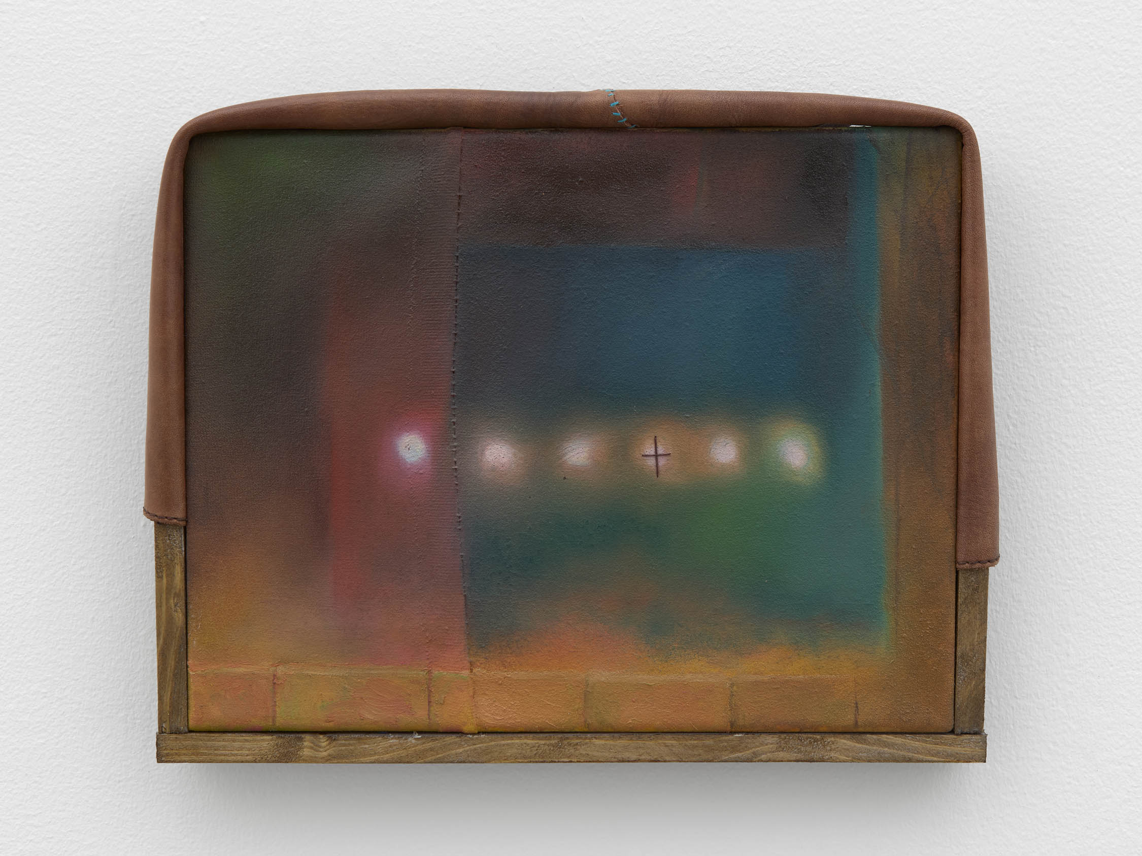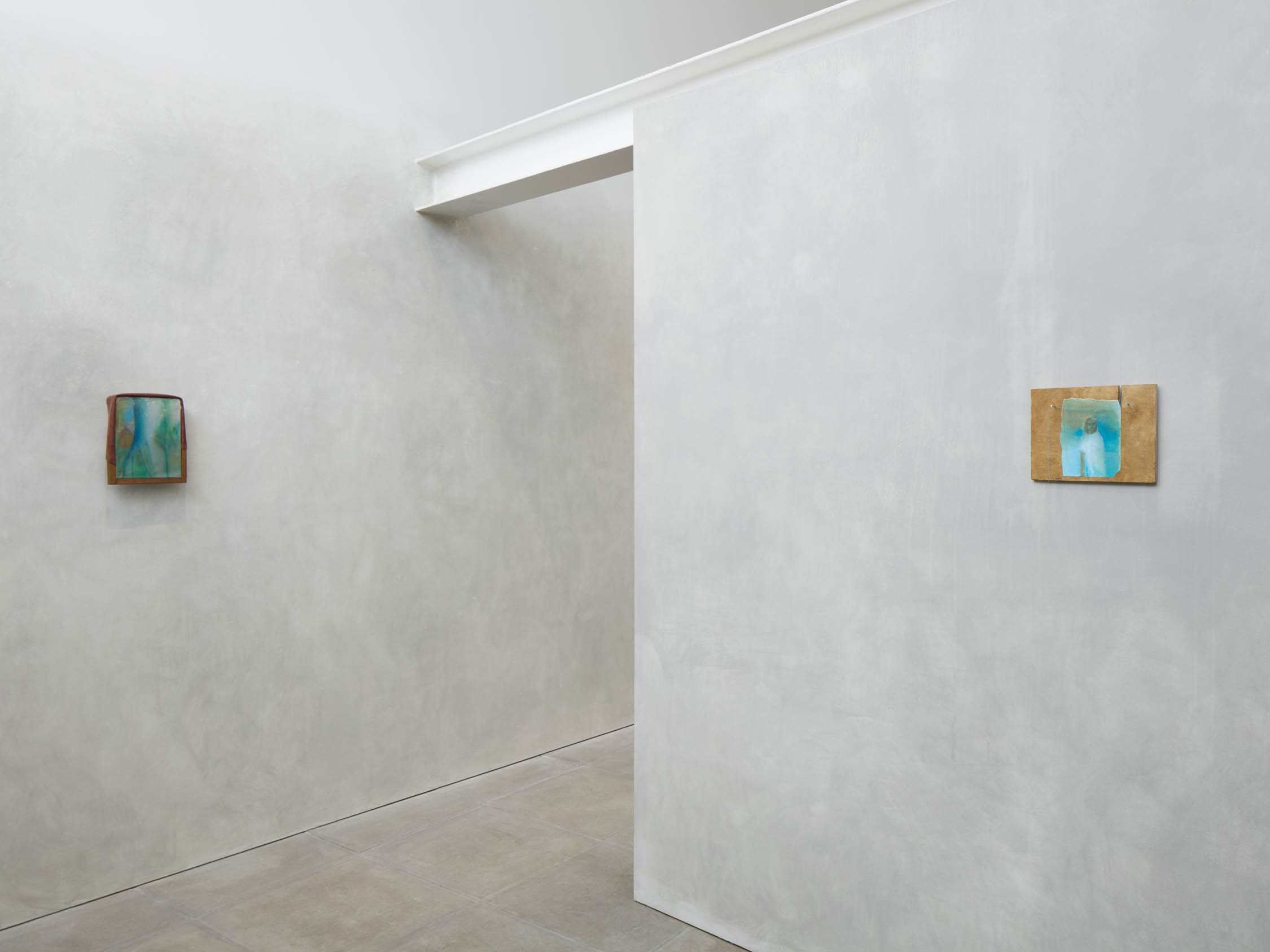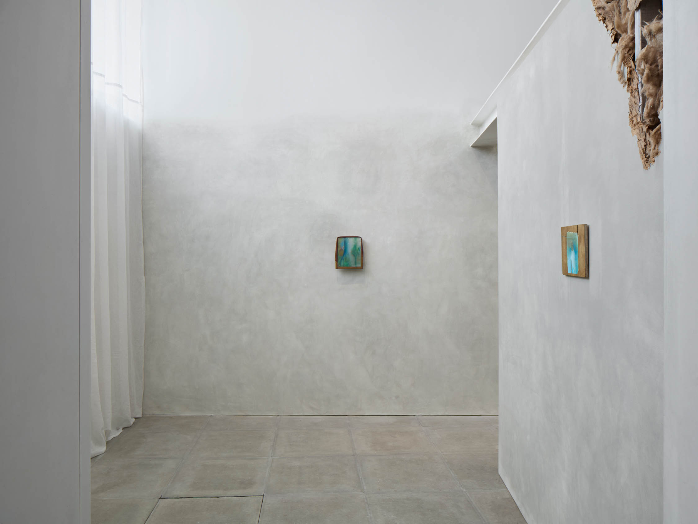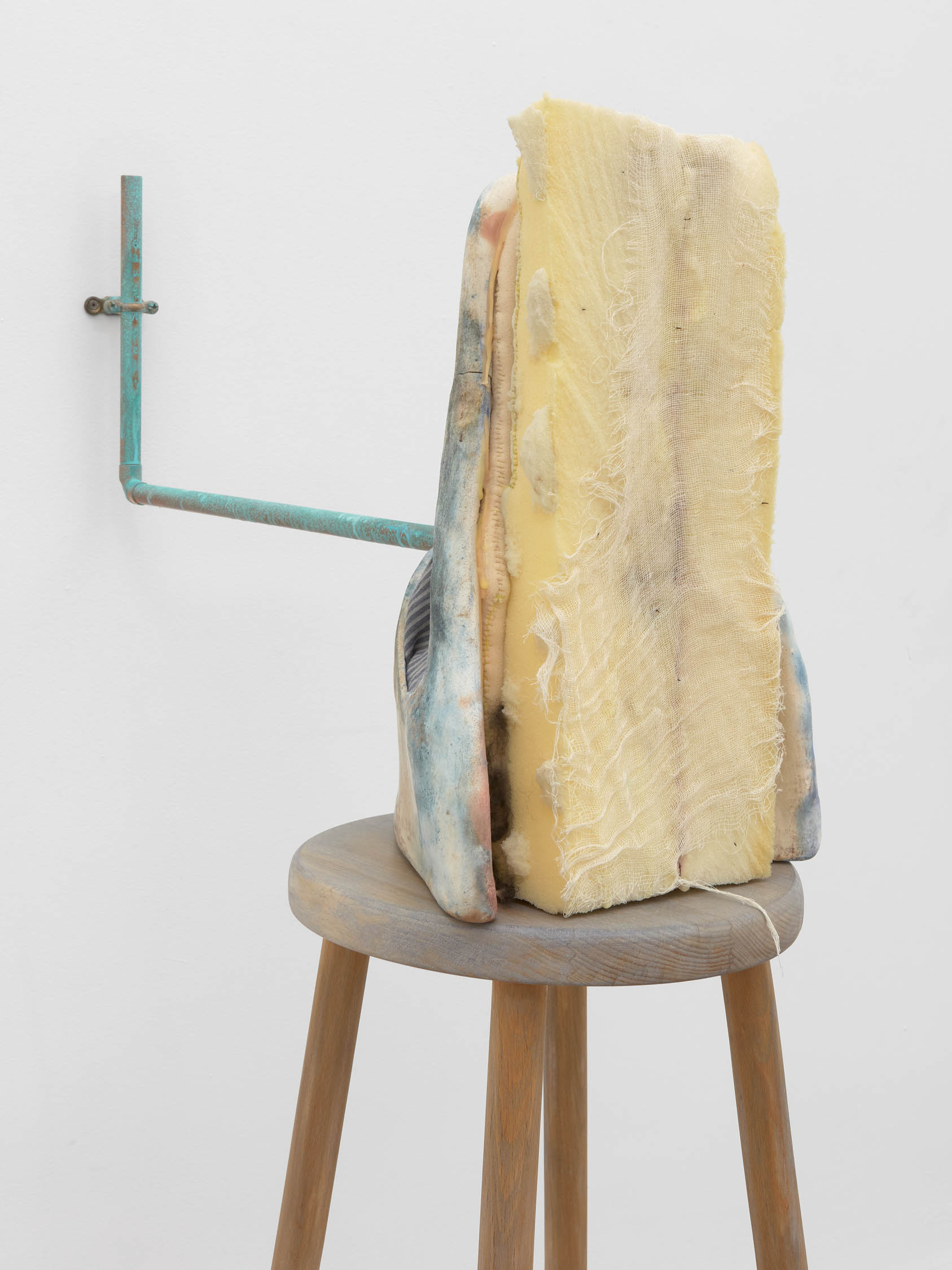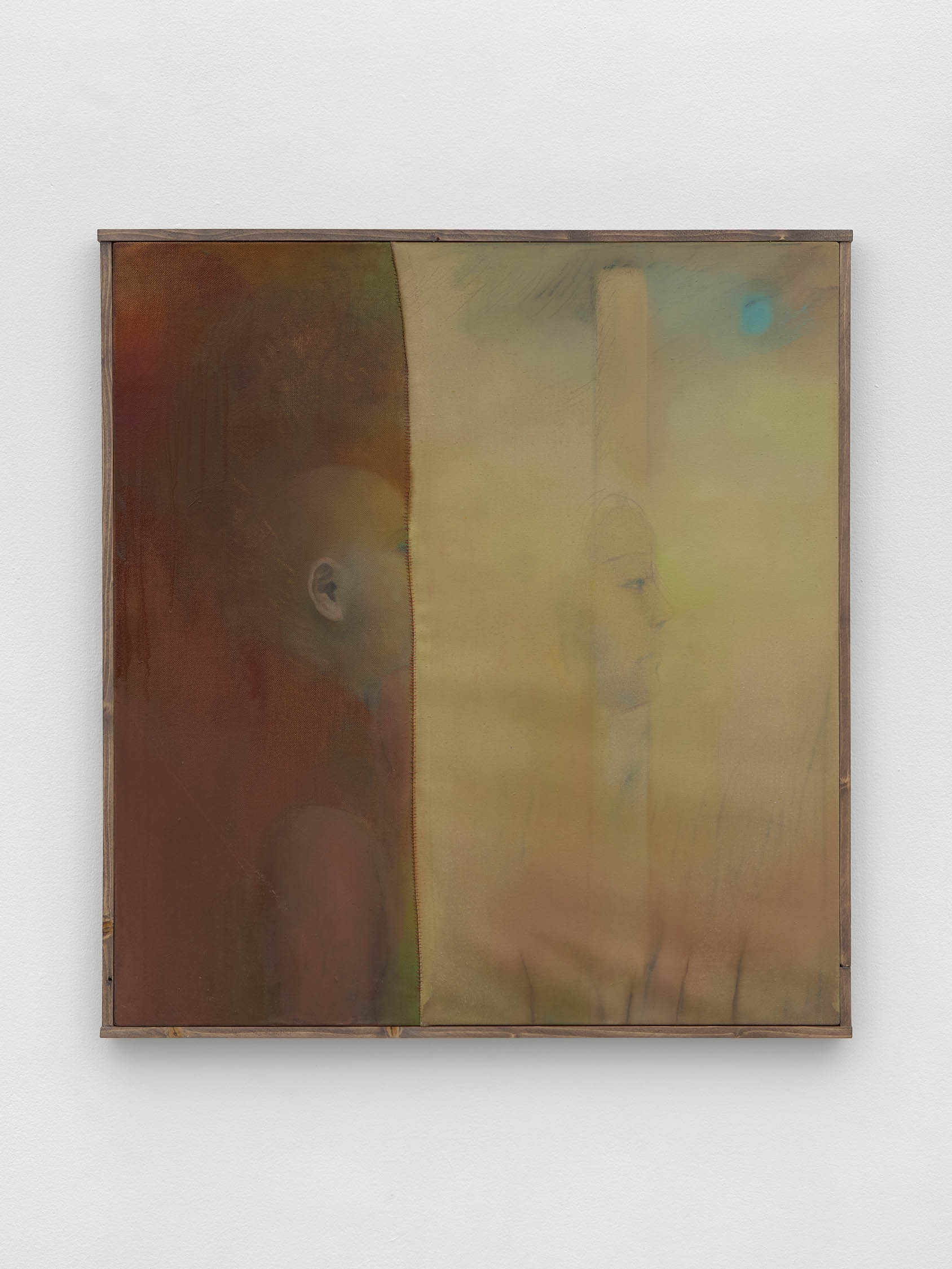 The soft sound of the double ‘s’ follows the hard bracket of the ‘c,’ itself contained within the echoing form of the parentheses. Hooked forwards, the curved spine of the punctuation mark is supple and shy. Sibilance flows outward from the central digraph of the word, cosset, which is a title, a location, and a limit. Cool and wet, the paintings leak, and meaning passes from image to object to text—the symbol in migration. Fabric applied to the top of a frame mops up the excesses of feeling, like a soggy sock on the bathroom floor.