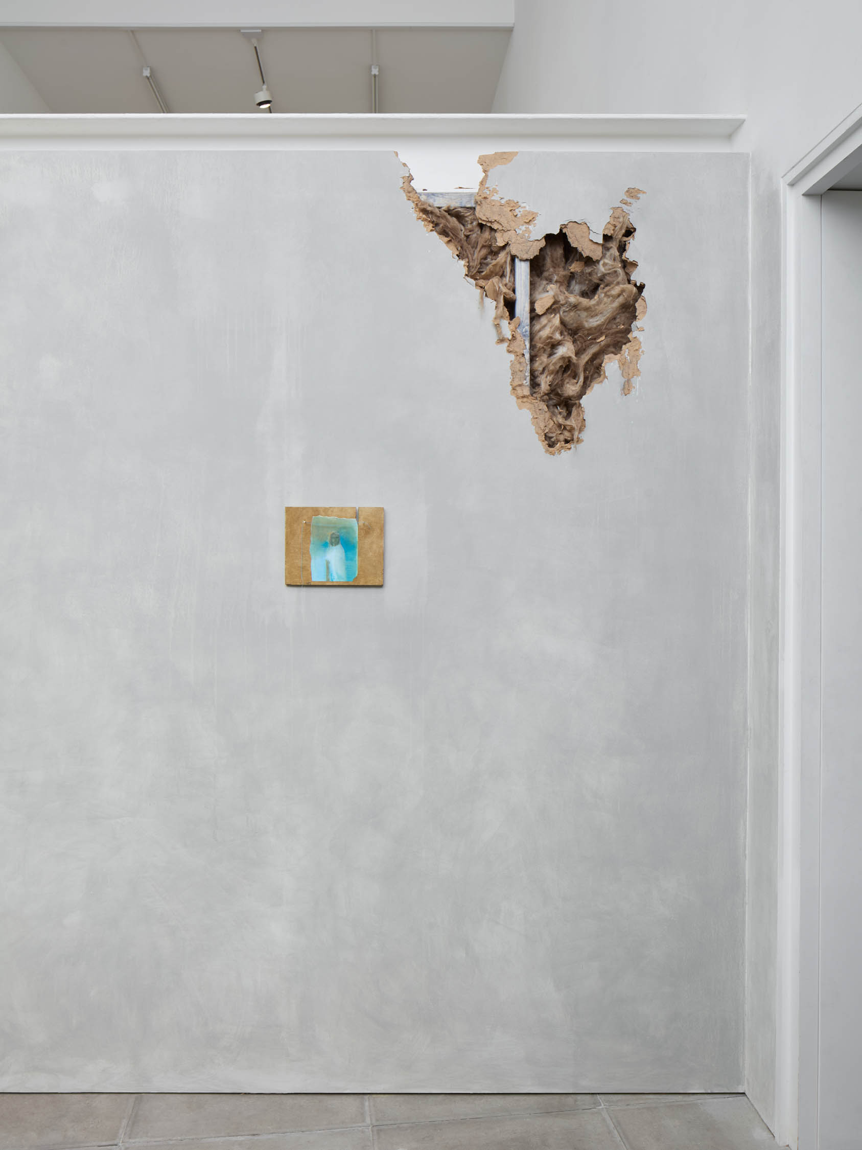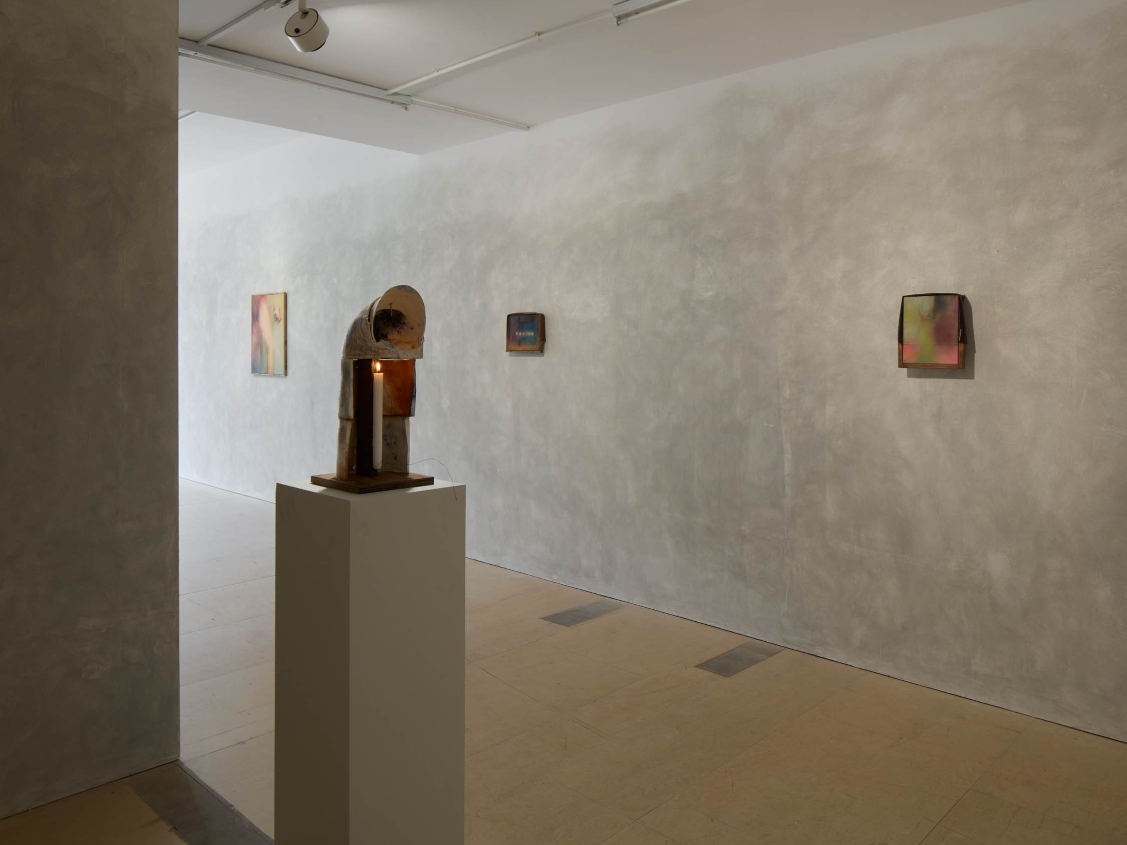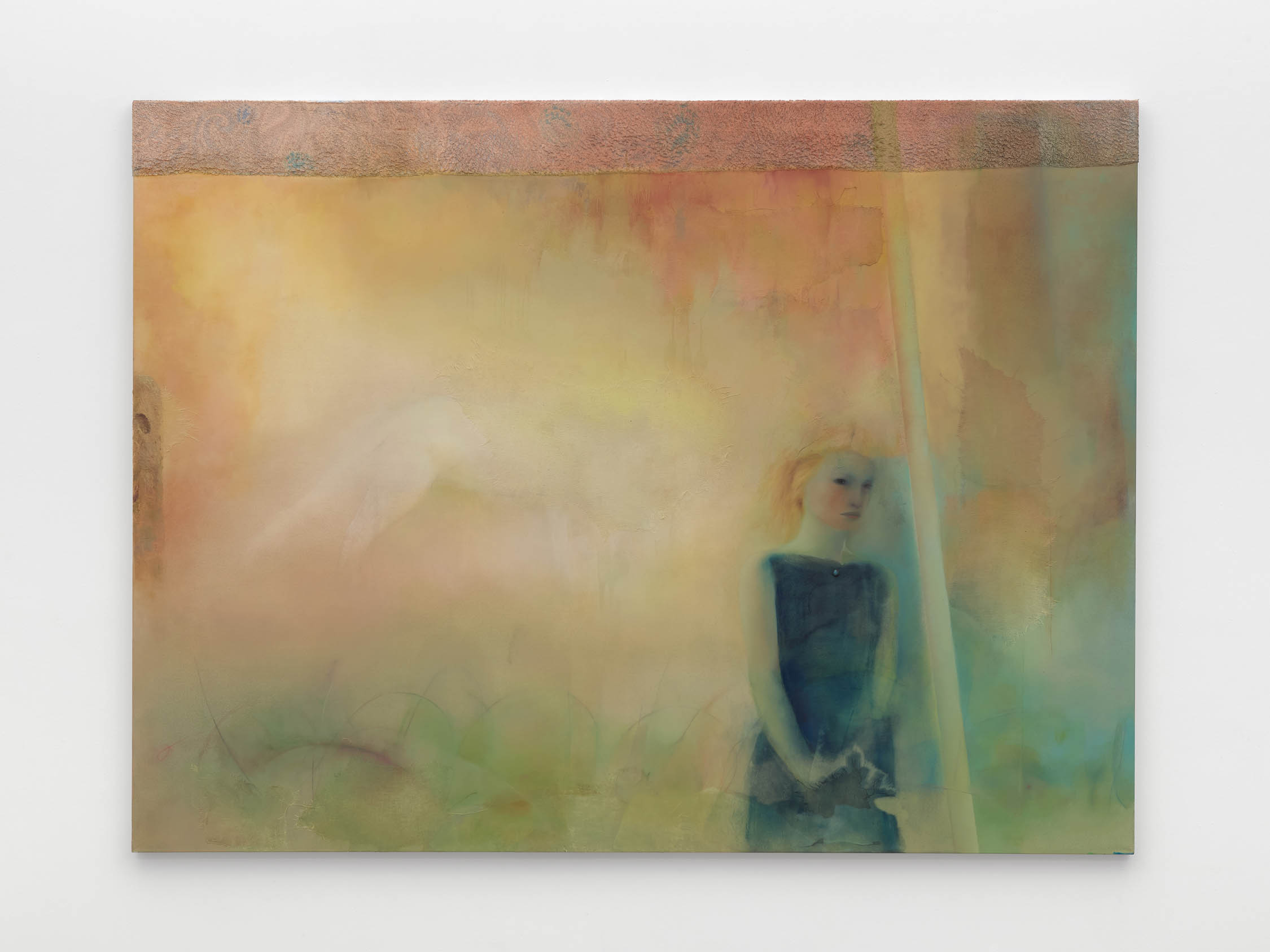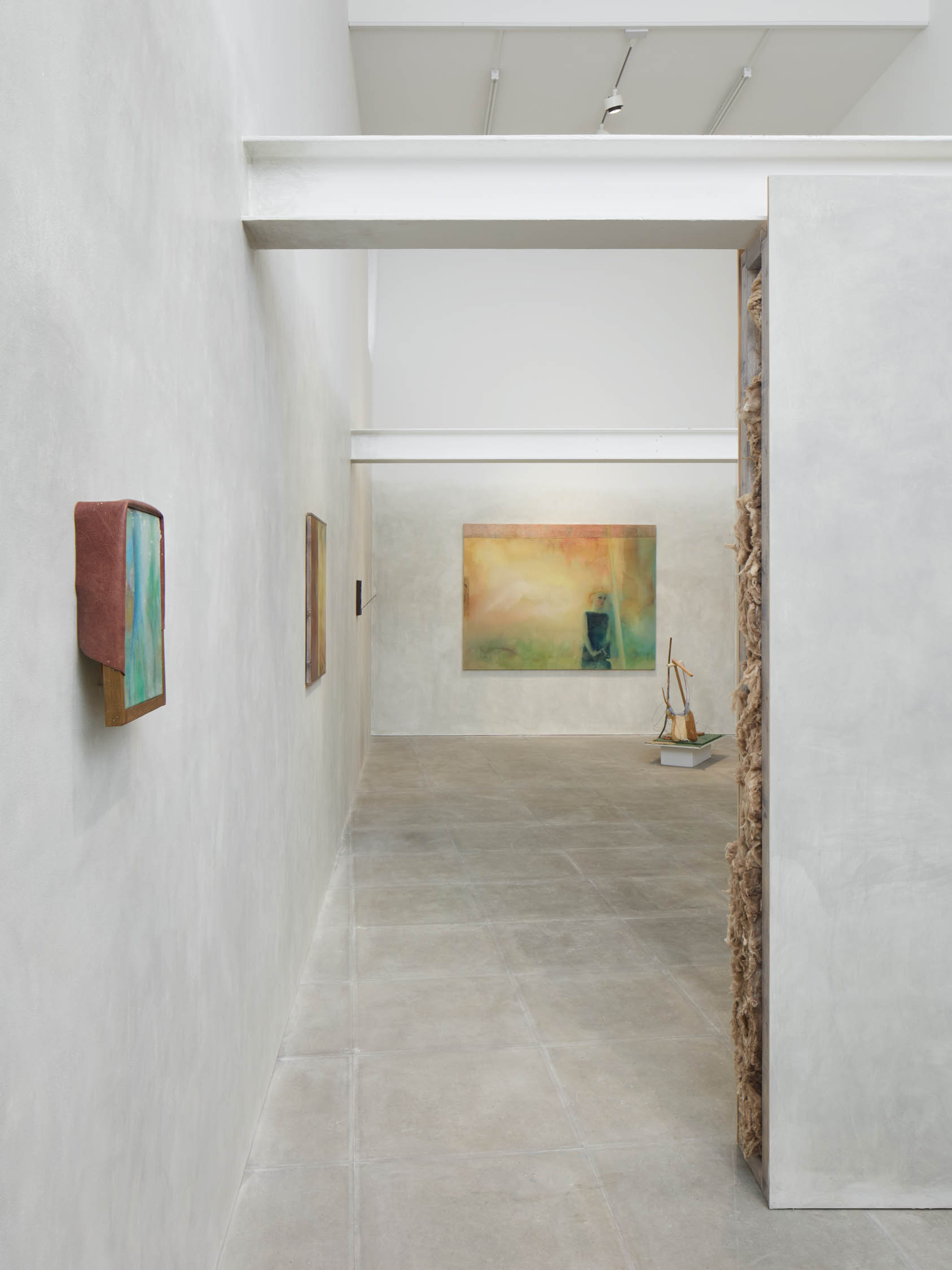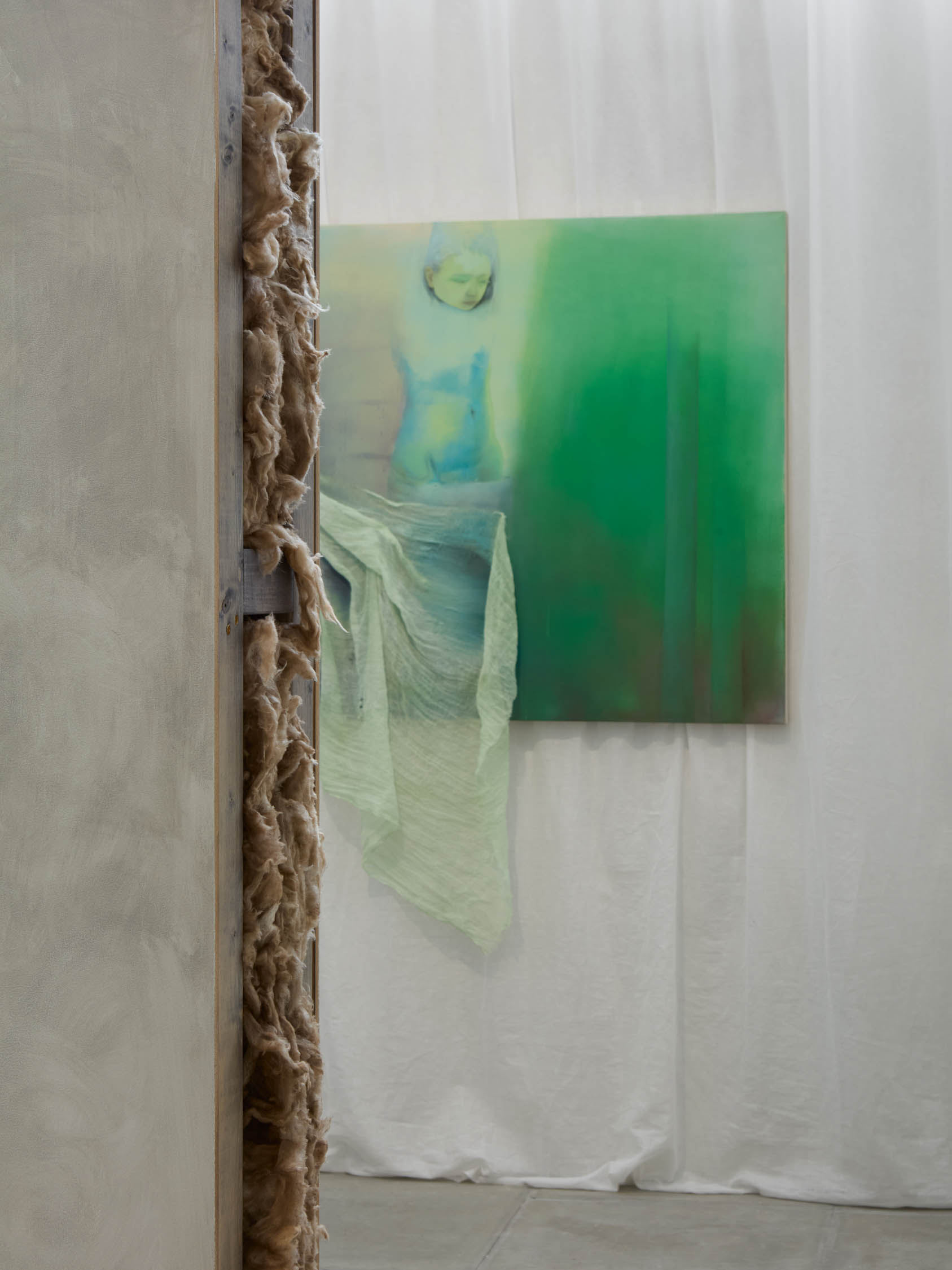 The soft sound of the double ‘s’ follows the hard bracket of the ‘c,’ itself contained within the echoing form of the parentheses. Hooked forwards, the curved spine of the punctuation mark is supple and shy. Sibilance flows outward from the central digraph of the word, cosset, which is a title, a location, and a limit. Cool and wet, the paintings leak, and meaning passes from image to object to text—the symbol in migration. Fabric applied to the top of a frame mops up the excesses of feeling, like a soggy sock on the bathroom floor.