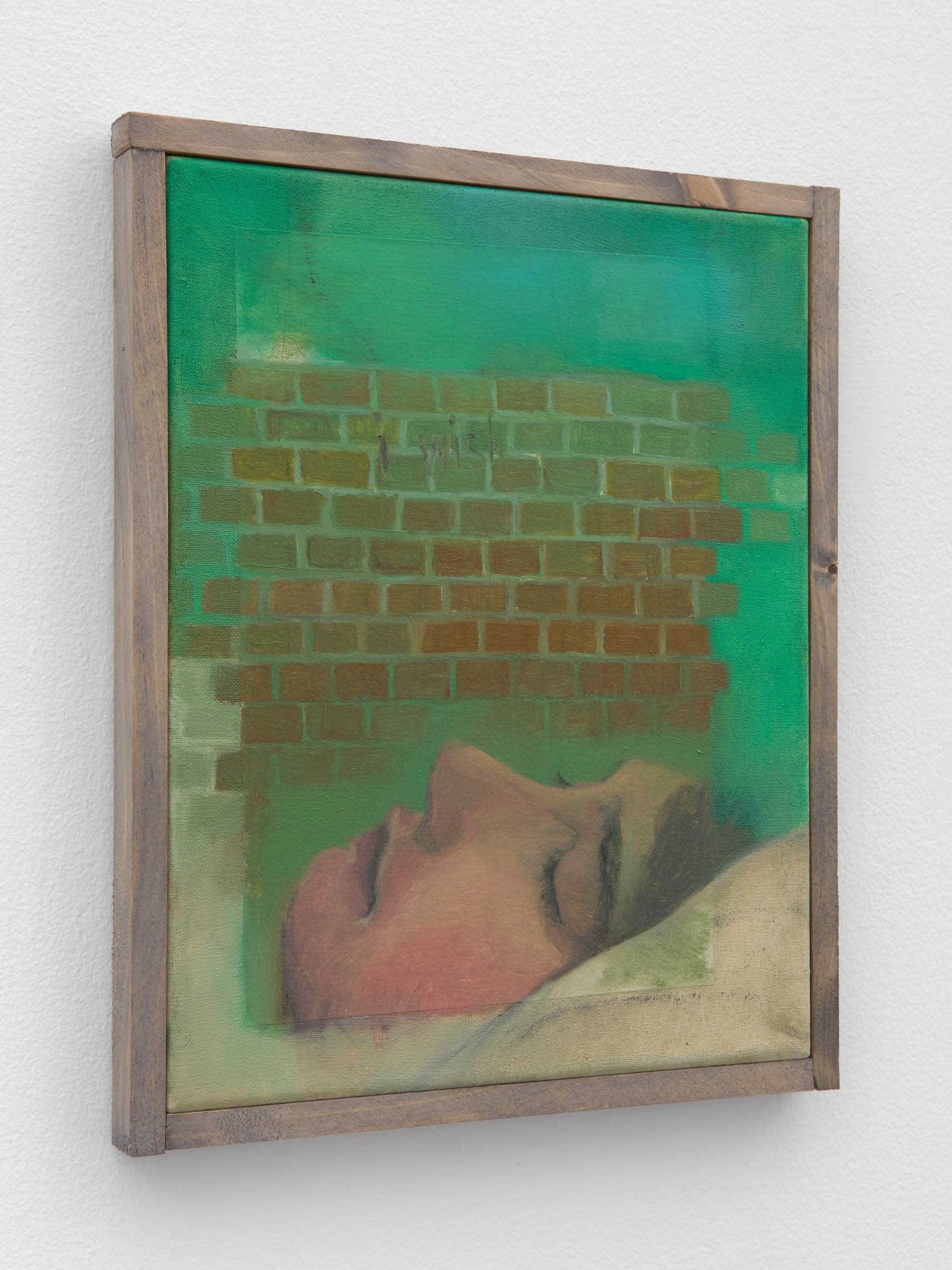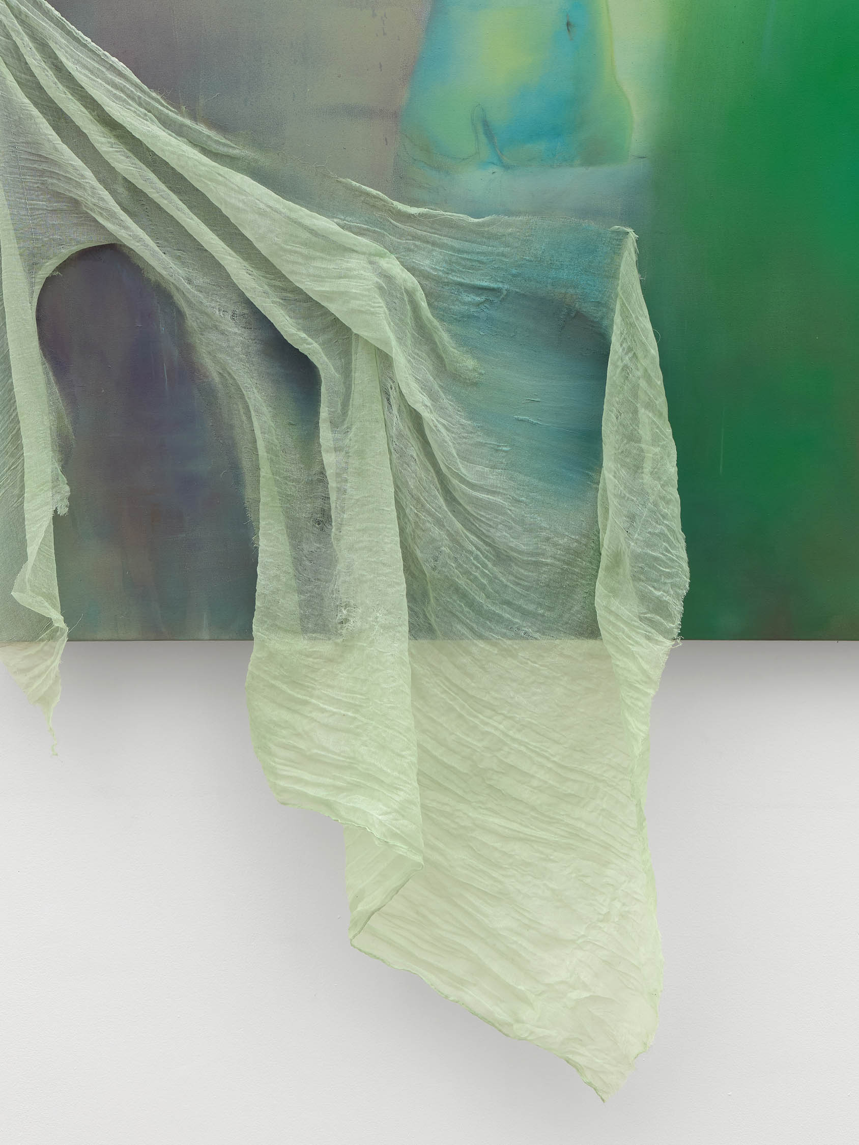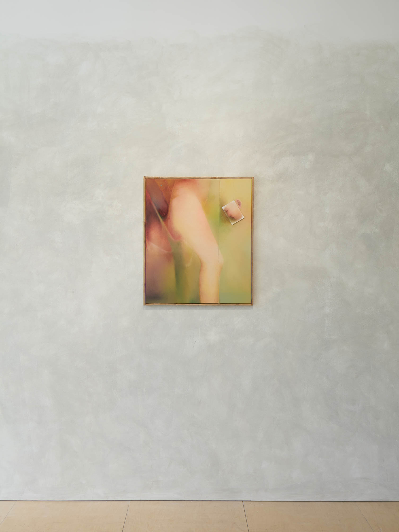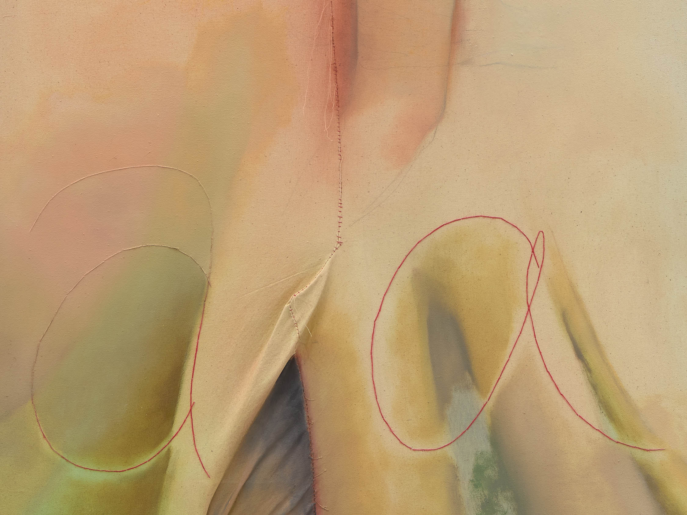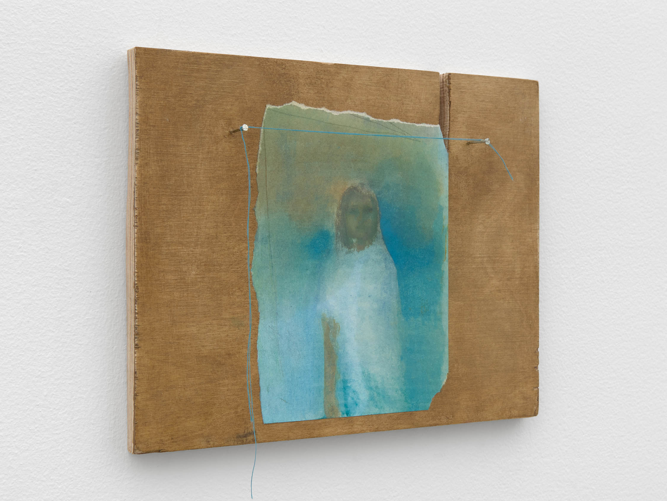 The soft sound of the double ‘s’ follows the hard bracket of the ‘c,’ itself contained within the echoing form of the parentheses. Hooked forwards, the curved spine of the punctuation mark is supple and shy. Sibilance flows outward from the central digraph of the word, cosset, which is a title, a location, and a limit. Cool and wet, the paintings leak, and meaning passes from image to object to text—the symbol in migration. Fabric applied to the top of a frame mops up the excesses of feeling, like a soggy sock on the bathroom floor.