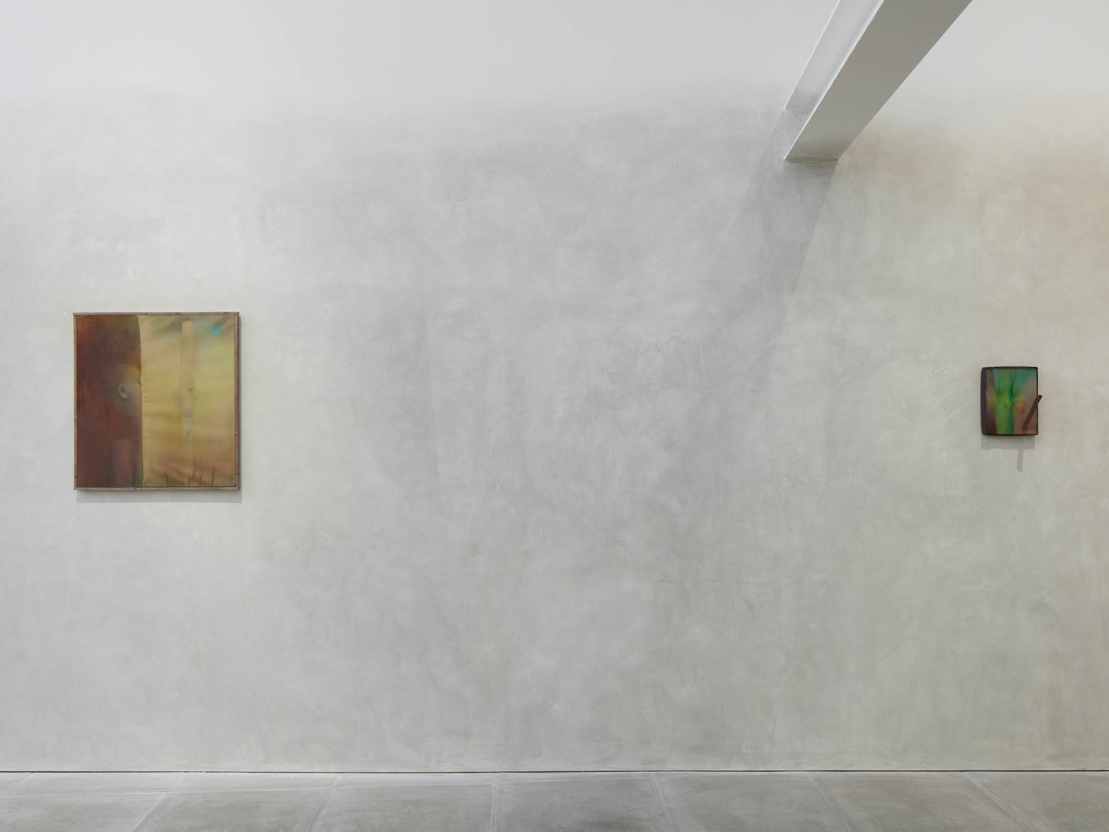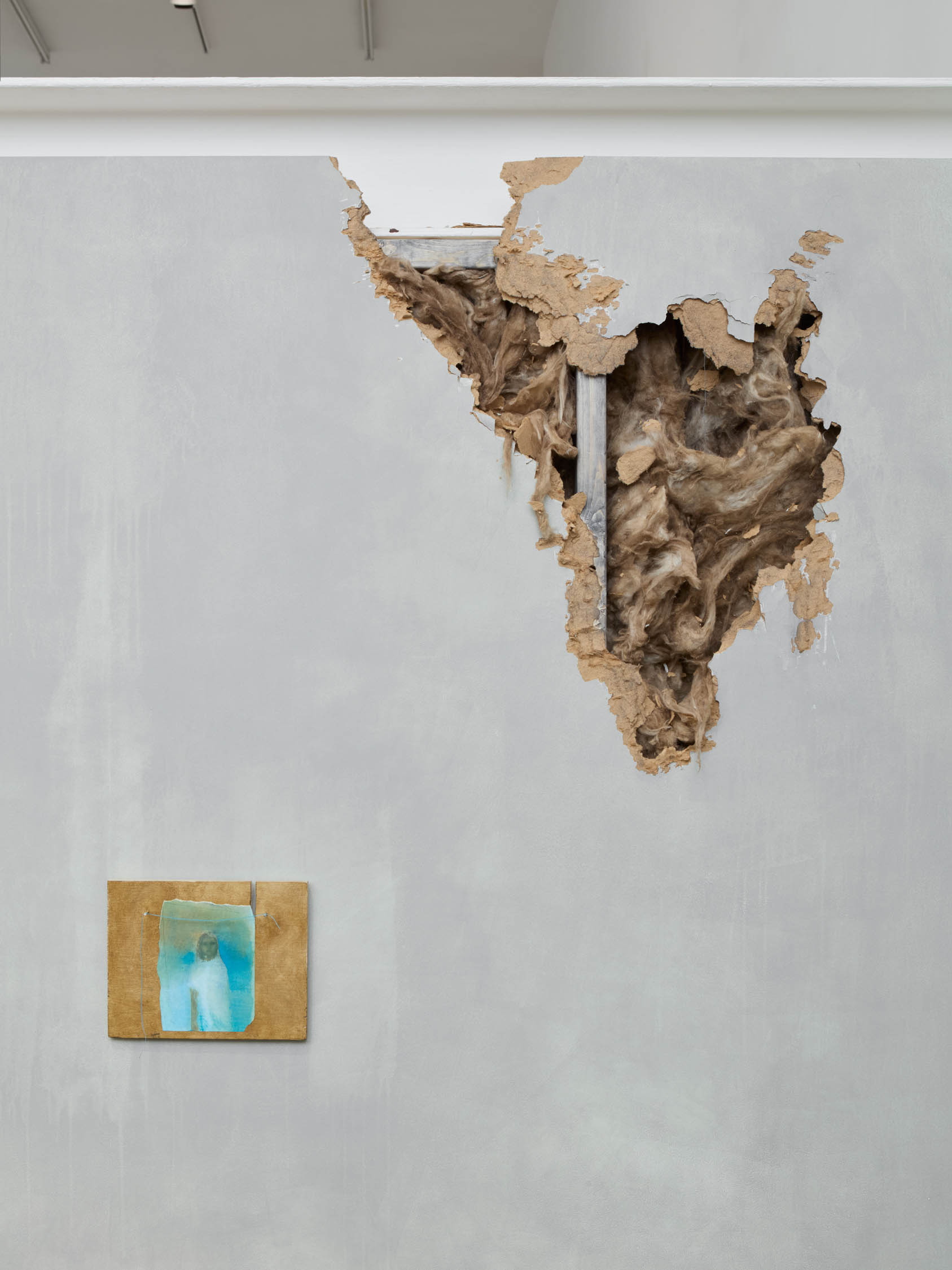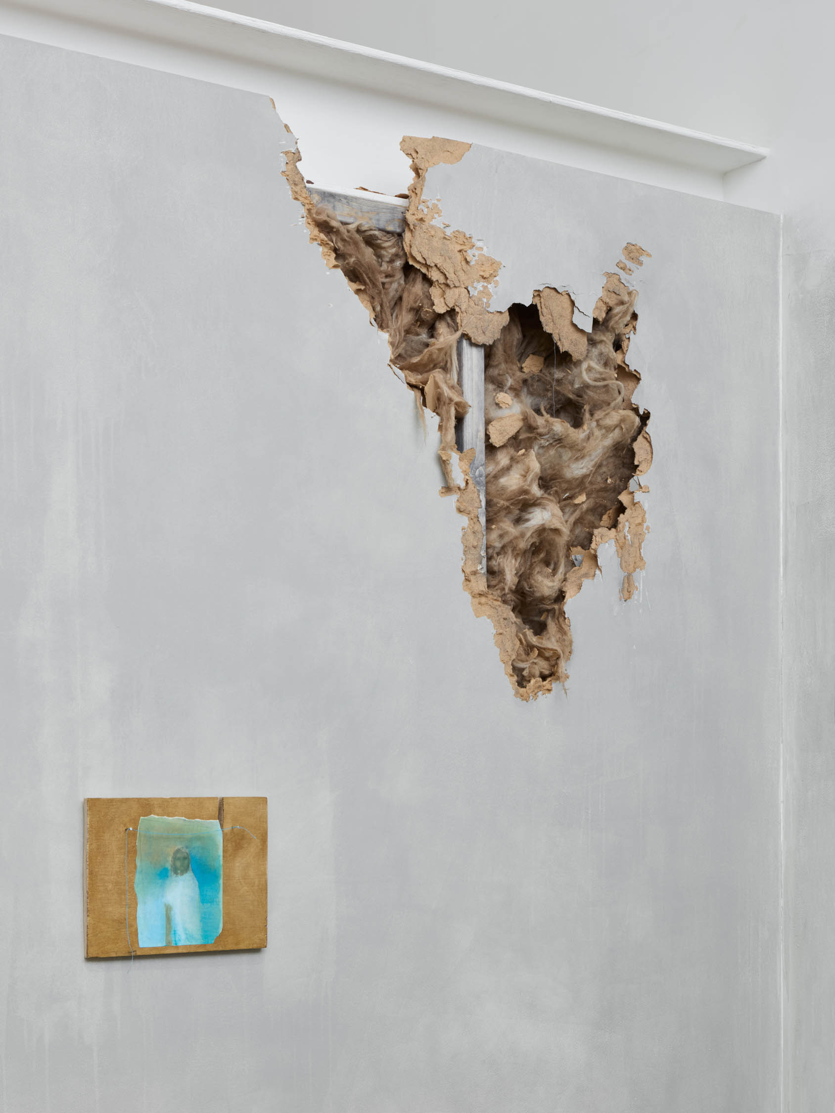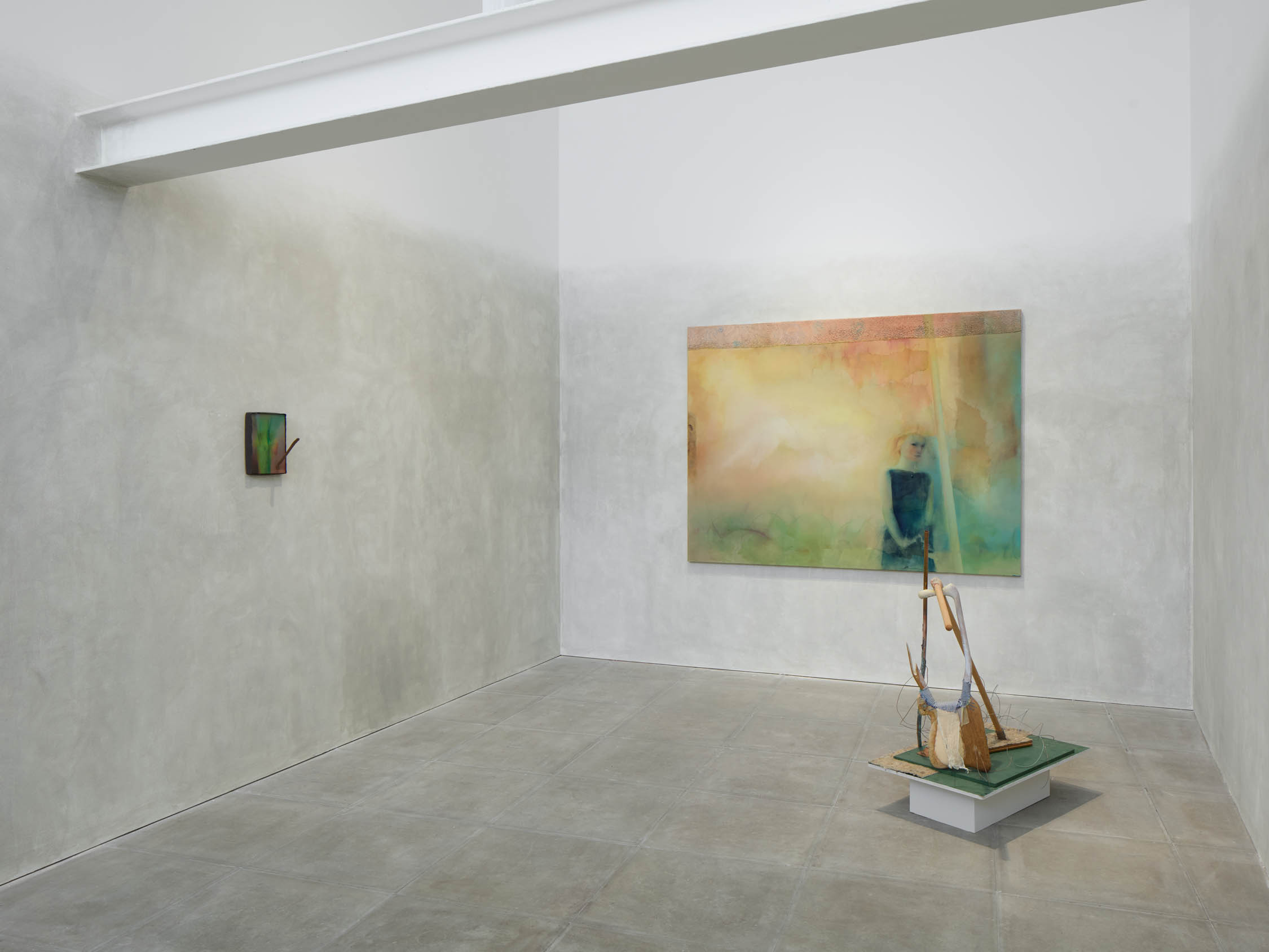 The soft sound of the double ‘s’ follows the hard bracket of the ‘c,’ itself contained within the echoing form of the parentheses. Hooked forwards, the curved spine of the punctuation mark is supple and shy. Sibilance flows outward from the central digraph of the word, cosset, which is a title, a location, and a limit. Cool and wet, the paintings leak, and meaning passes from image to object to text—the symbol in migration. Fabric applied to the top of a frame mops up the excesses of feeling, like a soggy sock on the bathroom floor.
