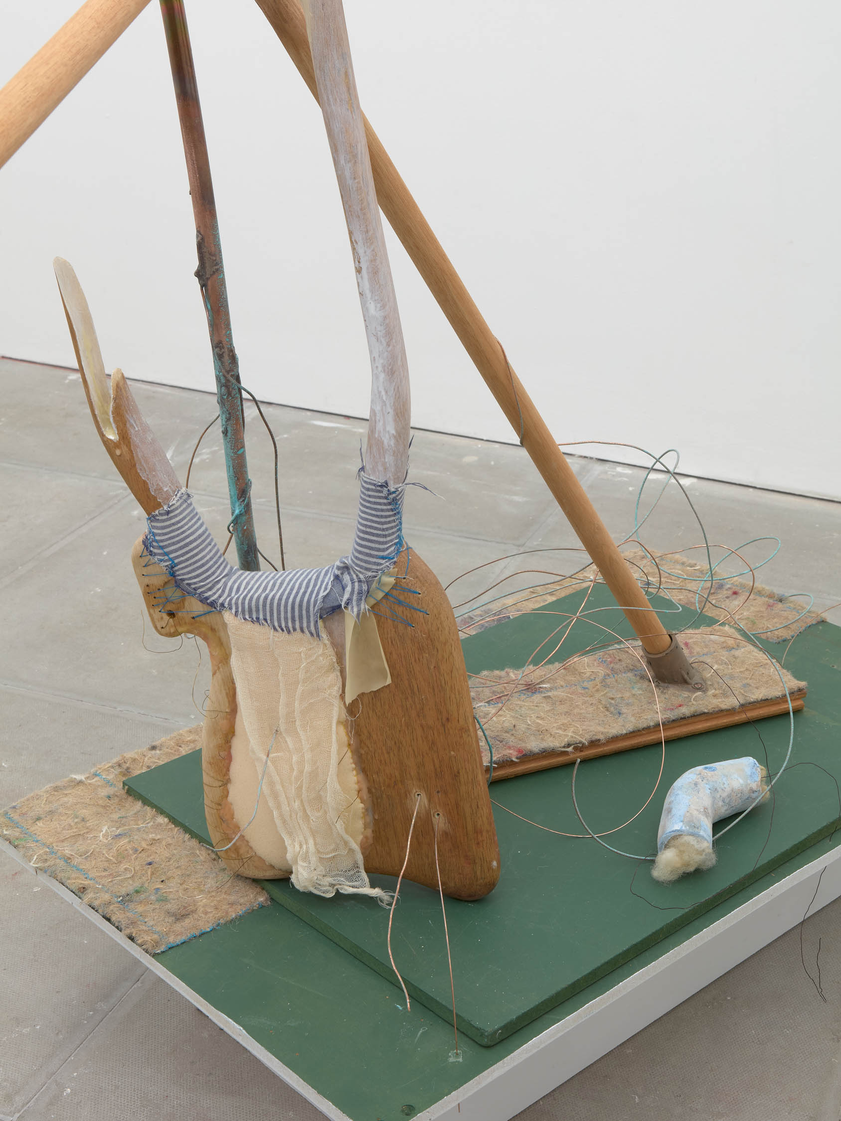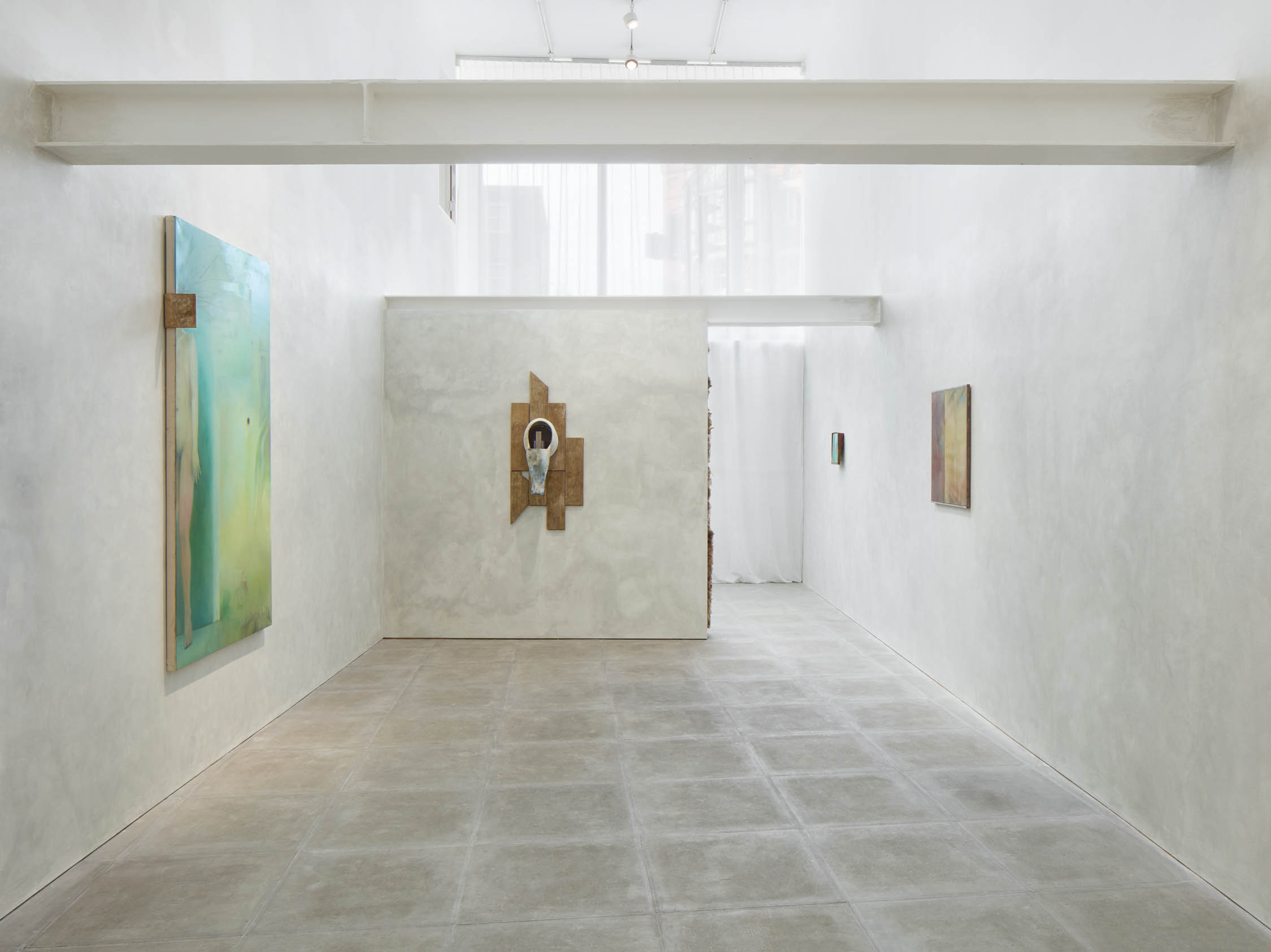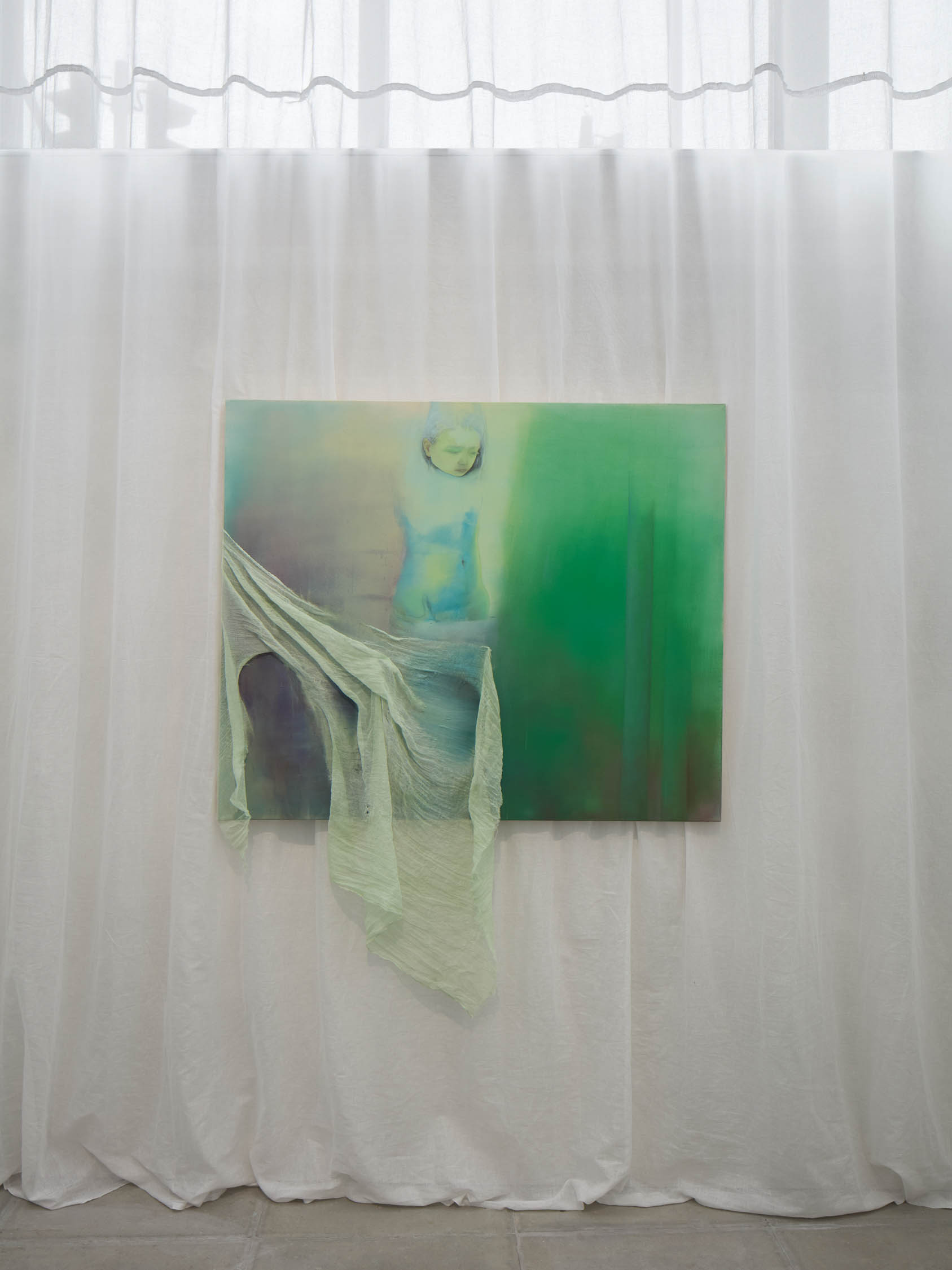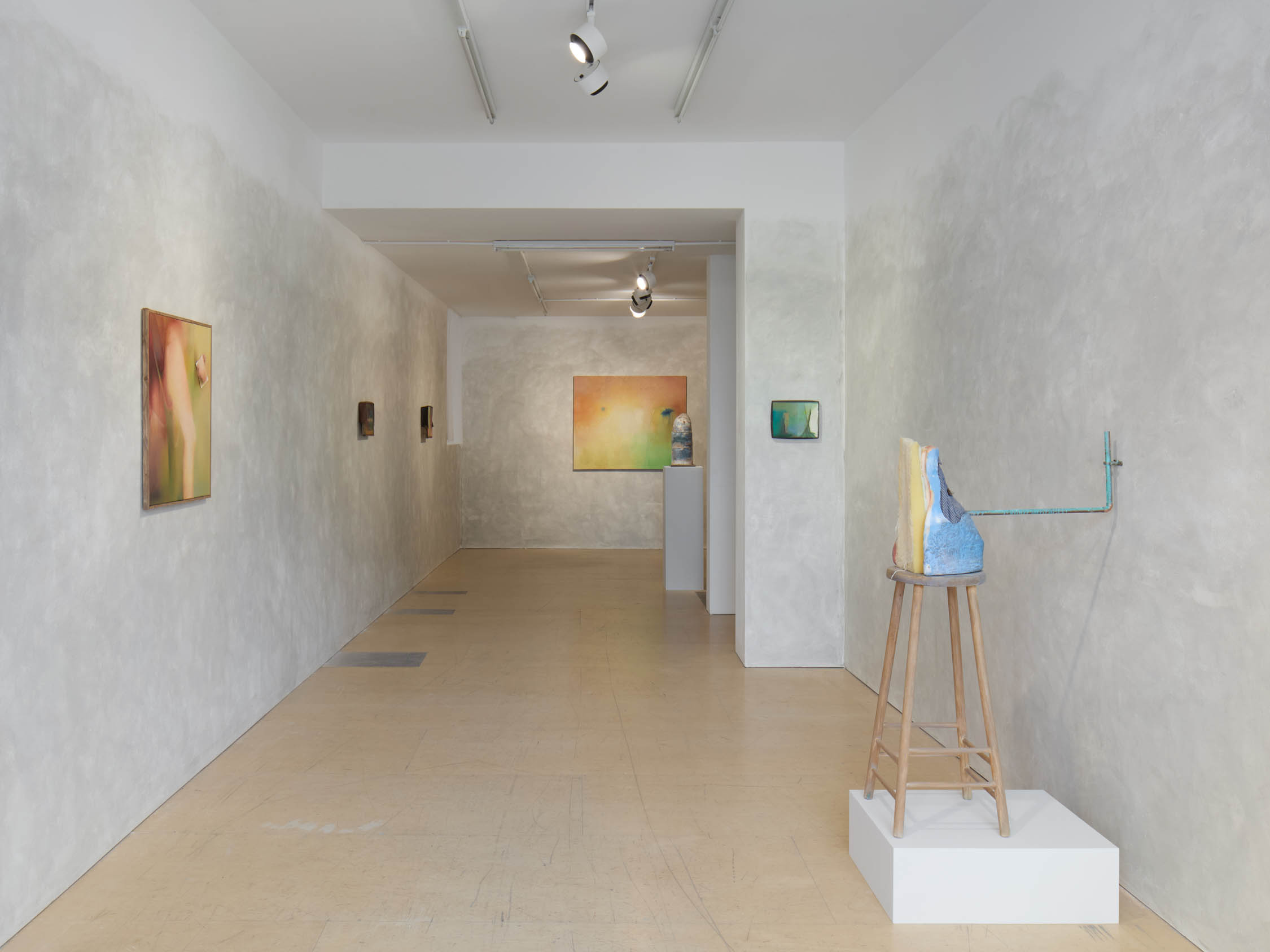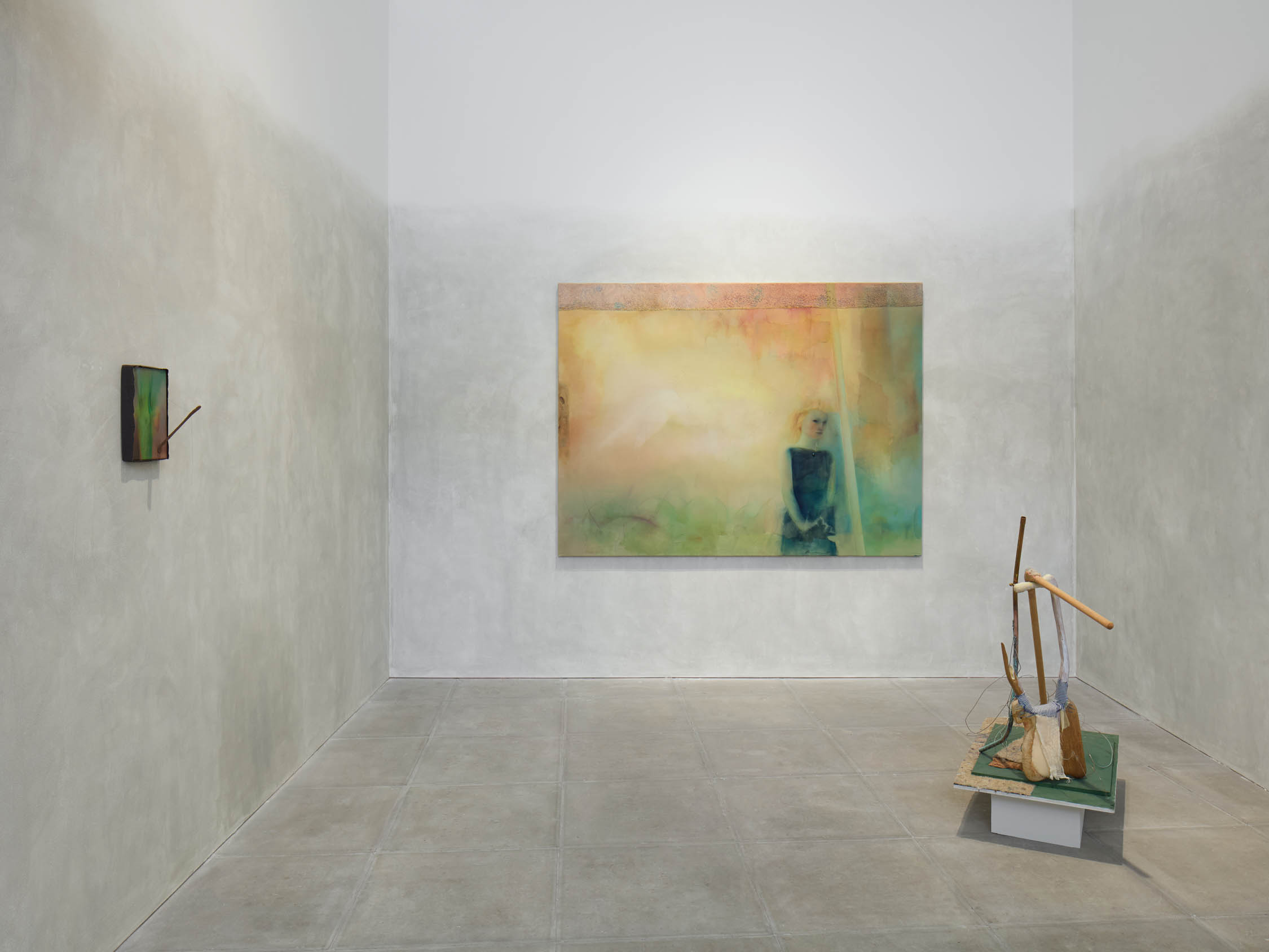 The soft sound of the double ‘s’ follows the hard bracket of the ‘c,’ itself contained within the echoing form of the parentheses. Hooked forwards, the curved spine of the punctuation mark is supple and shy. Sibilance flows outward from the central digraph of the word, cosset, which is a title, a location, and a limit. Cool and wet, the paintings leak, and meaning passes from image to object to text—the symbol in migration. Fabric applied to the top of a frame mops up the excesses of feeling, like a soggy sock on the bathroom floor.