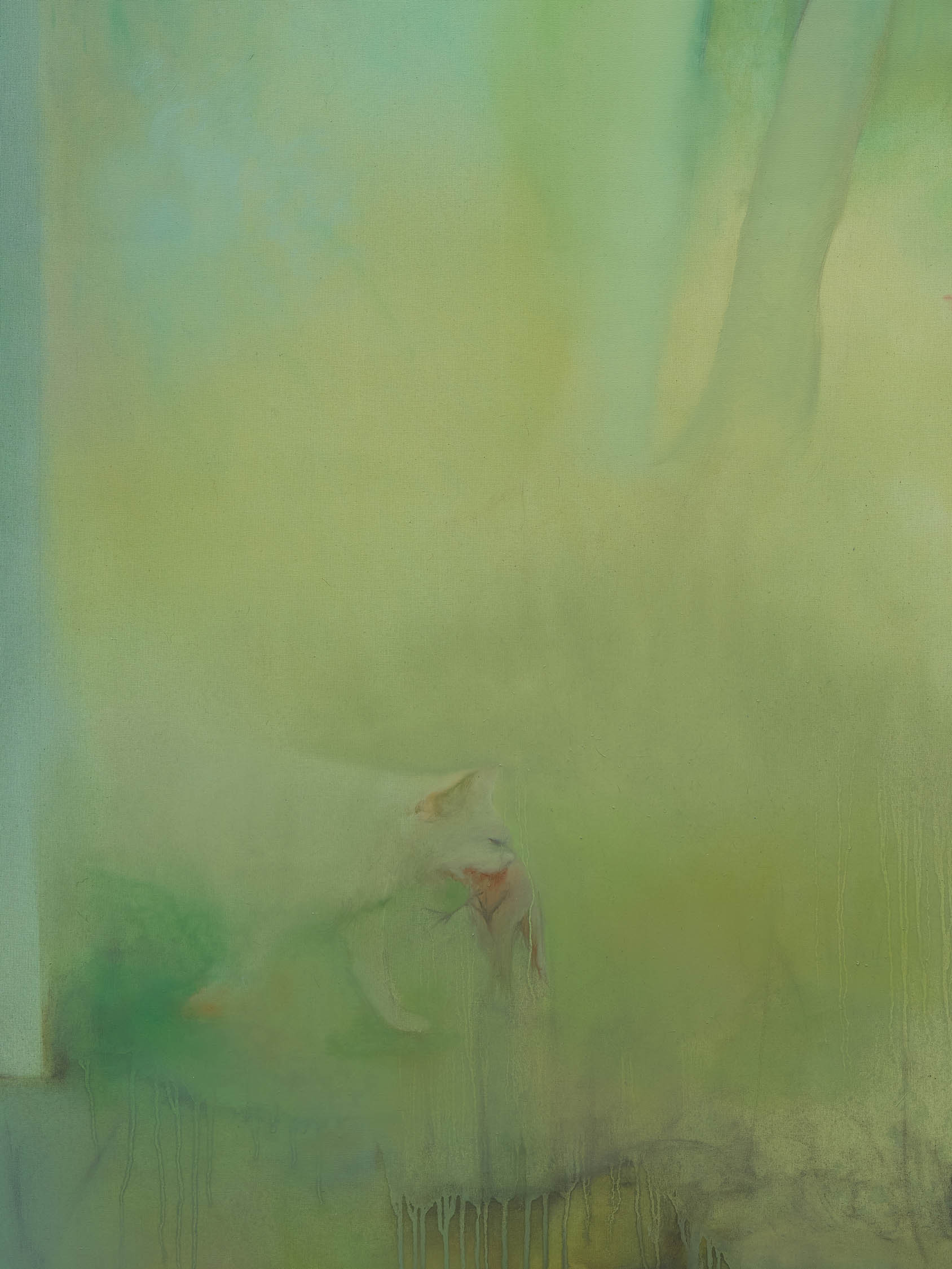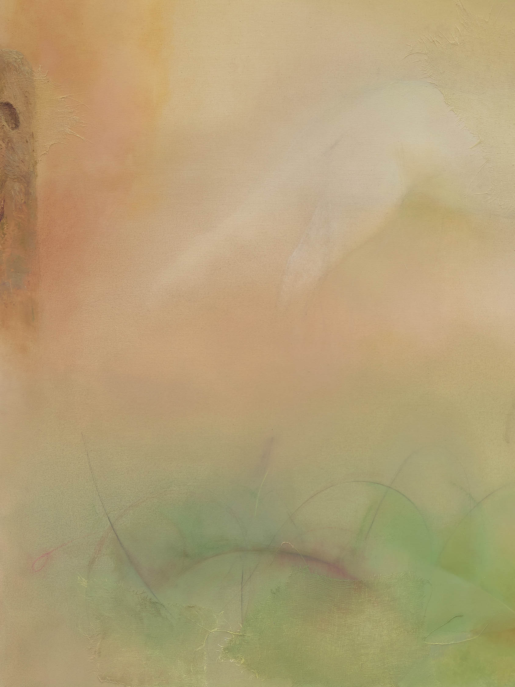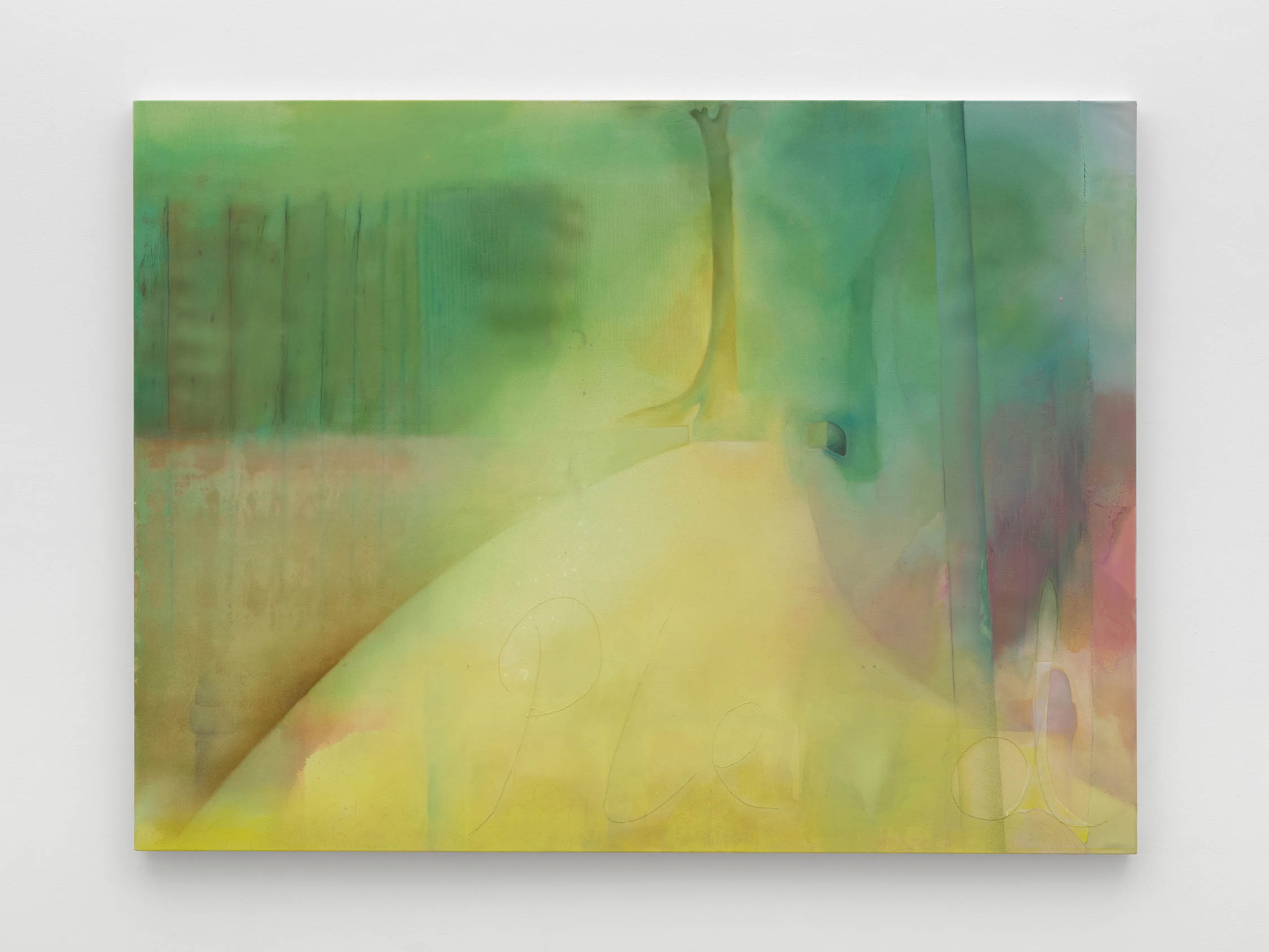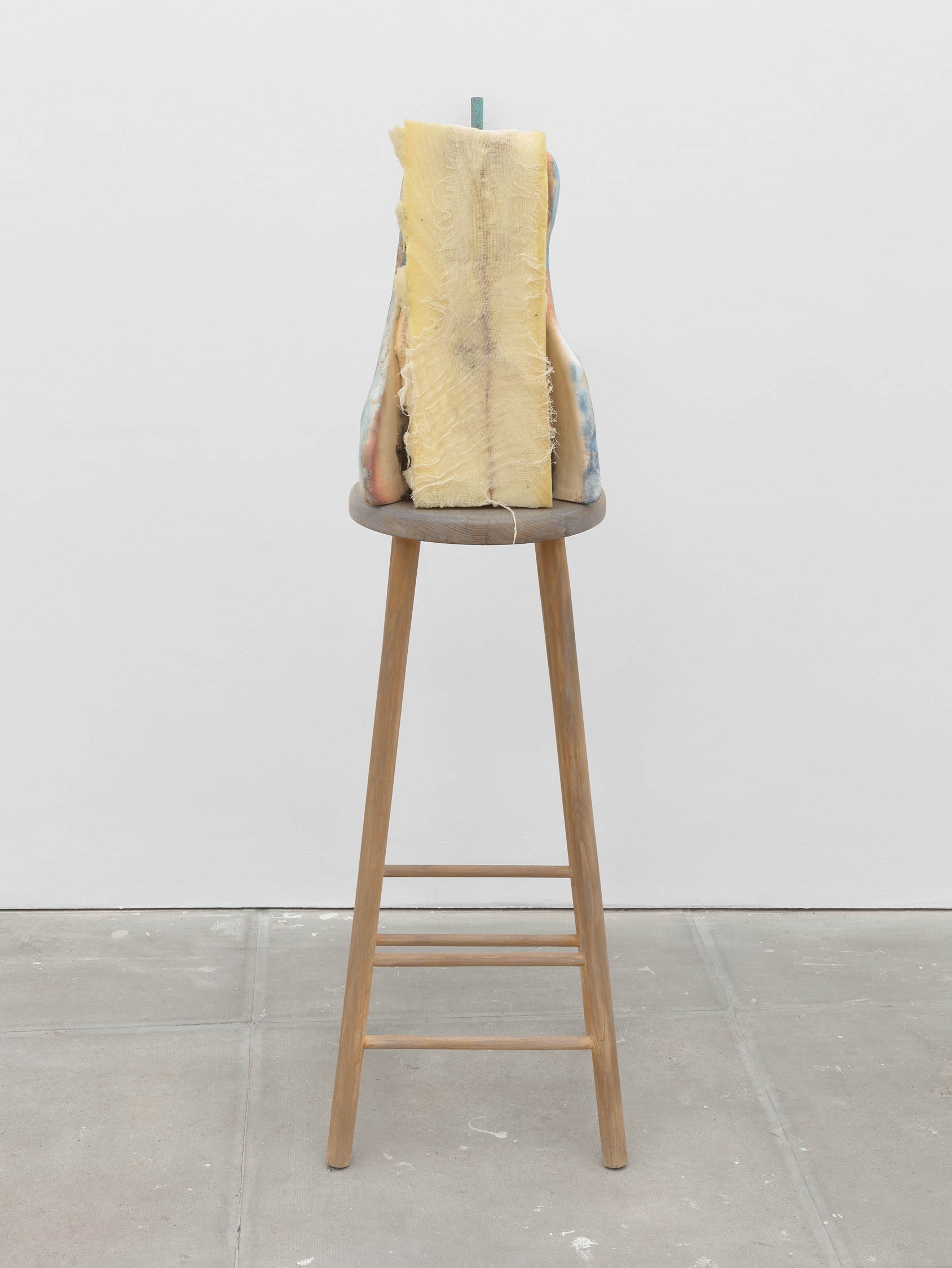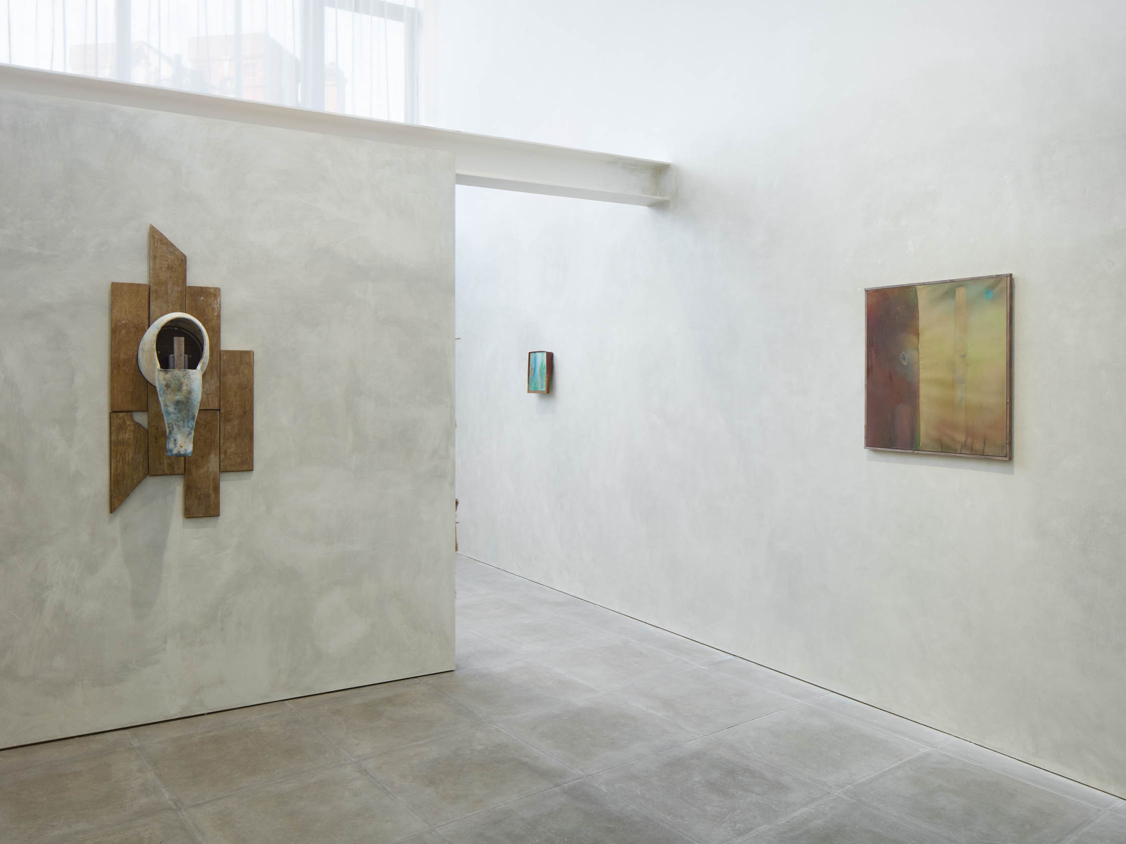 The soft sound of the double ‘s’ follows the hard bracket of the ‘c,’ itself contained within the echoing form of the parentheses. Hooked forwards, the curved spine of the punctuation mark is supple and shy. Sibilance flows outward from the central digraph of the word, cosset, which is a title, a location, and a limit. Cool and wet, the paintings leak, and meaning passes from image to object to text—the symbol in migration. Fabric applied to the top of a frame mops up the excesses of feeling, like a soggy sock on the bathroom floor.